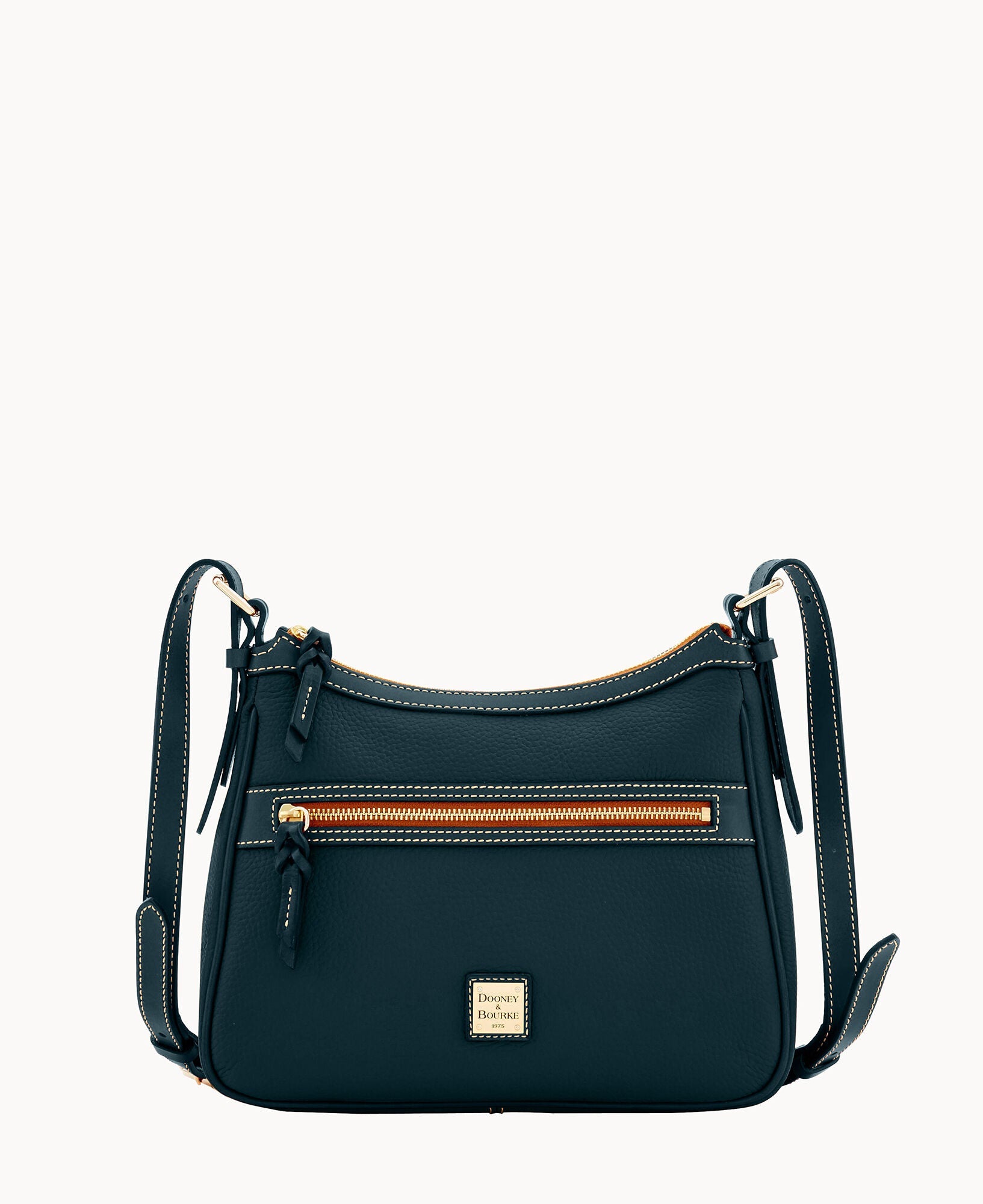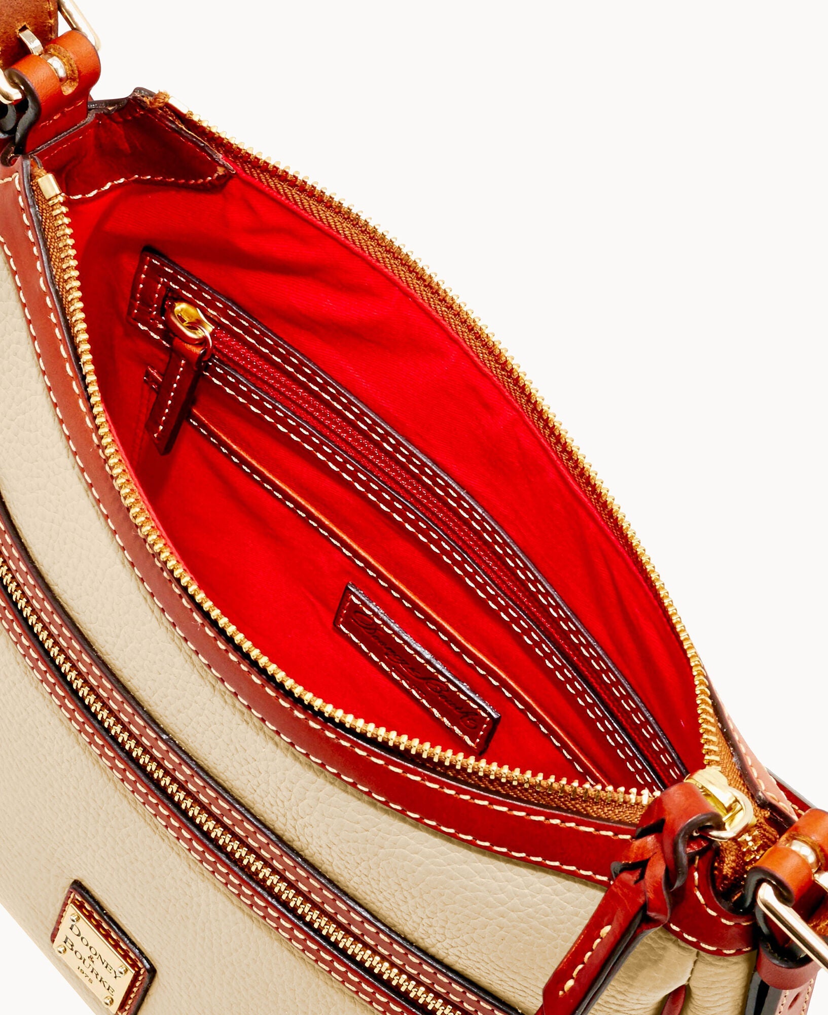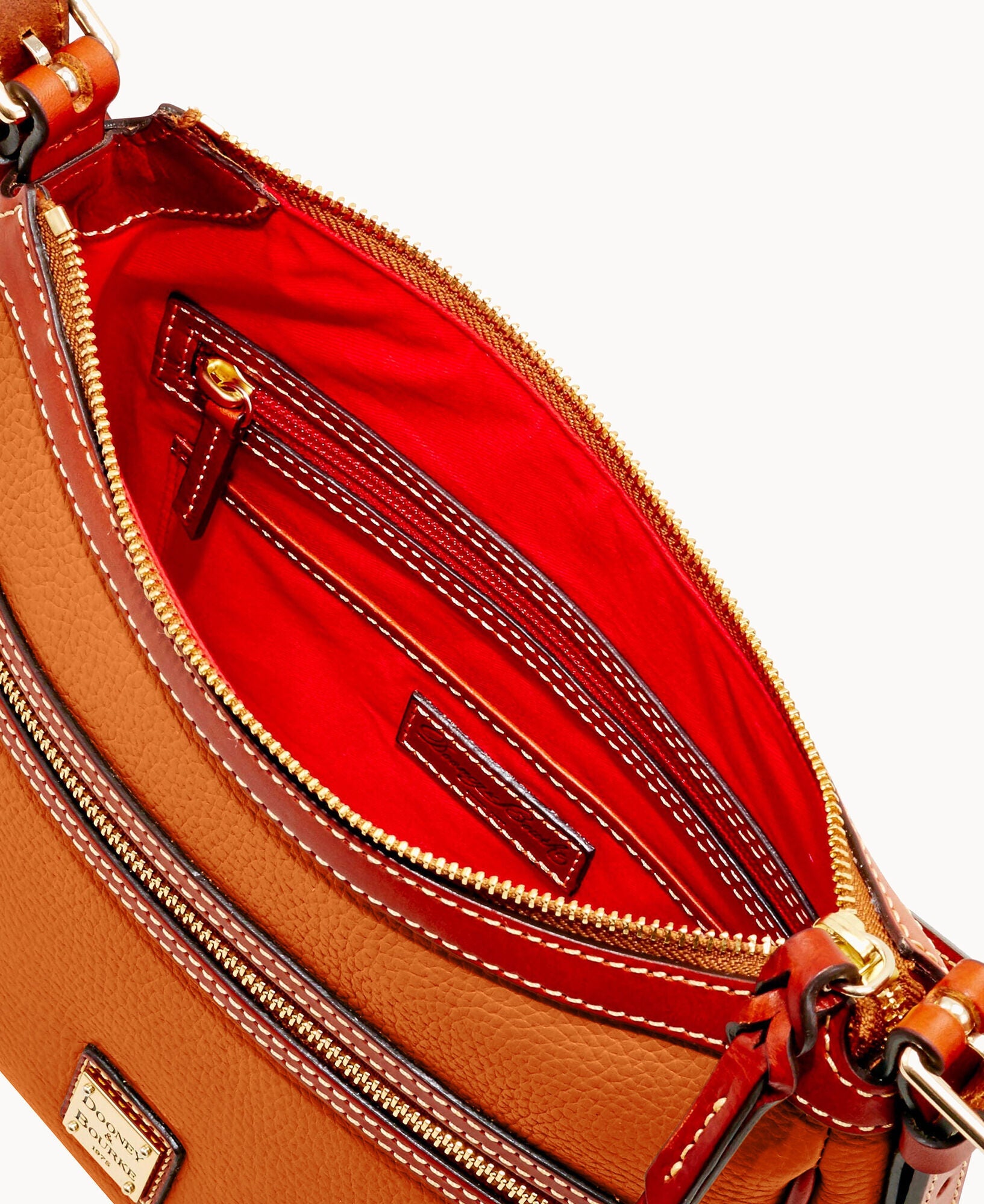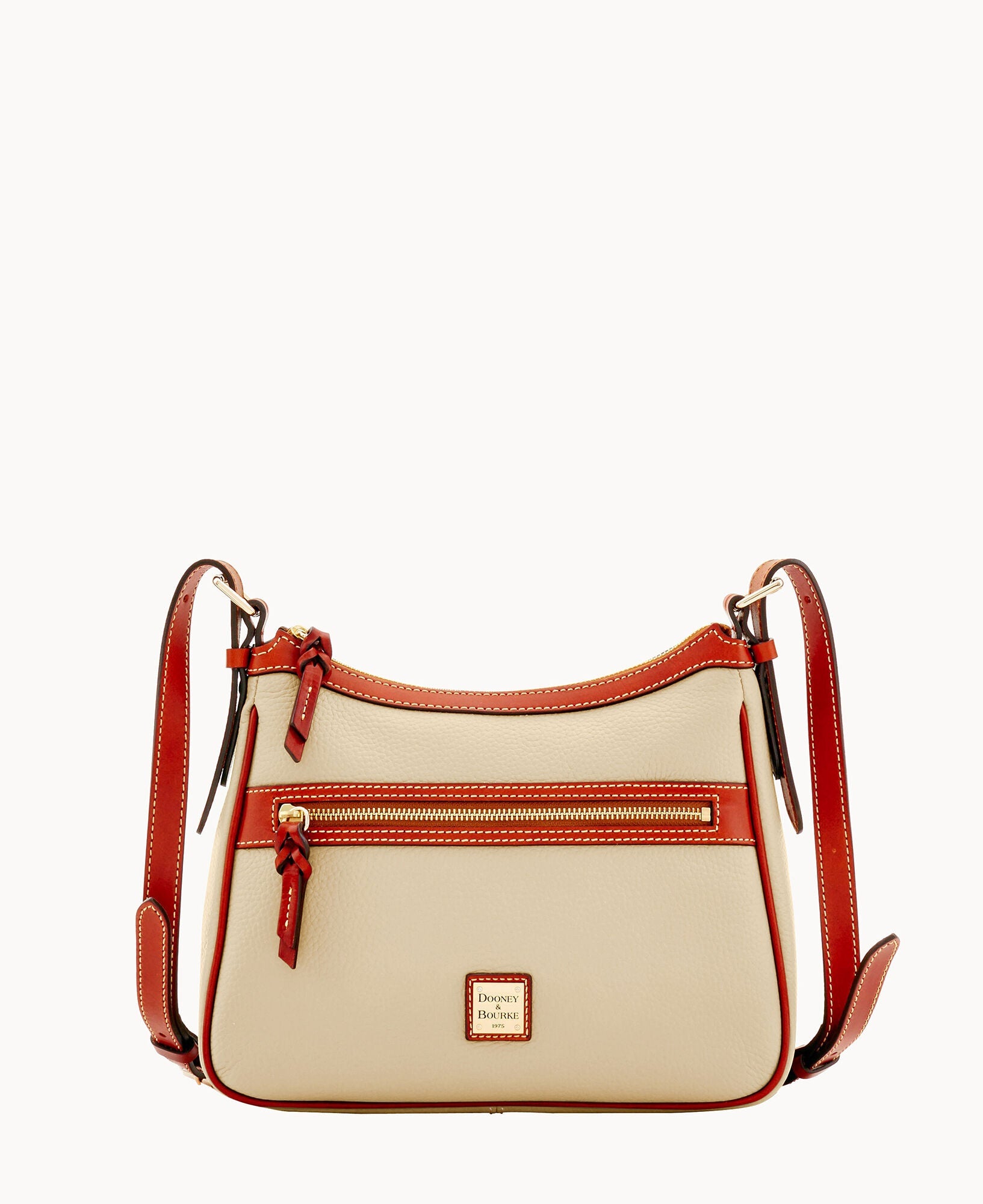 One outside zip pocket. One inside zip pocket. Two inside pockets. Inside key hook. Adjustable shoulder strap. Lined. Zipper closure.