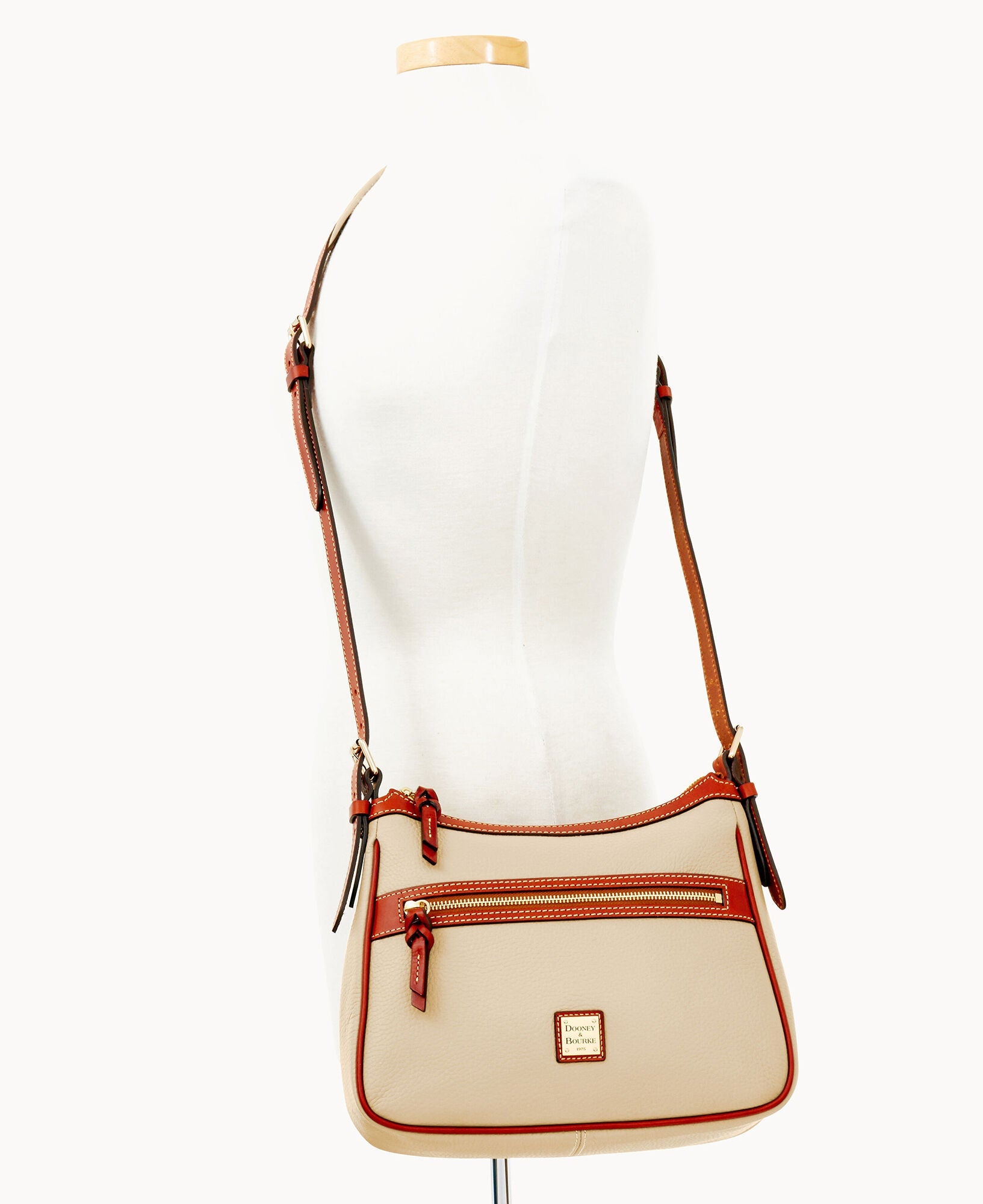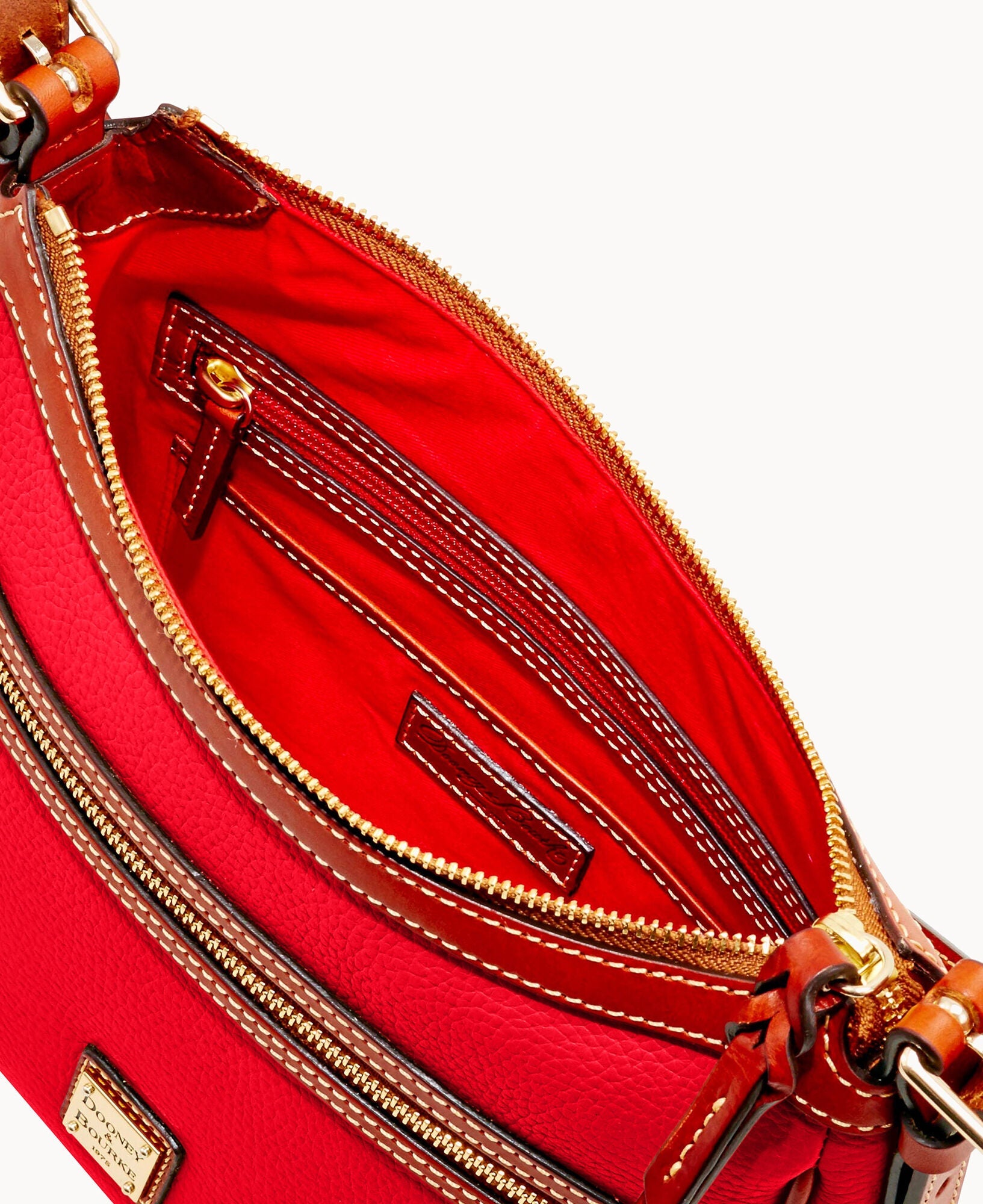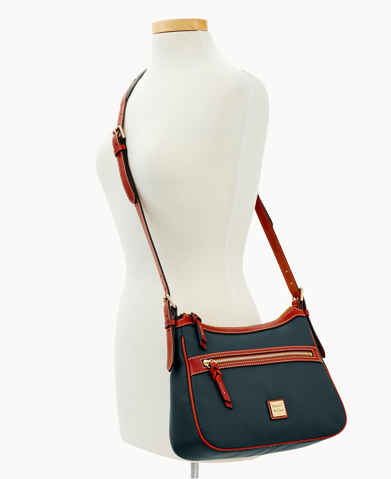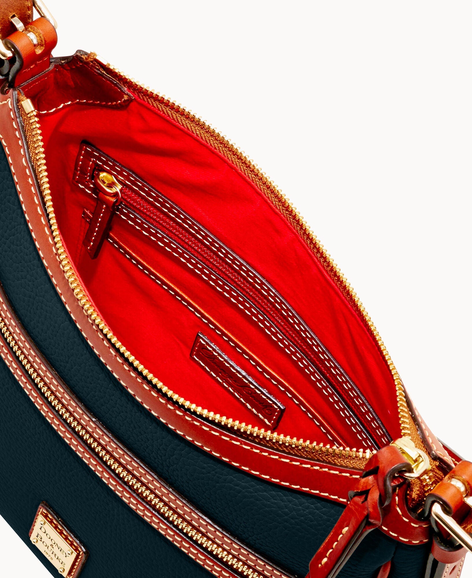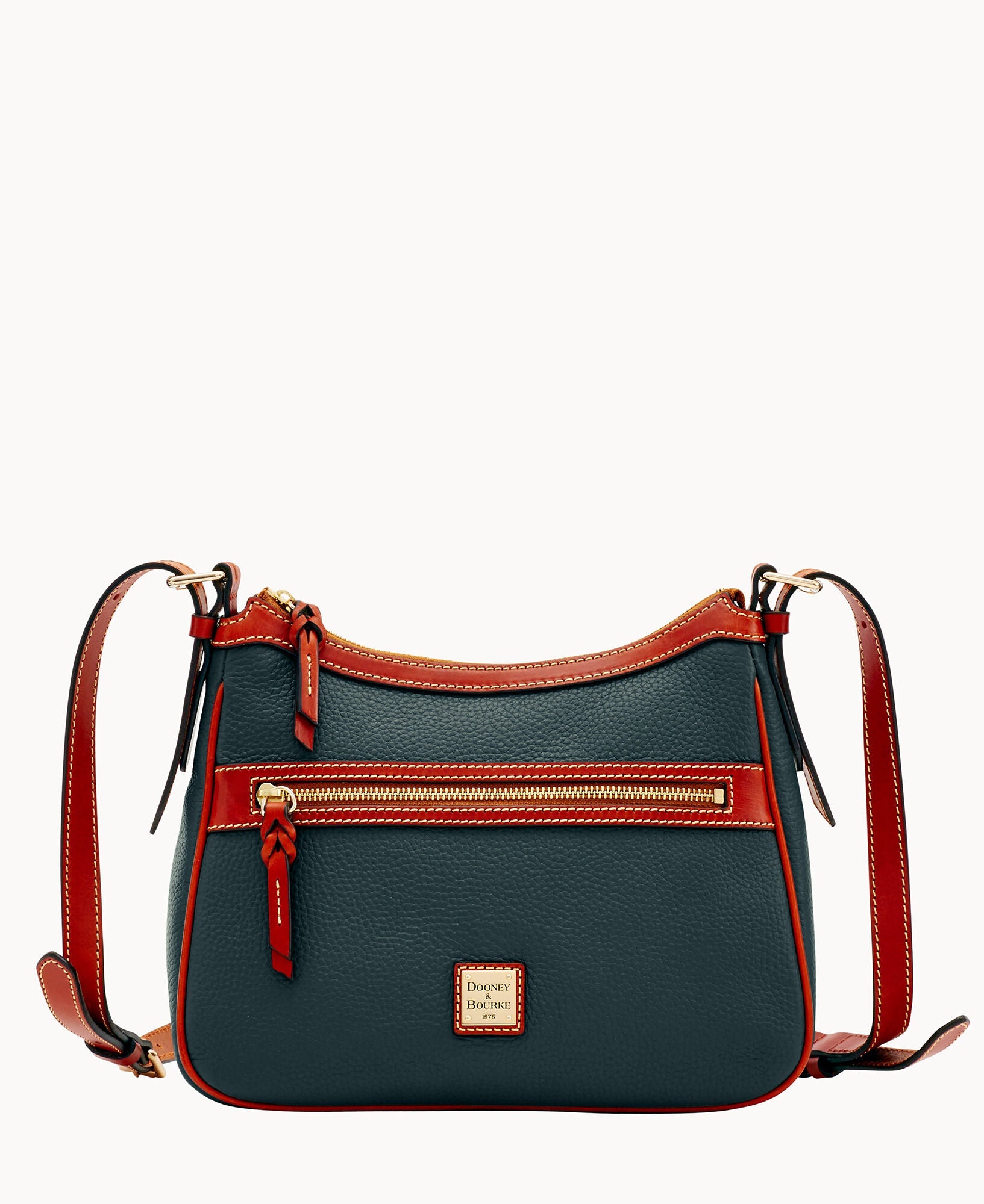 One outside zip pocket. One inside zip pocket. Two inside pockets. Inside key hook. Adjustable shoulder strap. Lined. Zipper closure.