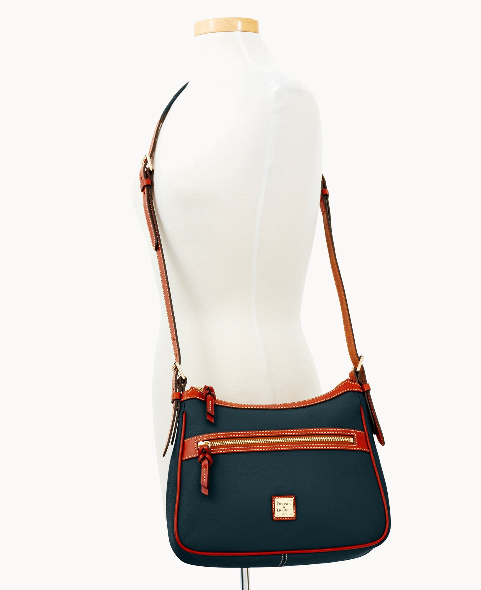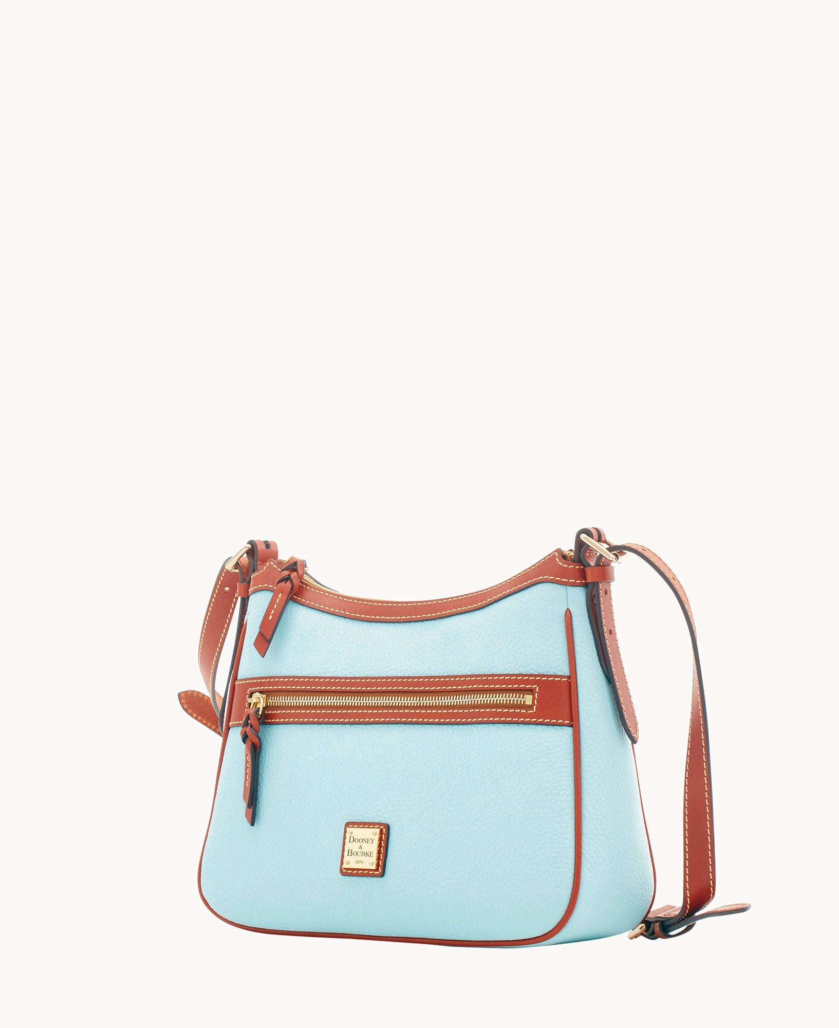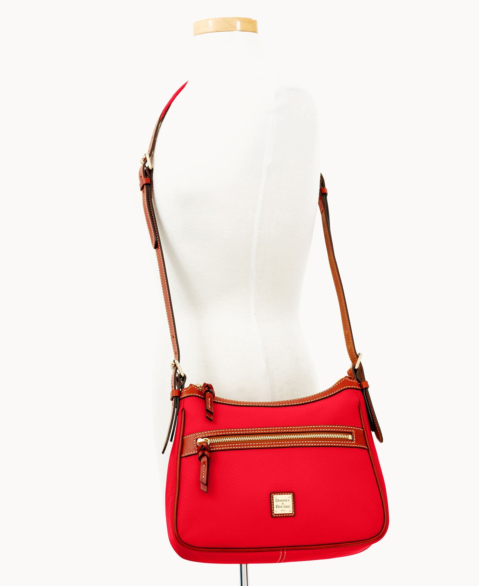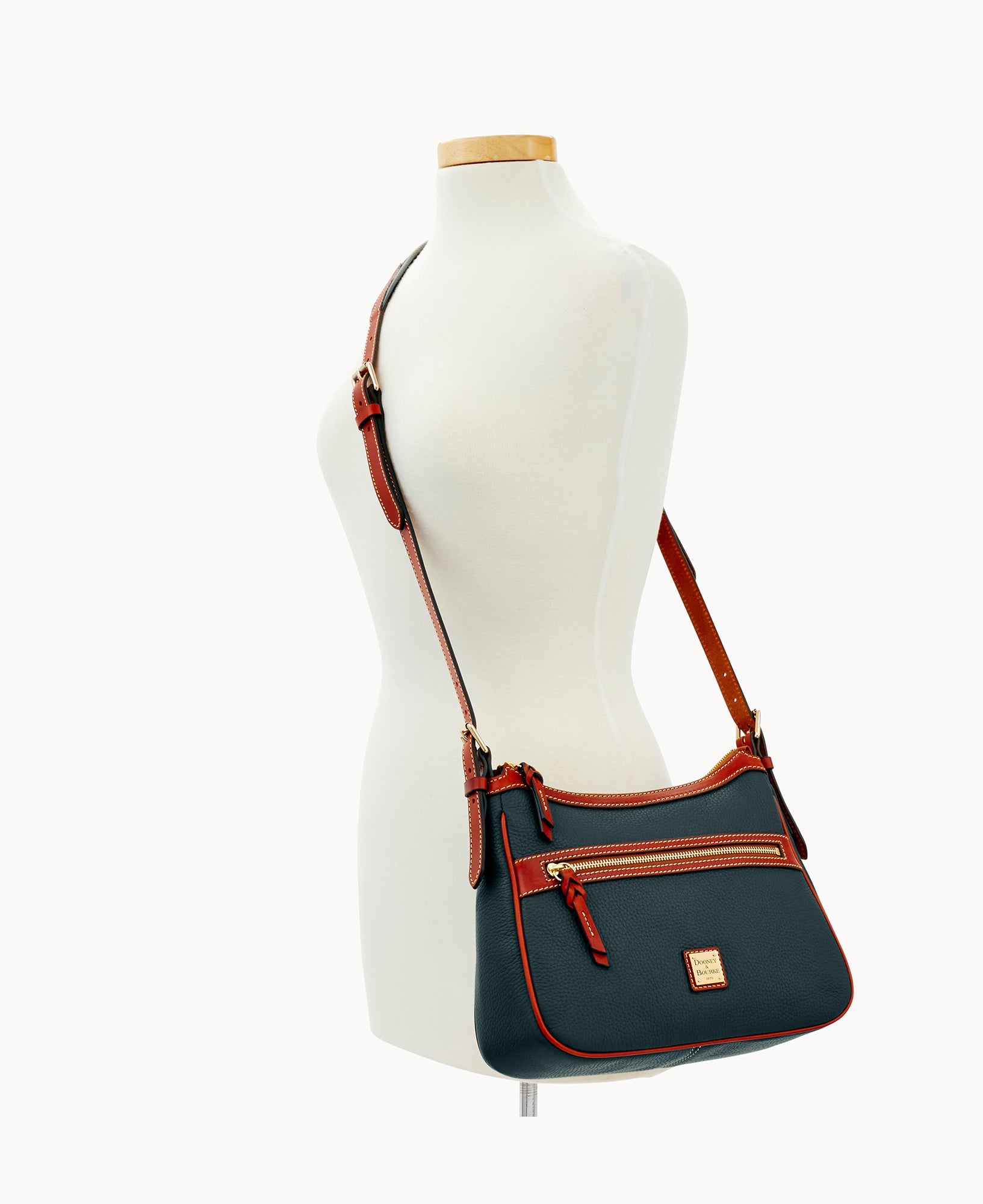 One outside zip pocket. One inside zip pocket. Two inside pockets. Inside key hook. Adjustable shoulder strap. Lined. Zipper closure.