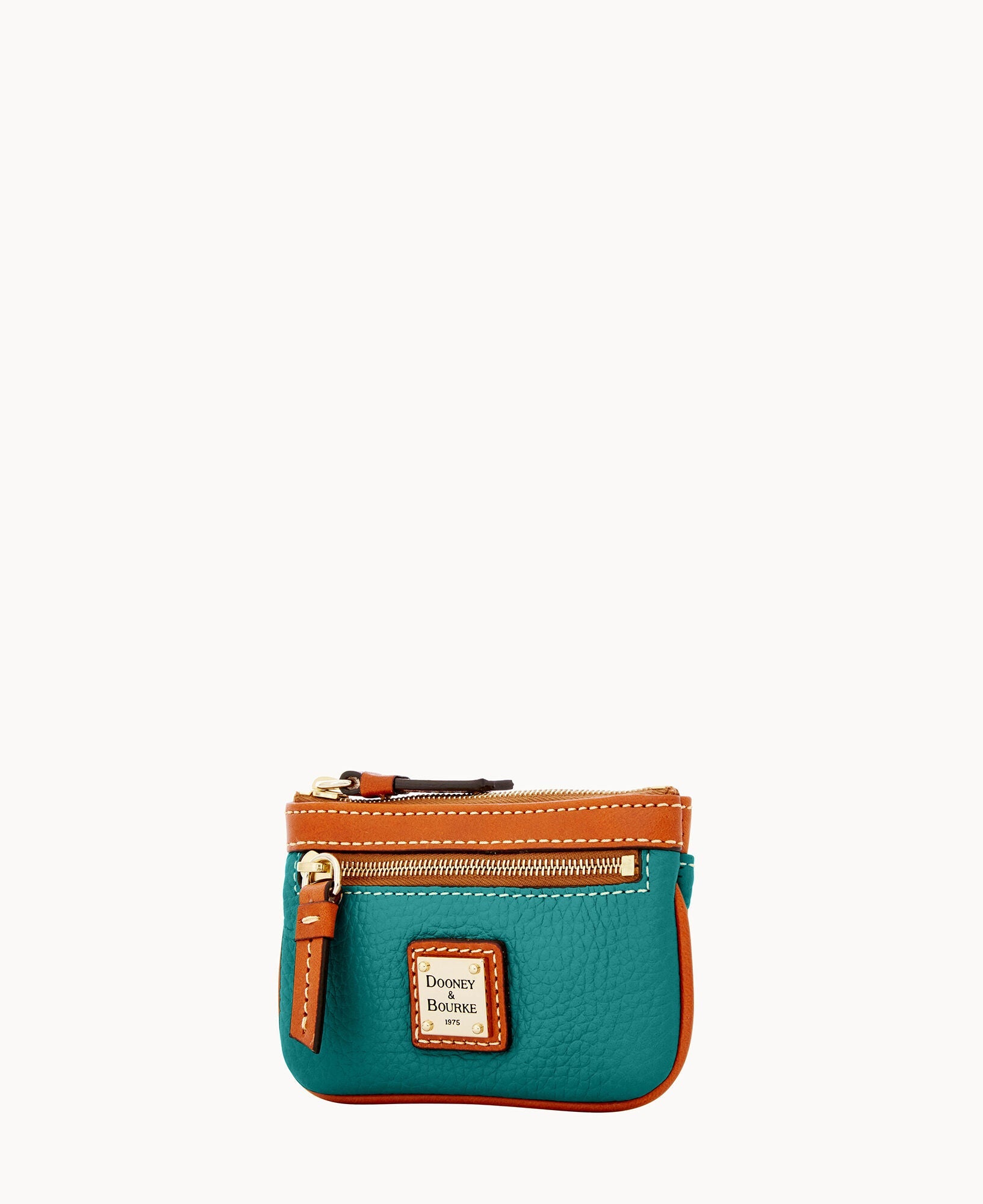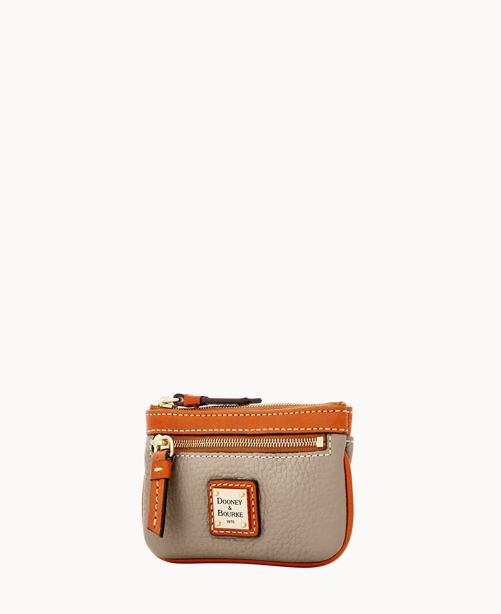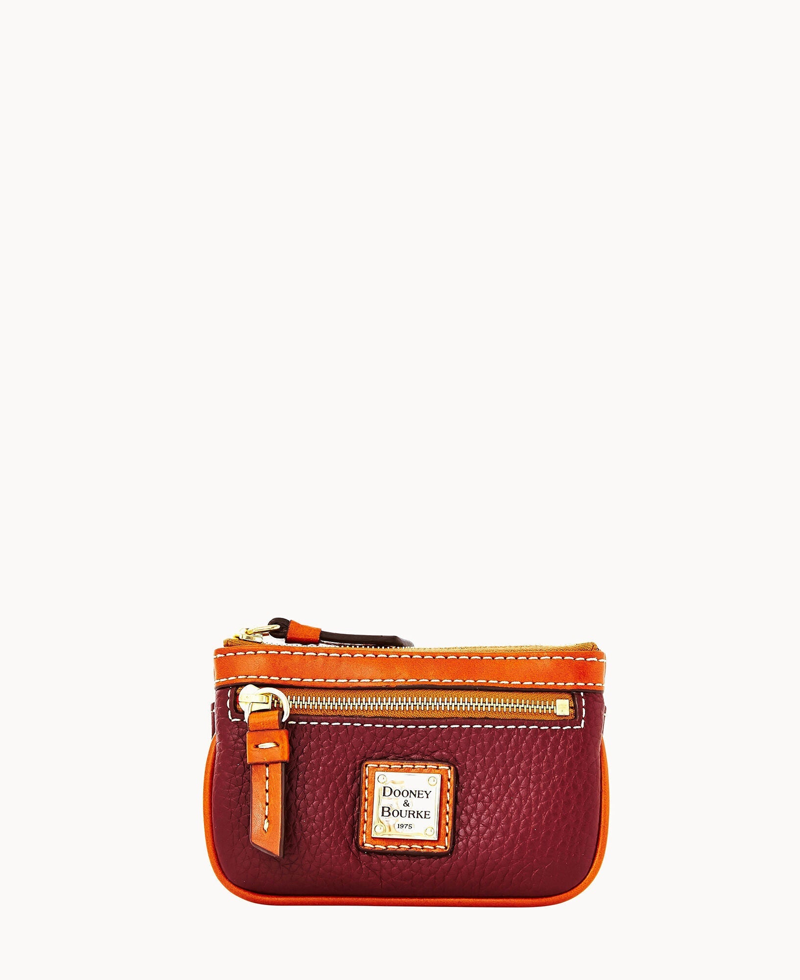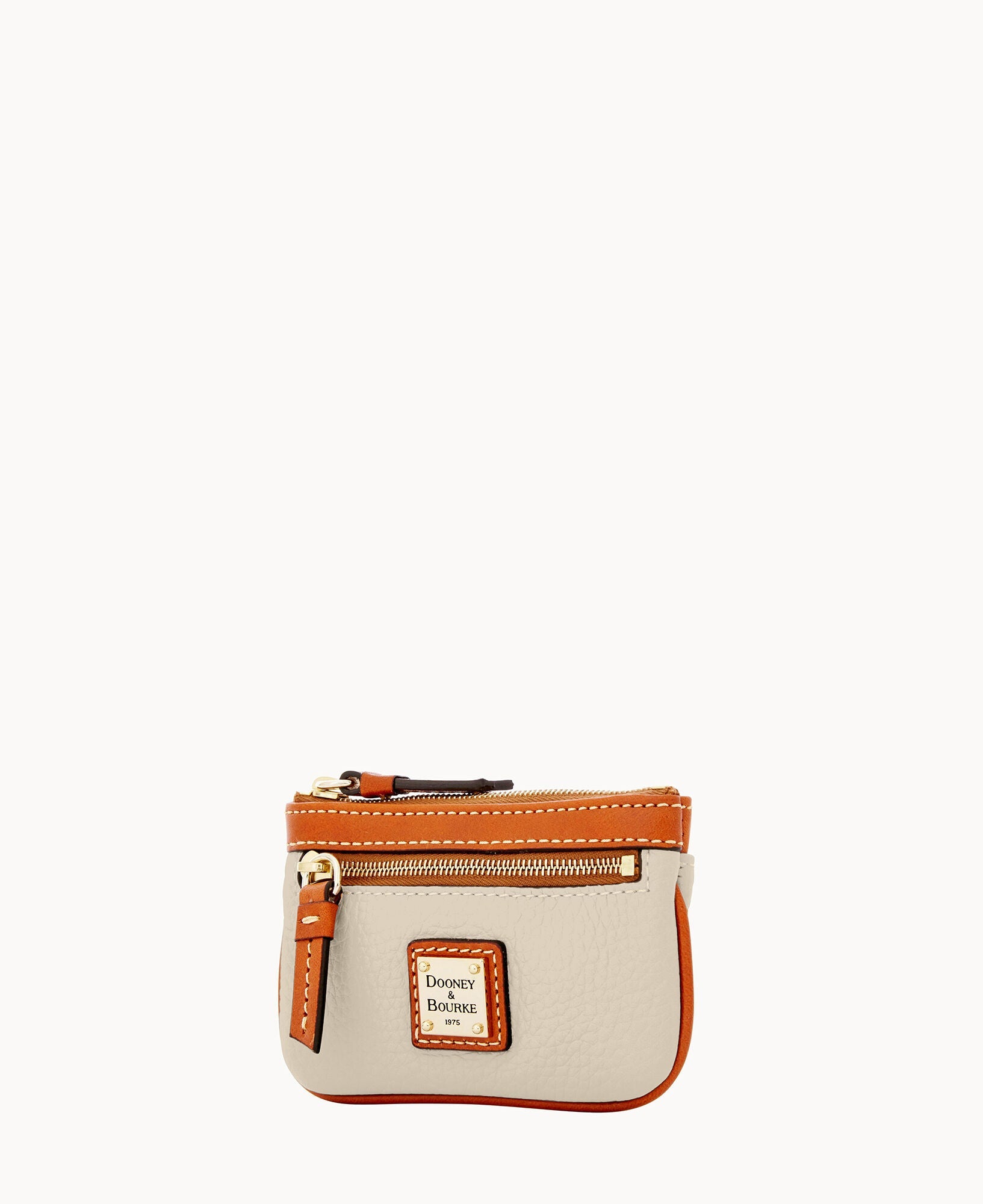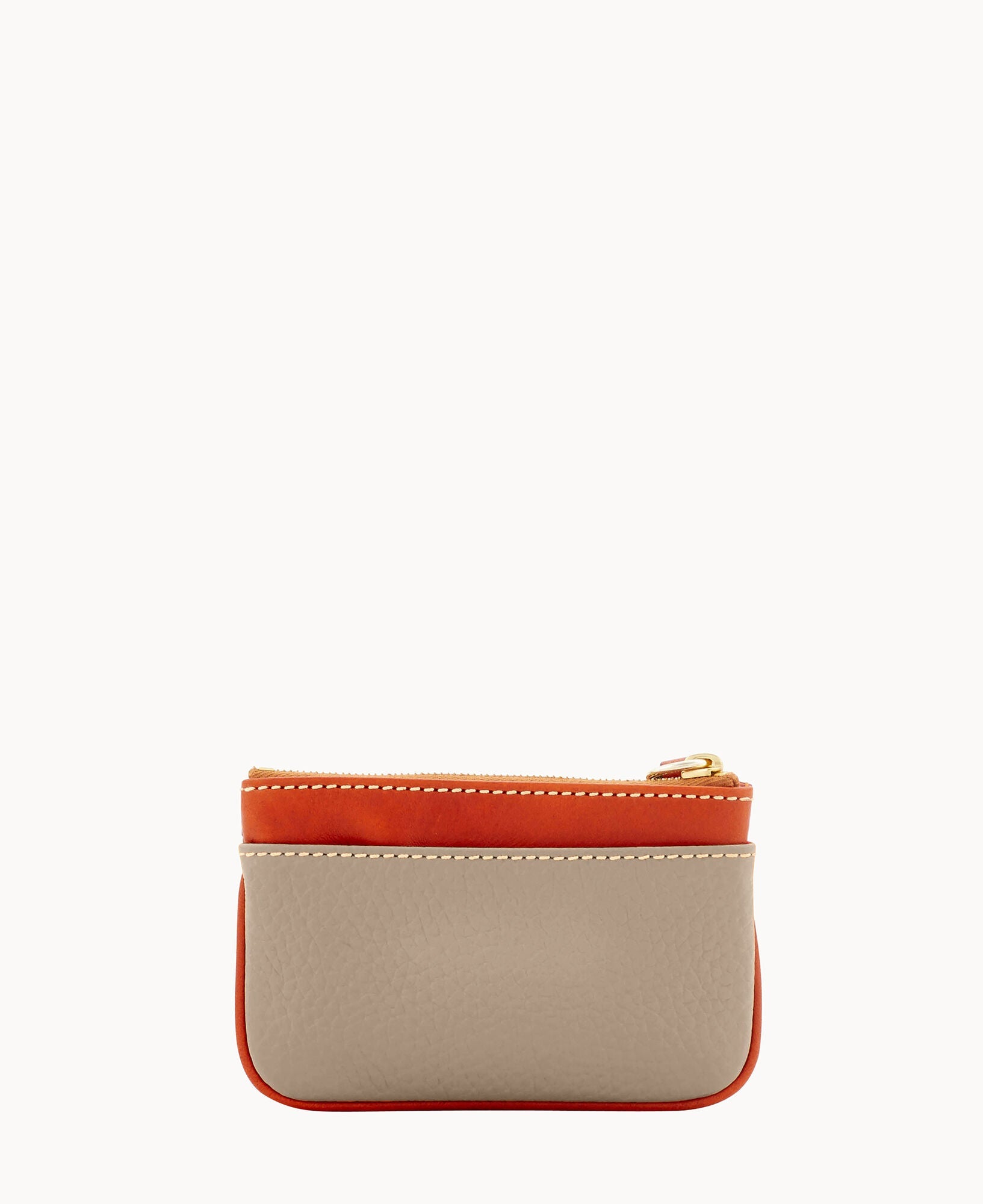 One outside zip pocket. Inside key ring. Lined. Zipper closure.
