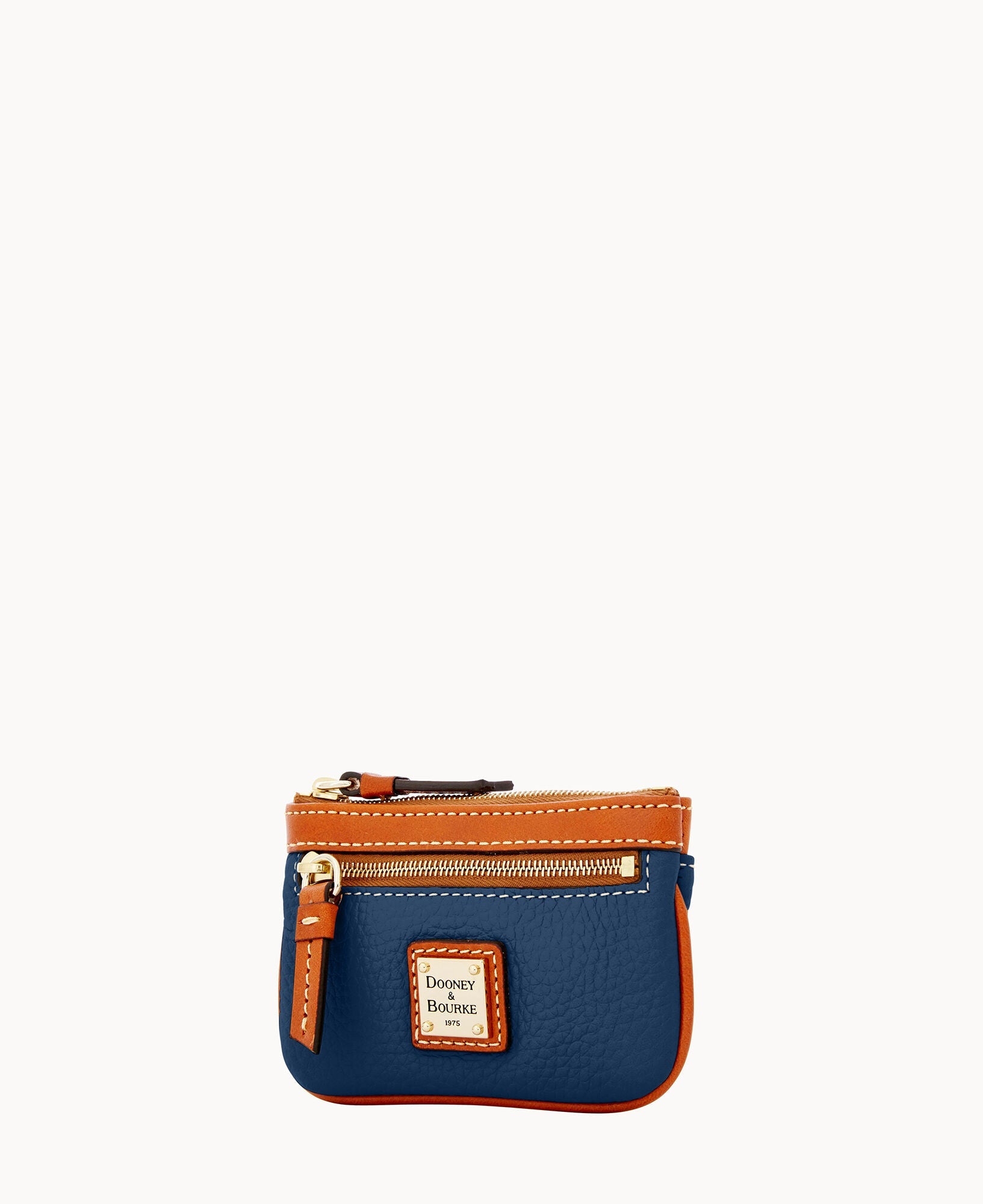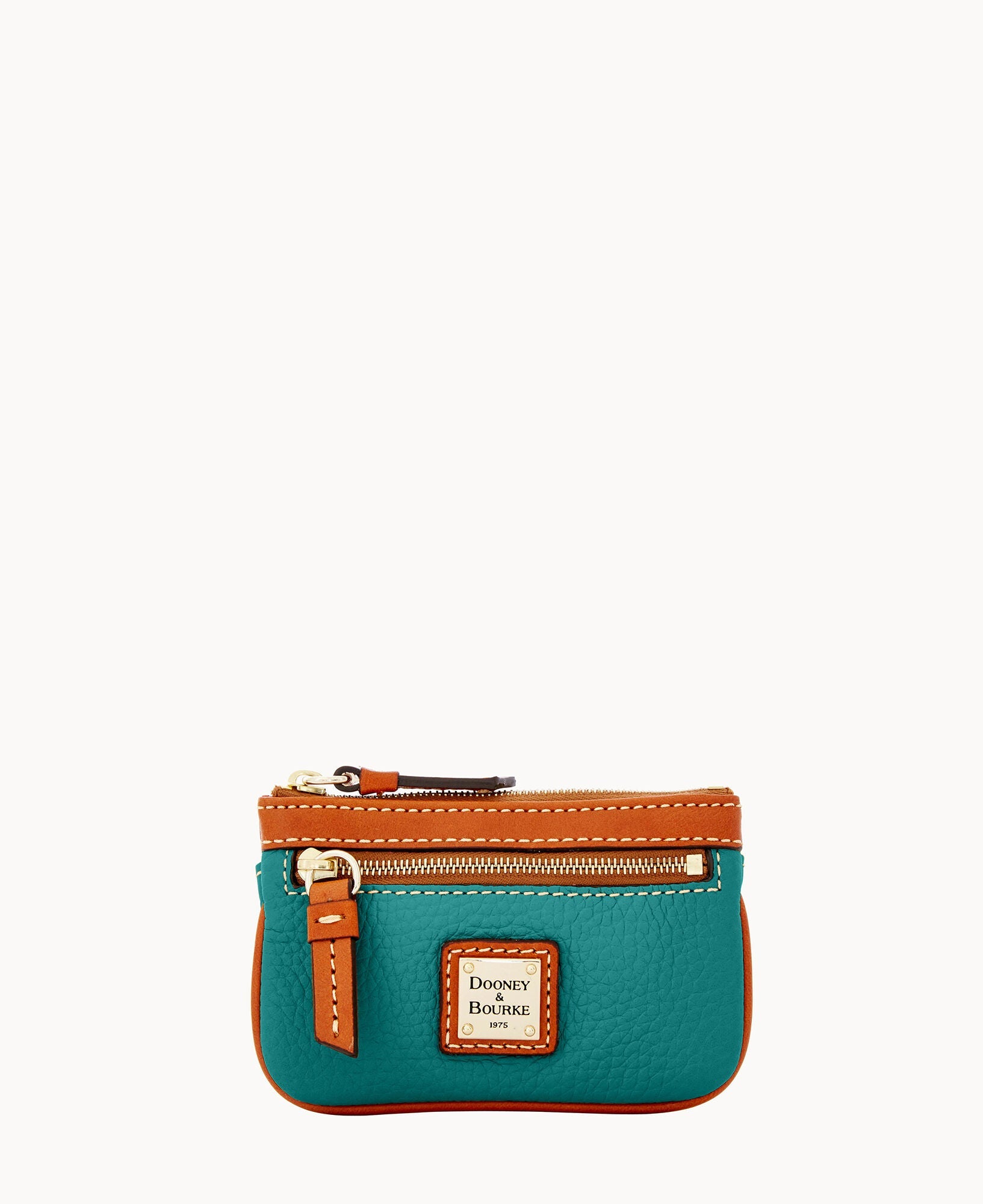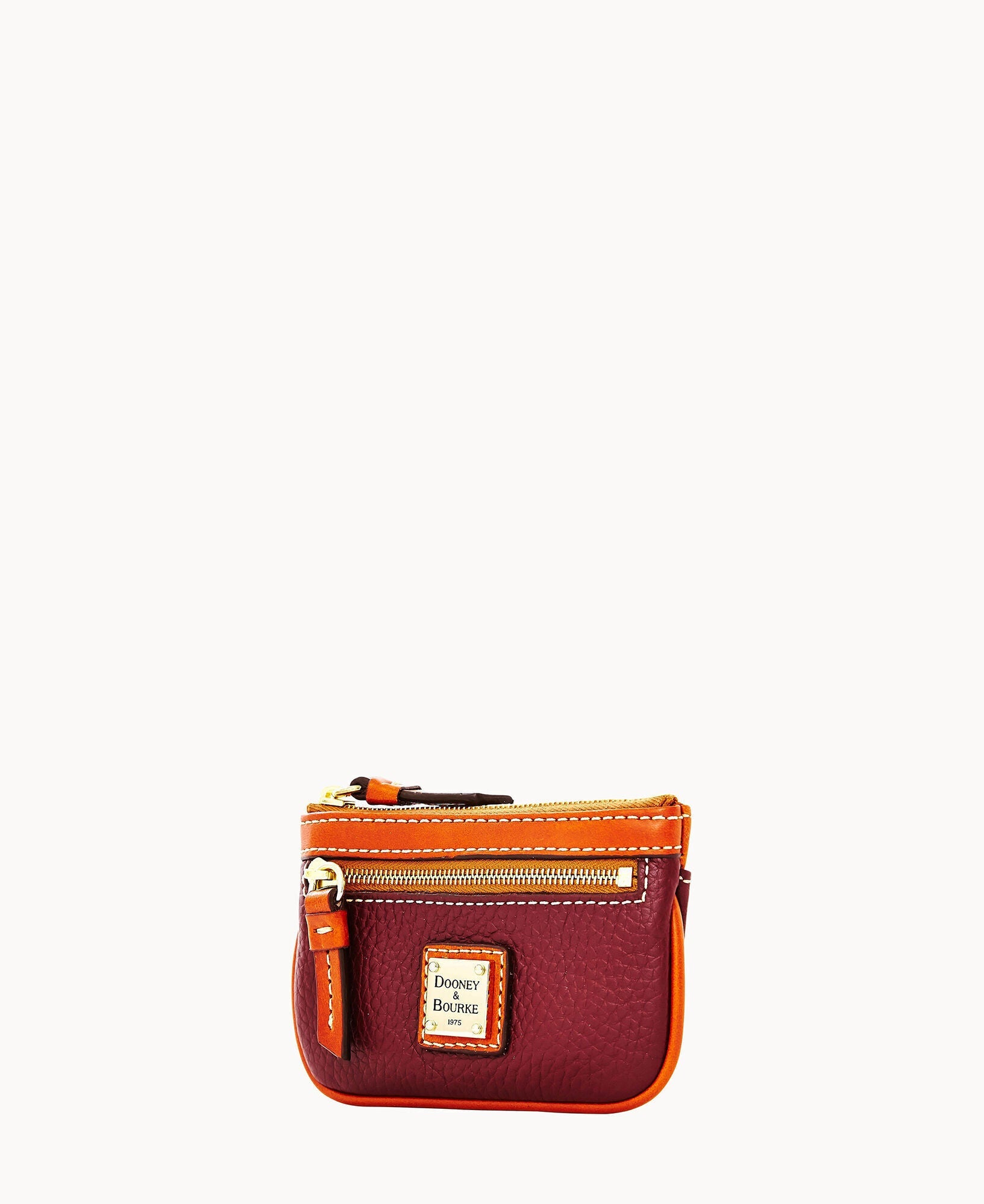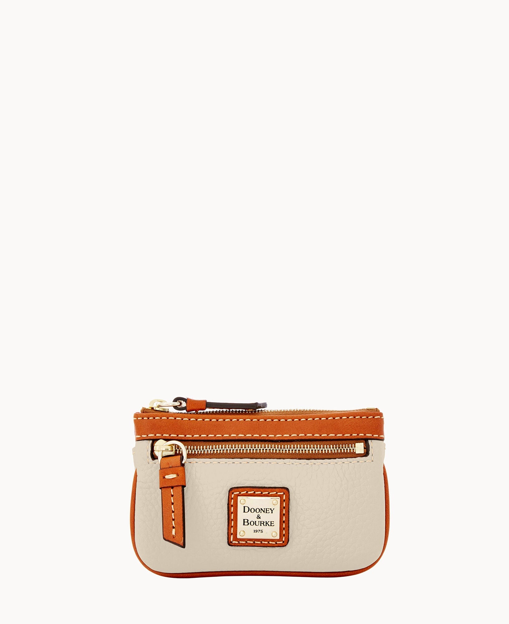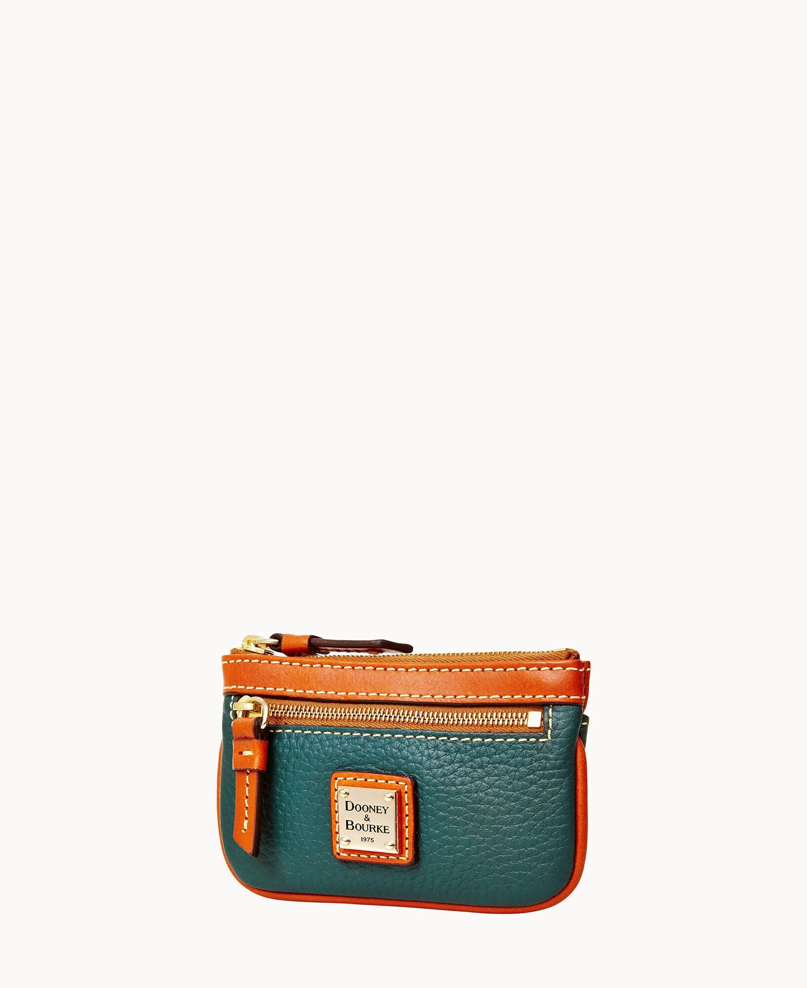 One outside zip pocket. Inside key ring. Lined. Zipper closure.