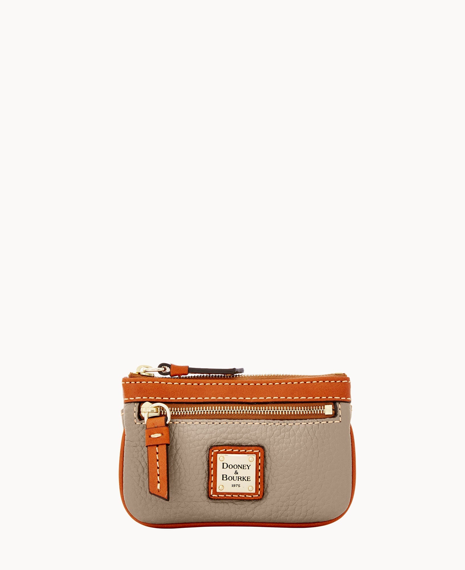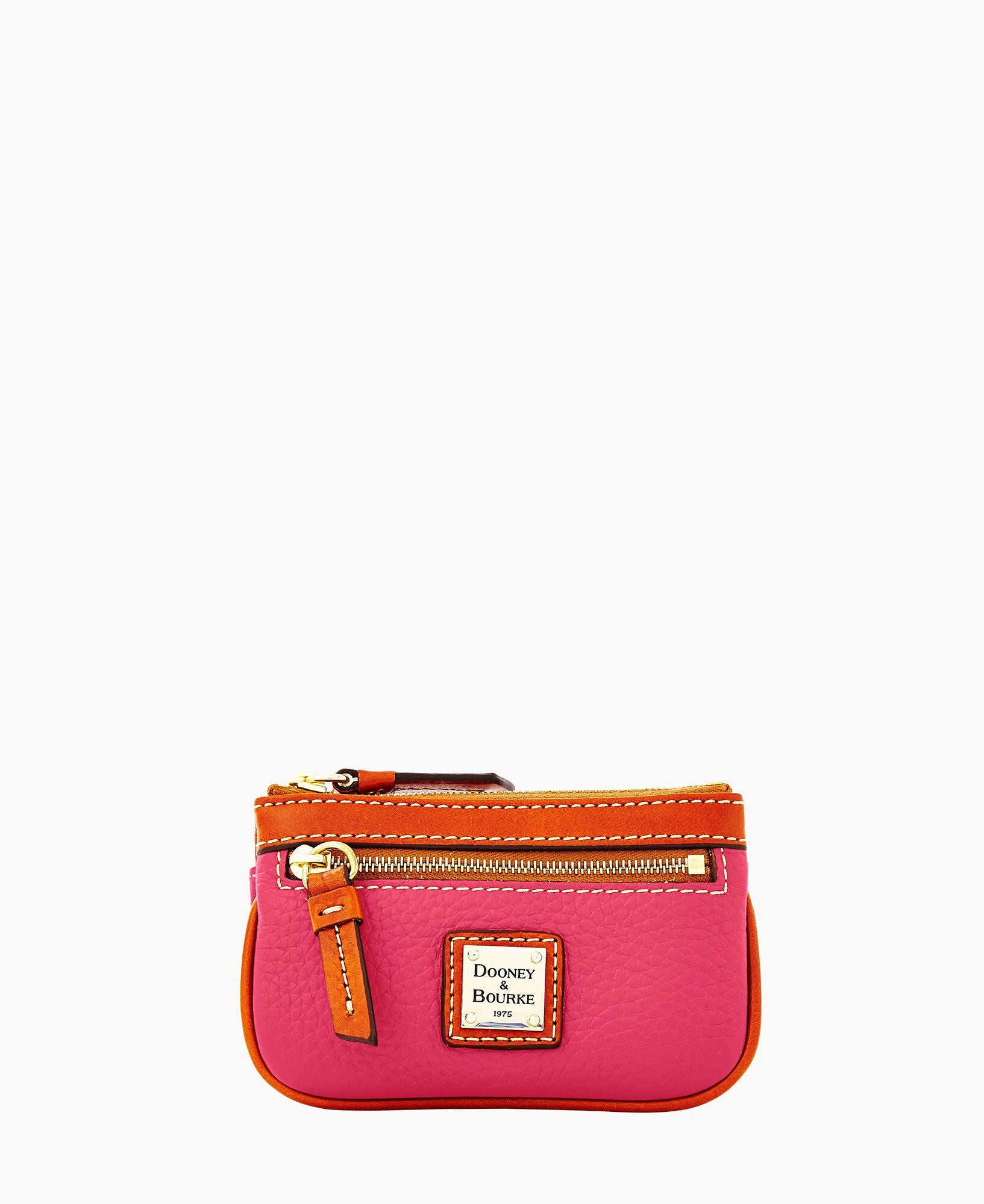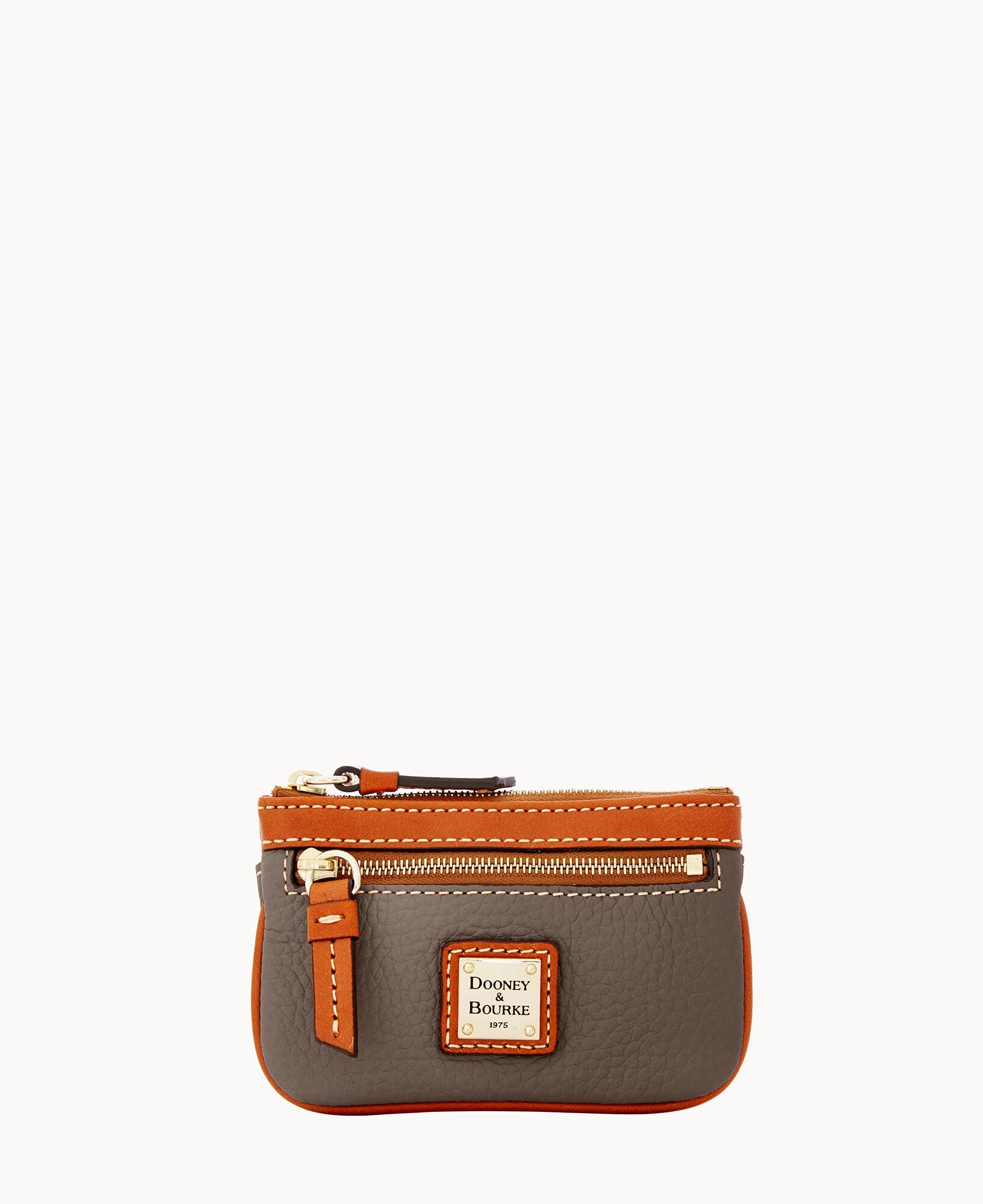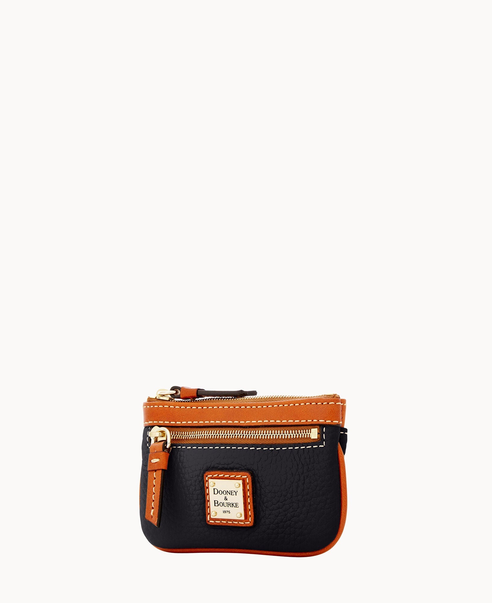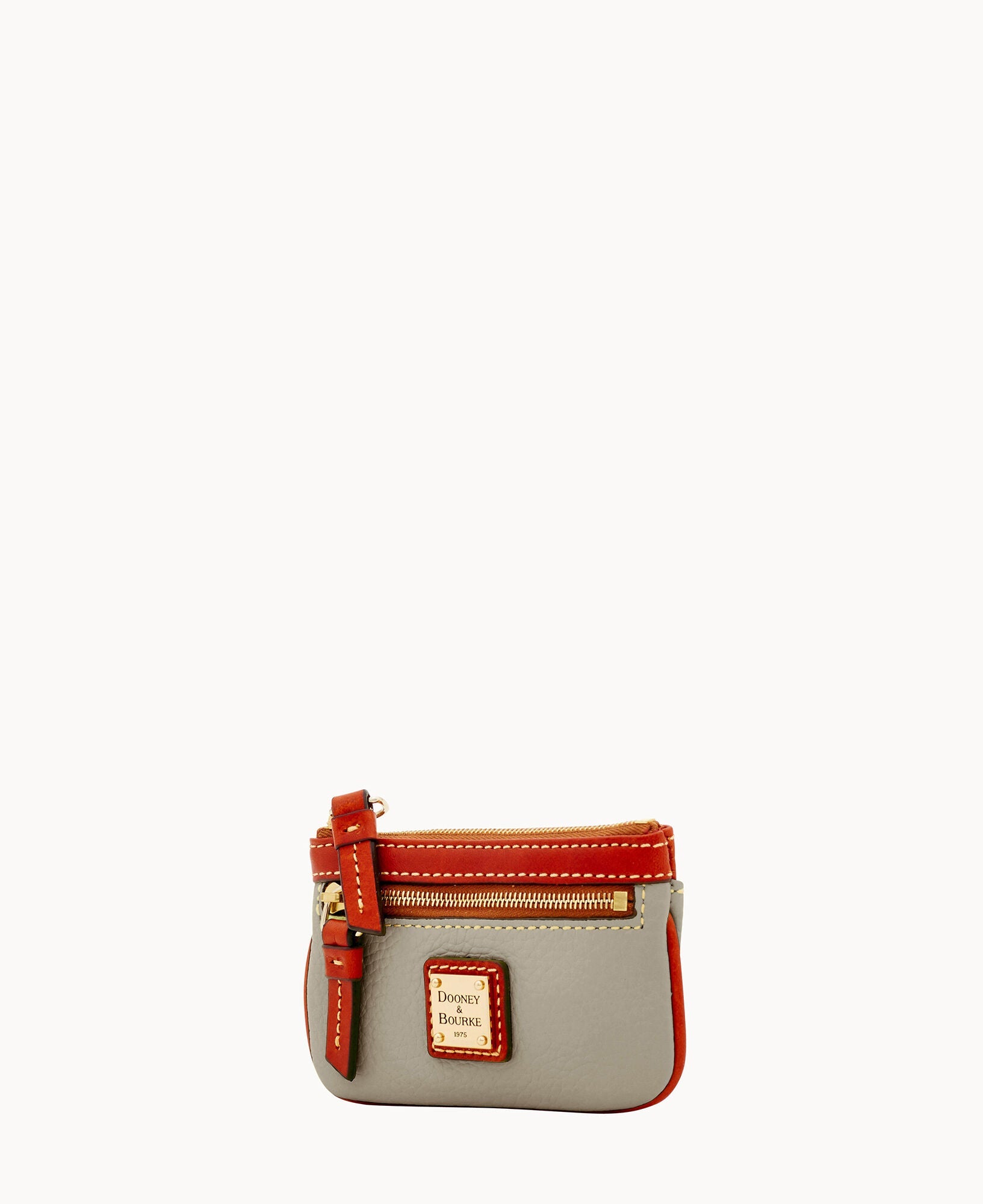 One outside zip pocket. Inside key ring. Lined. Zipper closure.