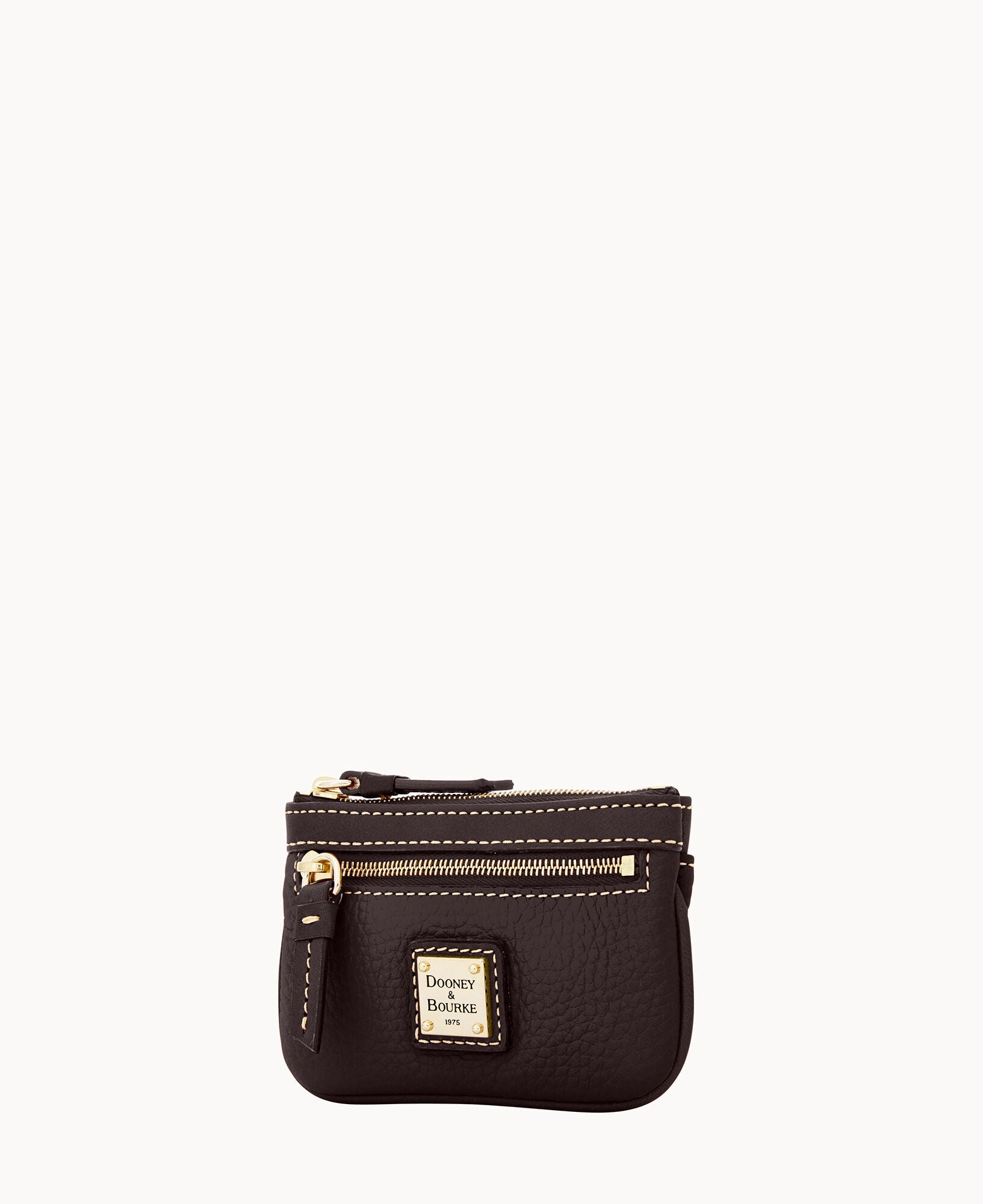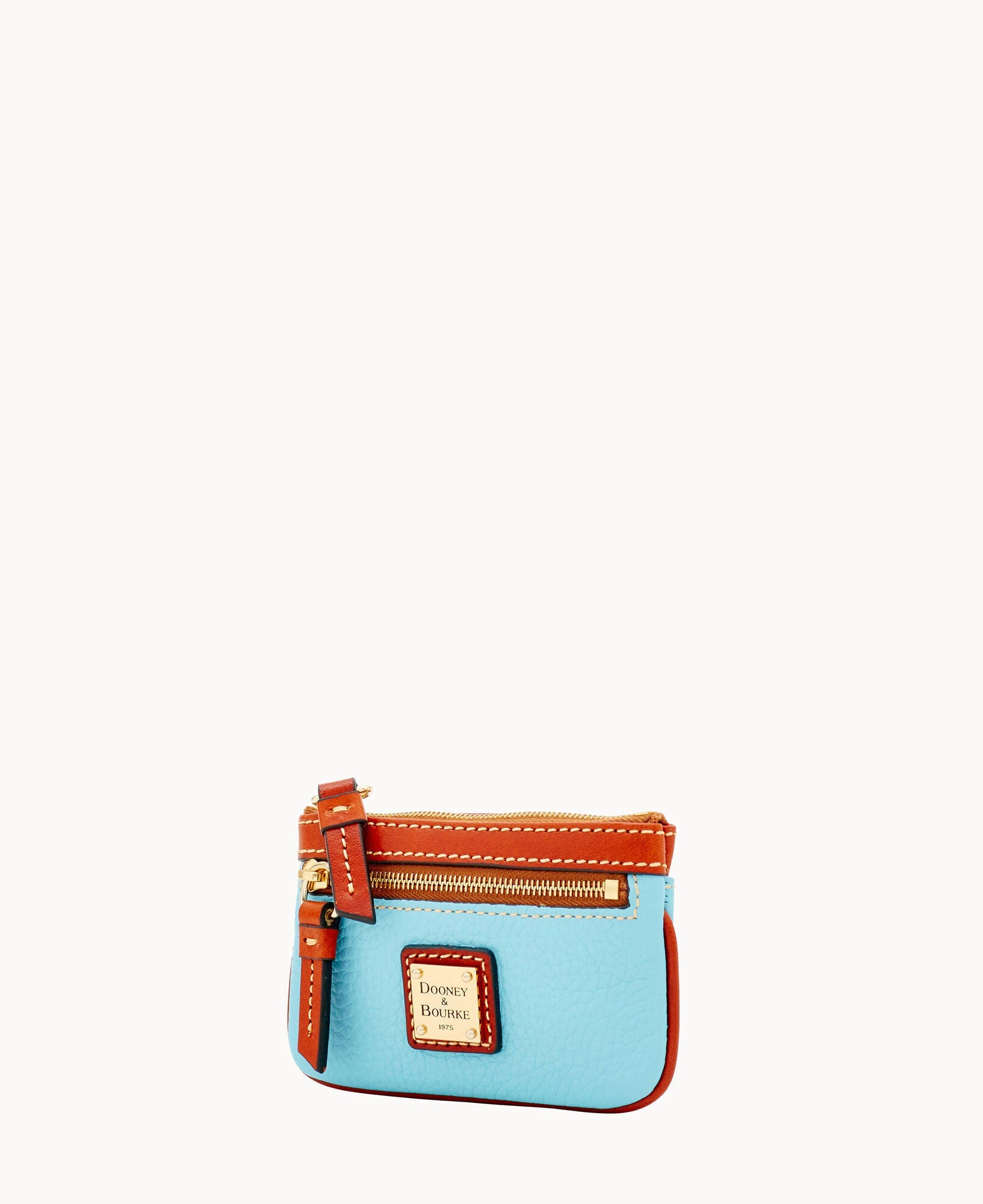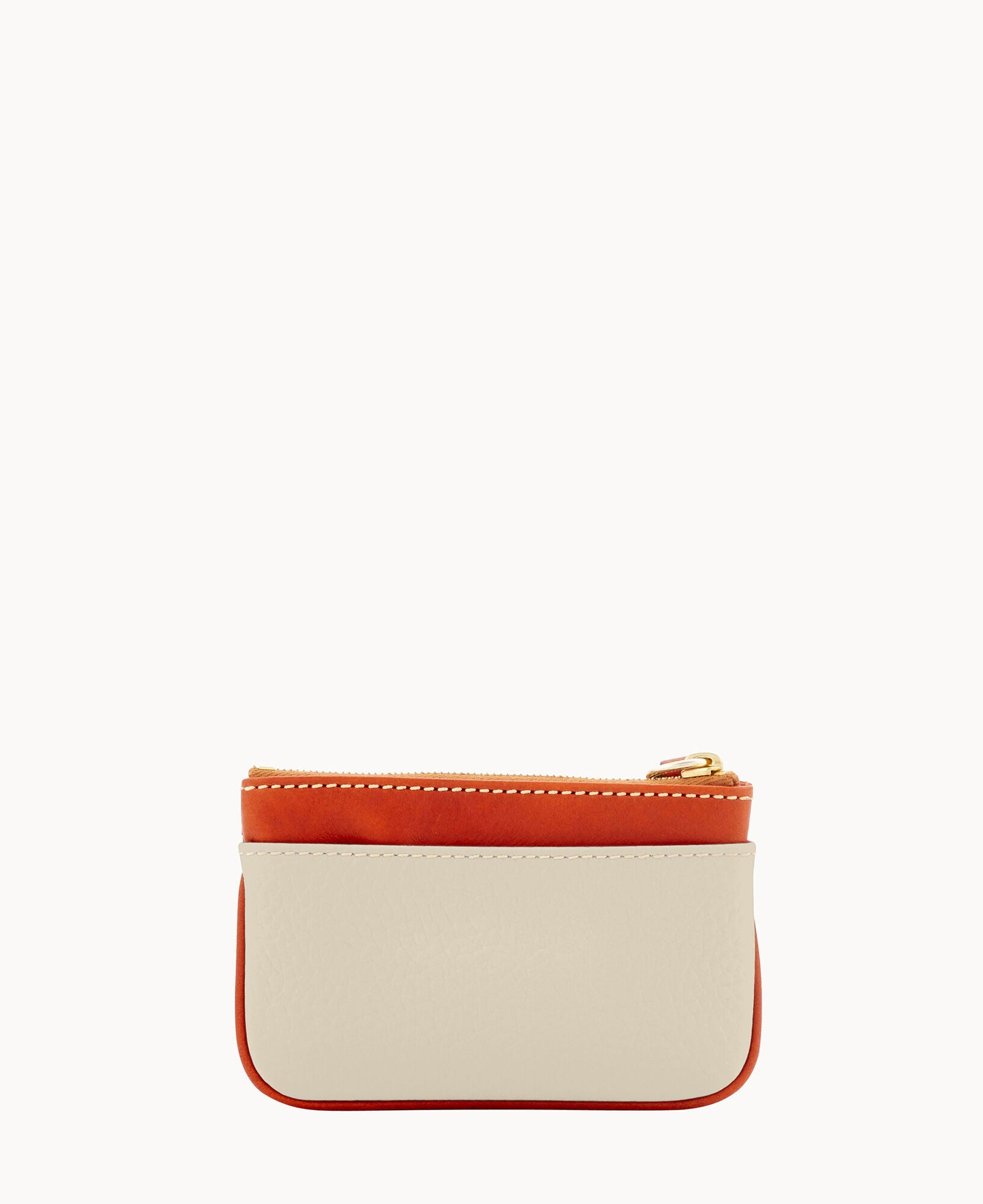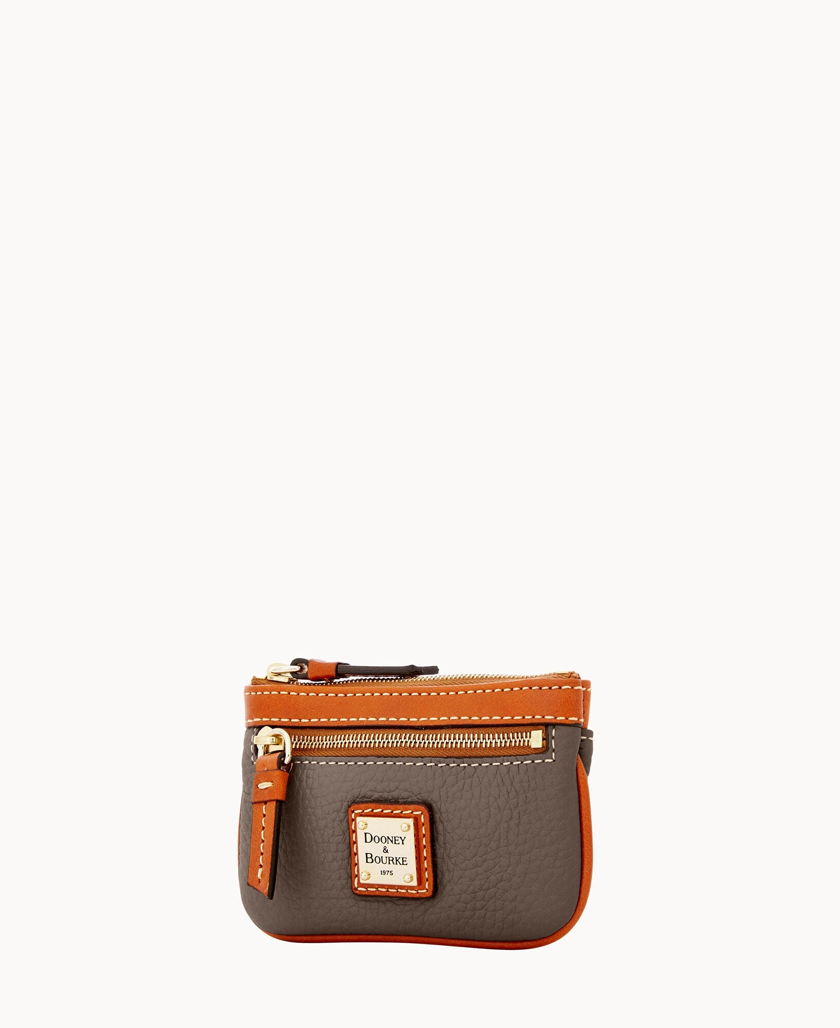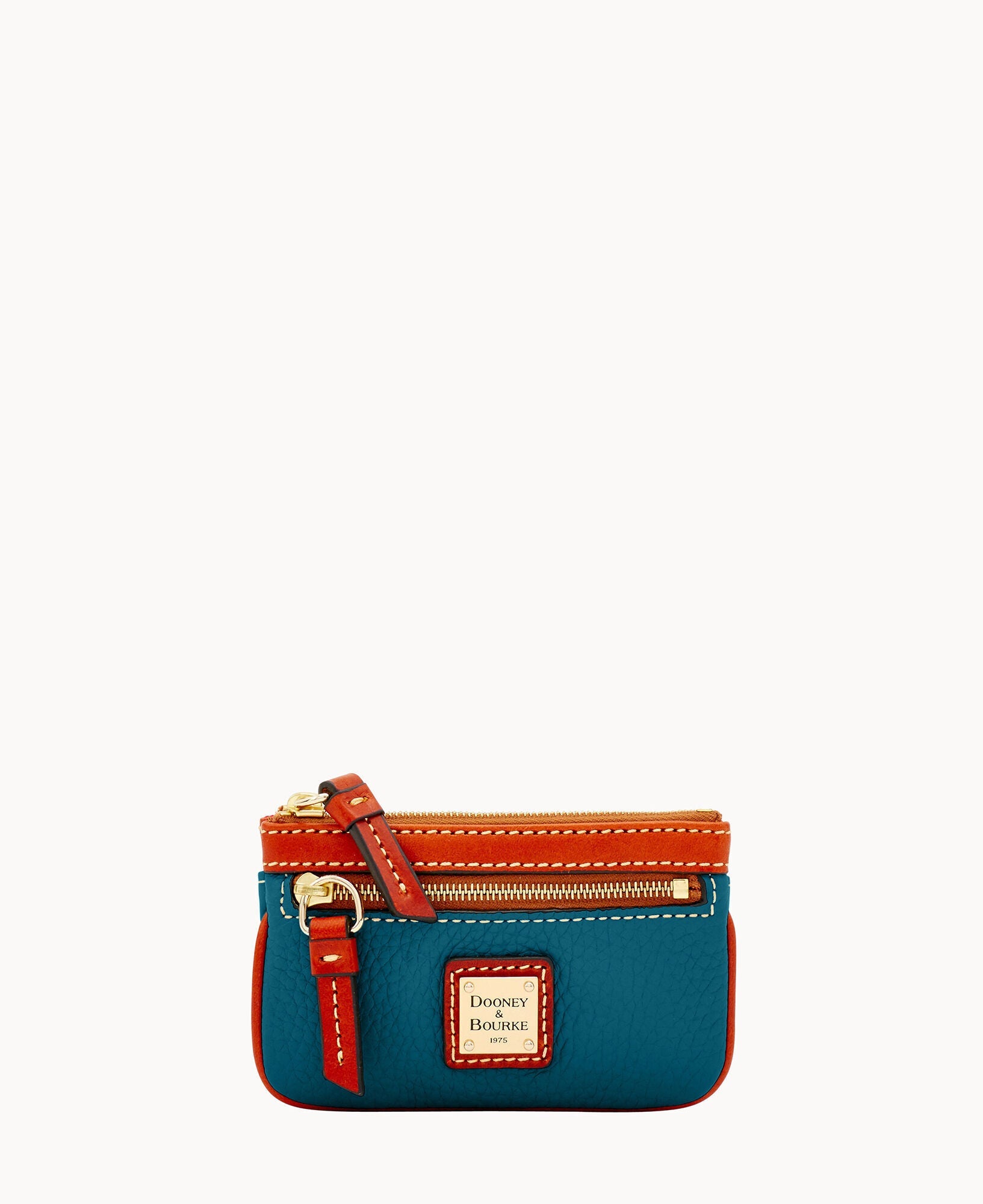 One outside zip pocket. Inside key ring. Lined. Zipper closure.