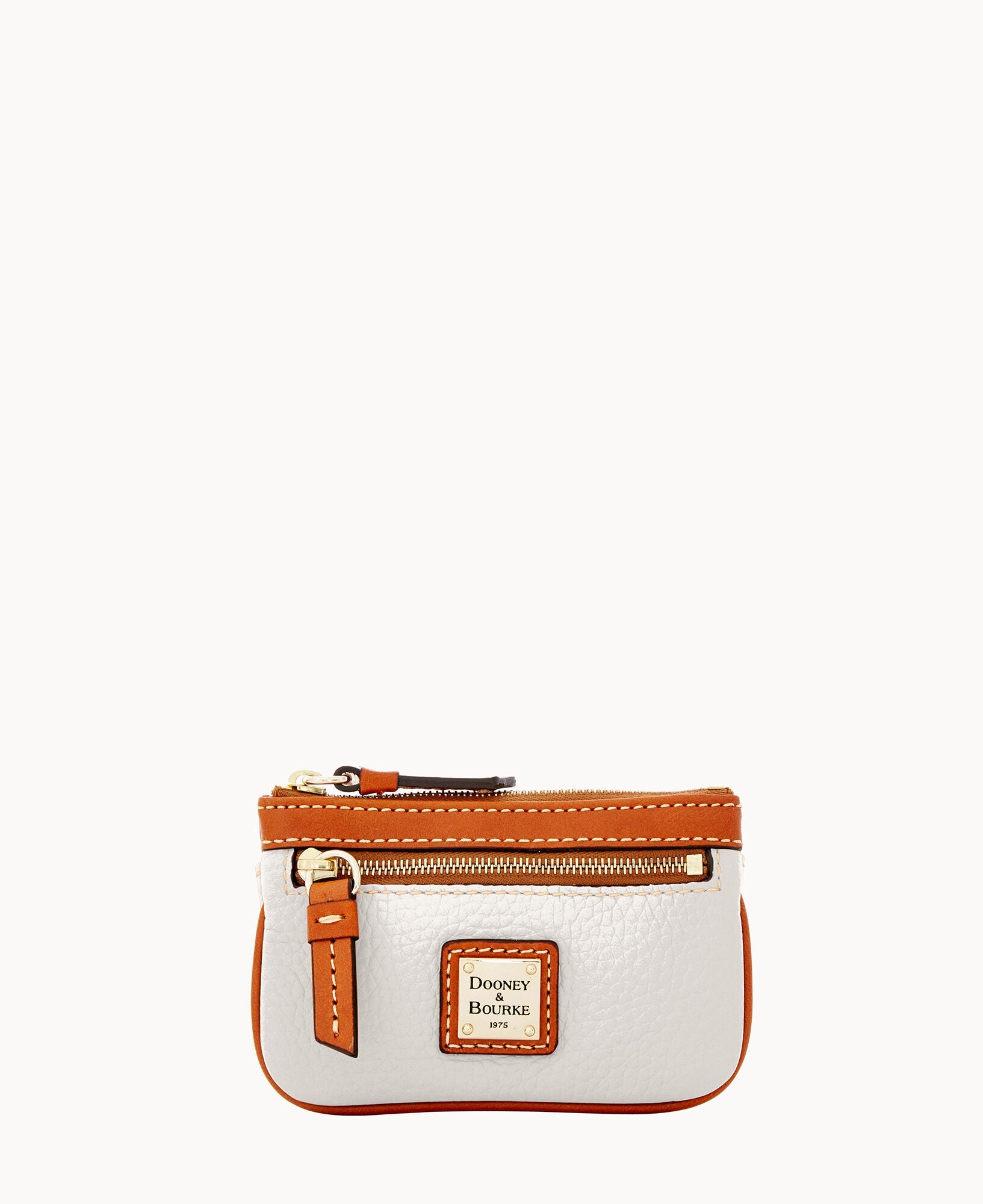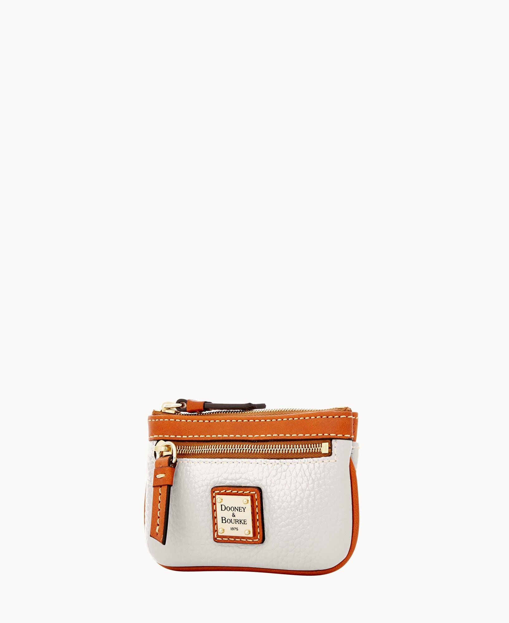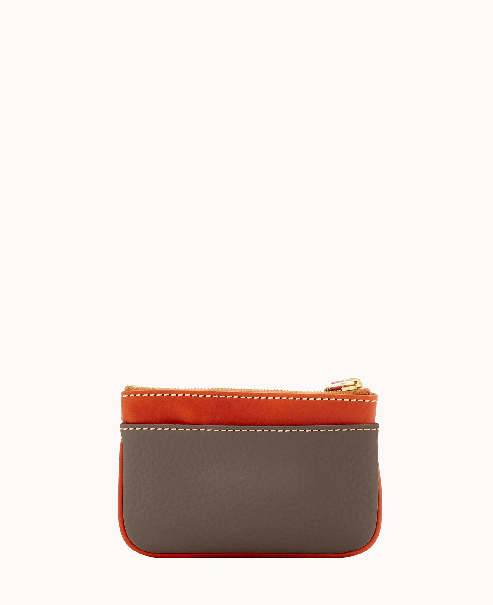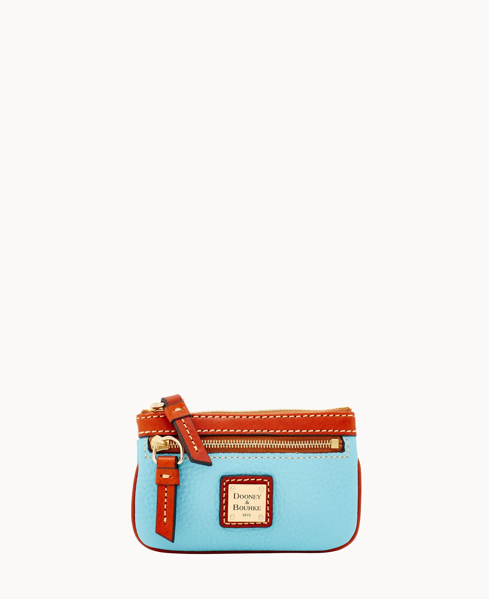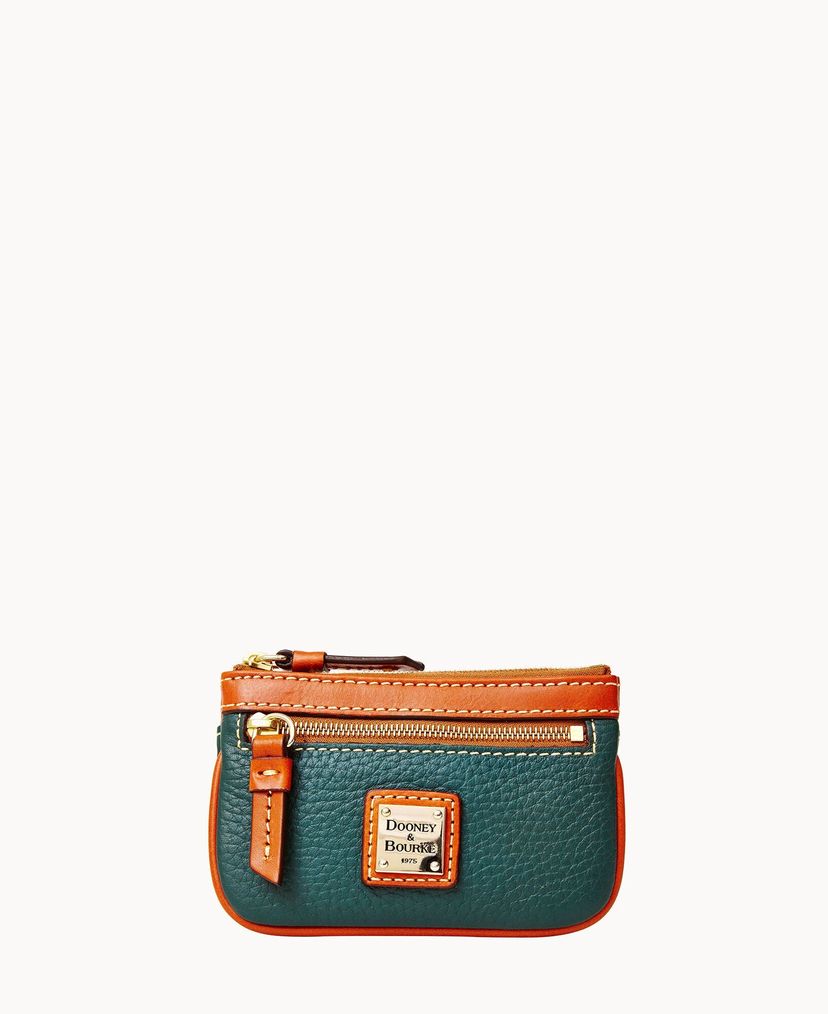 One outside zip pocket. Inside key ring. Lined. Zipper closure.