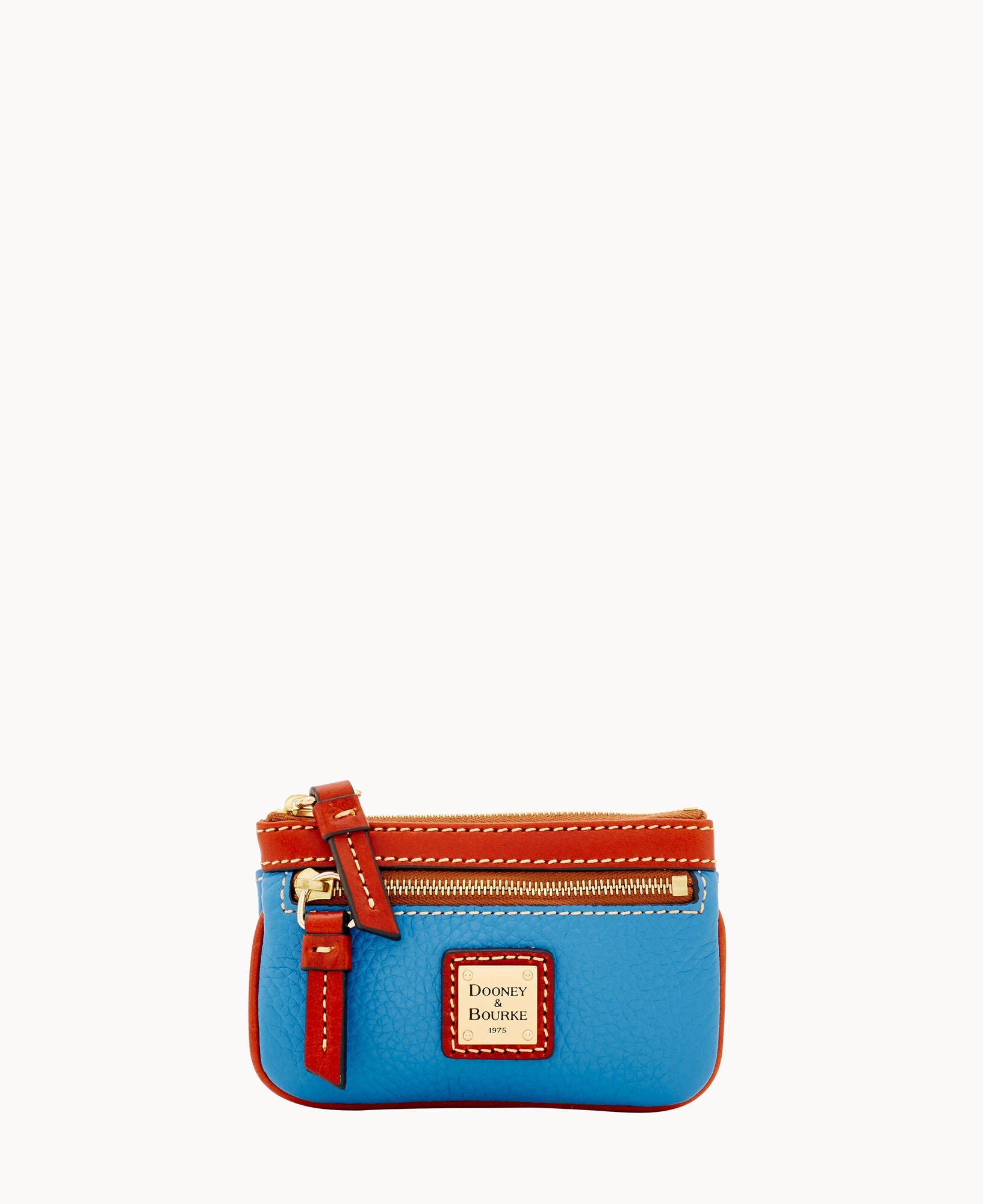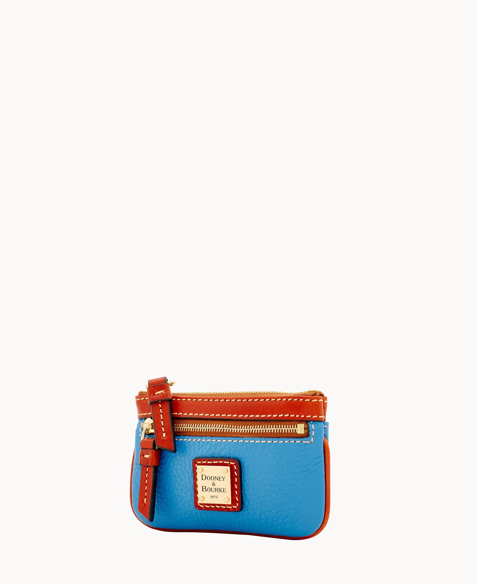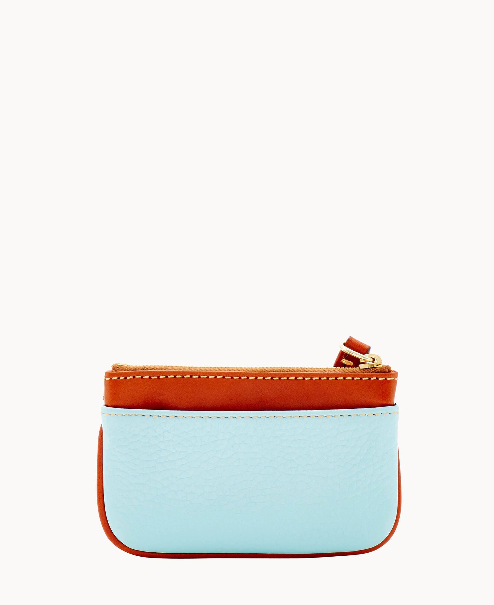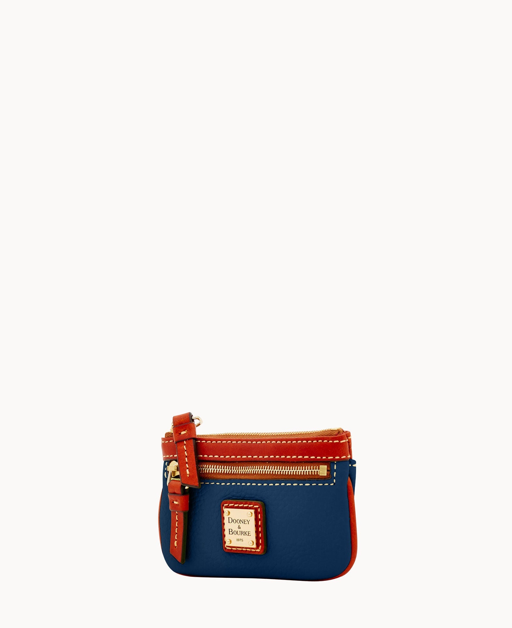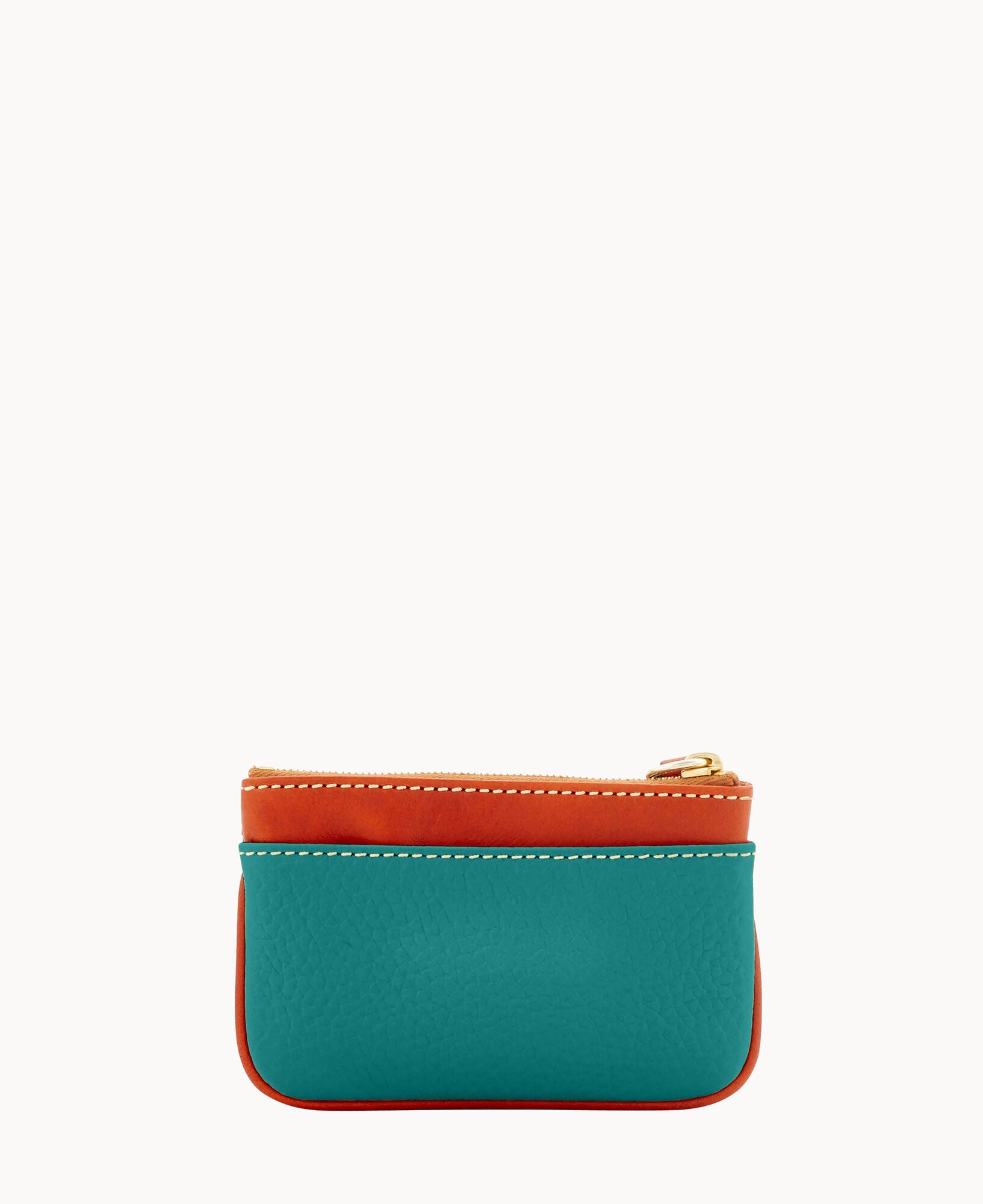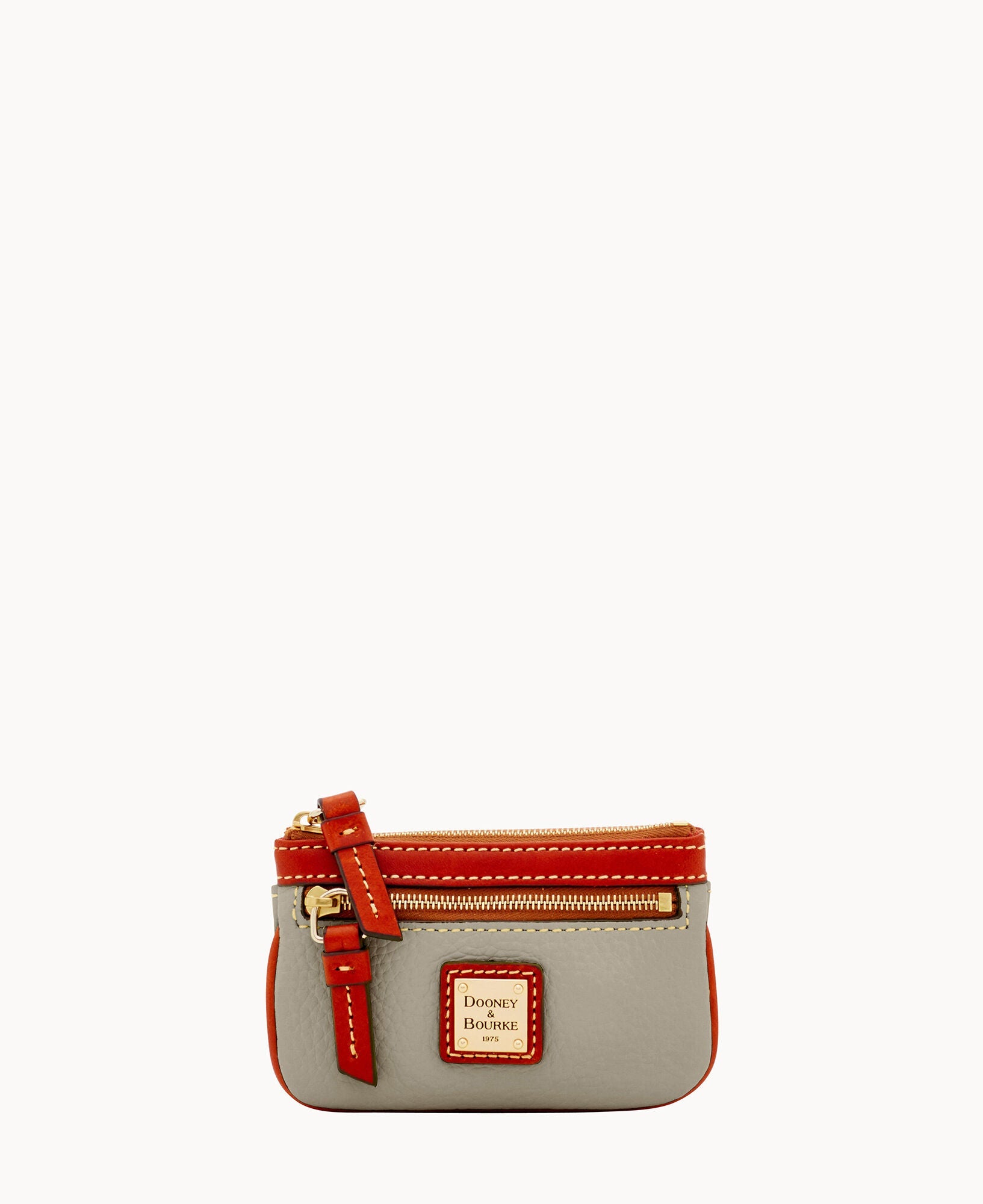 One outside zip pocket. Inside key ring. Lined. Zipper closure.