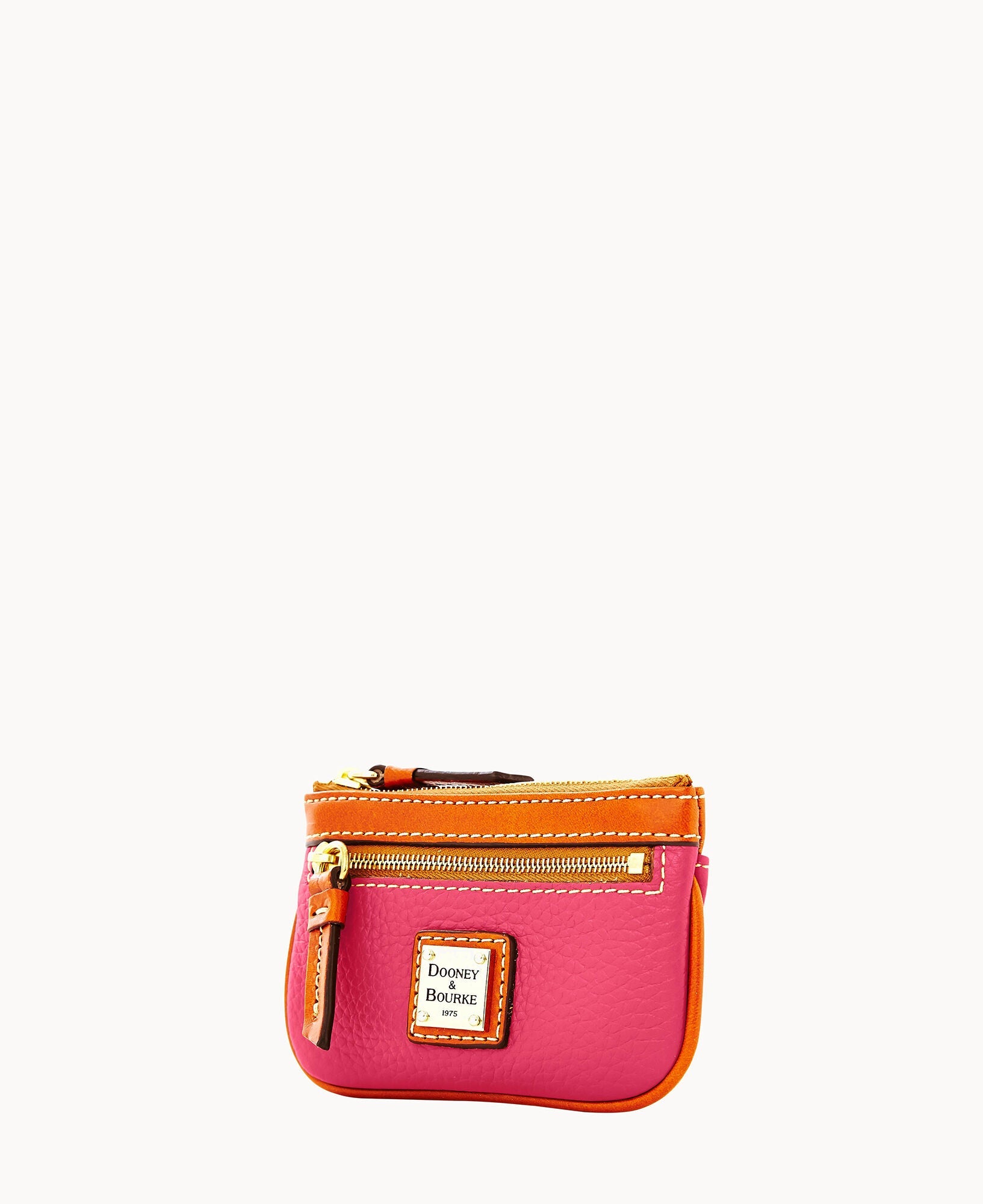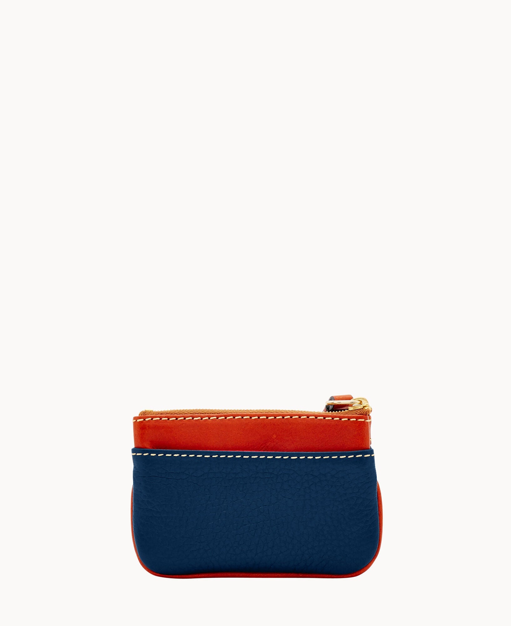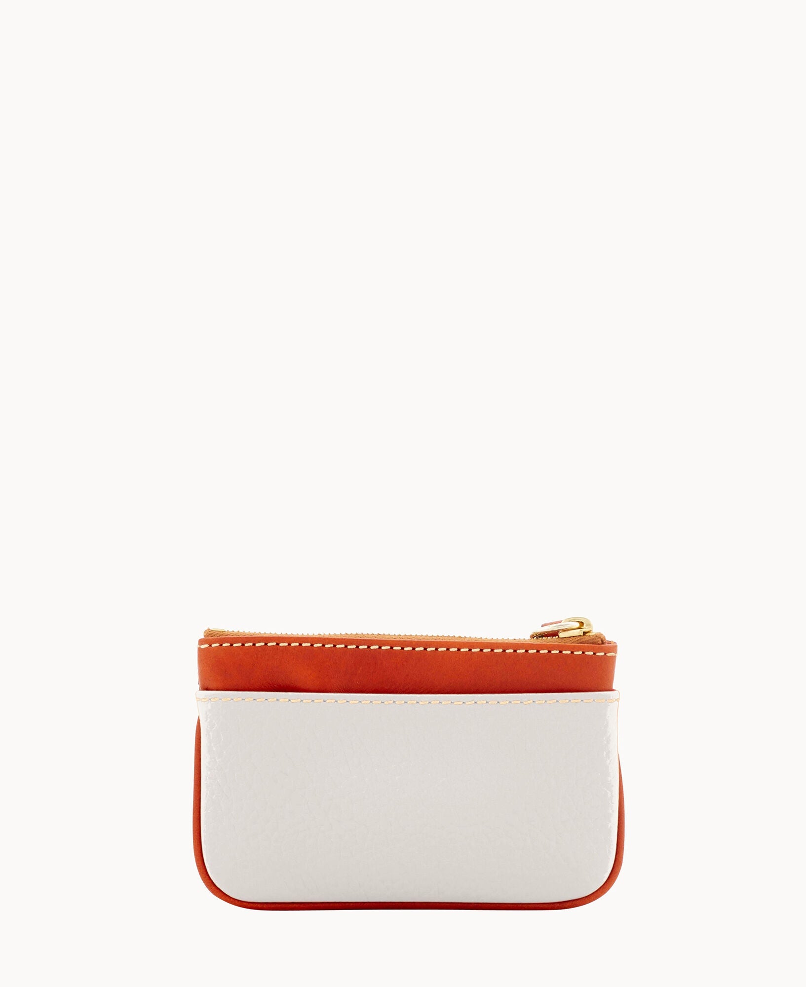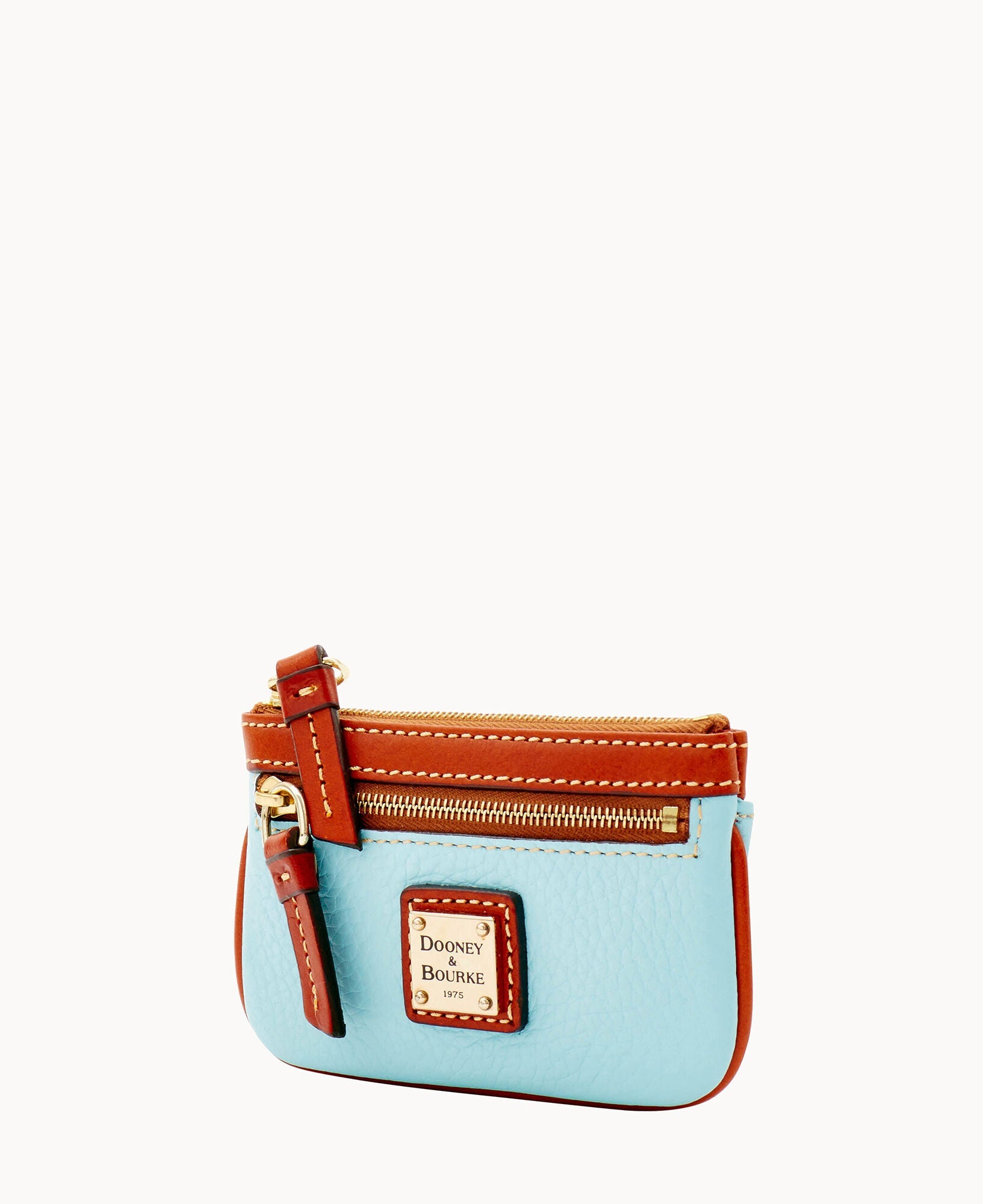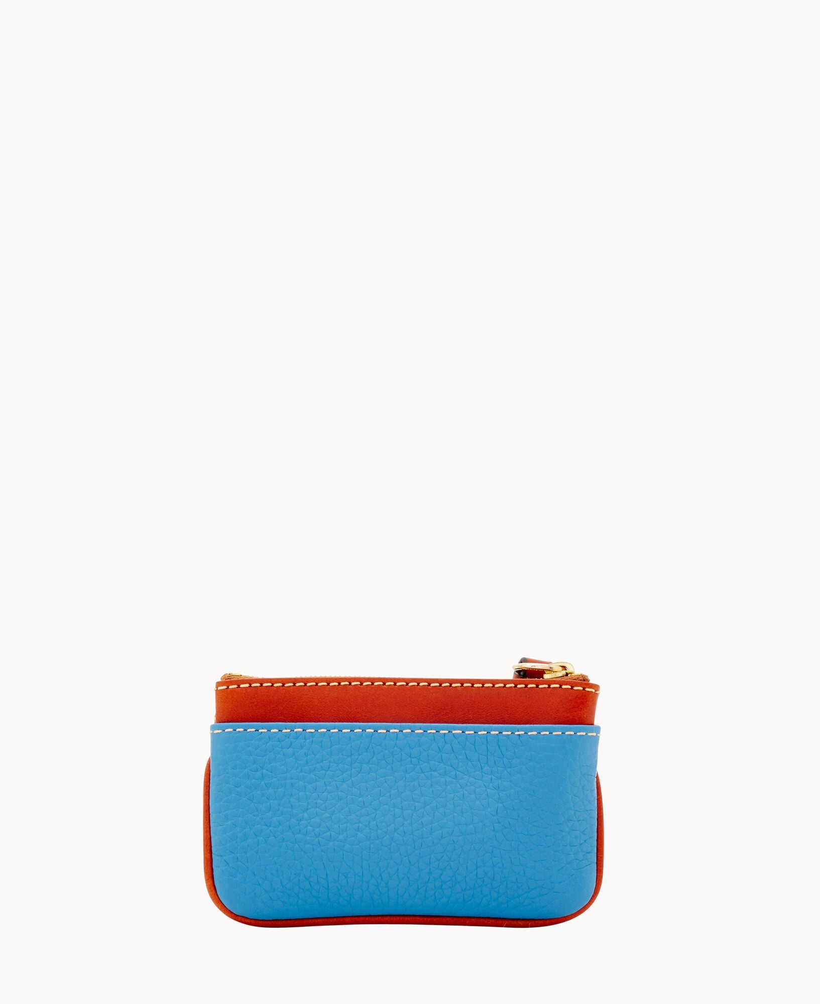 One outside zip pocket. Inside key ring. Lined. Zipper closure.