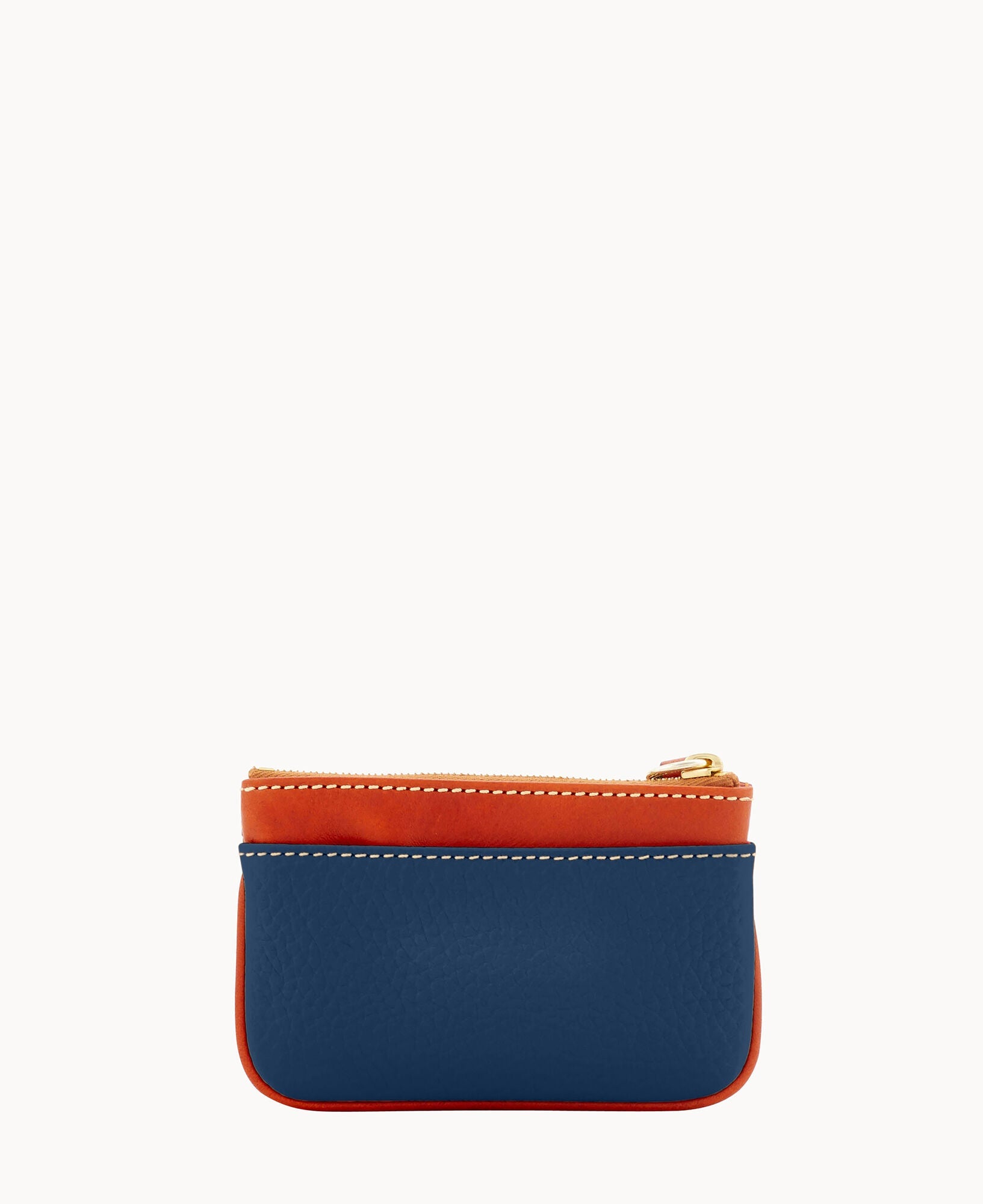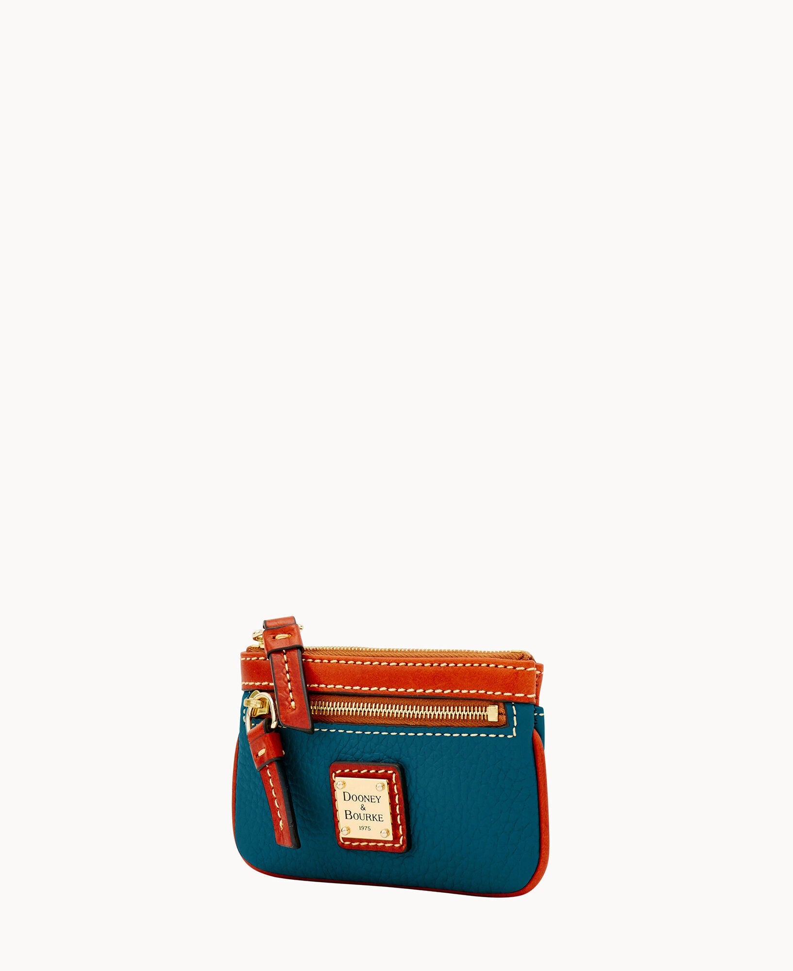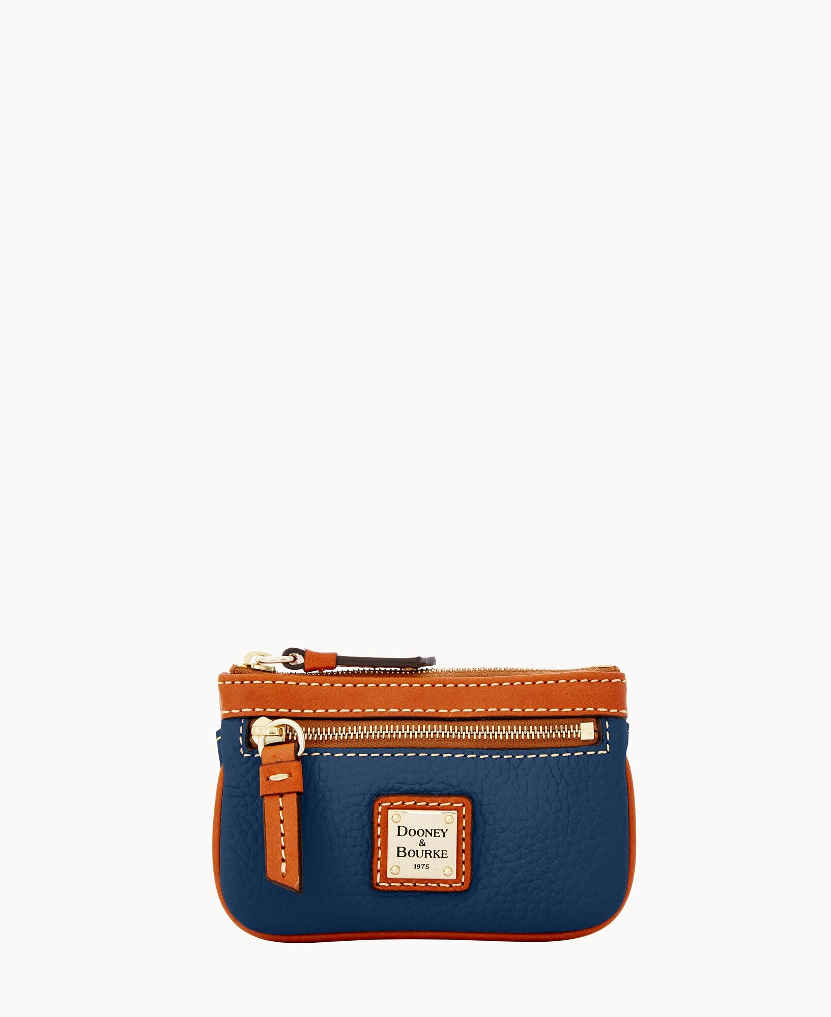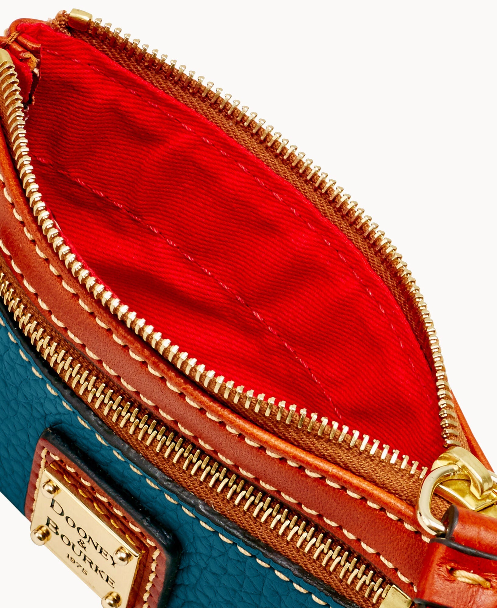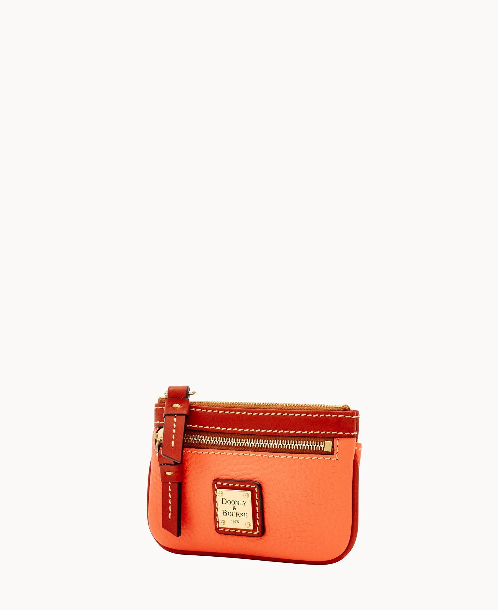 One outside zip pocket. Inside key ring. Lined. Zipper closure.