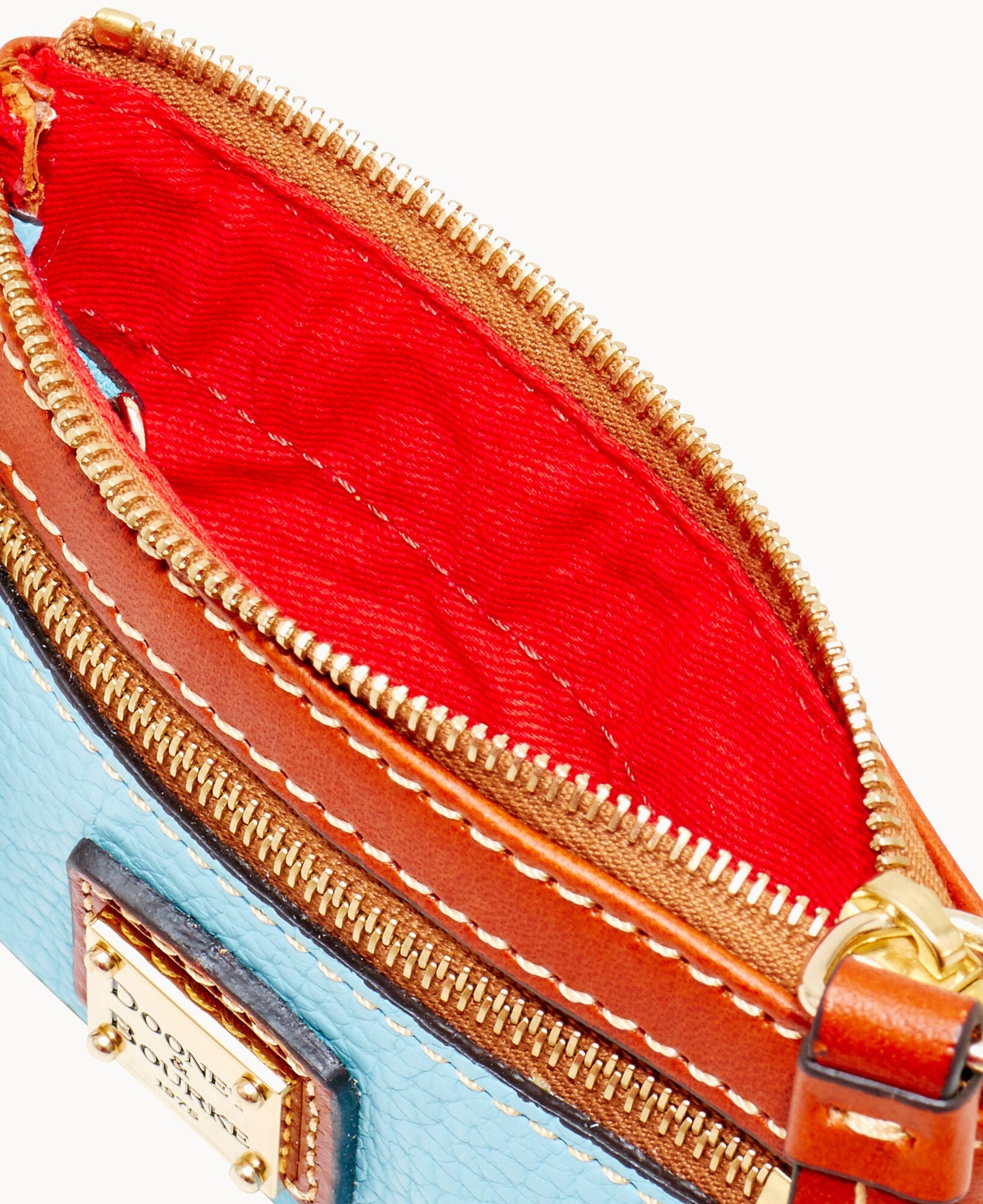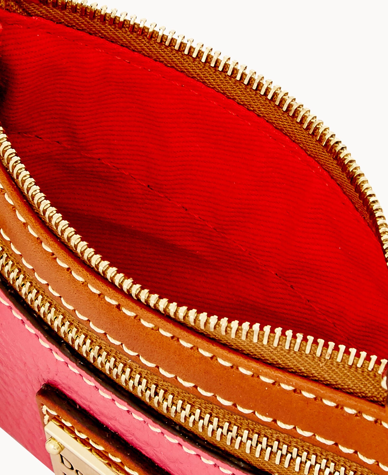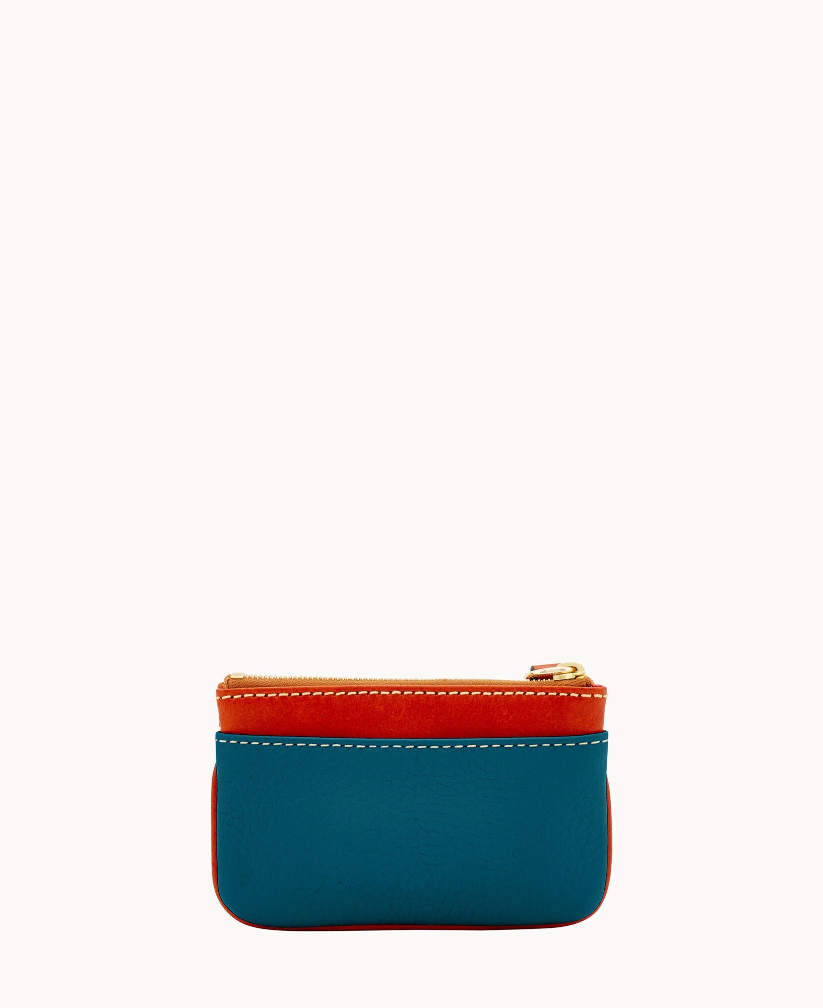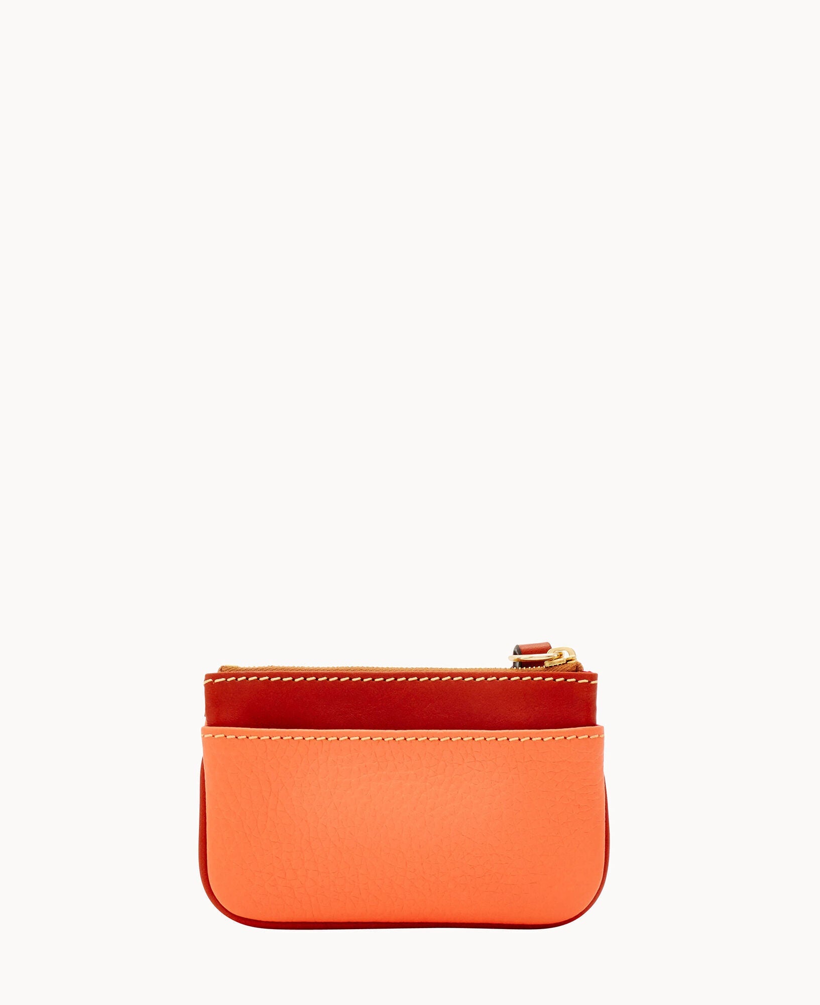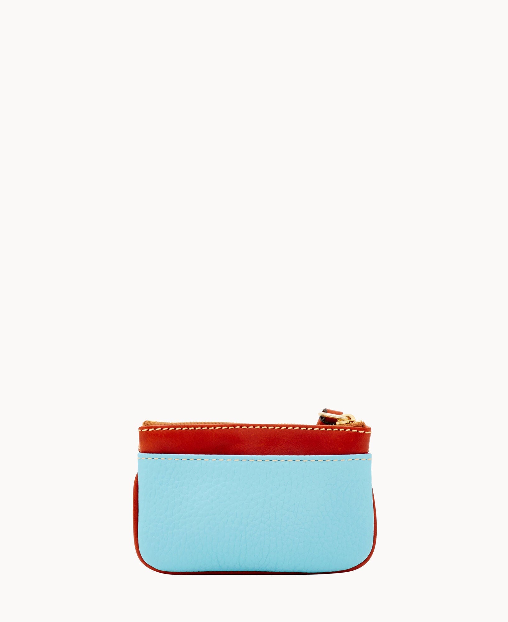 One outside zip pocket. Inside key ring. Lined. Zipper closure.