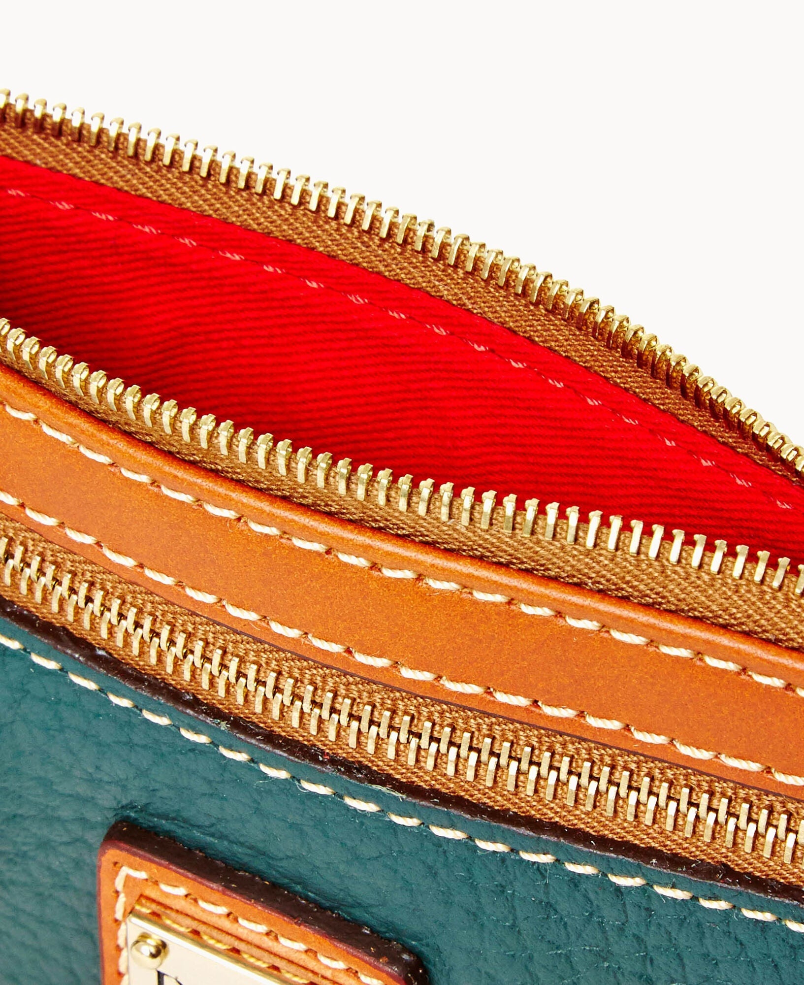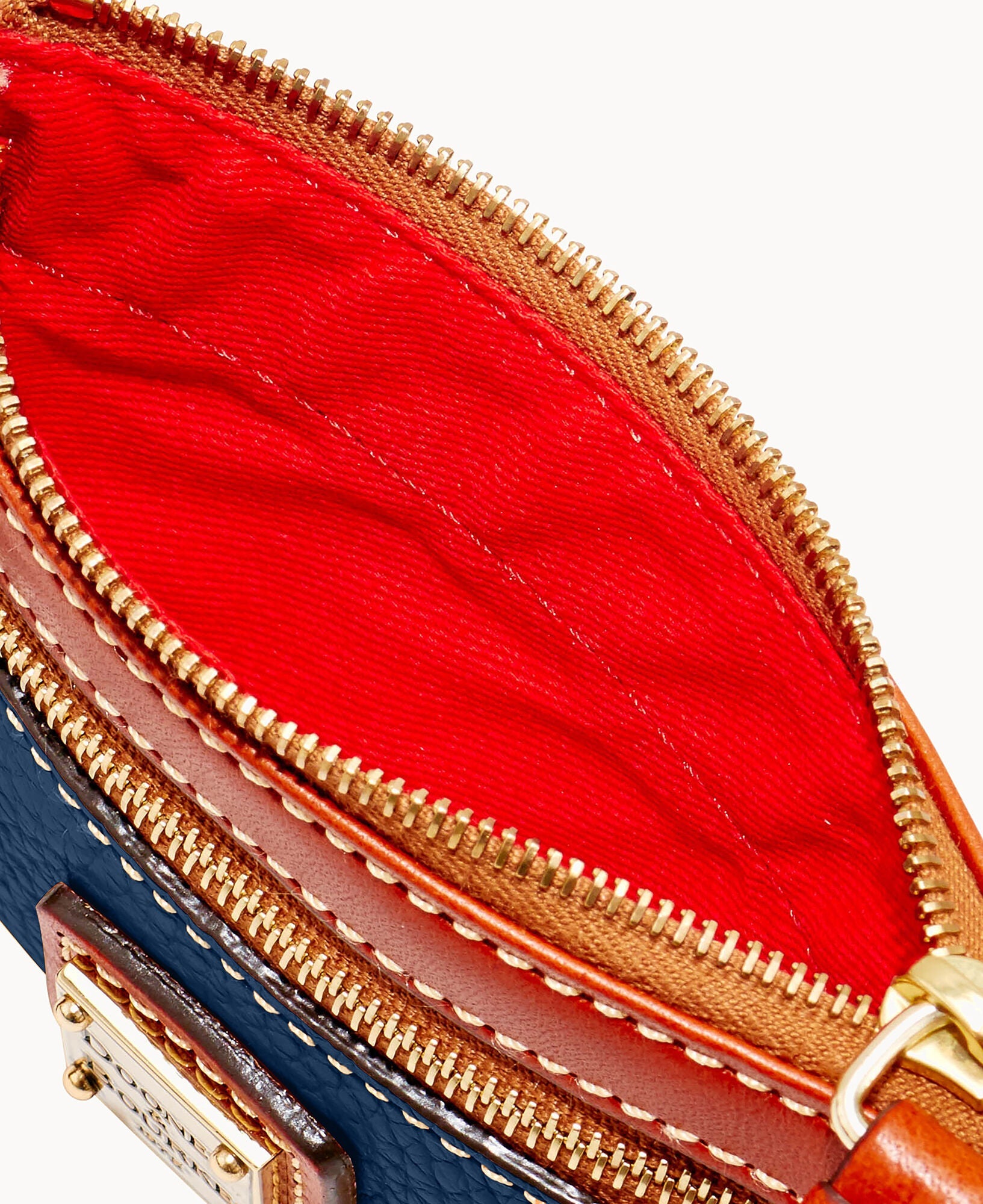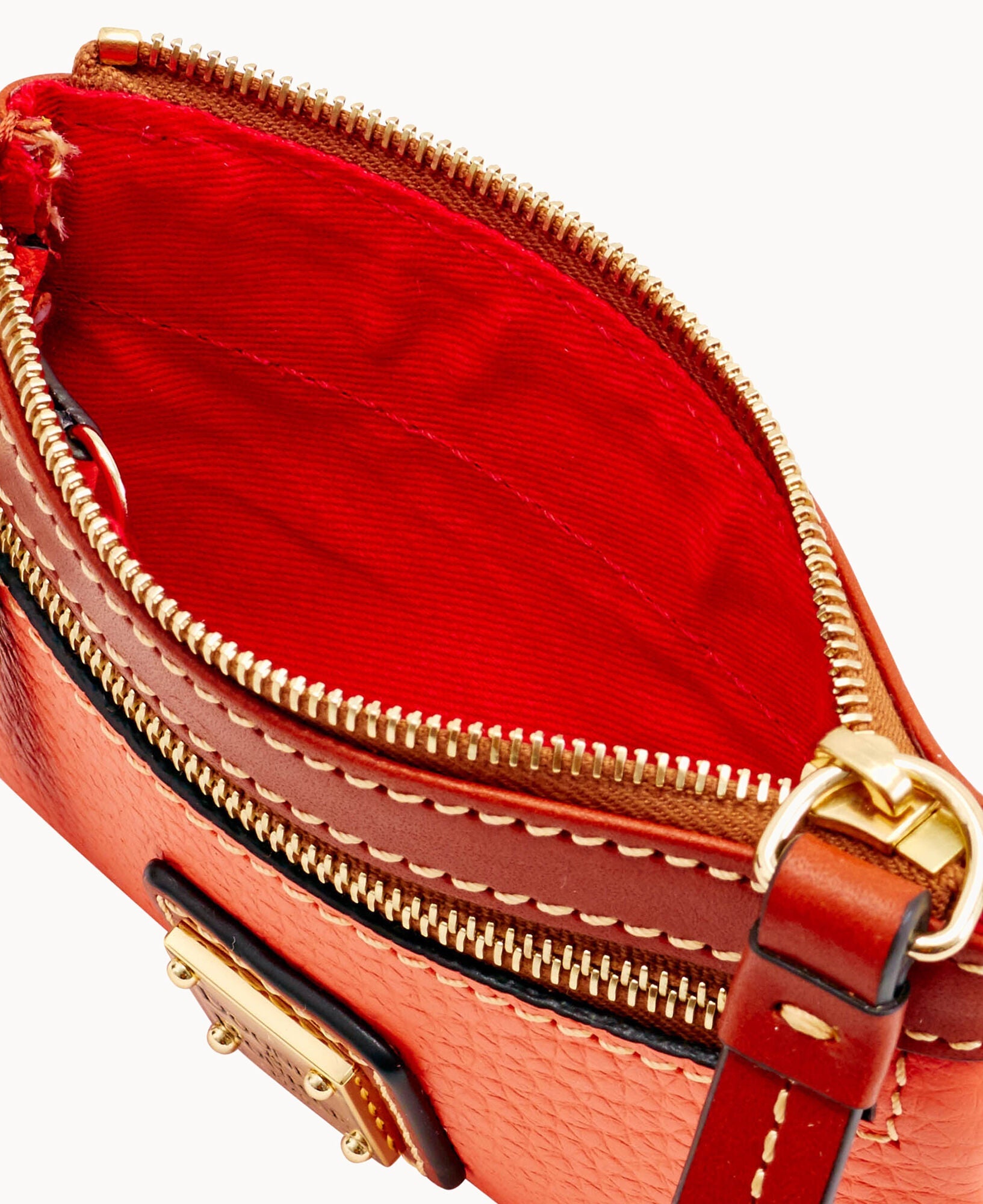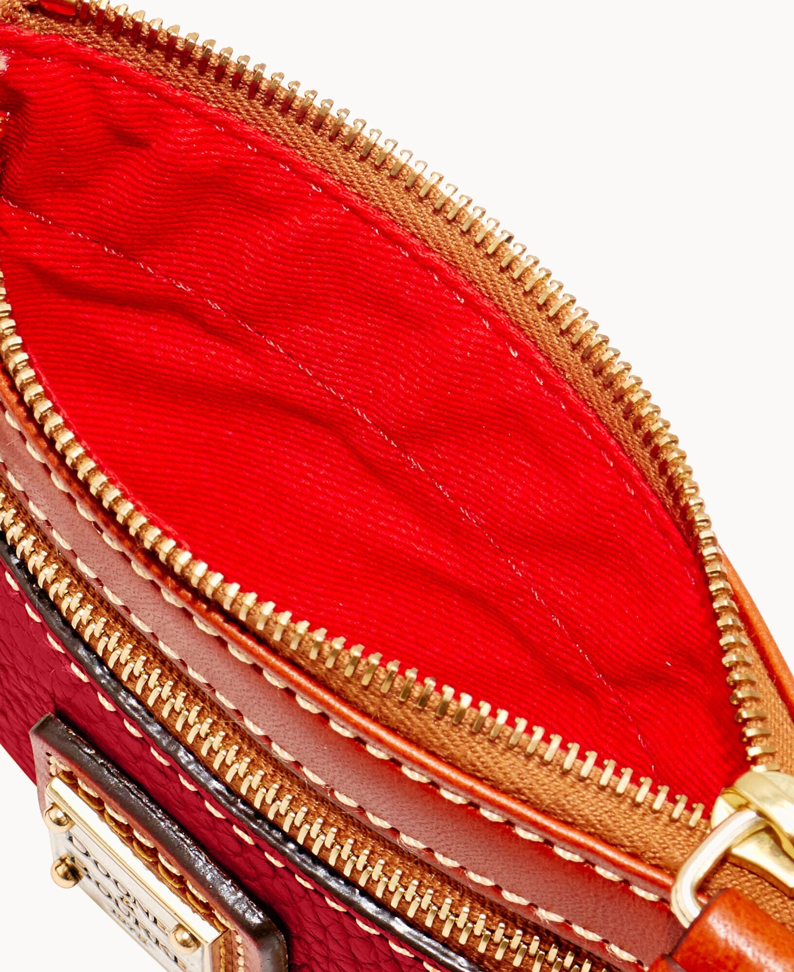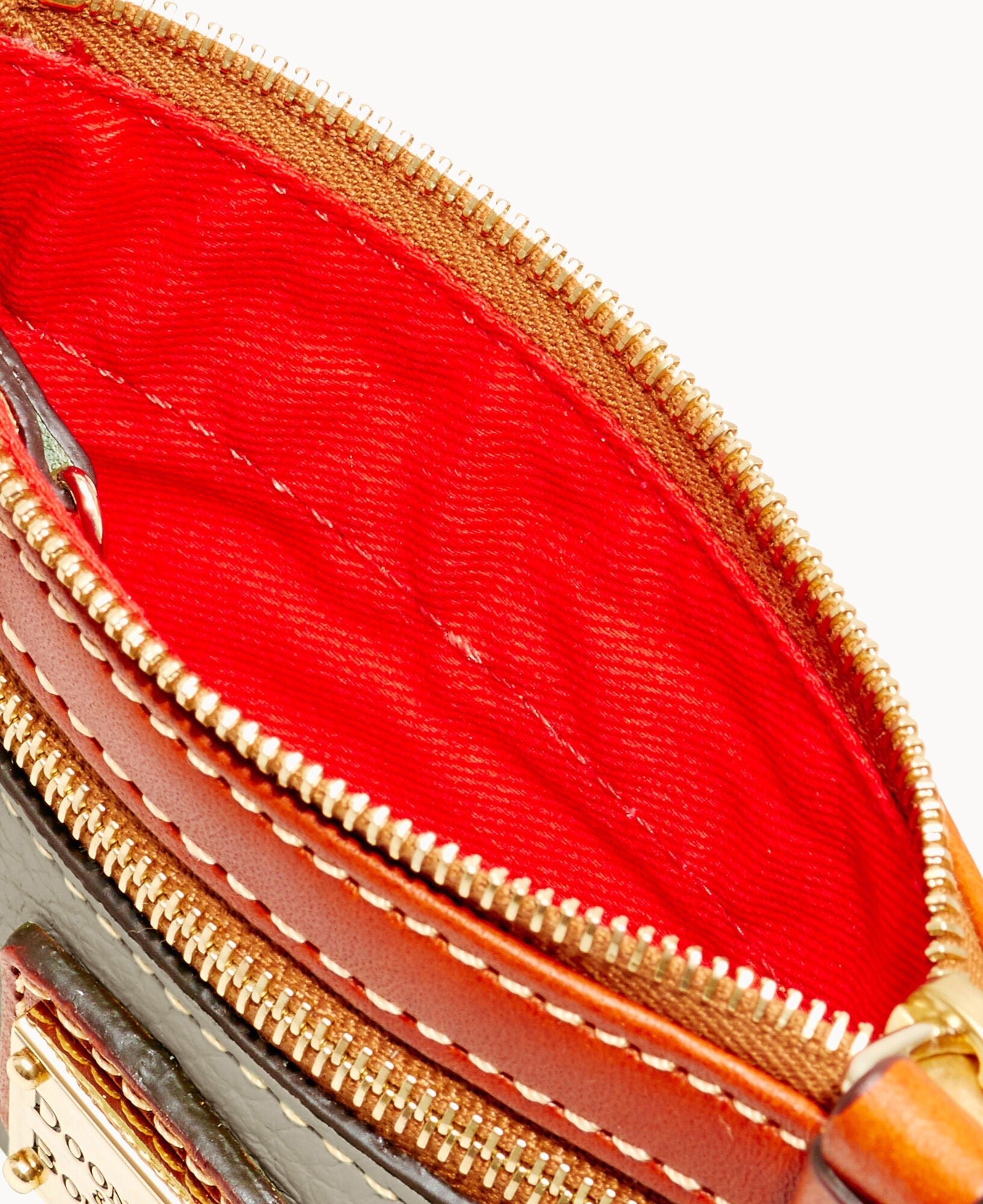 One outside zip pocket. Inside key ring. Lined. Zipper closure.
