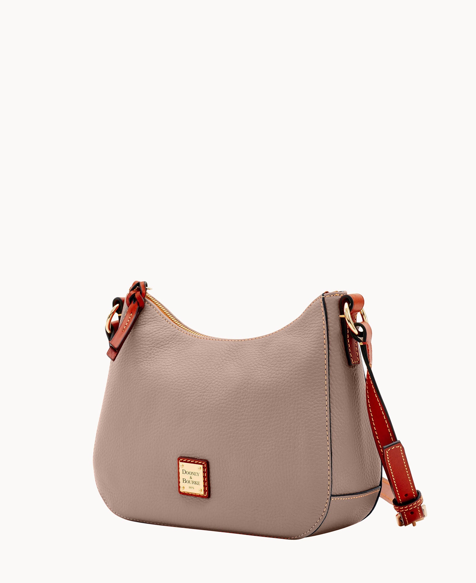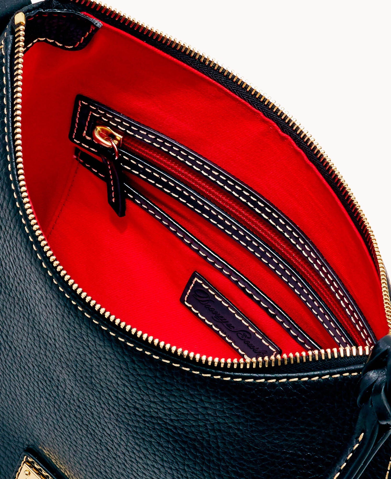 One inside zip pocket. Two inside pockets. Inside key hook. Strap drop length 26.5". Lined. Zipper closure.