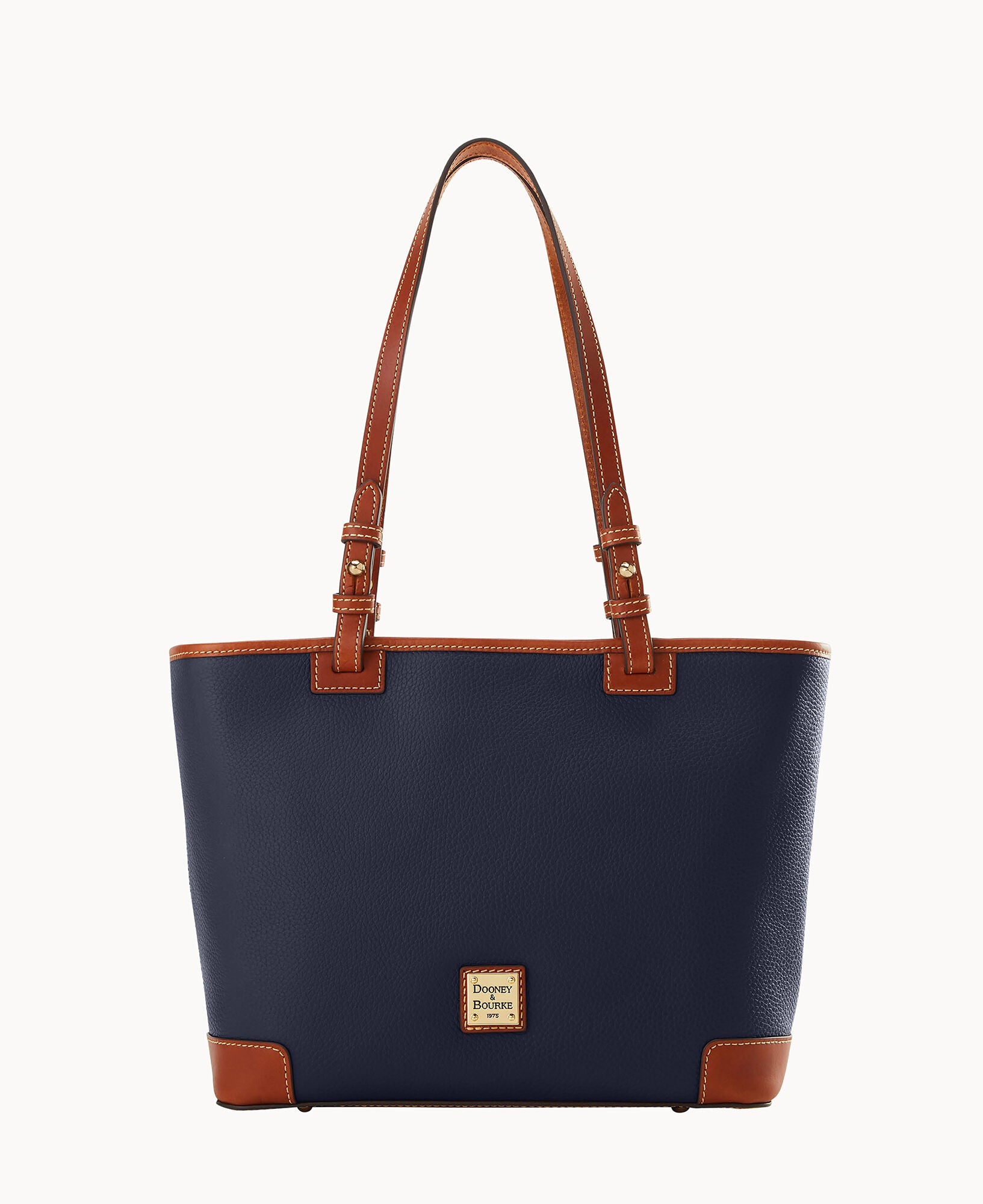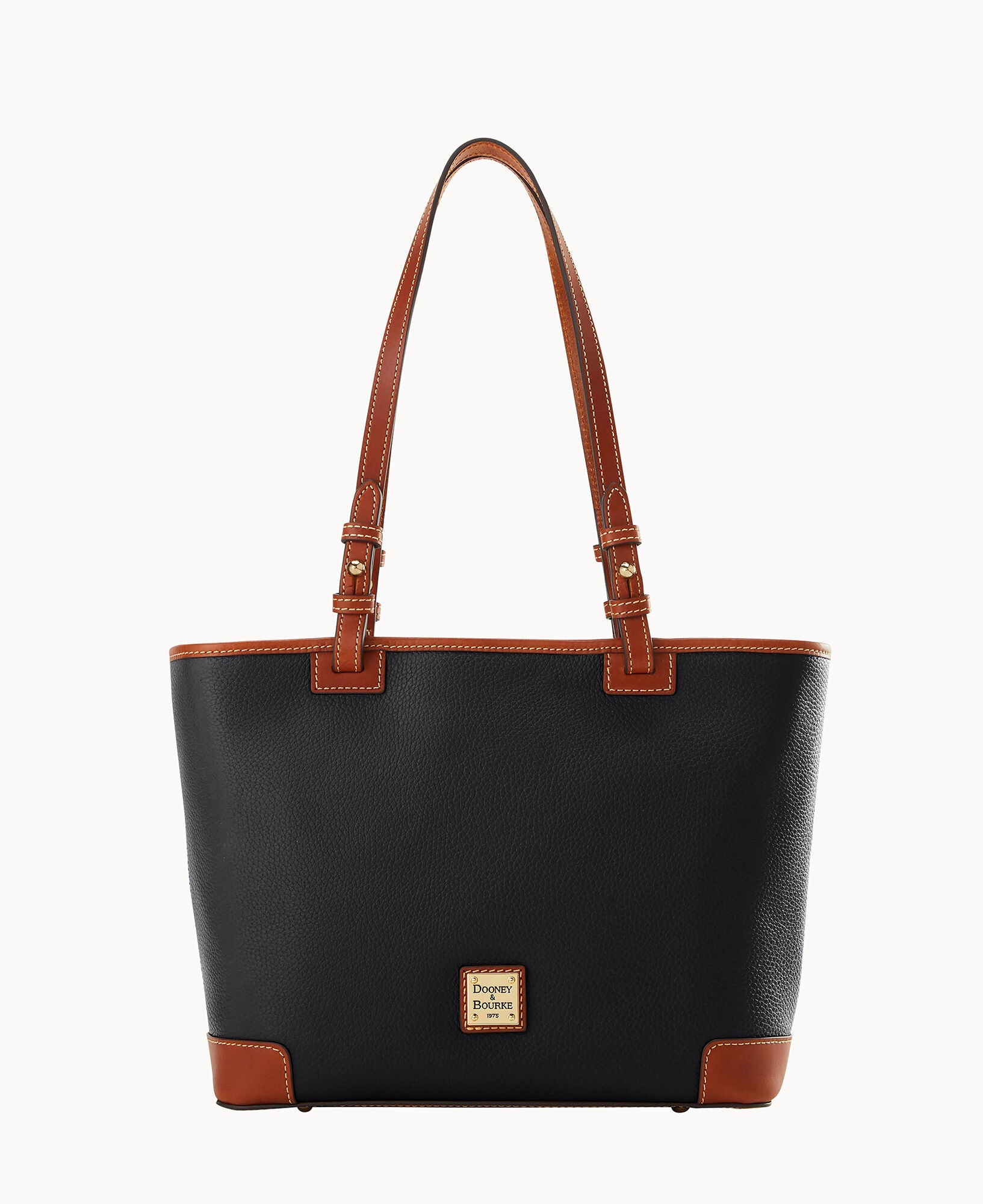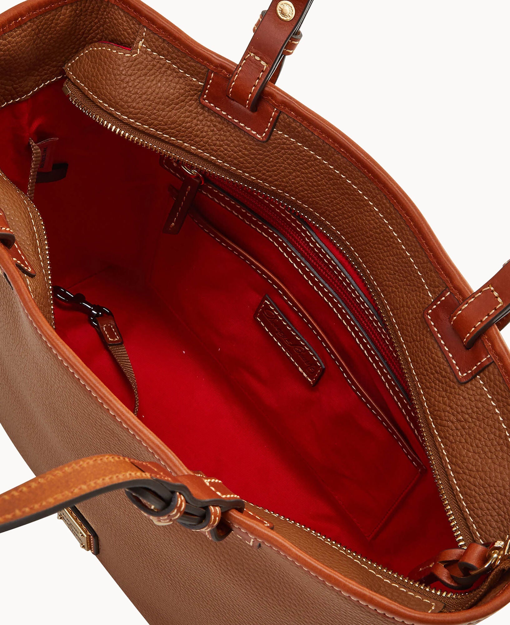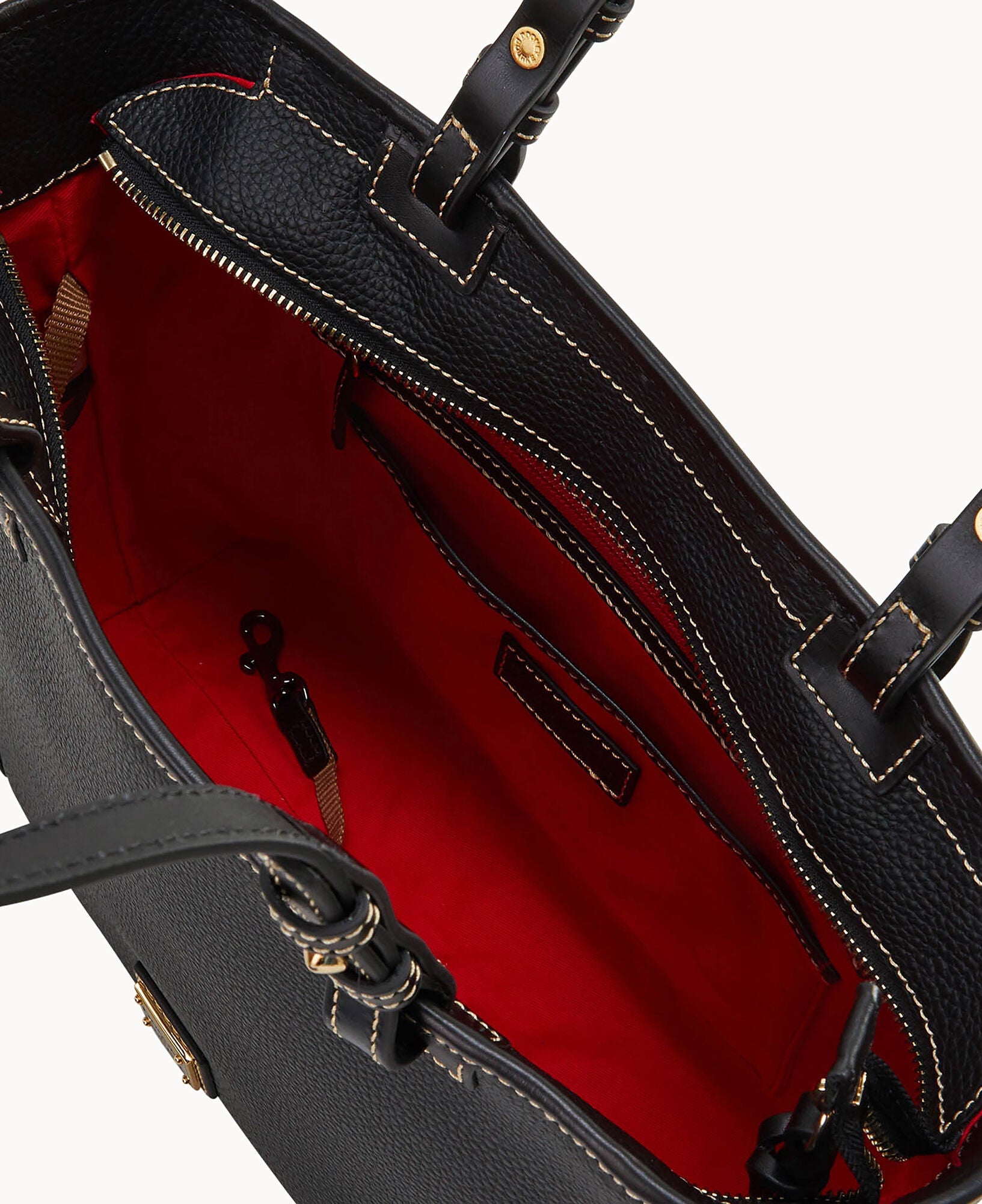 Two inside pockets. One inside zip pocket. Handle drop length 9". Inside key hook. Feet. Zipper closure.