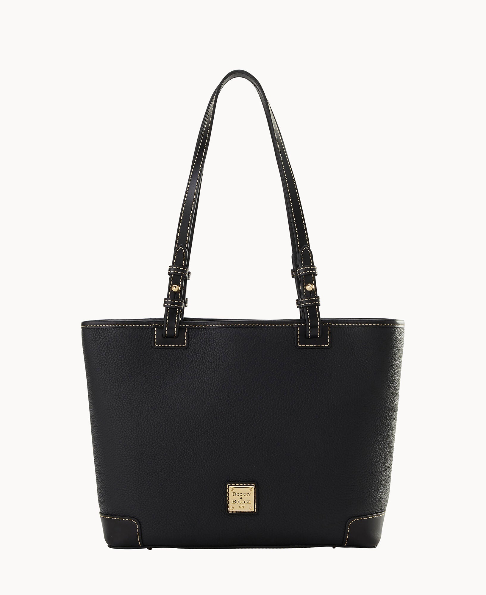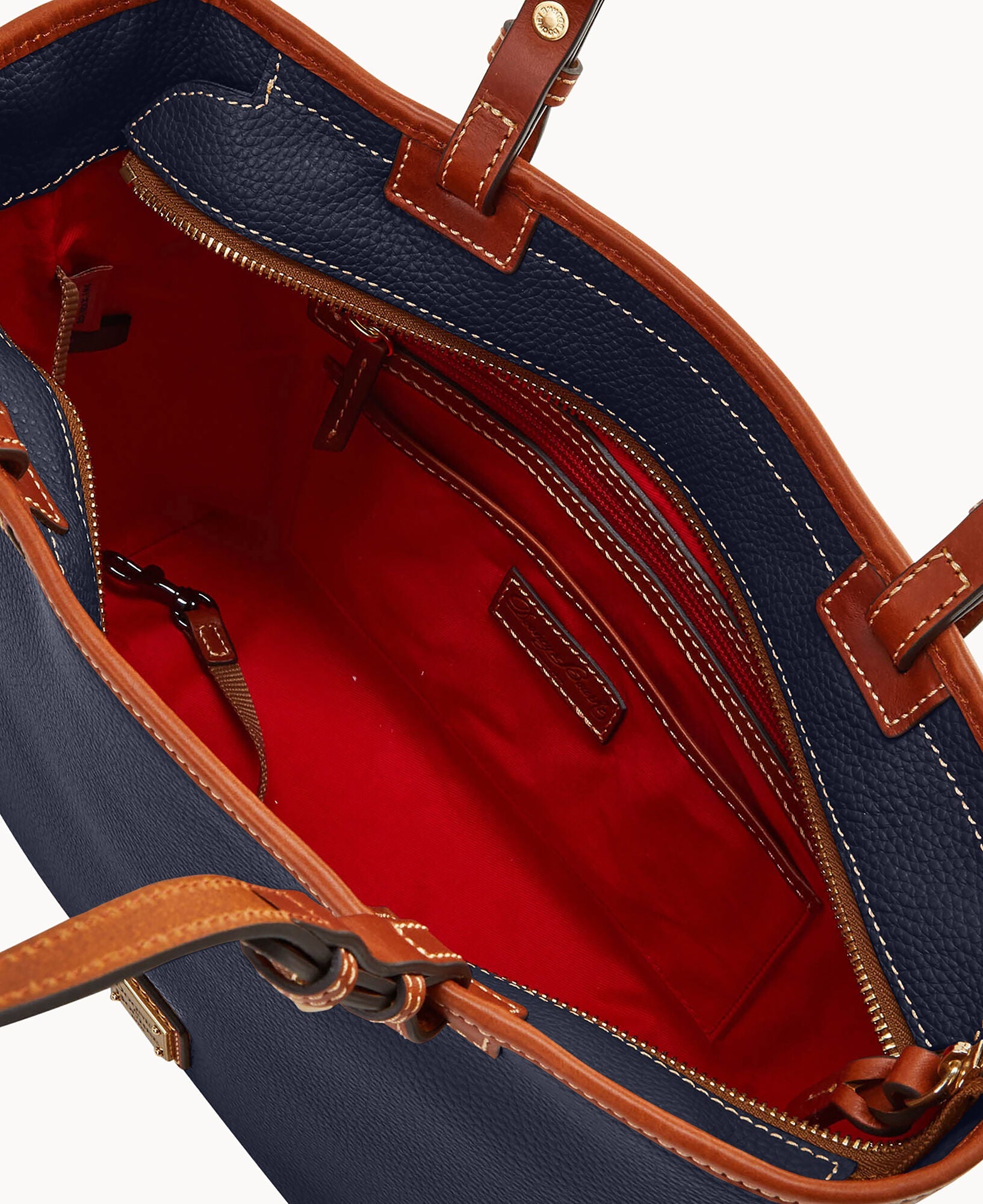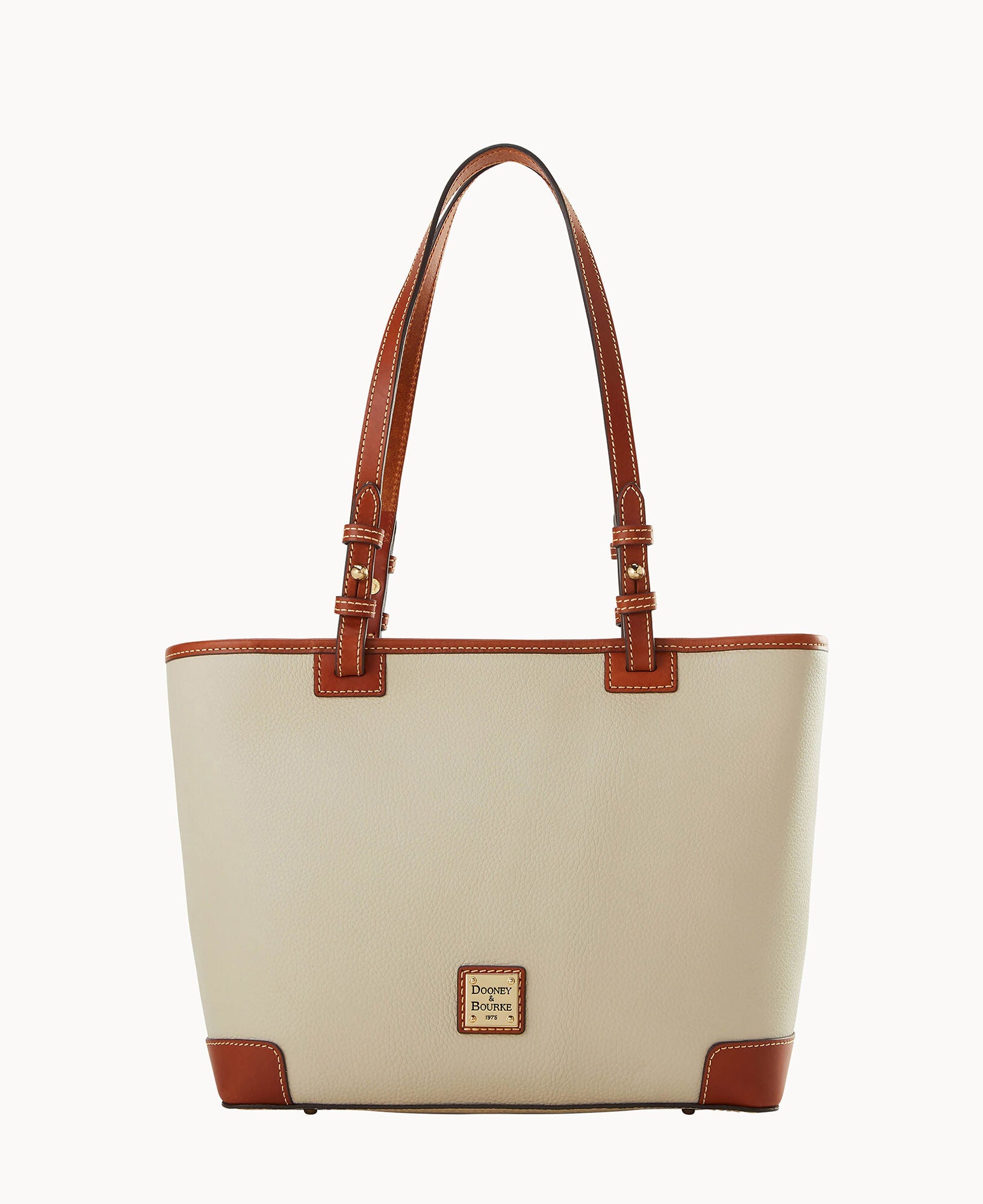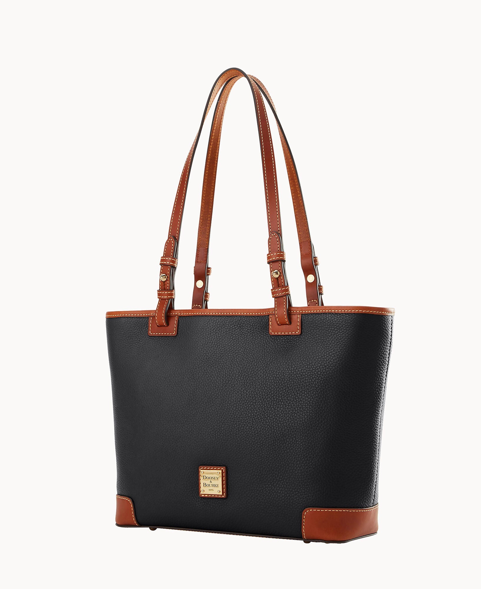 Two inside pockets. One inside zip pocket. Handle drop length 9". Inside key hook. Feet. Zipper closure.