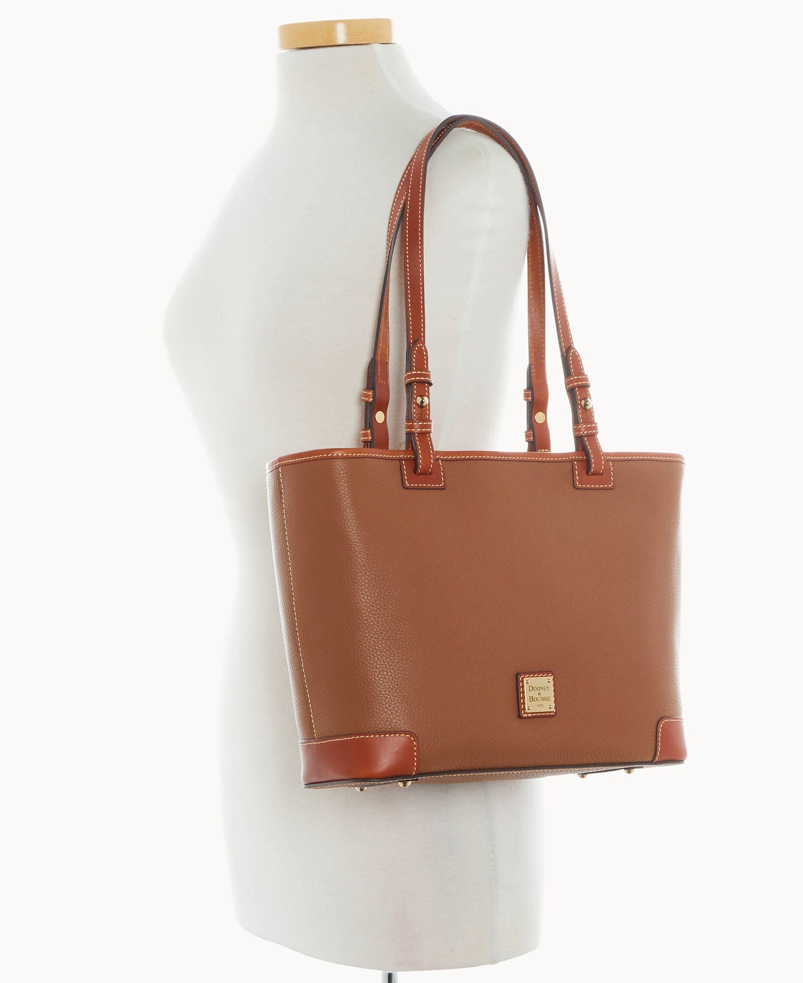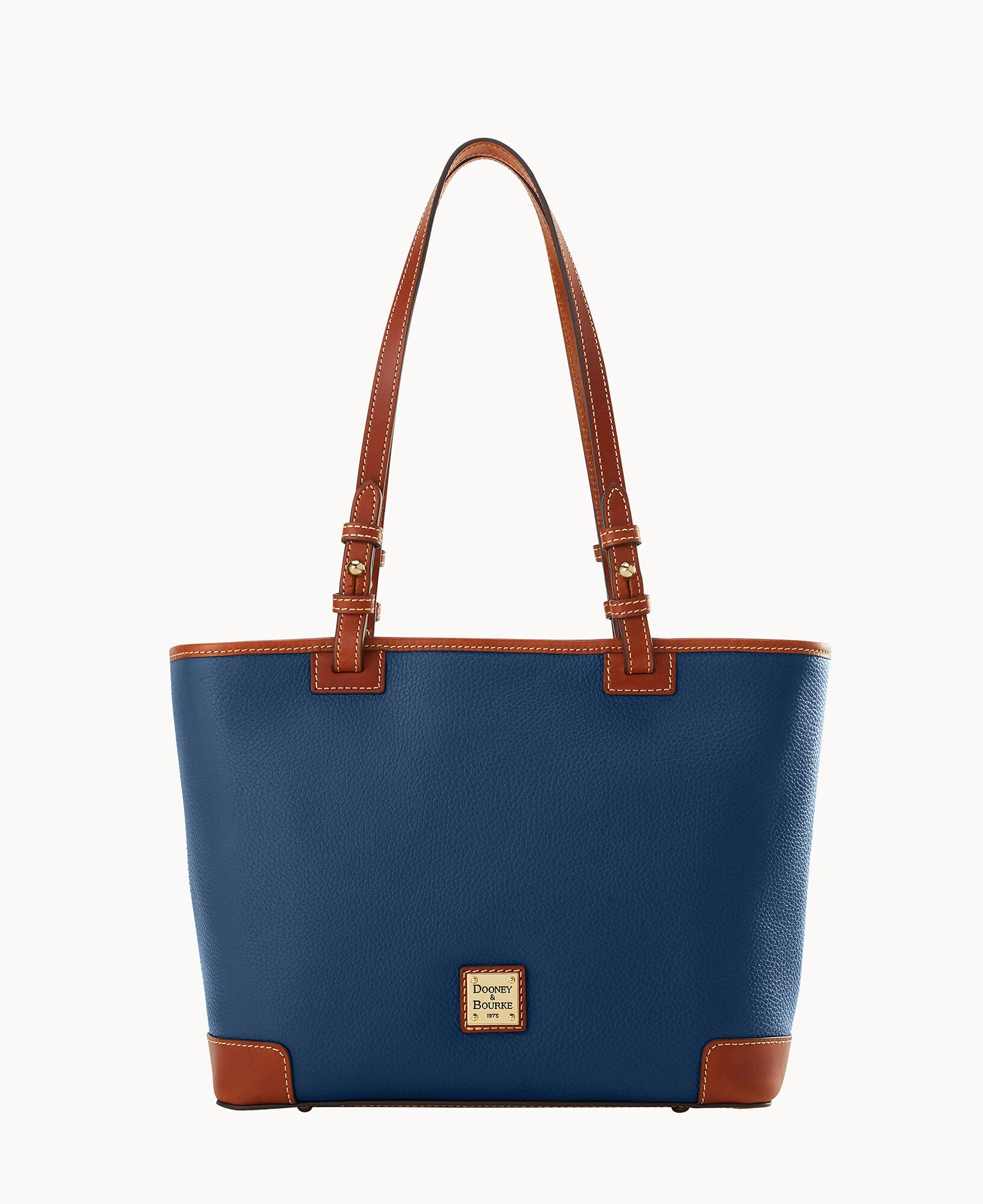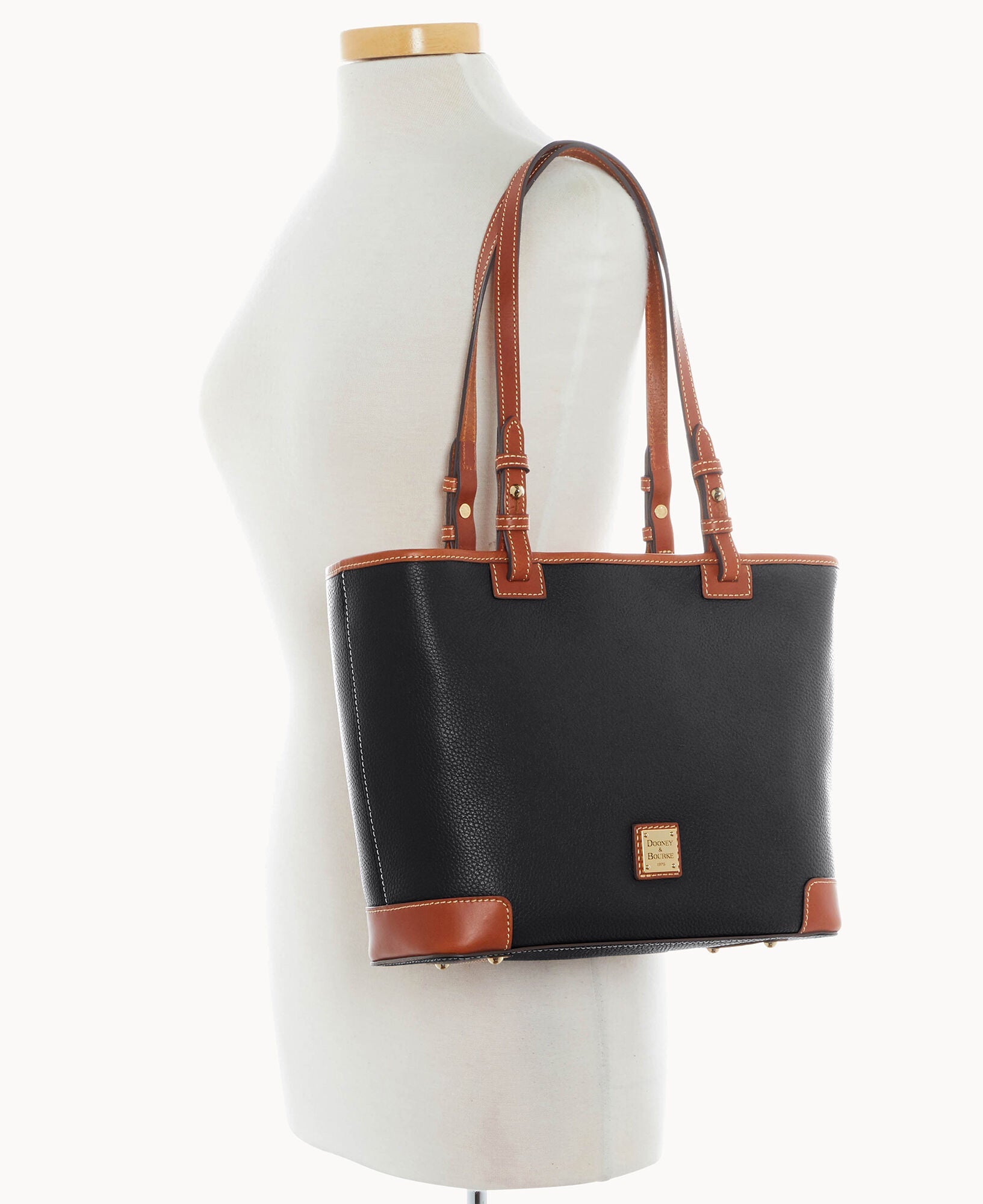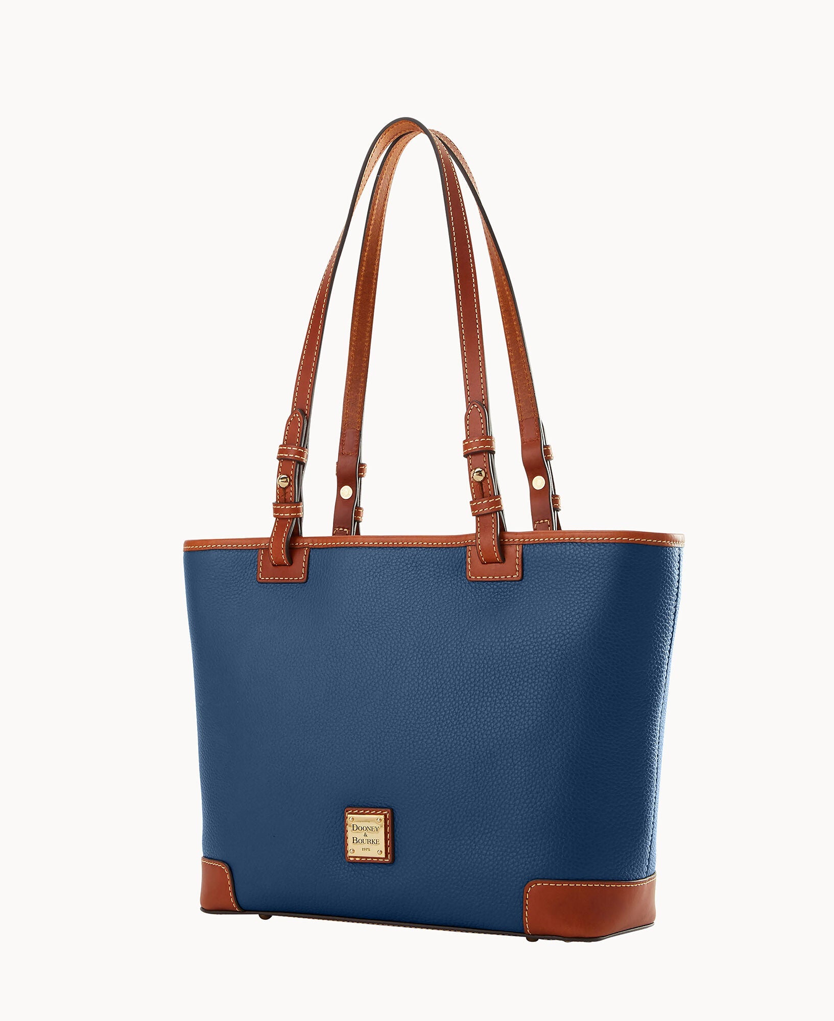 Two inside pockets. One inside zip pocket. Handle drop length 9". Inside key hook. Feet. Zipper closure.
