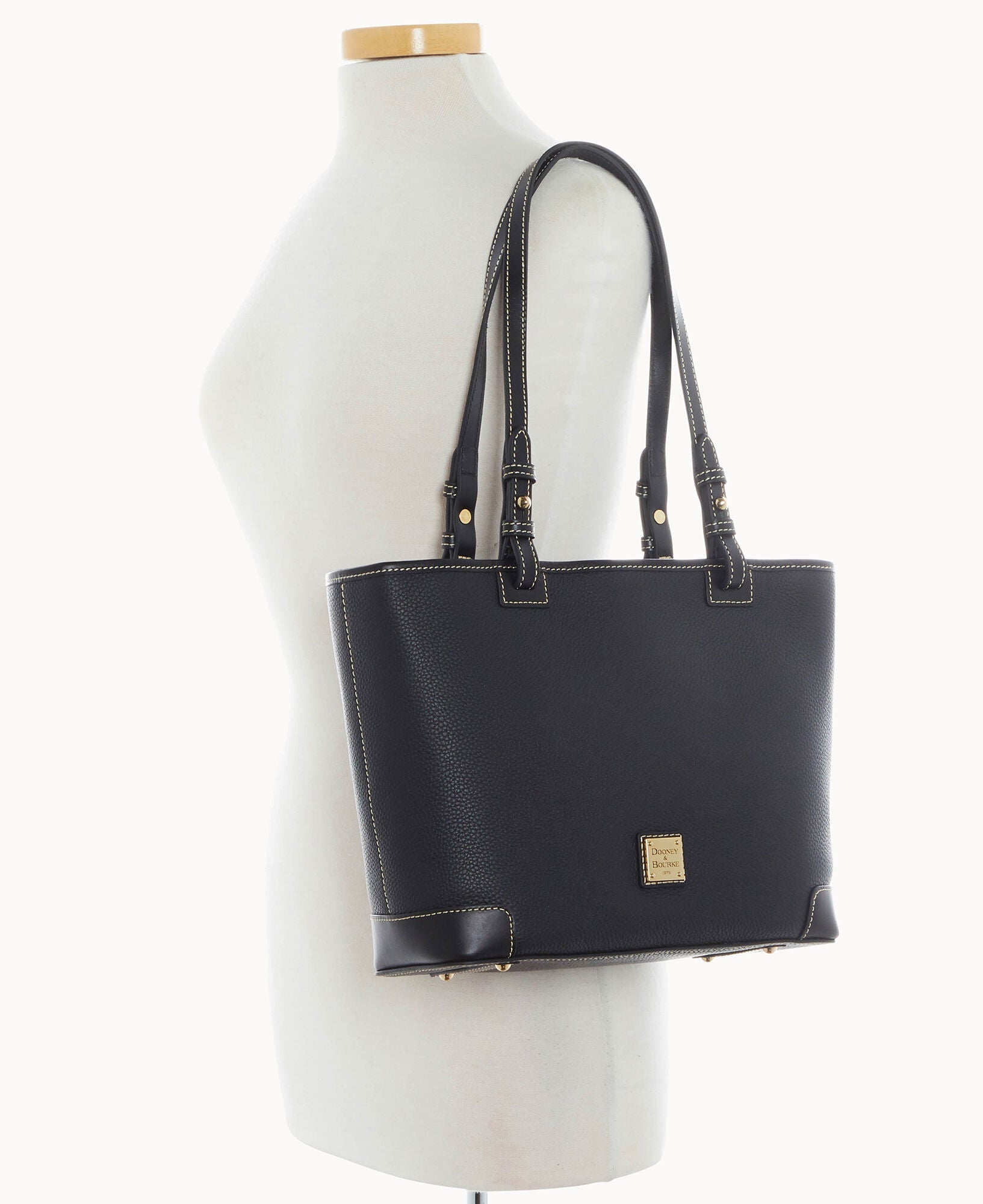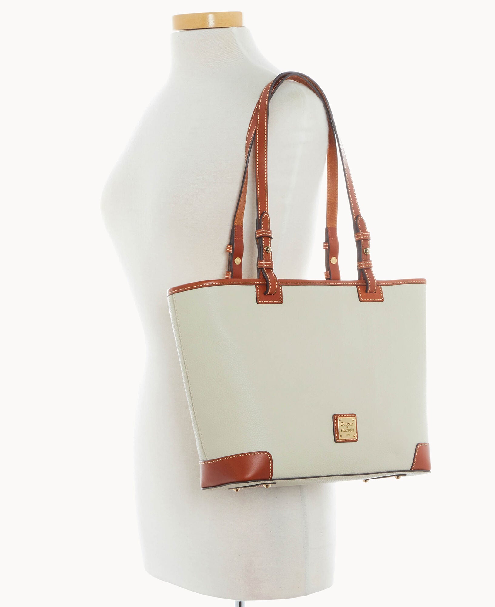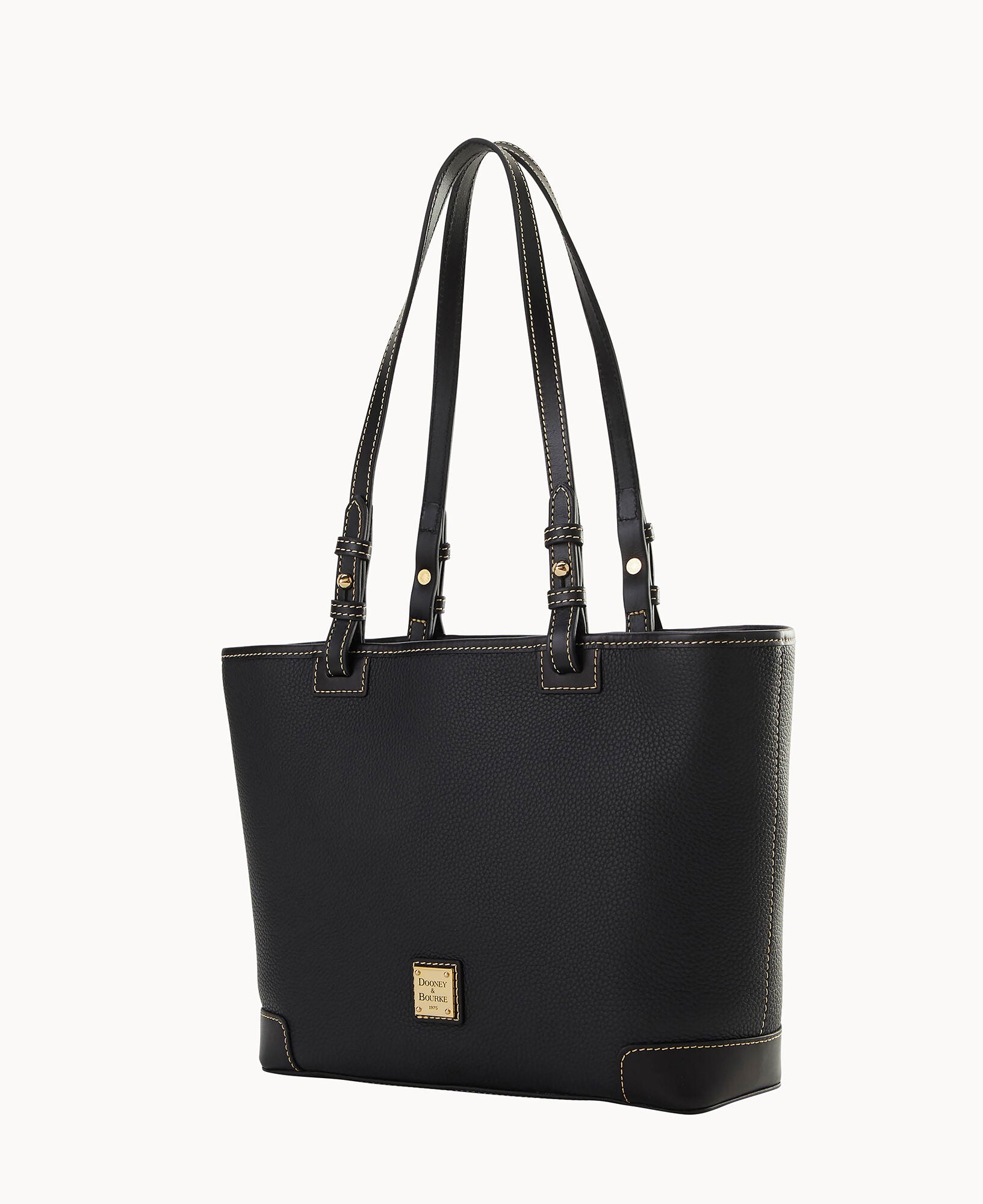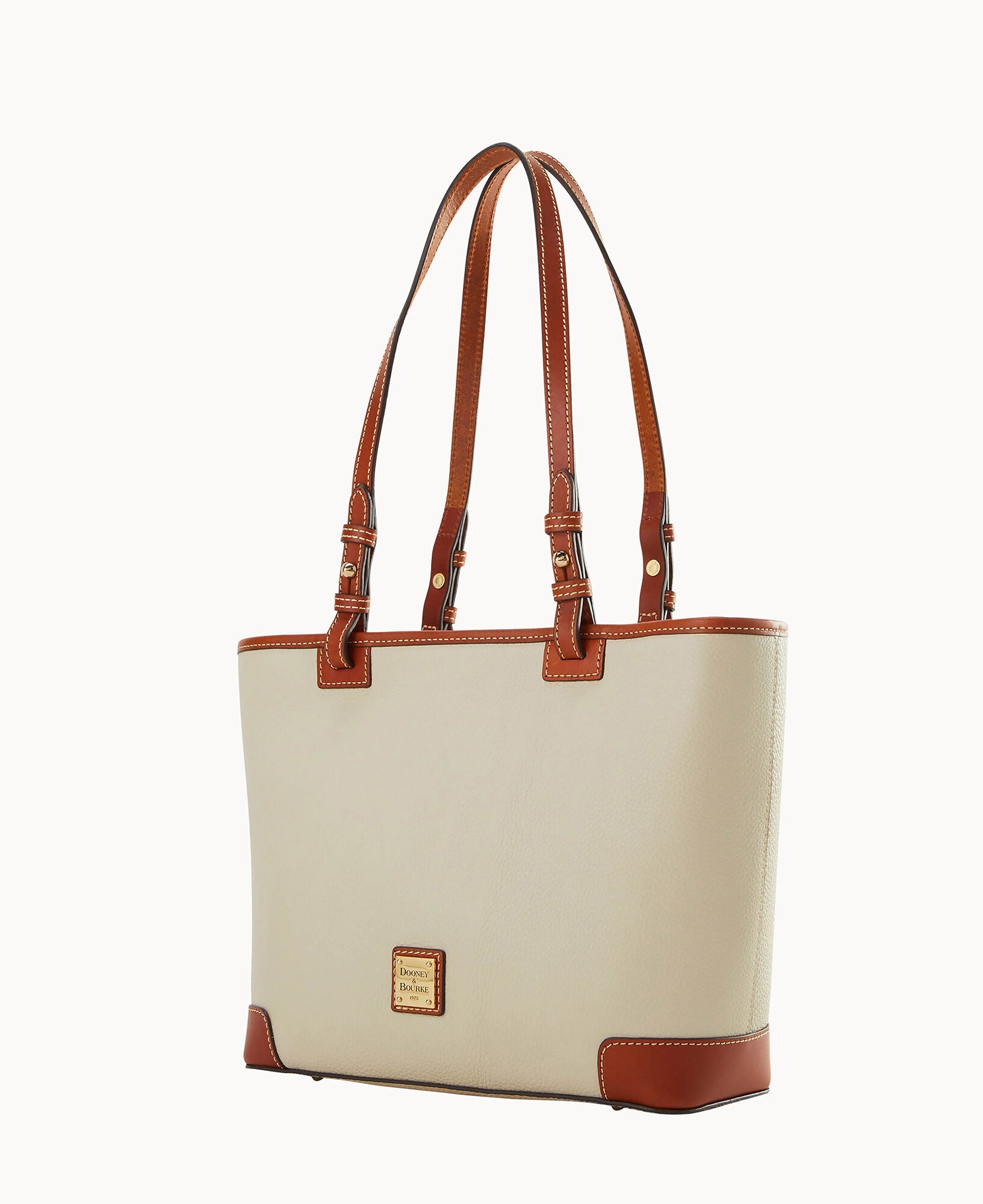 Two inside pockets. One inside zip pocket. Handle drop length 9". Inside key hook. Feet. Zipper closure.