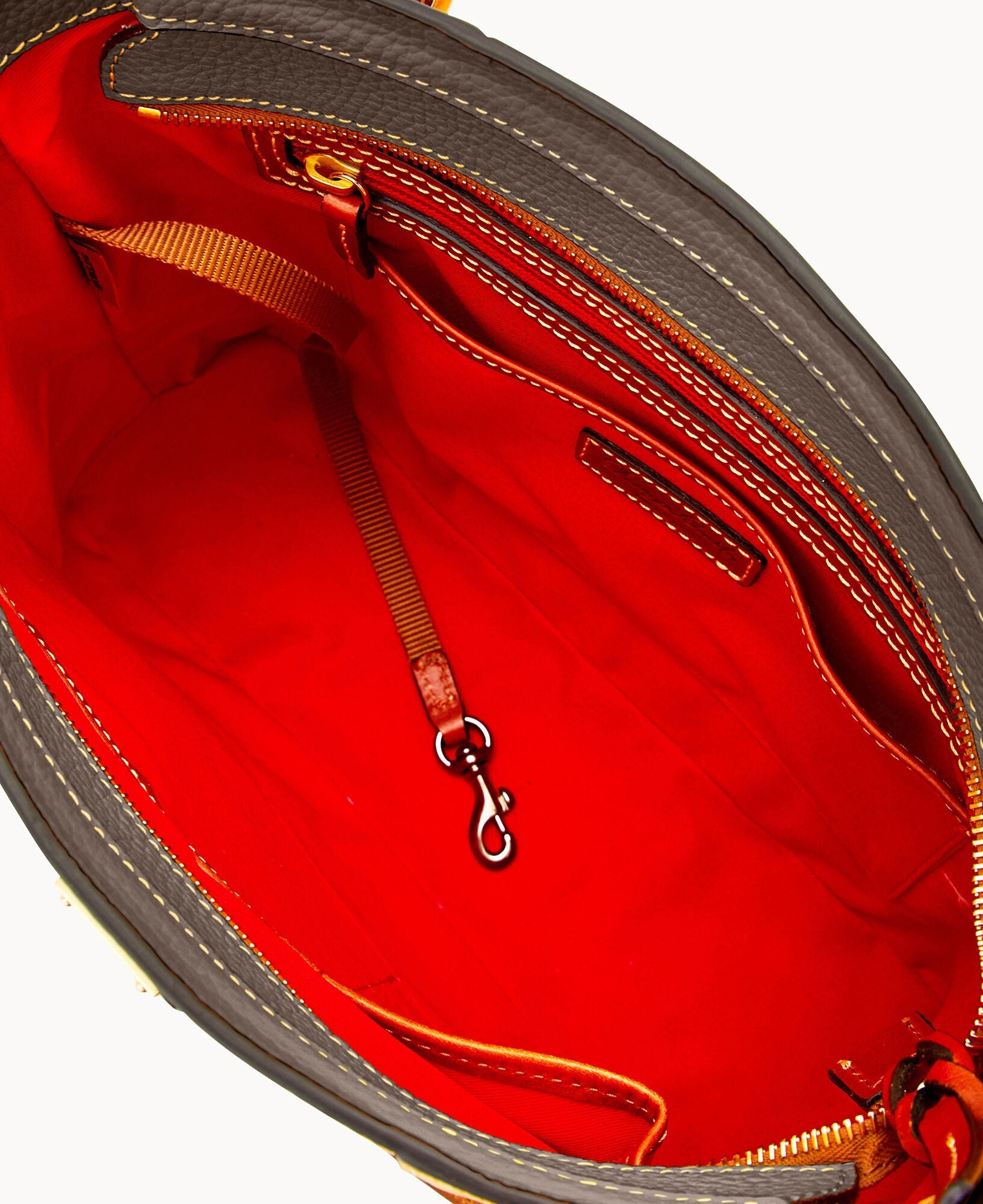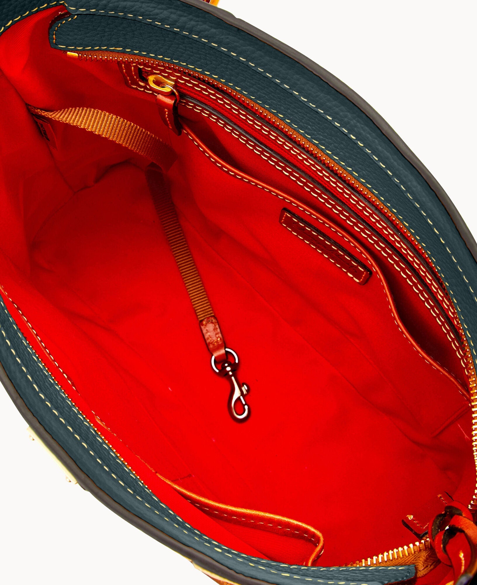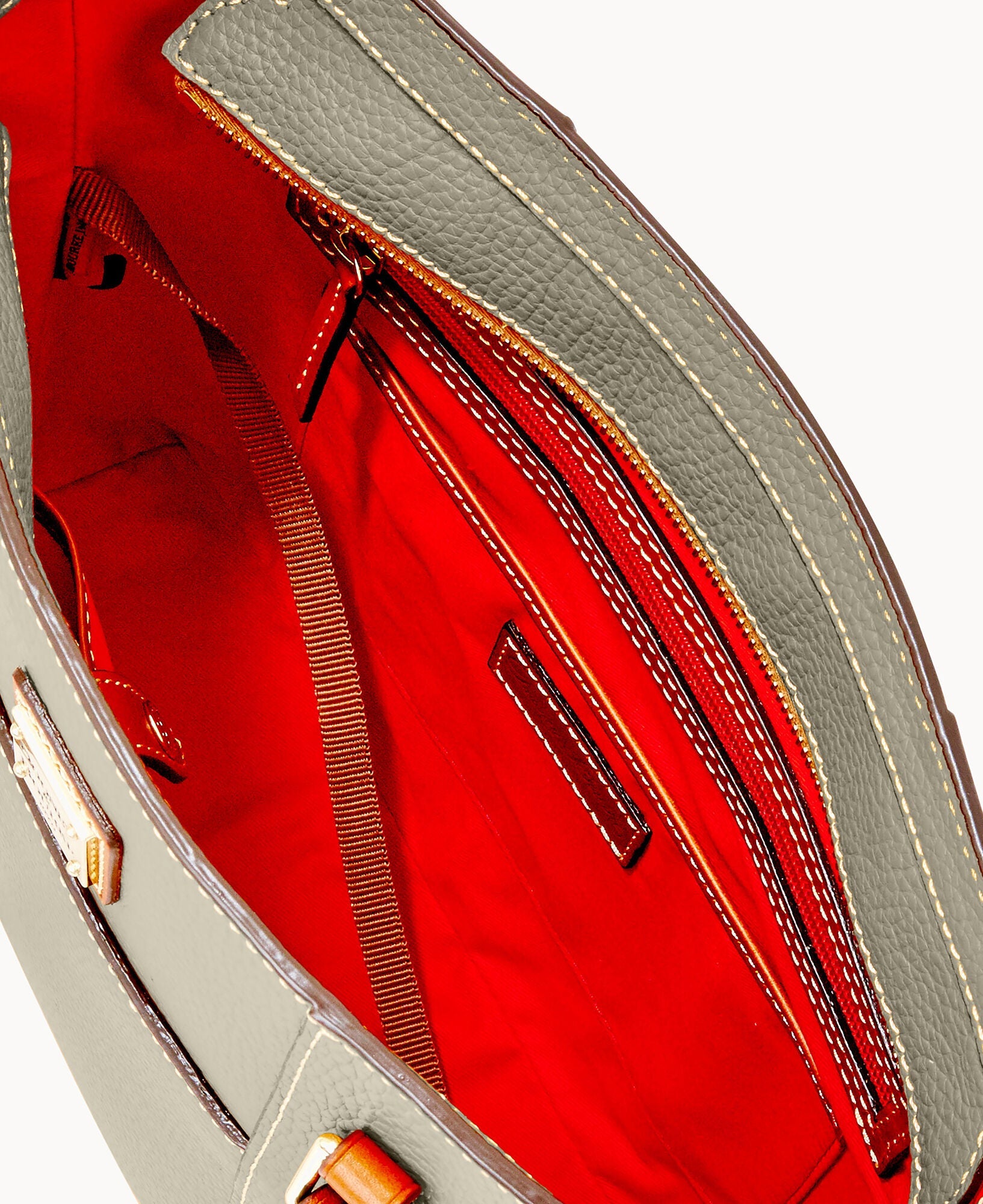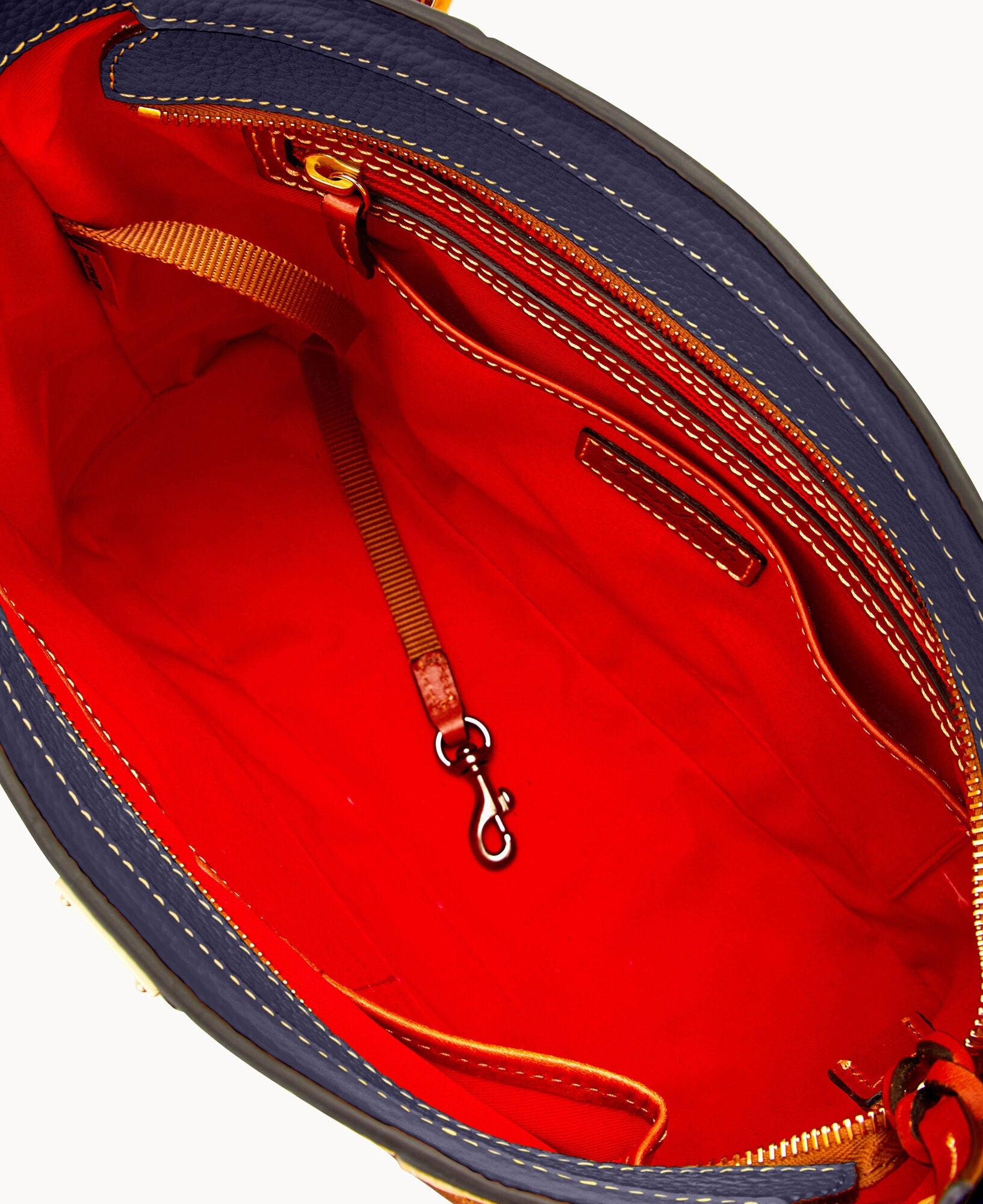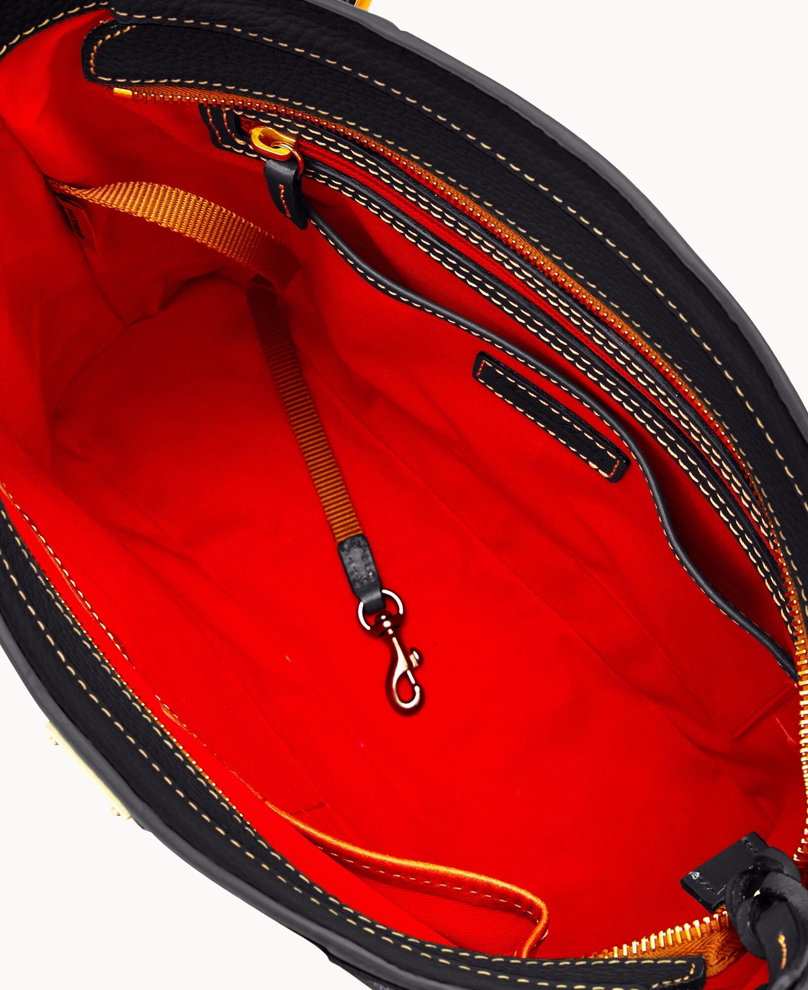 Front and back pockets. One inside zip pocket. Two inside pockets. Cell phone pocket. Inside key hook. Handle drop length 11.5". Strap drop length 11.5". Lined. Feet. Zipper closure.