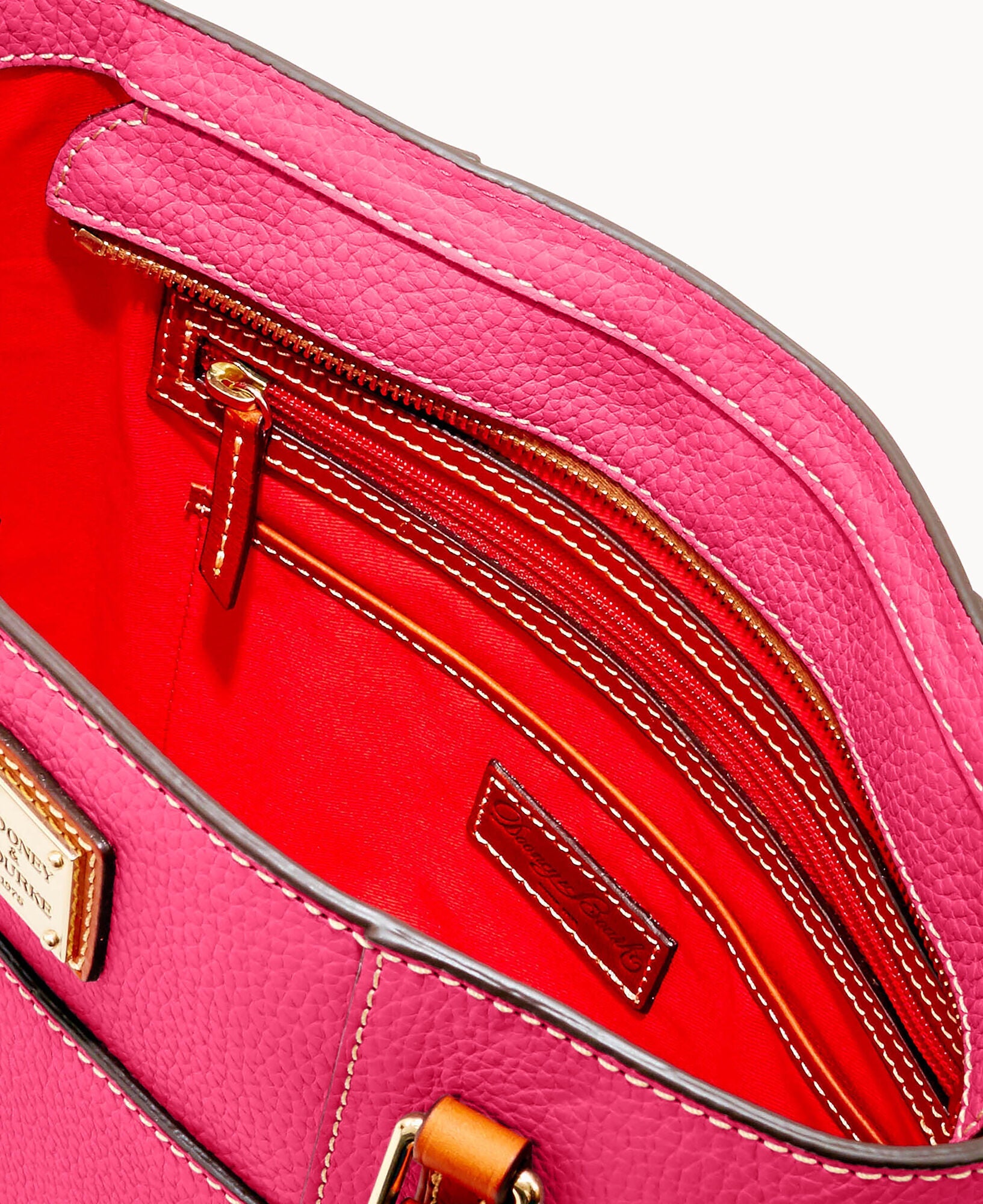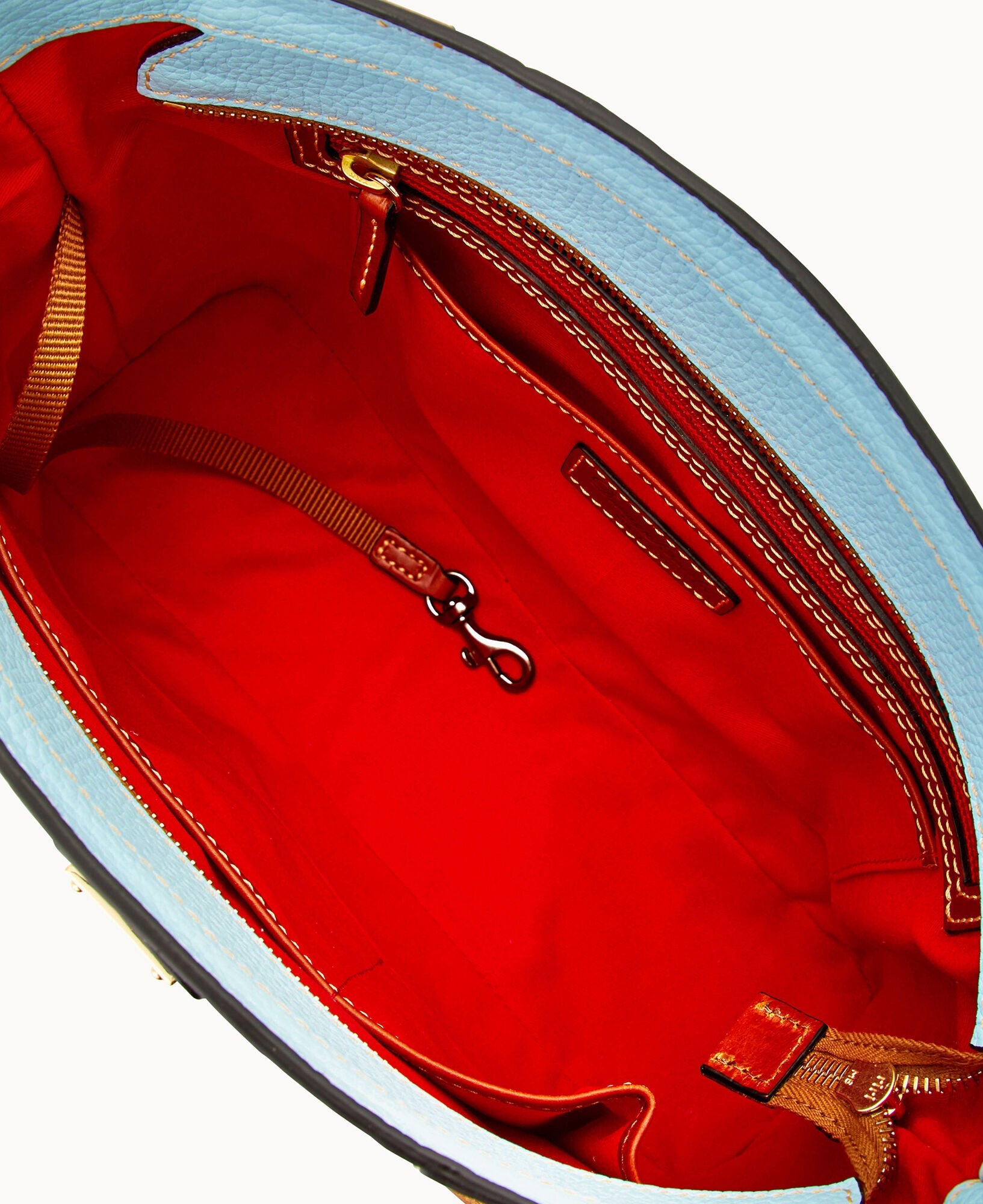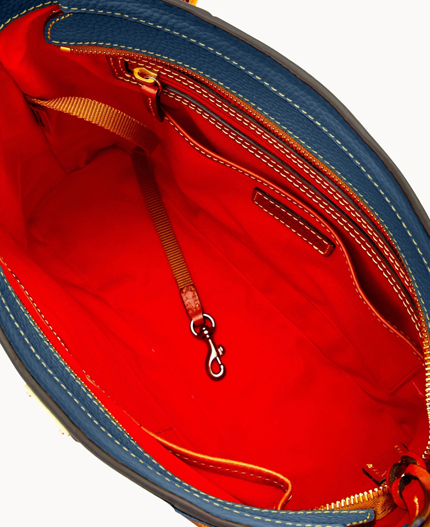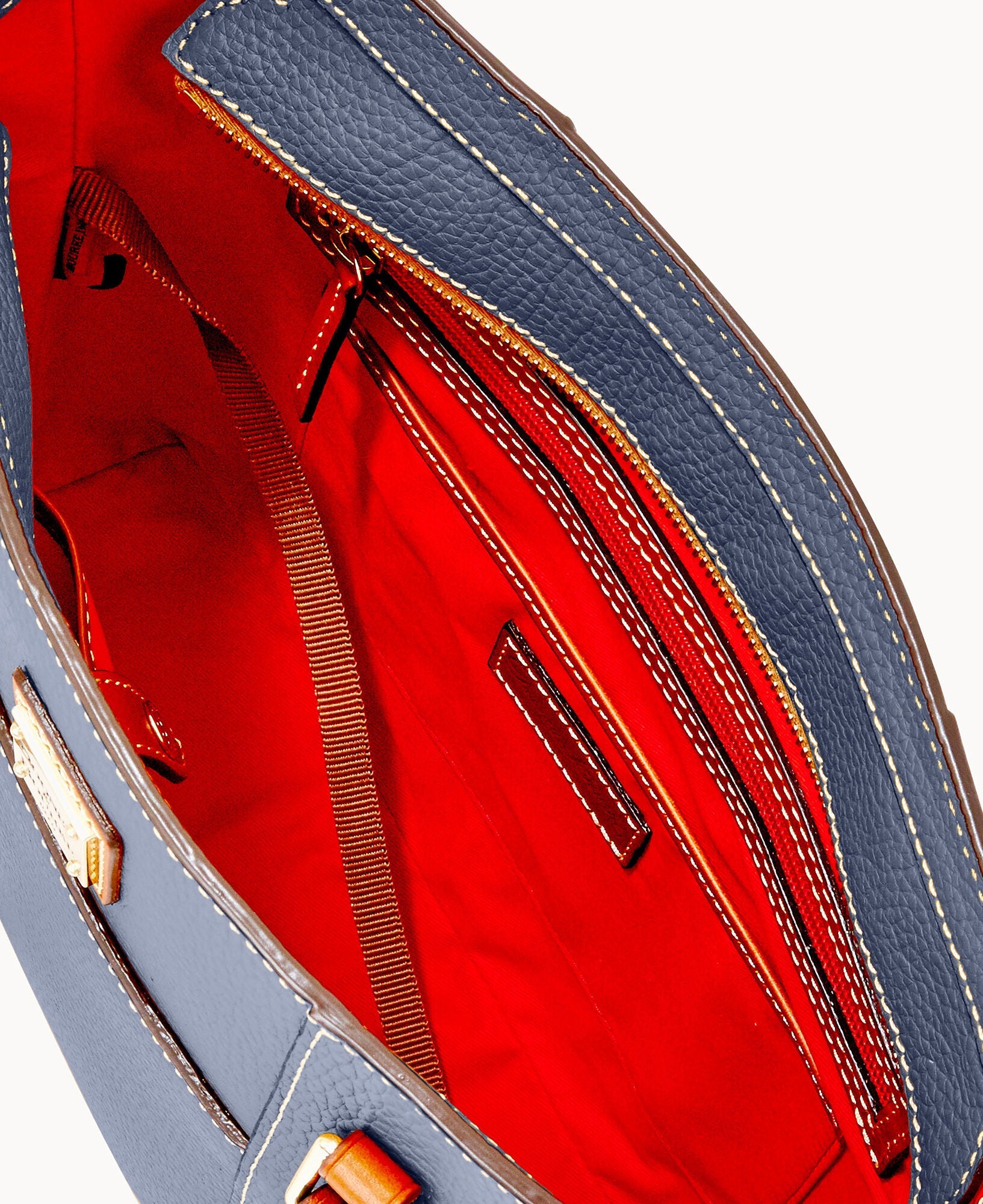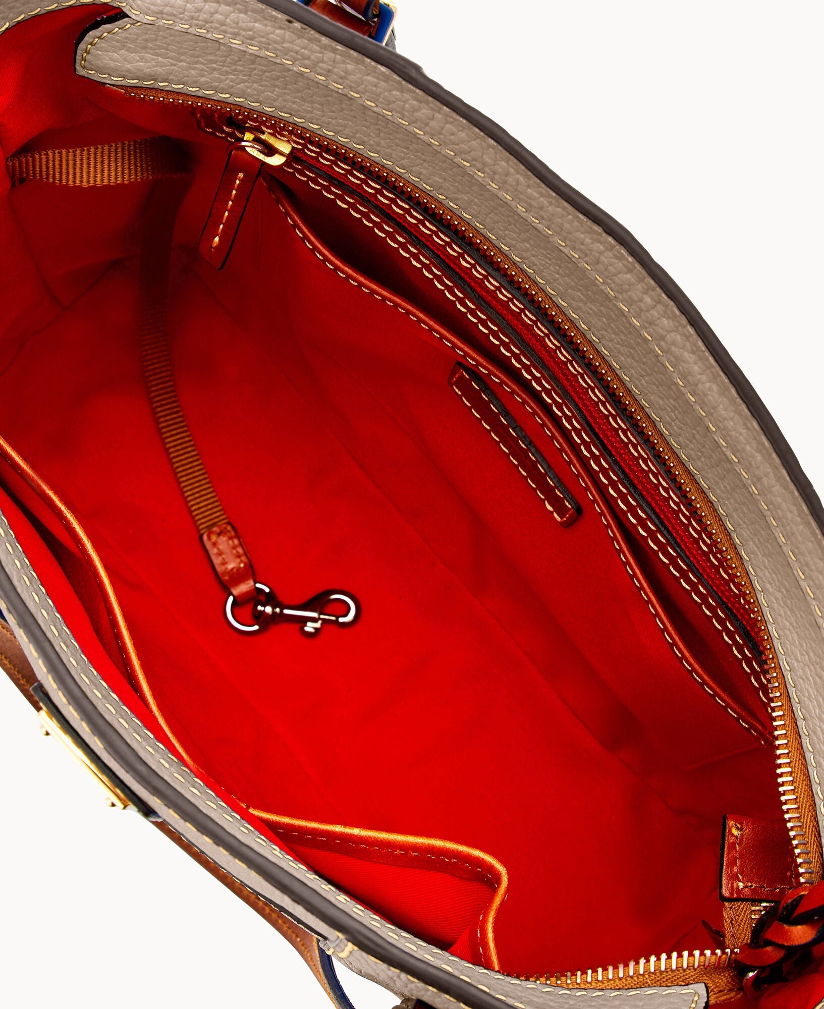 Front and back pockets. One inside zip pocket. Two inside pockets. Cell phone pocket. Inside key hook. Handle drop length 11.5". Strap drop length 11.5". Lined. Feet. Zipper closure.