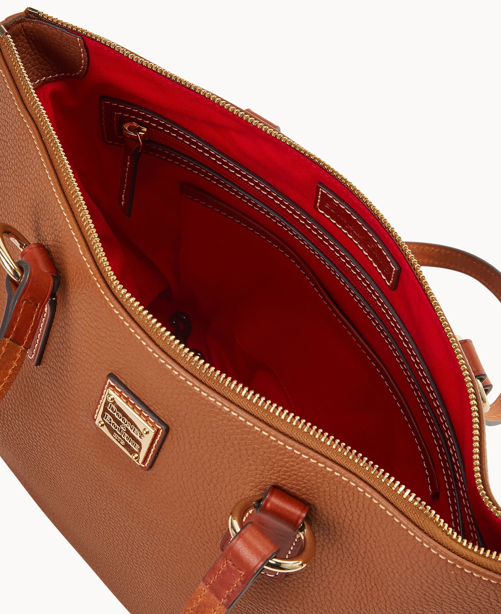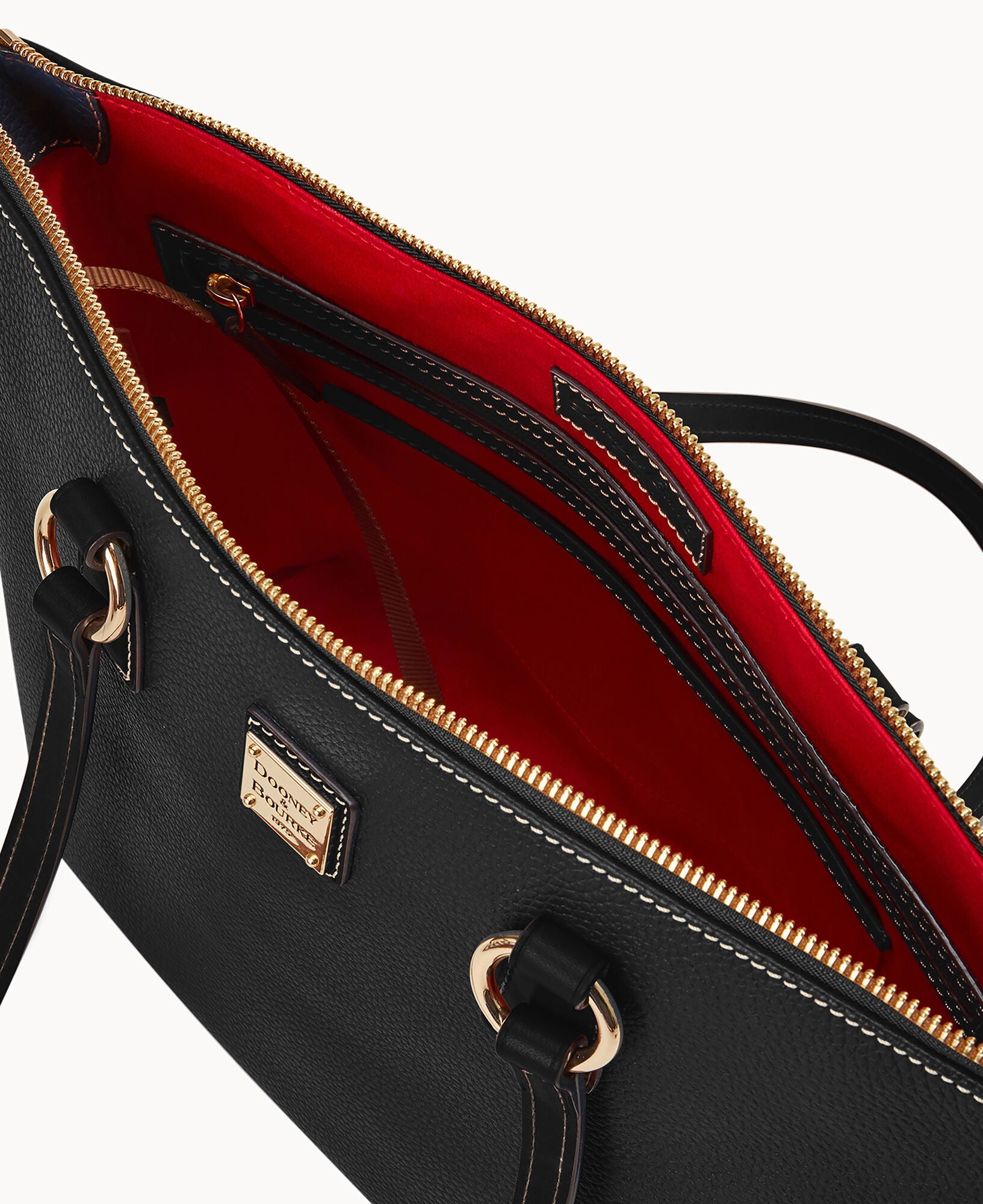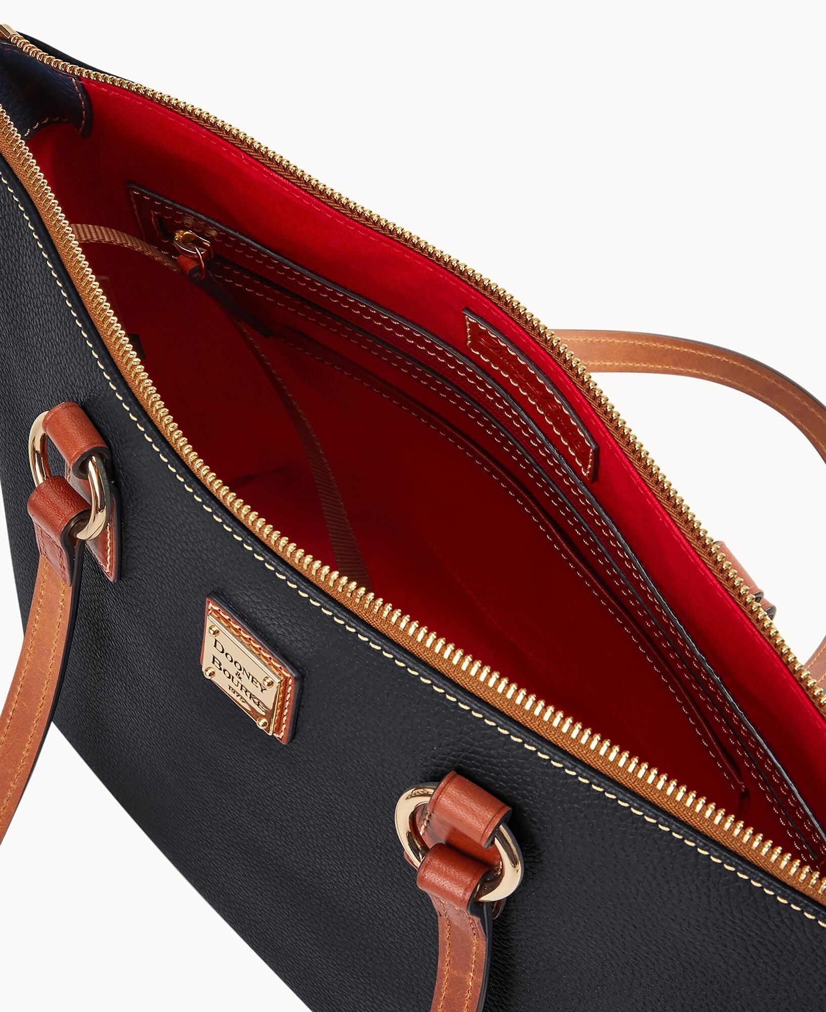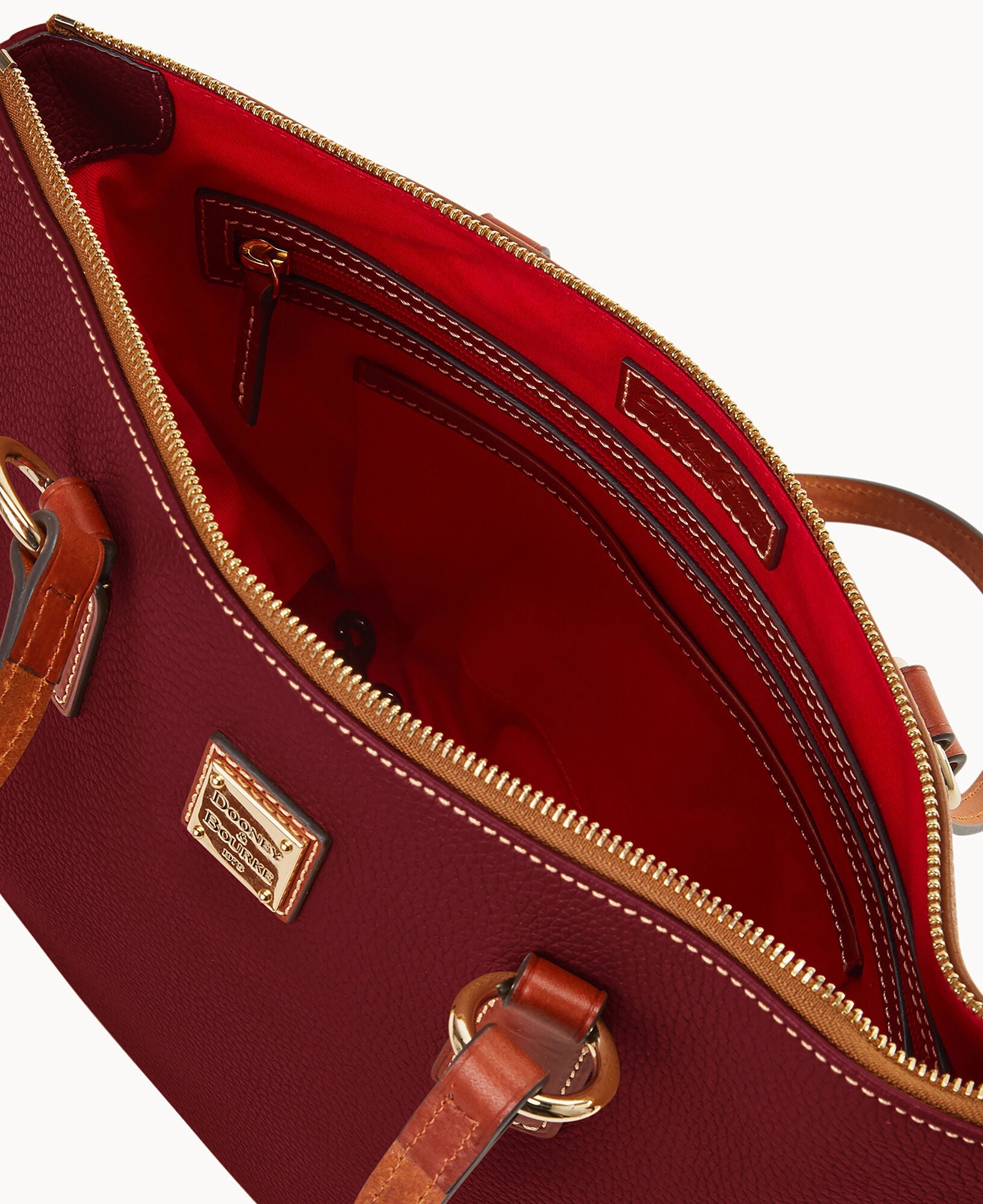 One inside zip pocket. Two inside pockets. Cell phone pocket. Inside key hook. Handle drop length 11". Lined. Feet. Zipper closure.