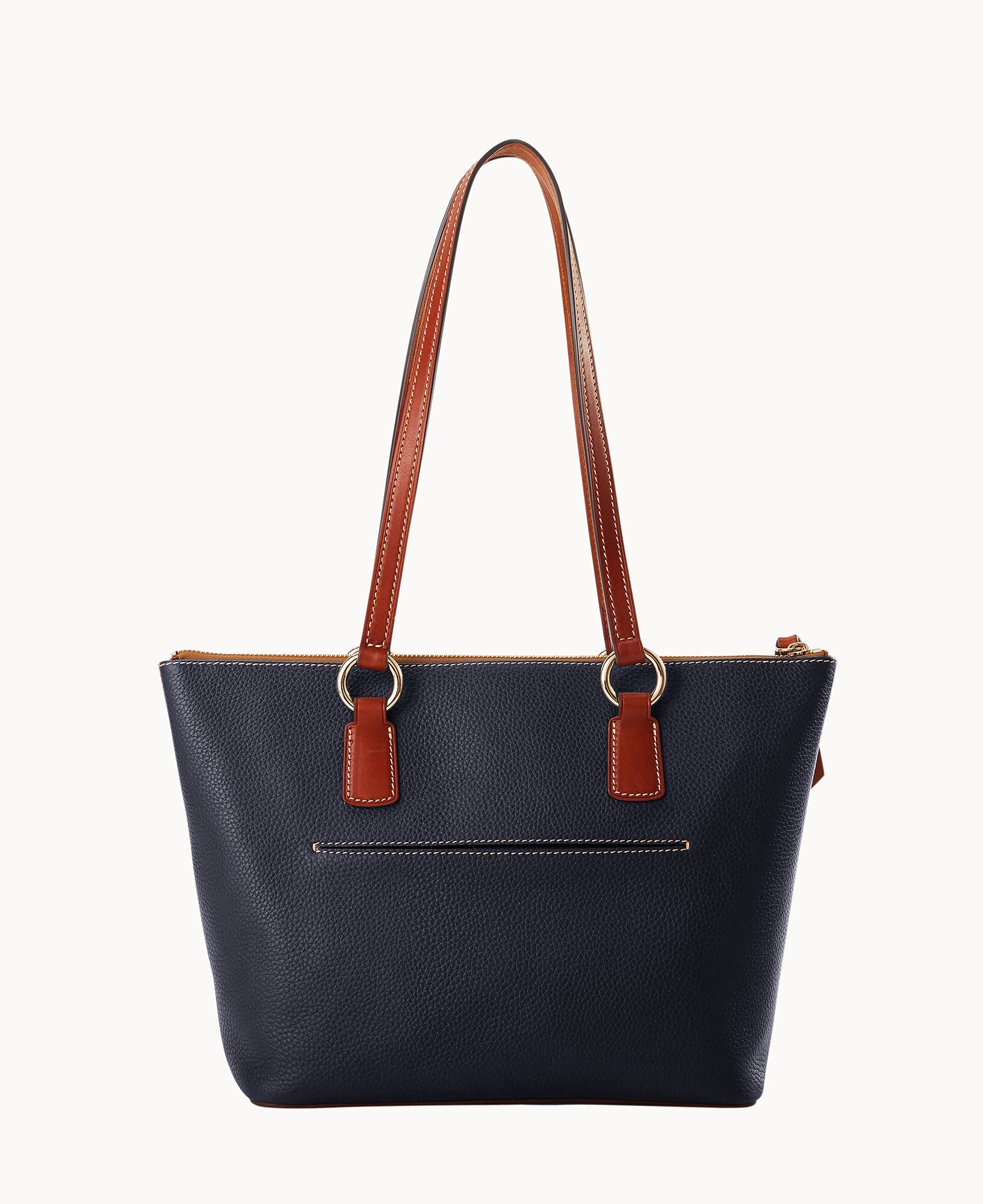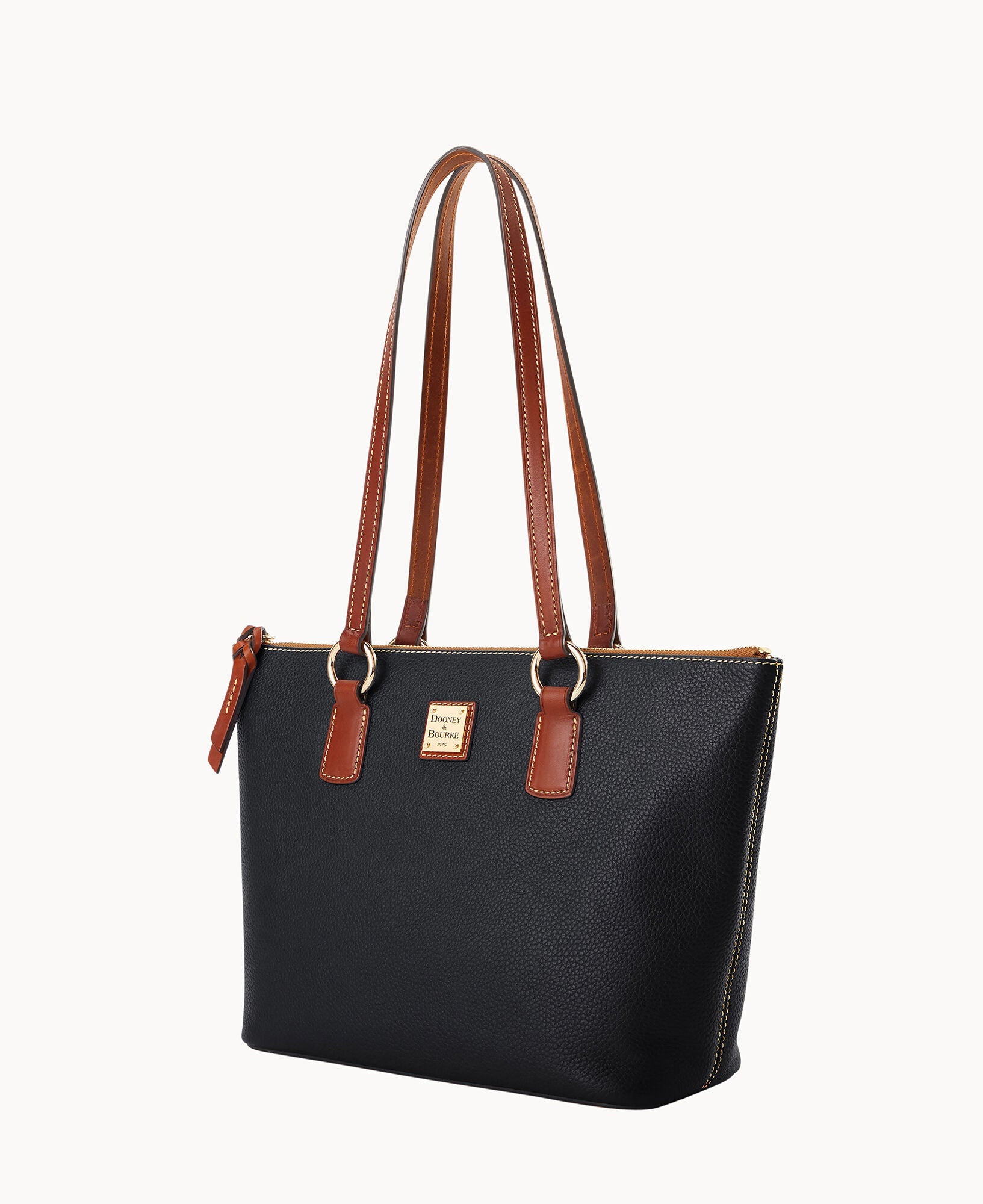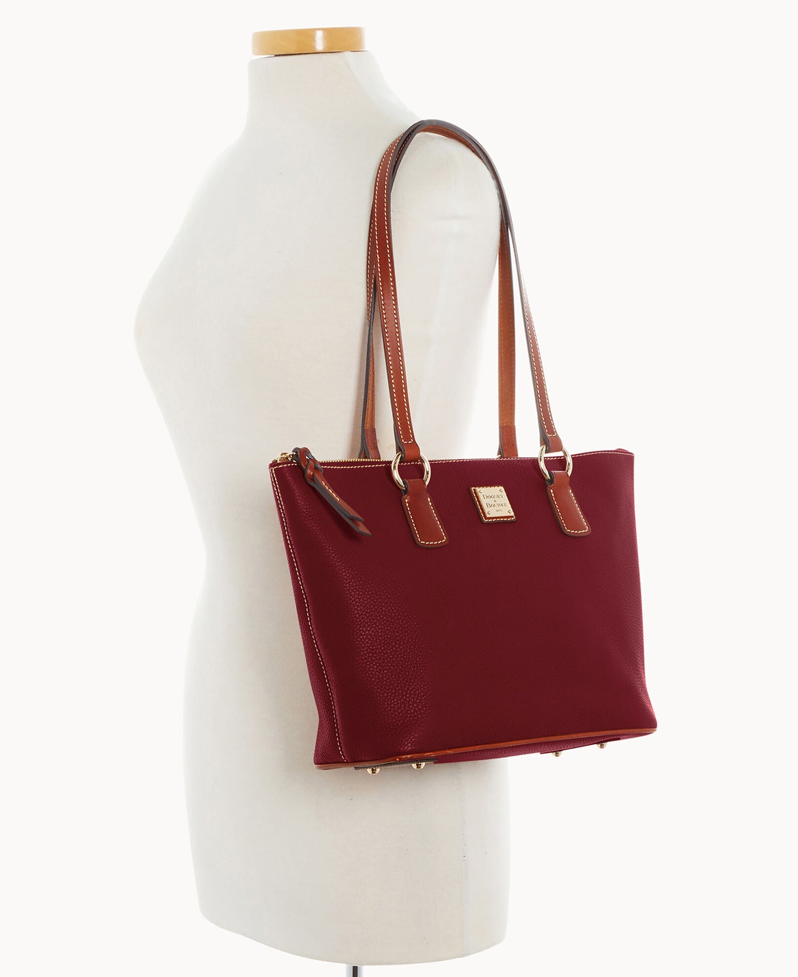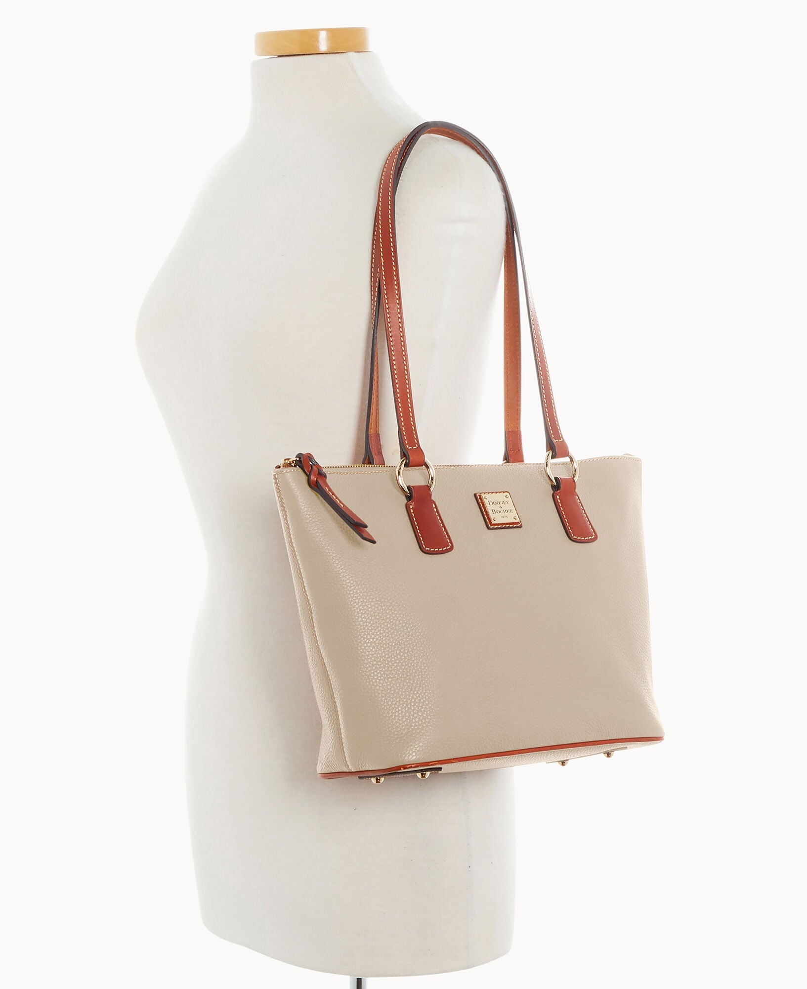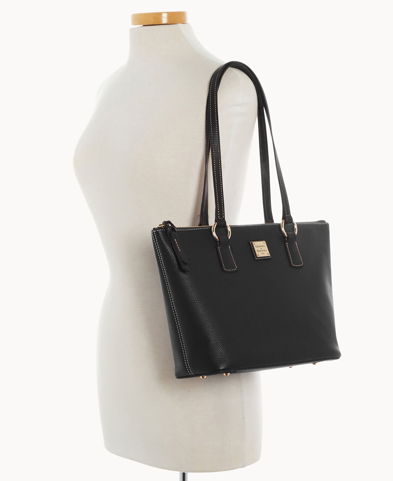 One inside zip pocket. Two inside pockets. Cell phone pocket. Inside key hook. Handle drop length 11". Lined. Feet. Zipper closure.