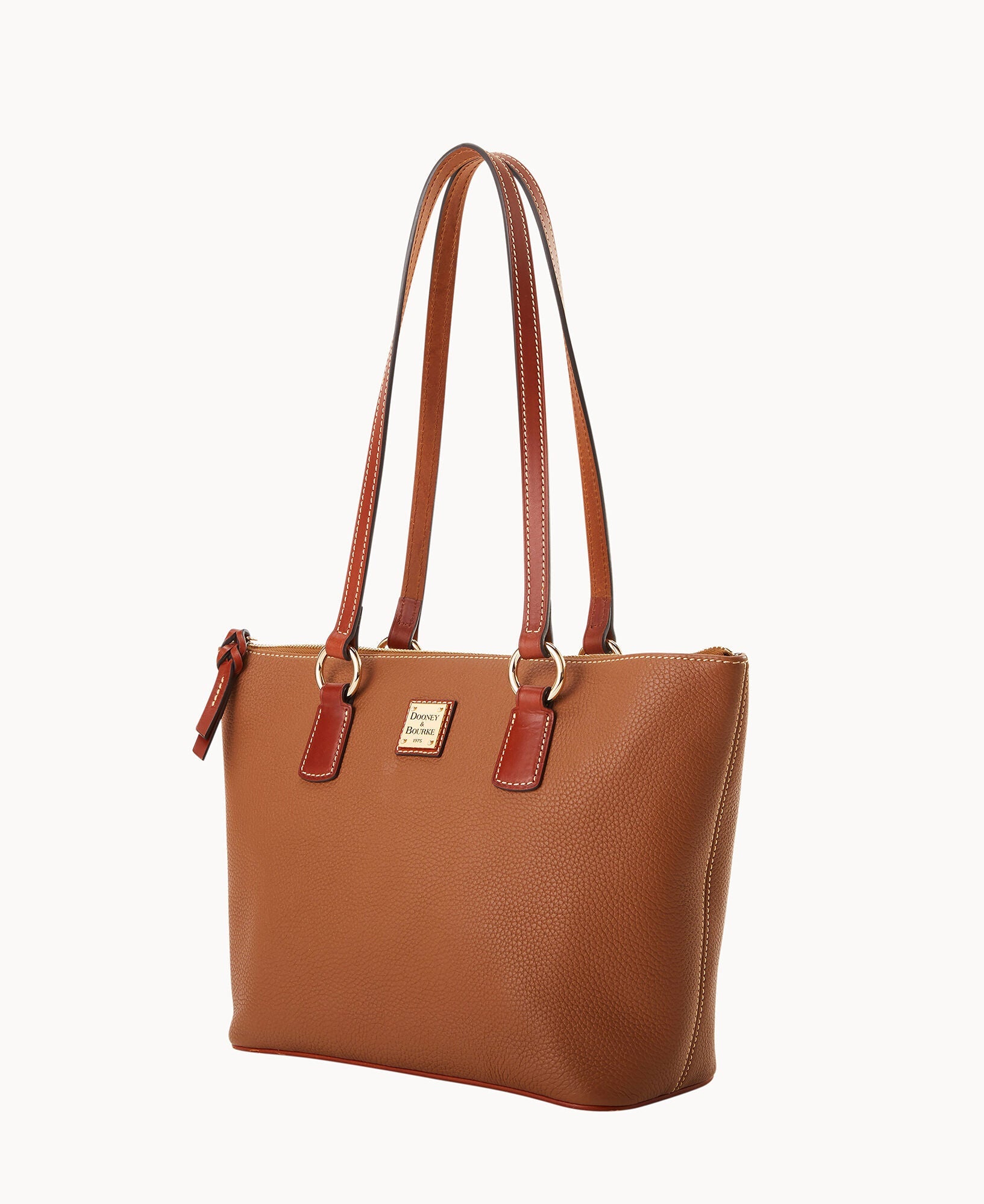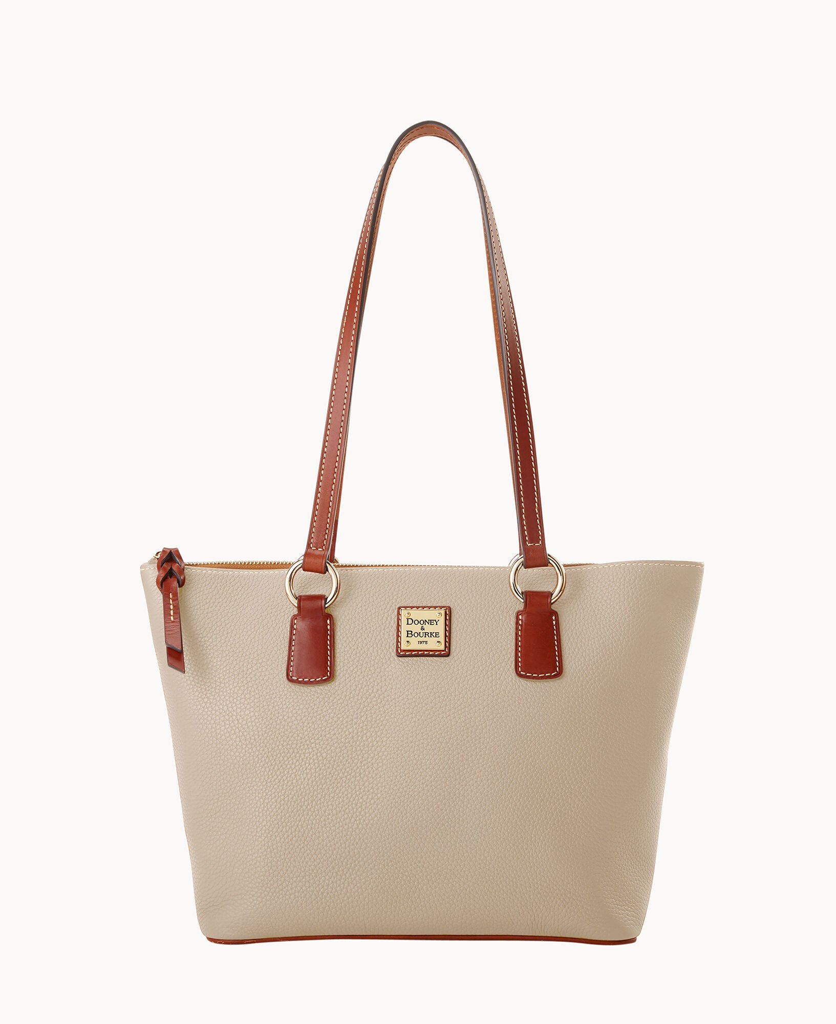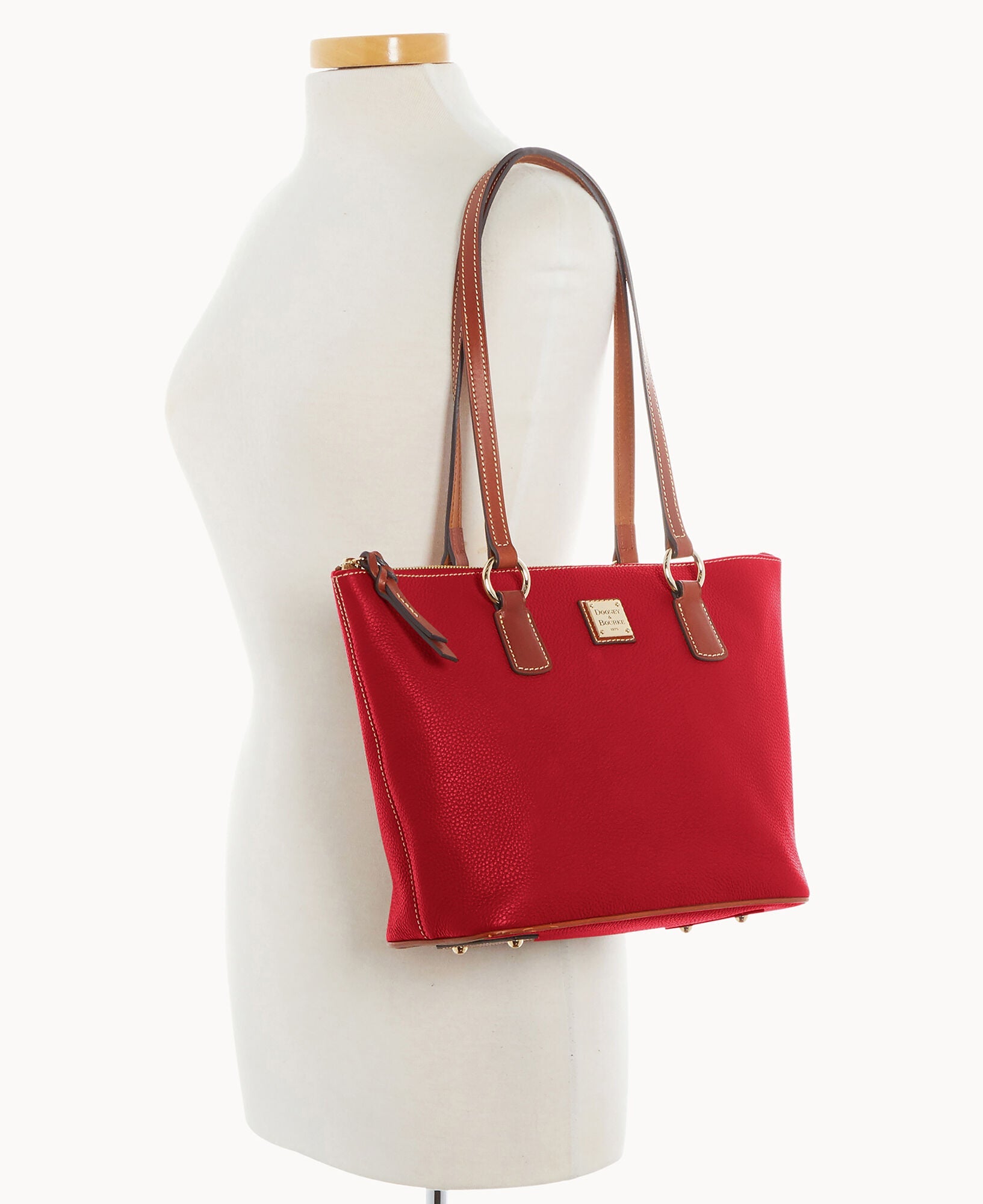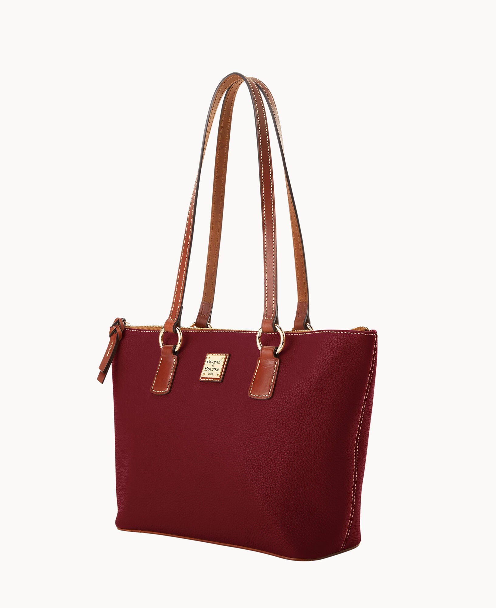 One inside zip pocket. Two inside pockets. Cell phone pocket. Inside key hook. Handle drop length 11". Lined. Feet. Zipper closure.