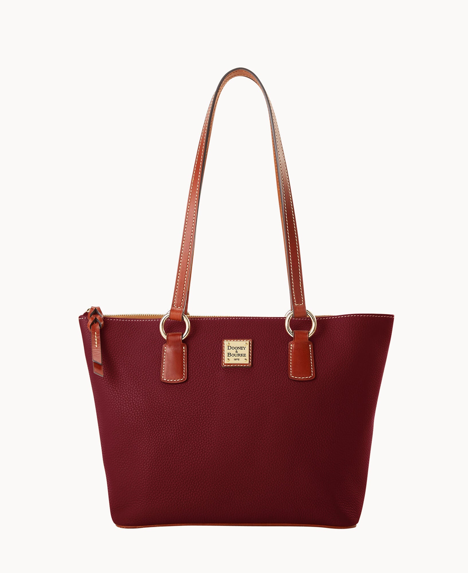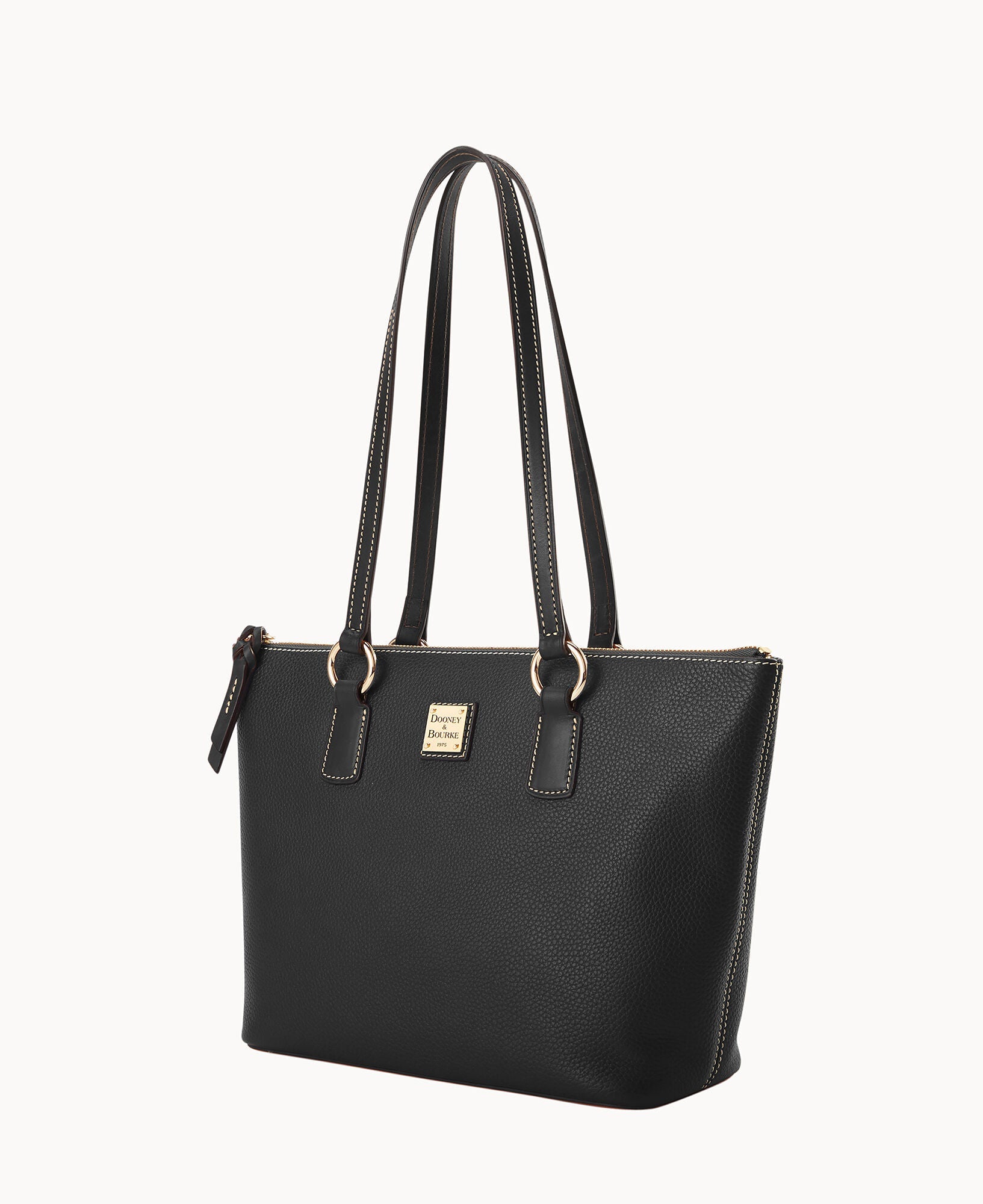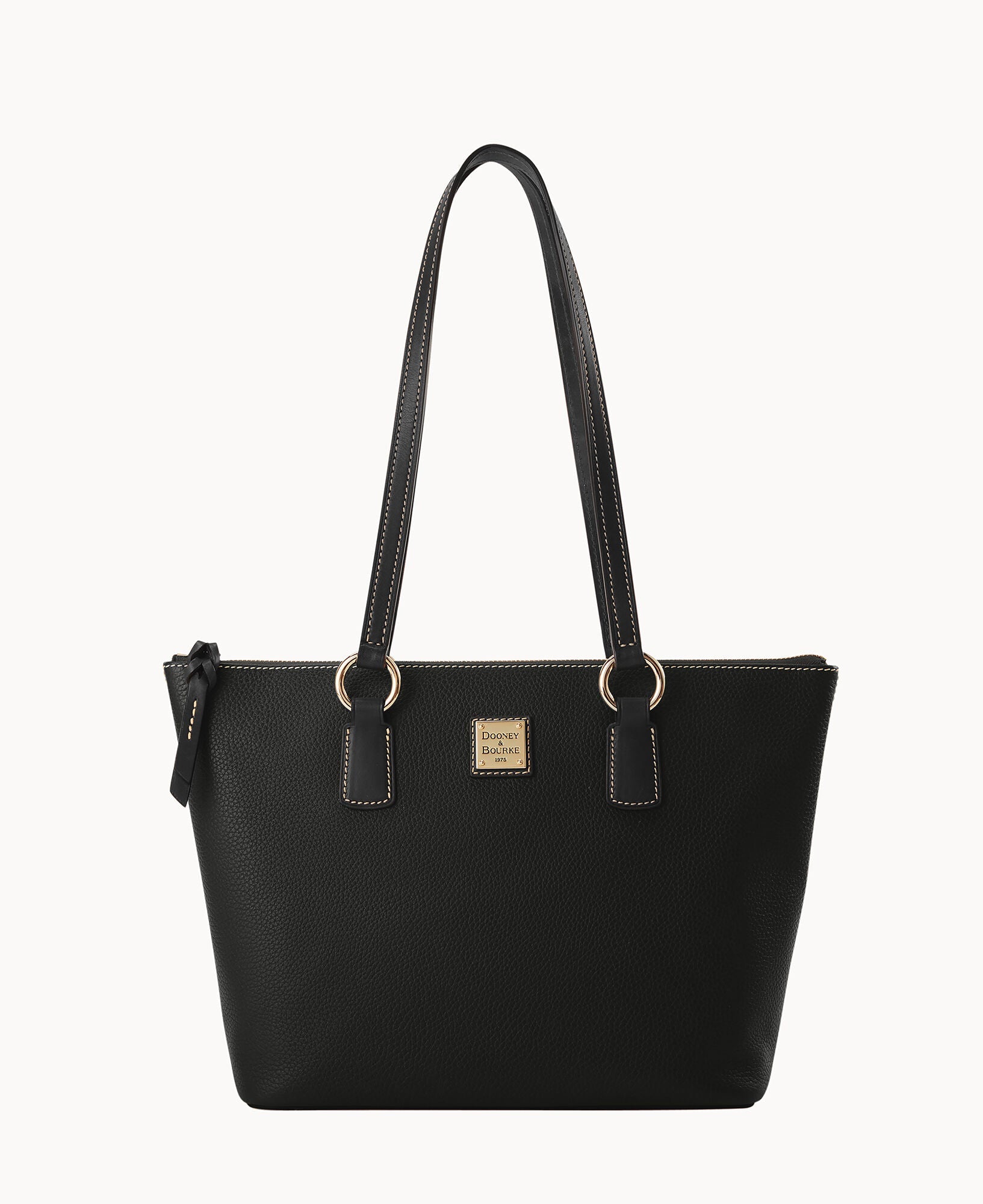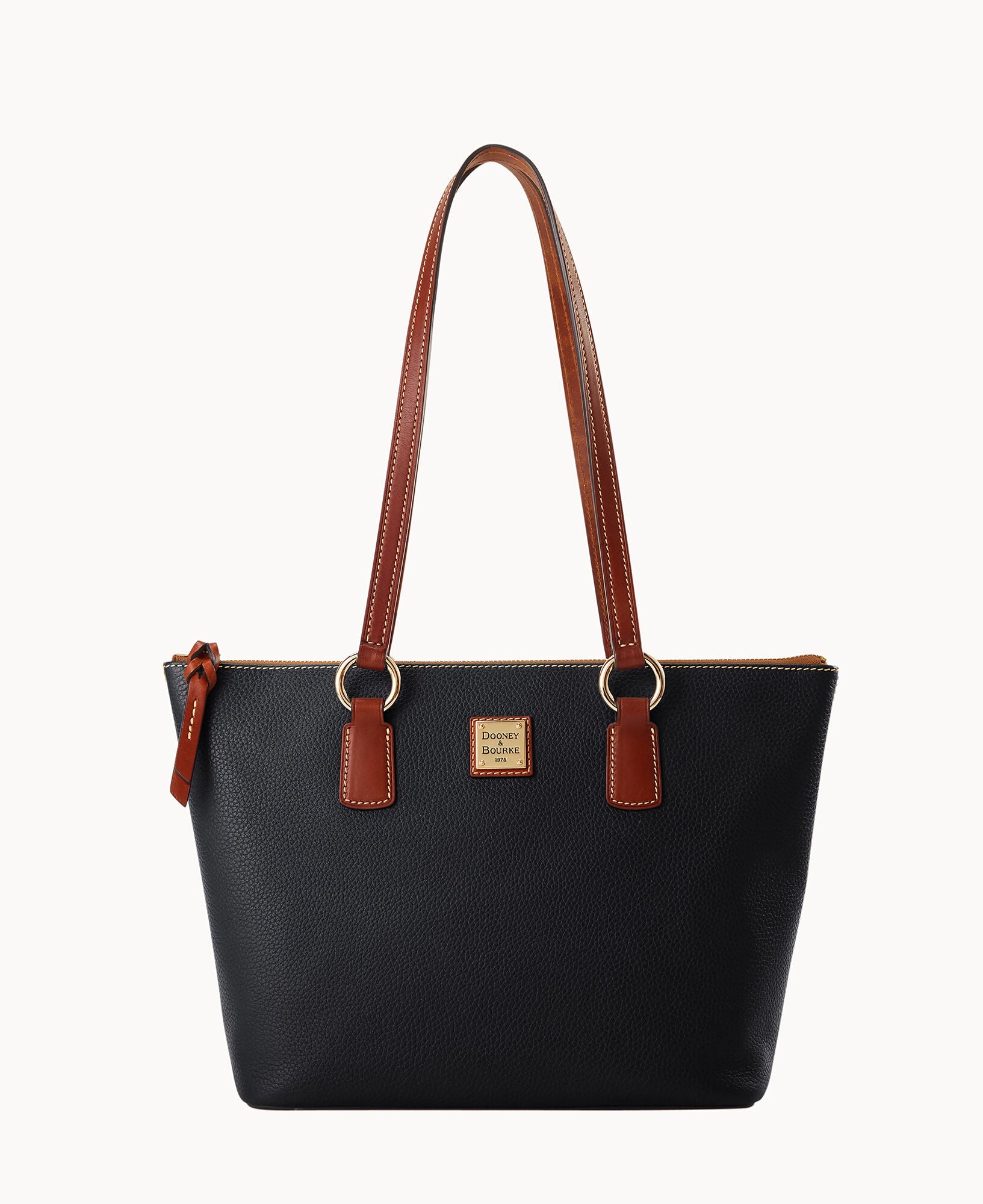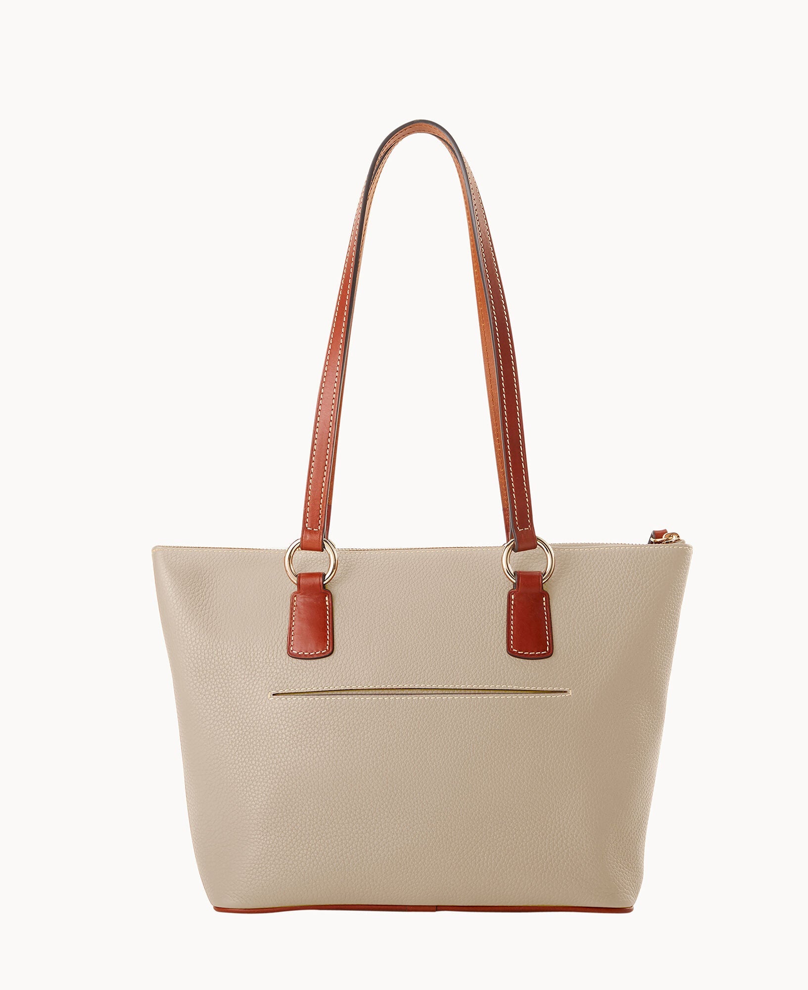 One inside zip pocket. Two inside pockets. Cell phone pocket. Inside key hook. Handle drop length 11". Lined. Feet. Zipper closure.