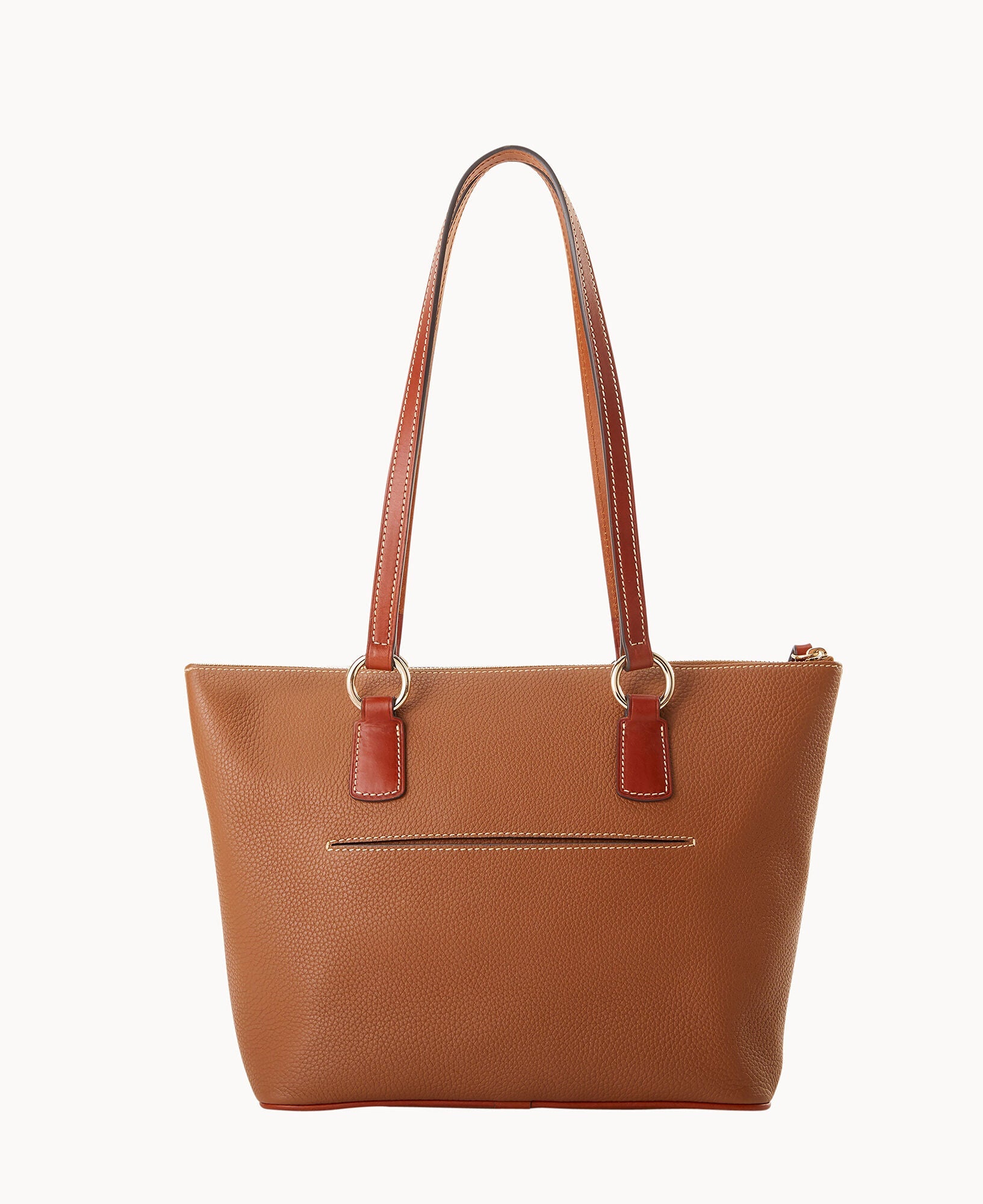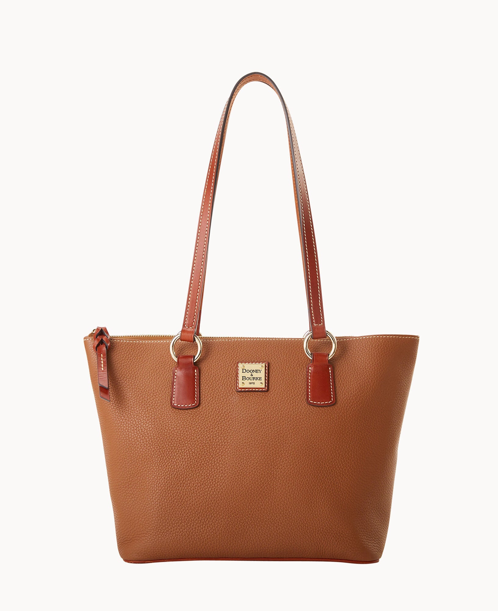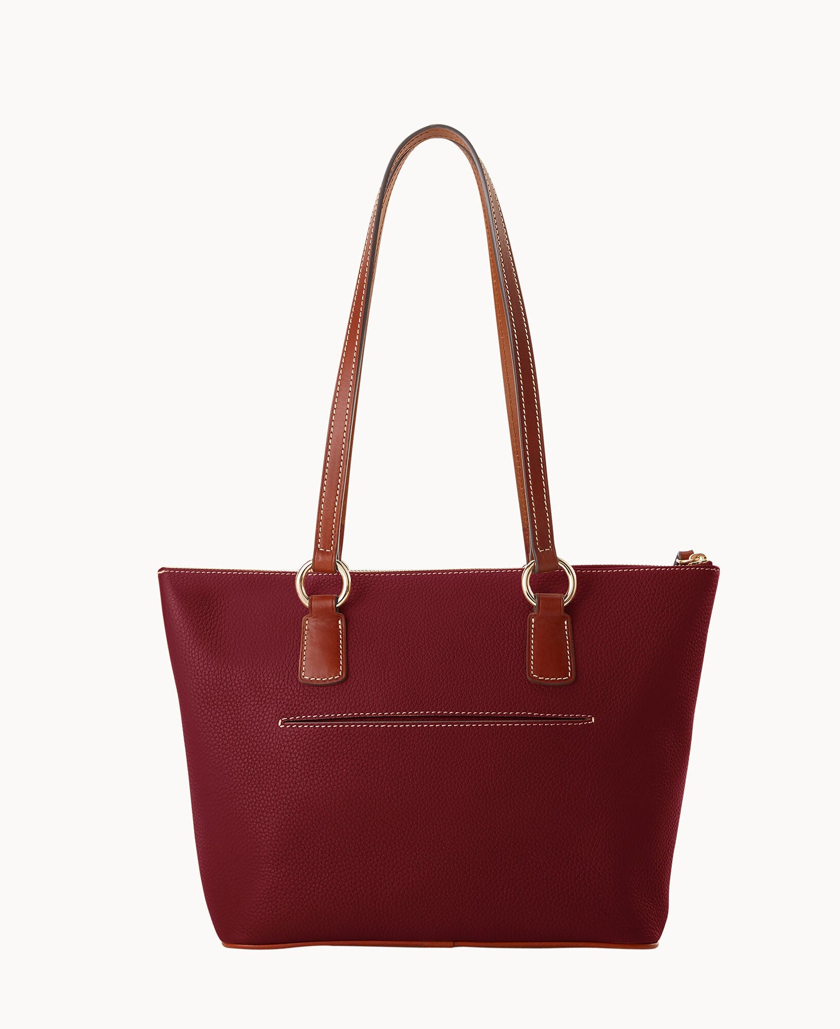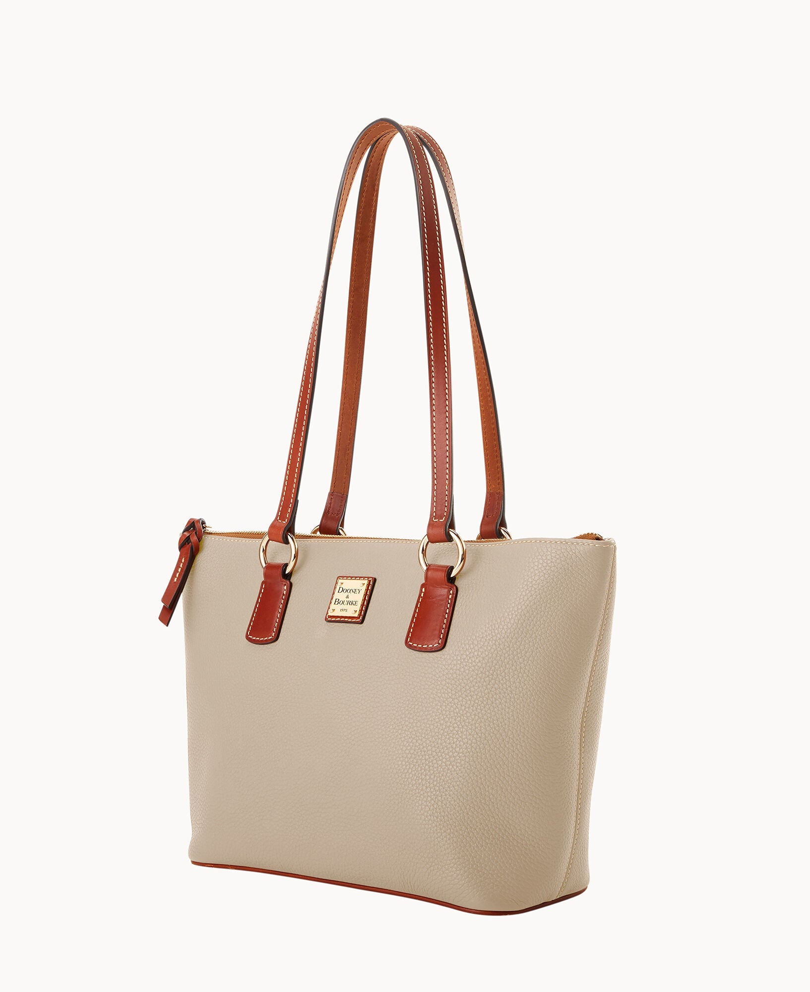 One inside zip pocket. Two inside pockets. Cell phone pocket. Inside key hook. Handle drop length 11". Lined. Feet. Zipper closure.
