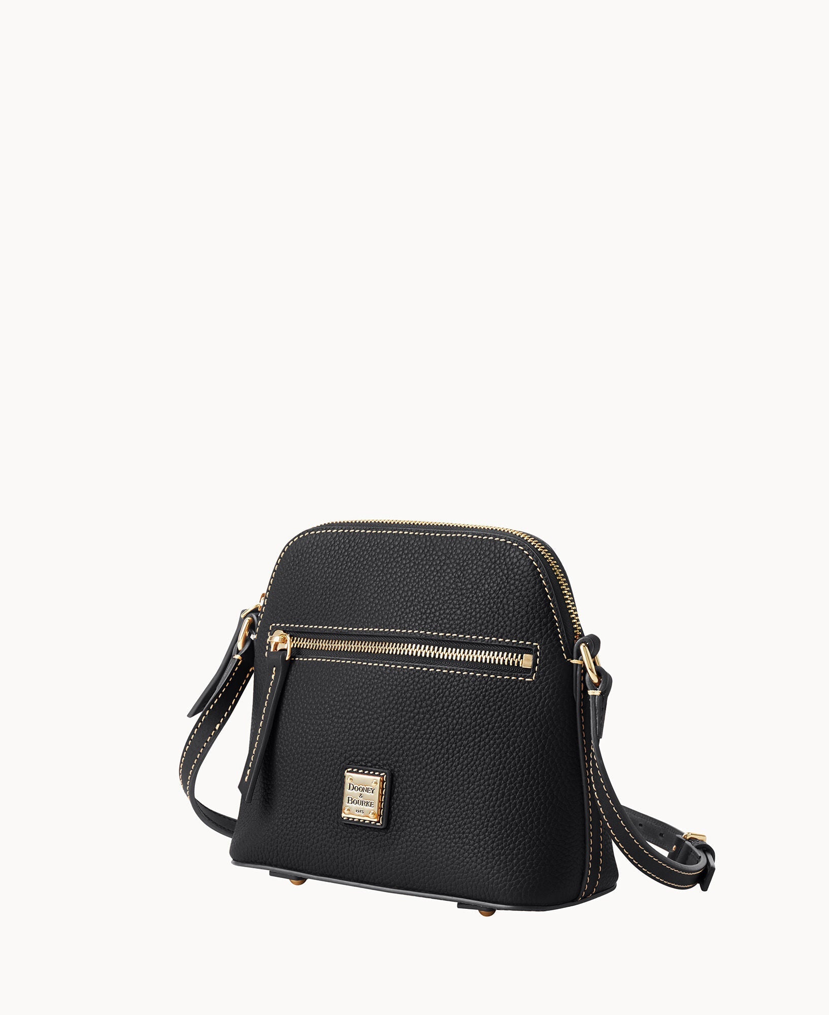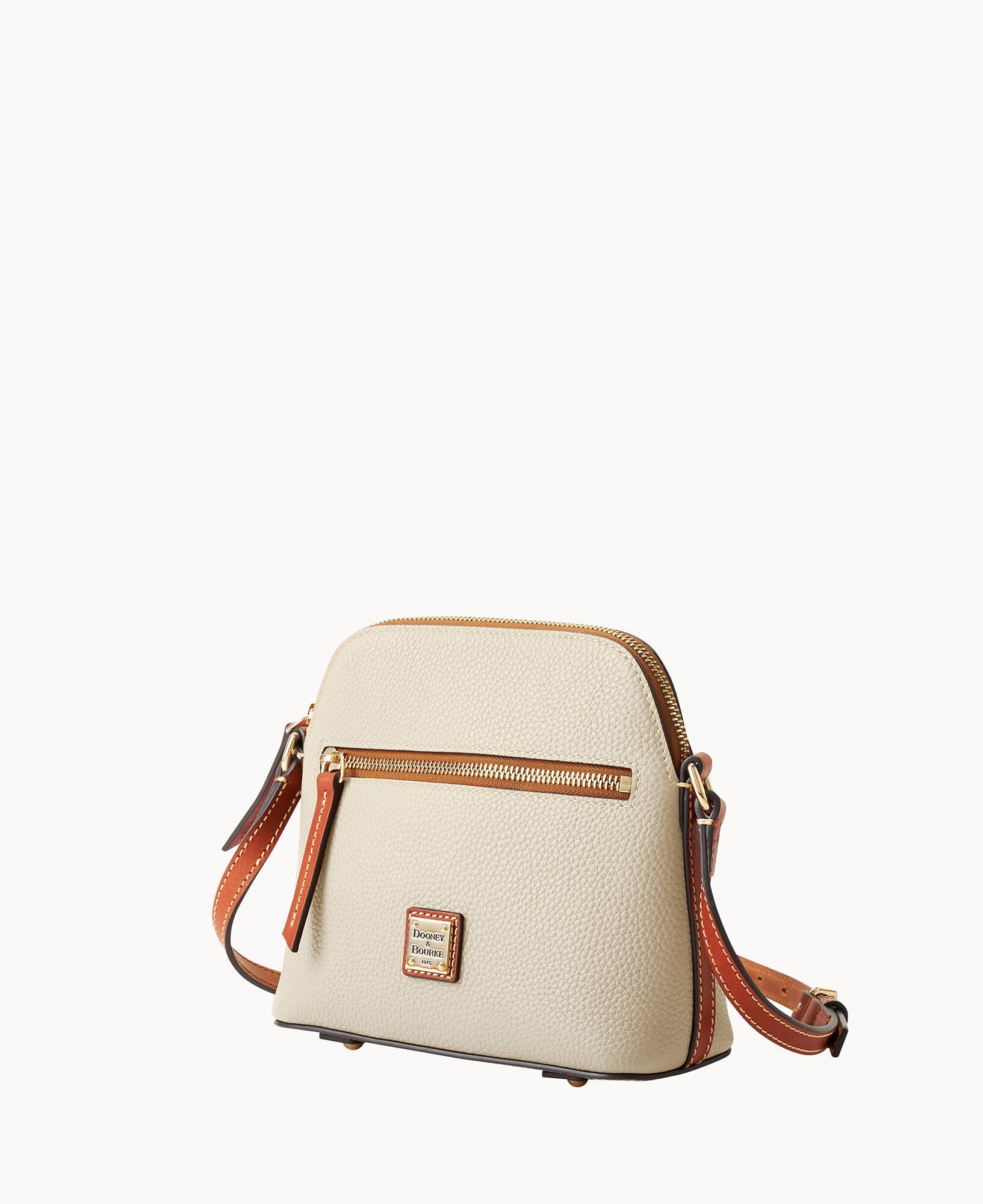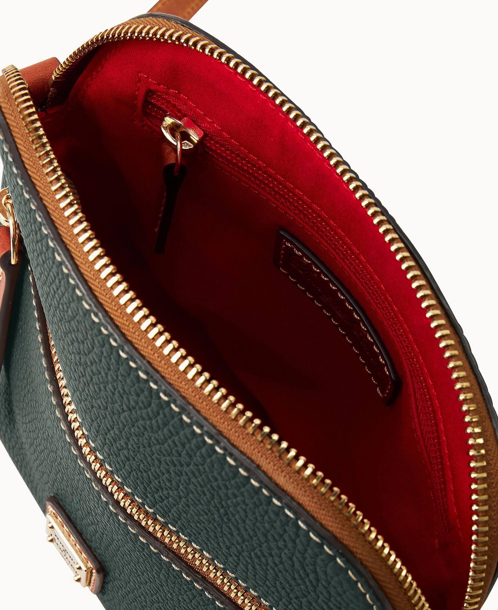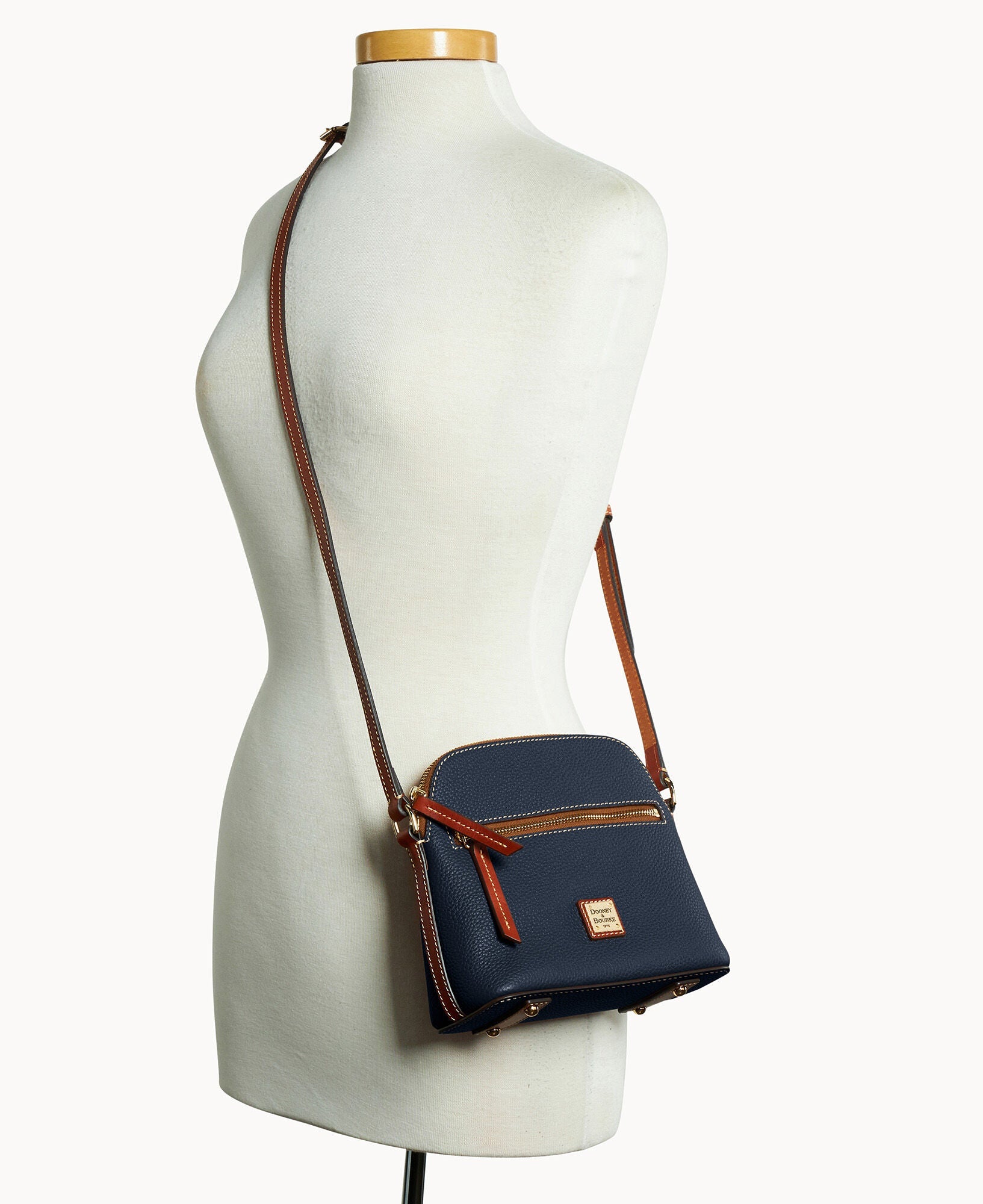 One outside zip pocket. One inside zip pocket. One inside pocket. Inside key hook. Adjustable shoulder strap. Strap drop length 23". Lined. Feet.