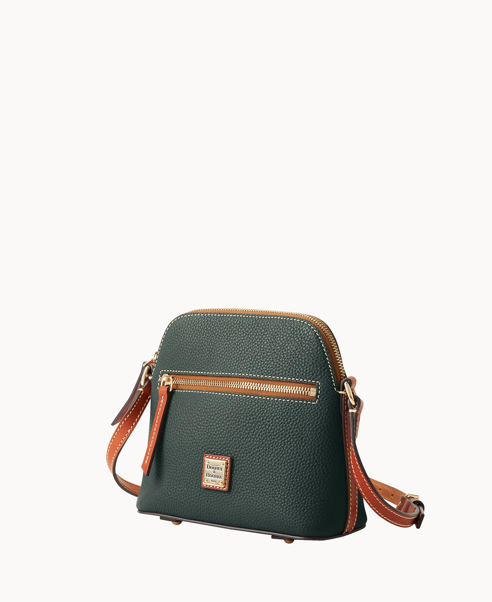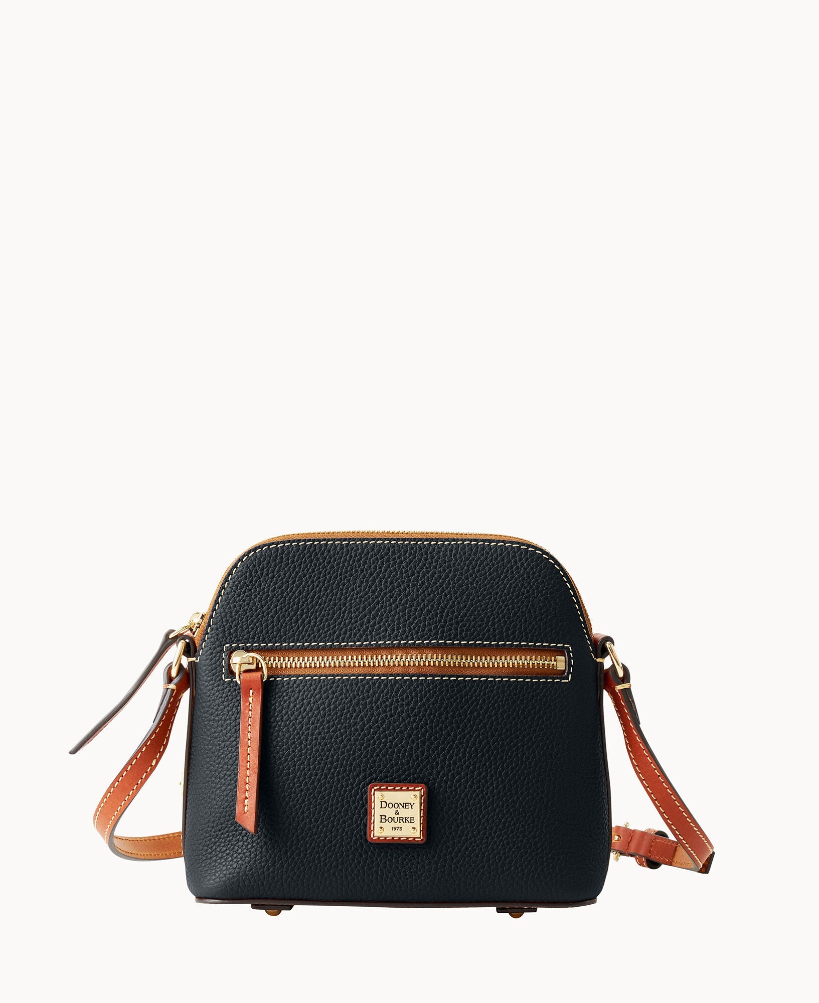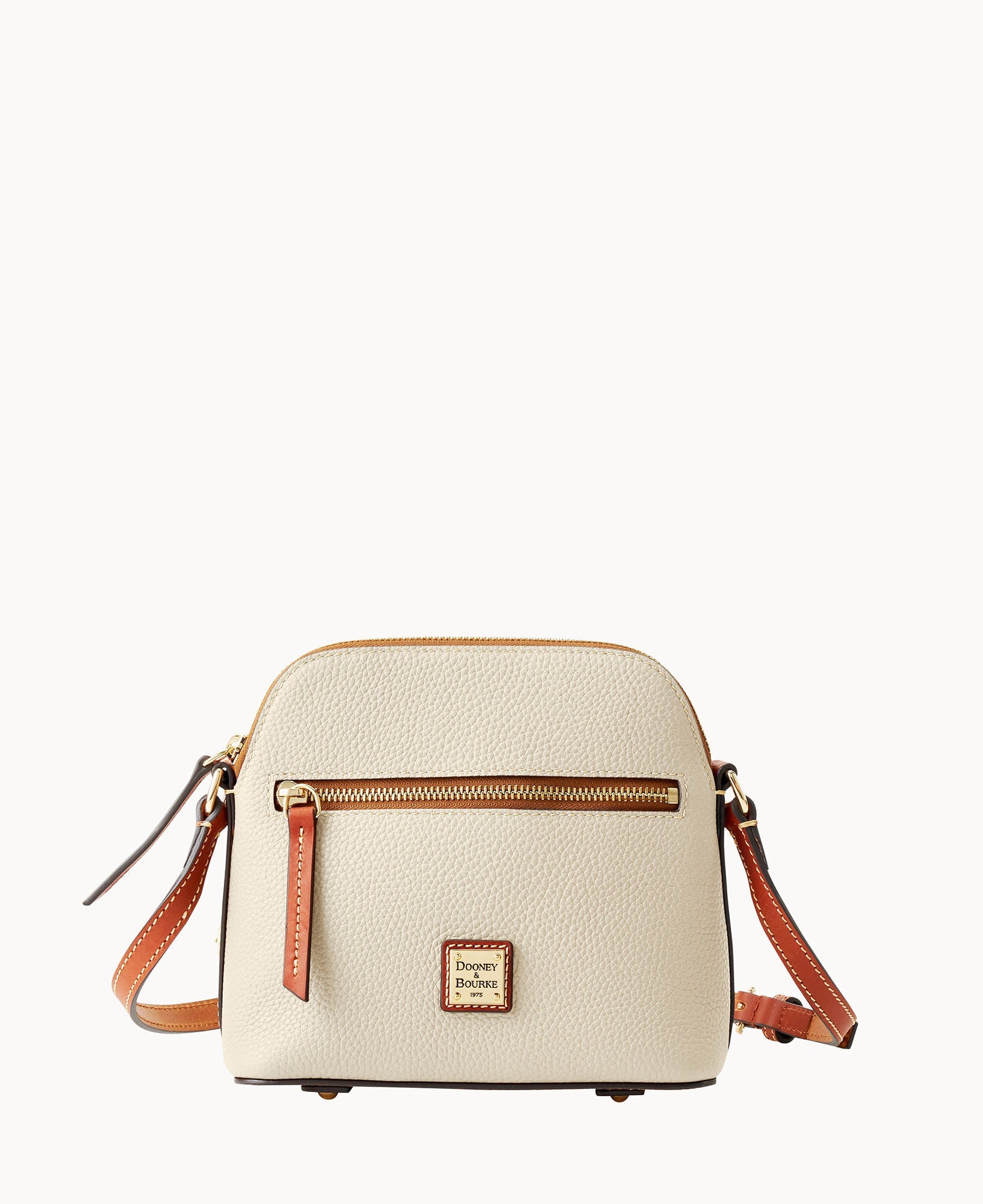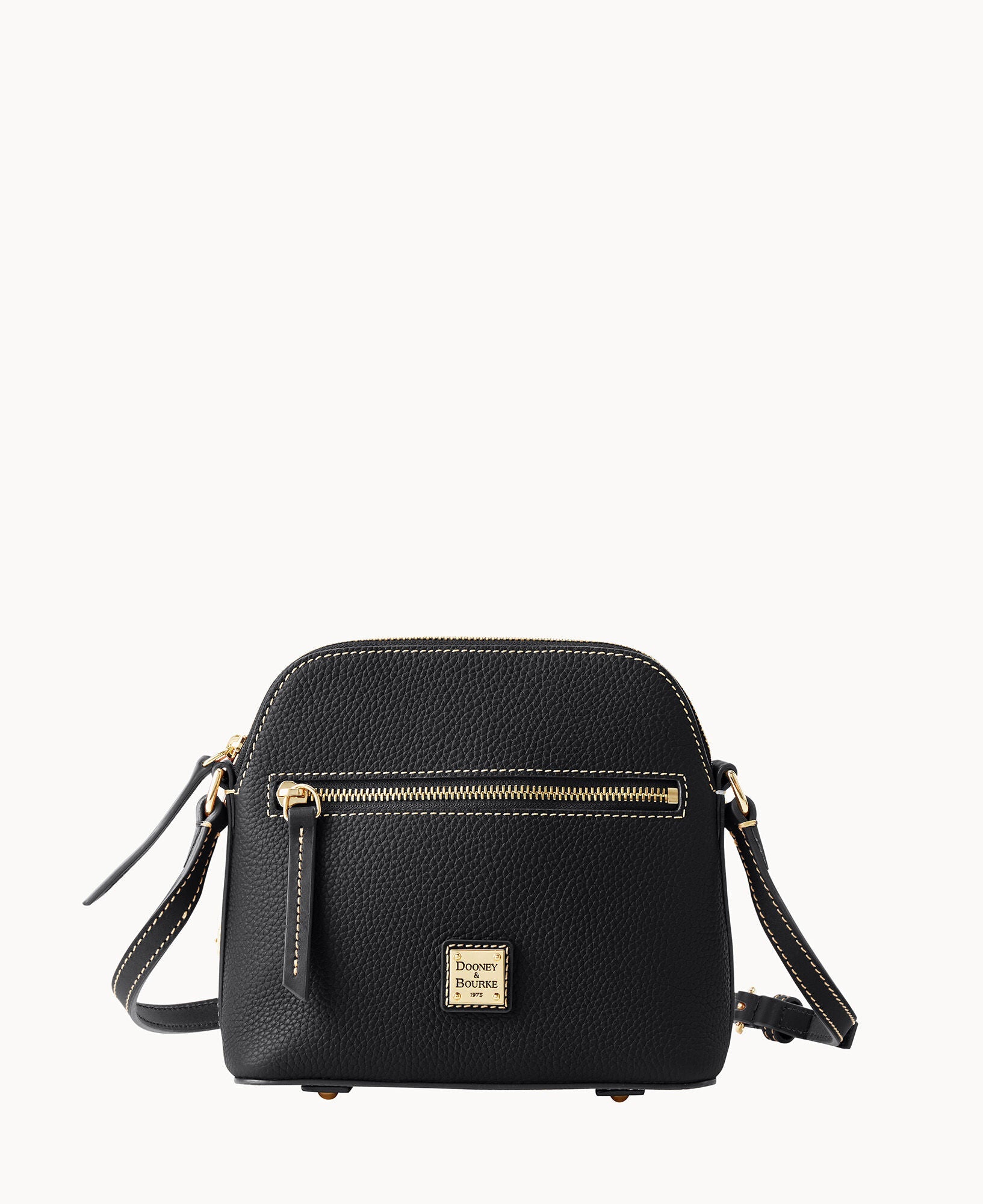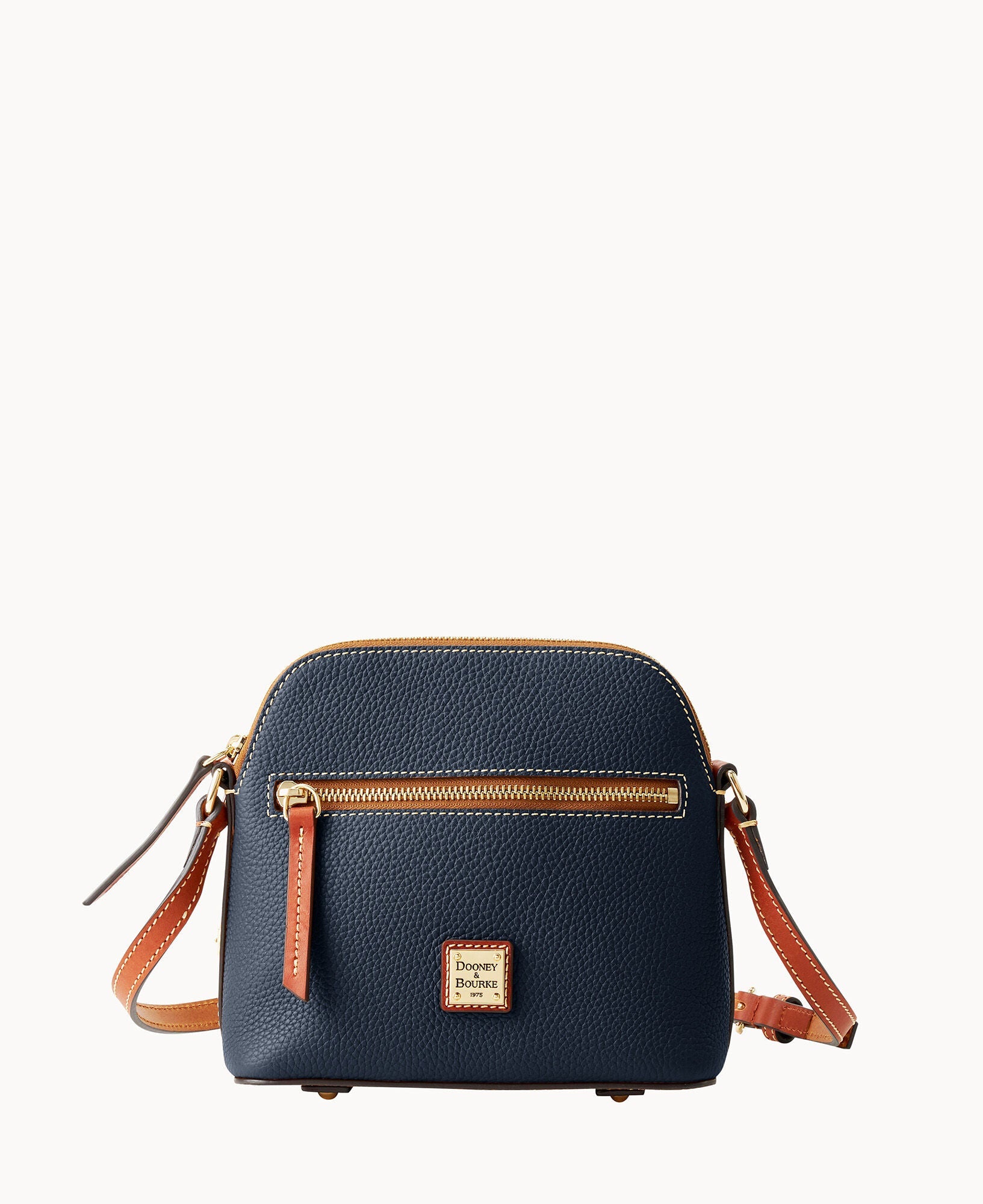 One outside zip pocket. One inside zip pocket. One inside pocket. Inside key hook. Adjustable shoulder strap. Strap drop length 23". Lined. Feet.