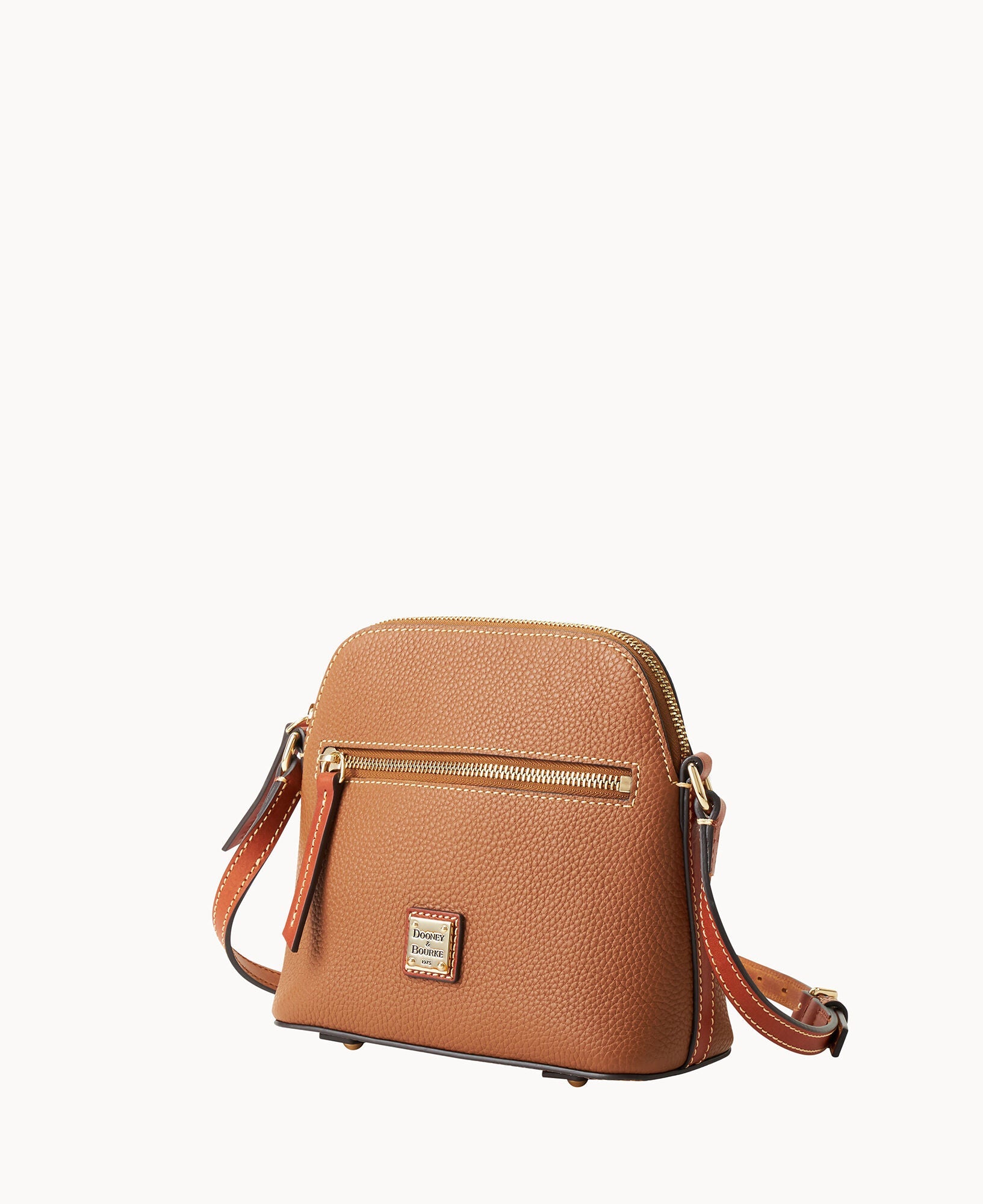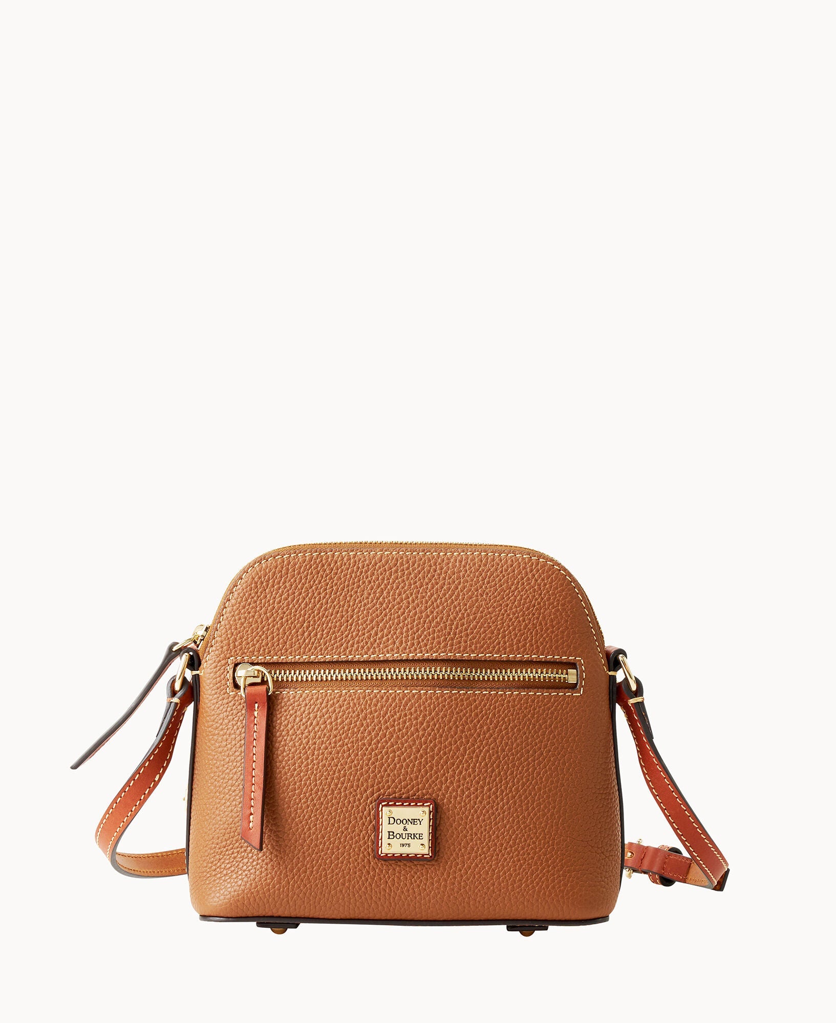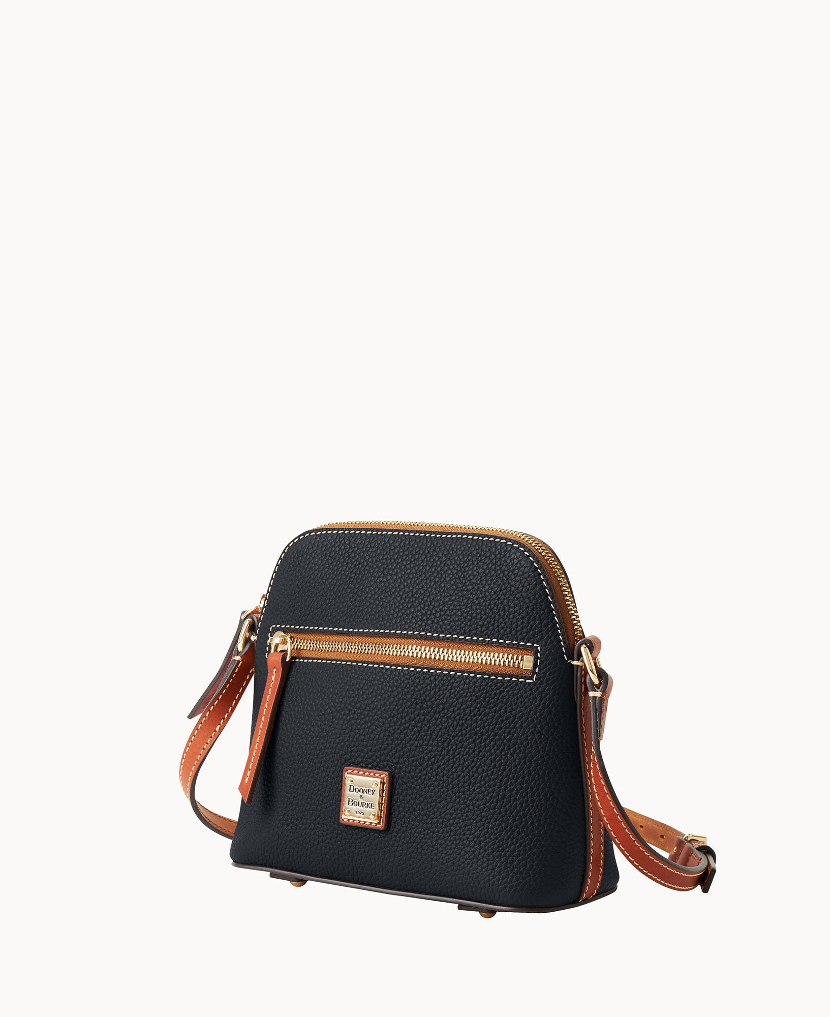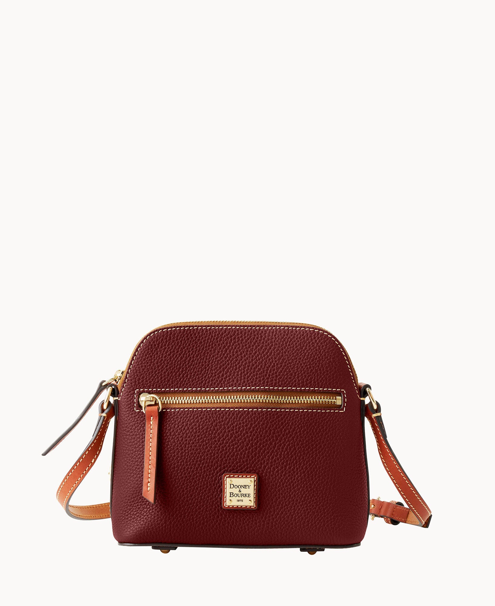 One outside zip pocket. One inside zip pocket. One inside pocket. Inside key hook. Adjustable shoulder strap. Strap drop length 23". Lined. Feet.
