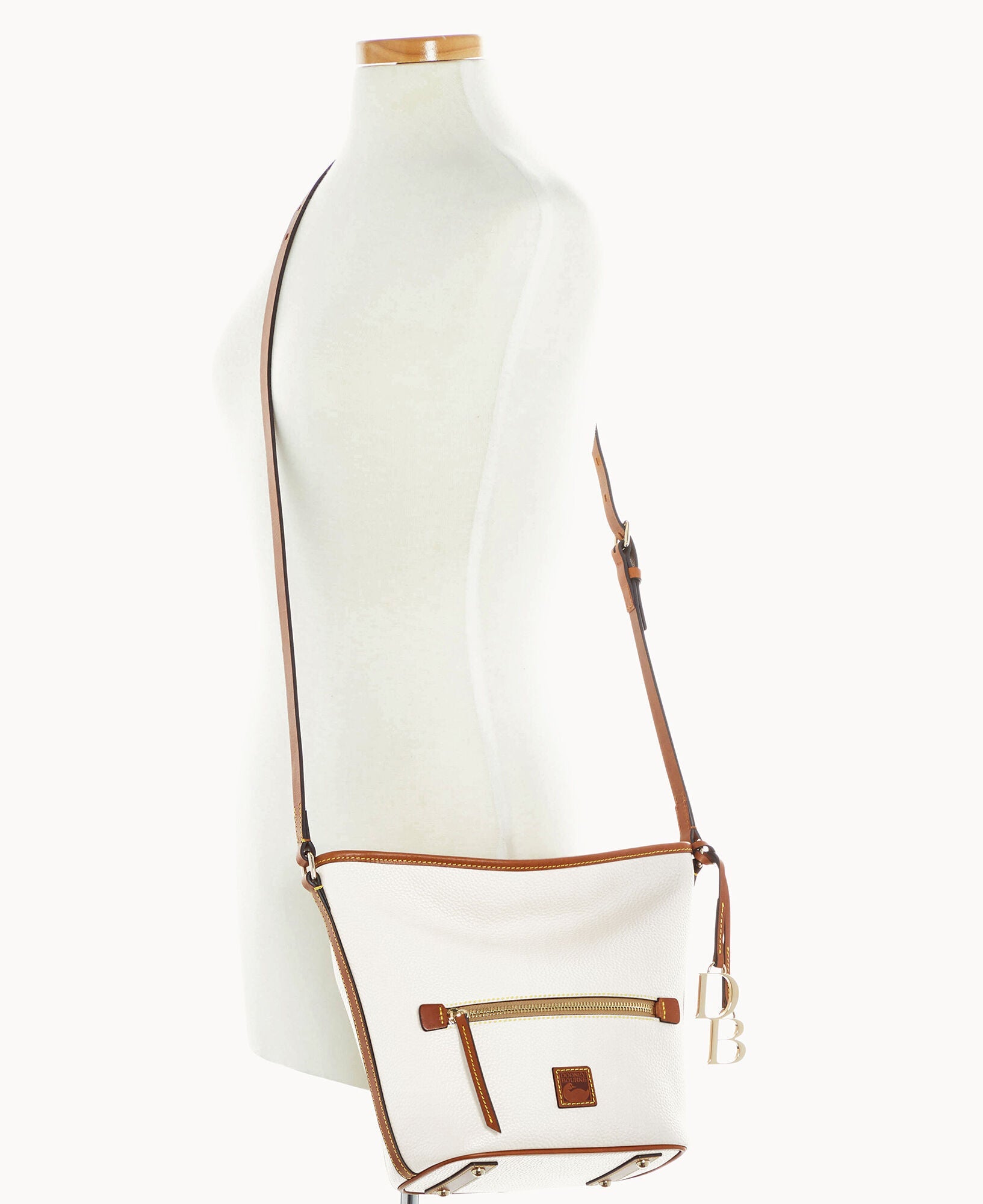 One outside zip pocket. One inside zip pocket. Two inside pockets. Inside key hook. Strap length 22.5". Lined. Zipper closure. Removable DB medallion.
