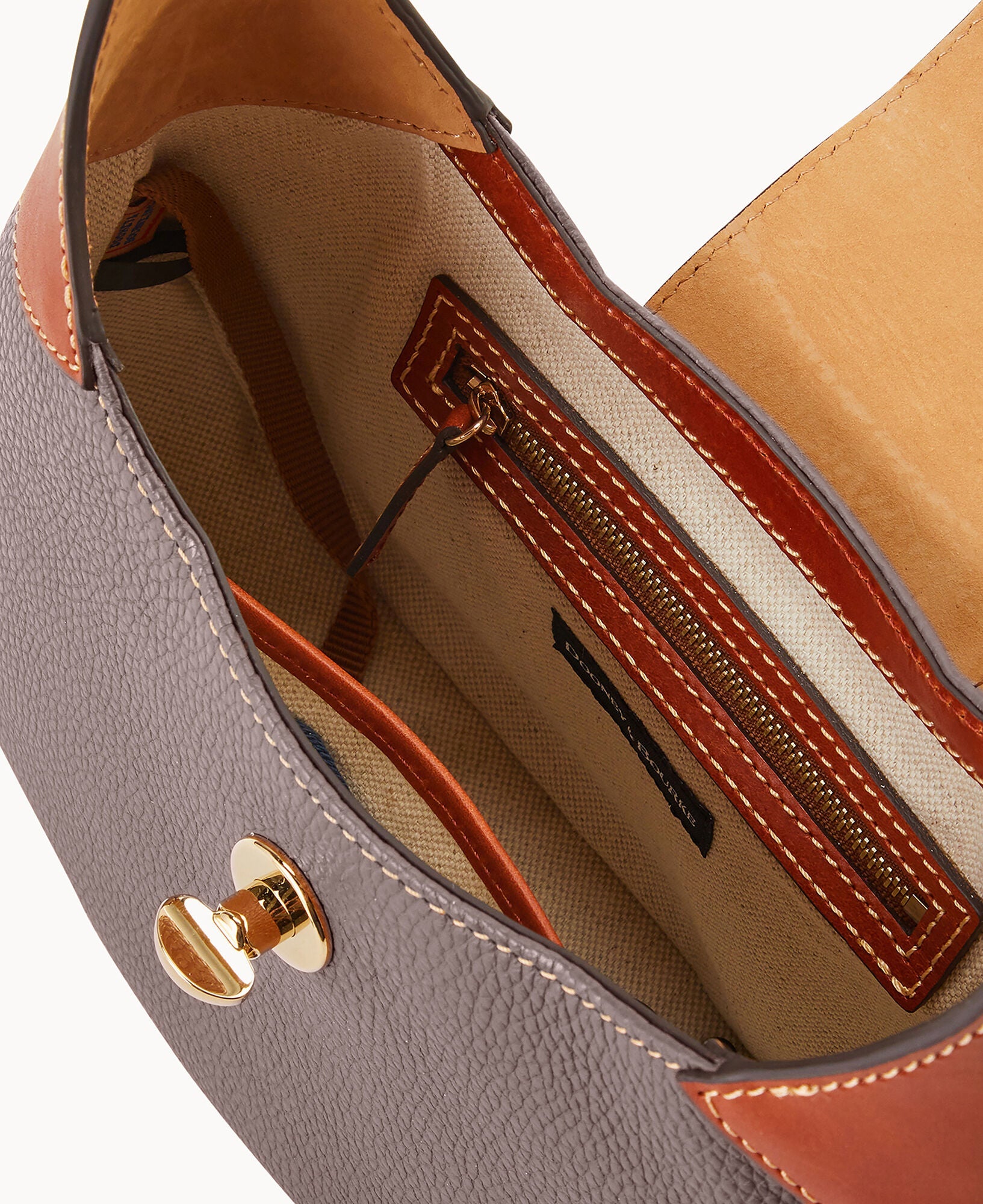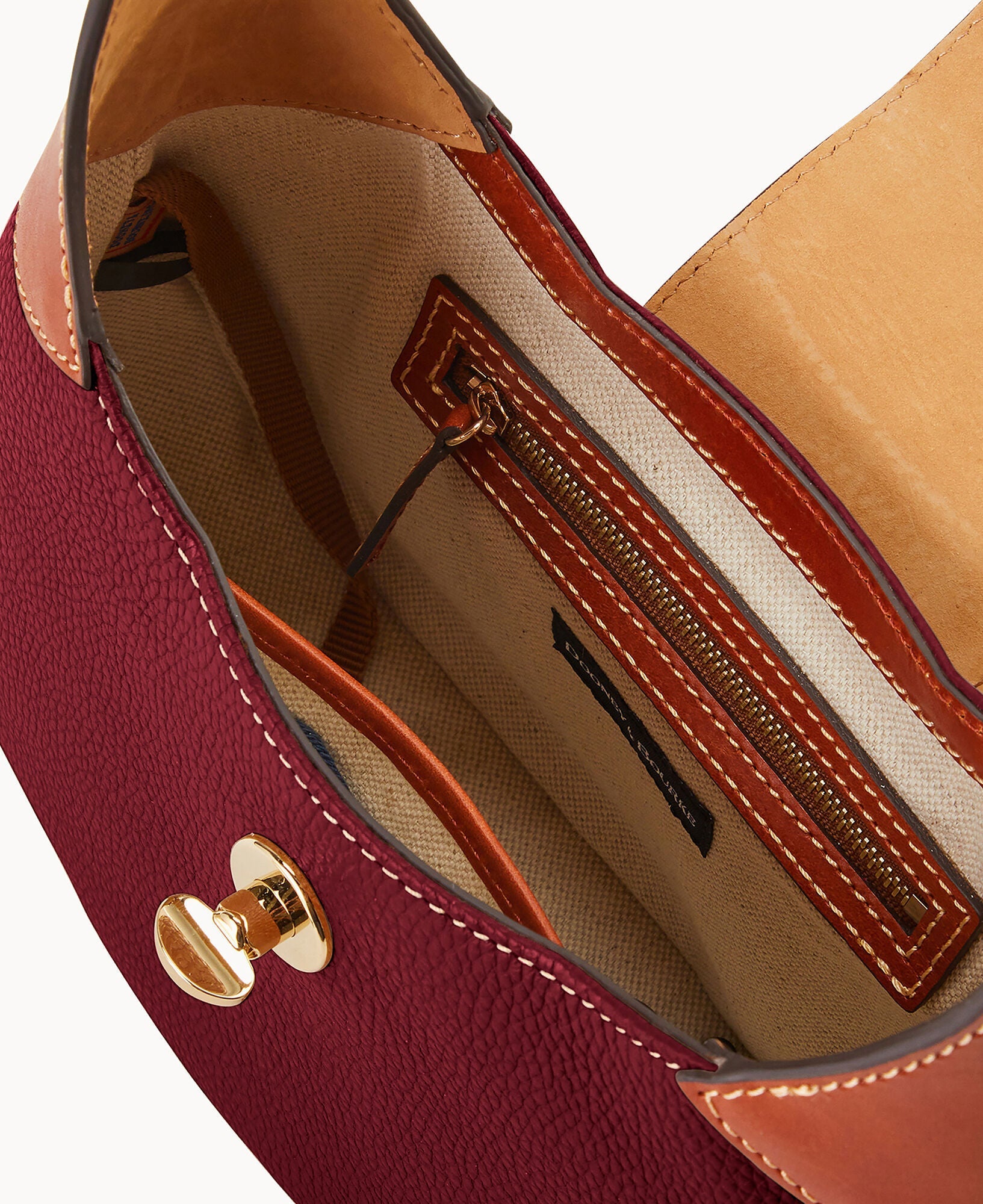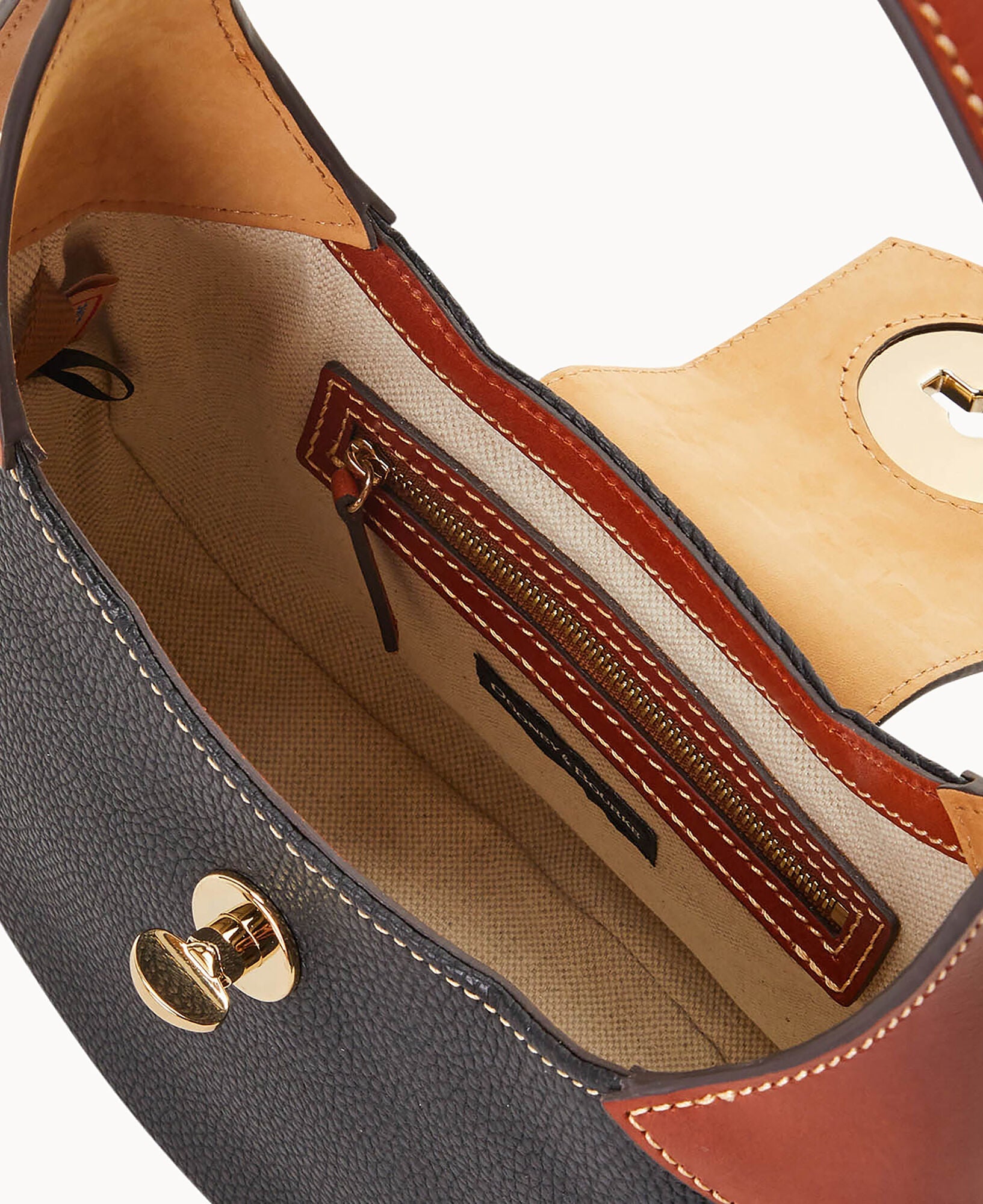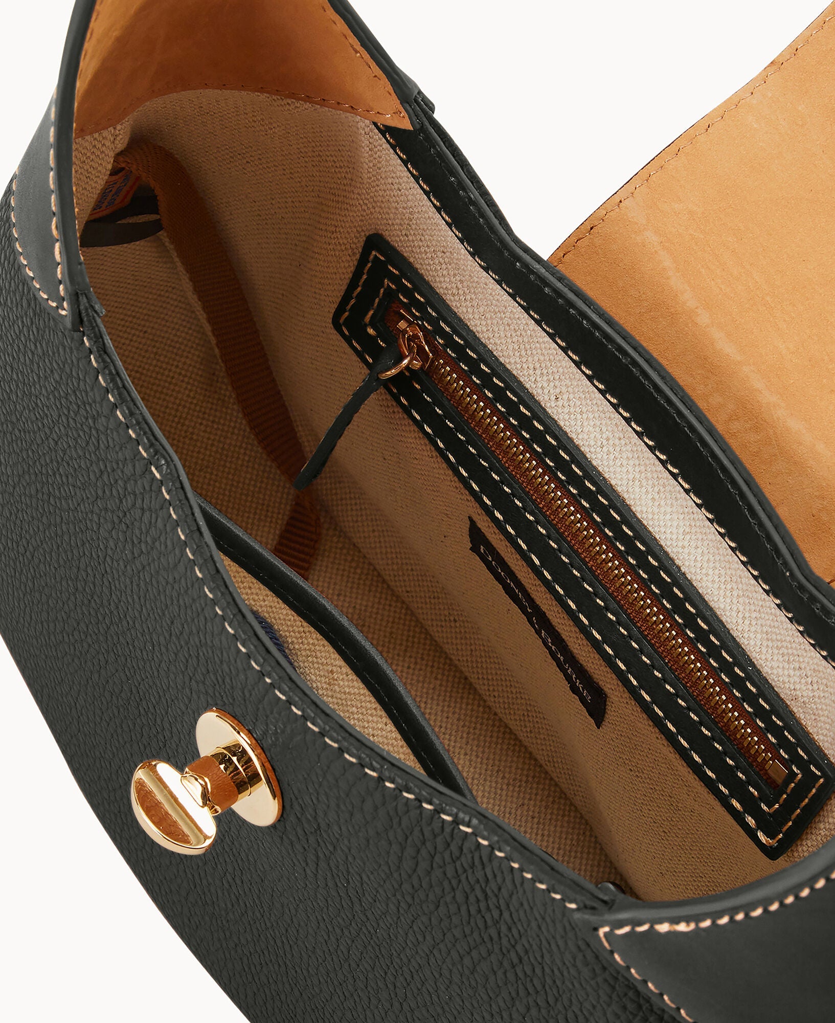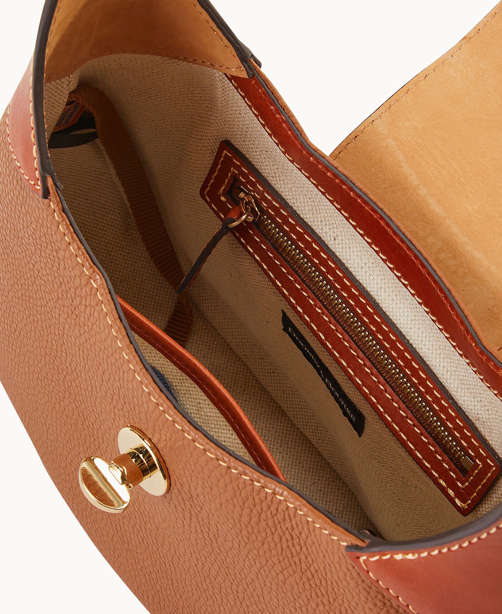 One inside zip pocket. One inside pocket. Inside key hook. Adjustable shoulder strap. Strap drop length 9". Lined. Turnlock closure.