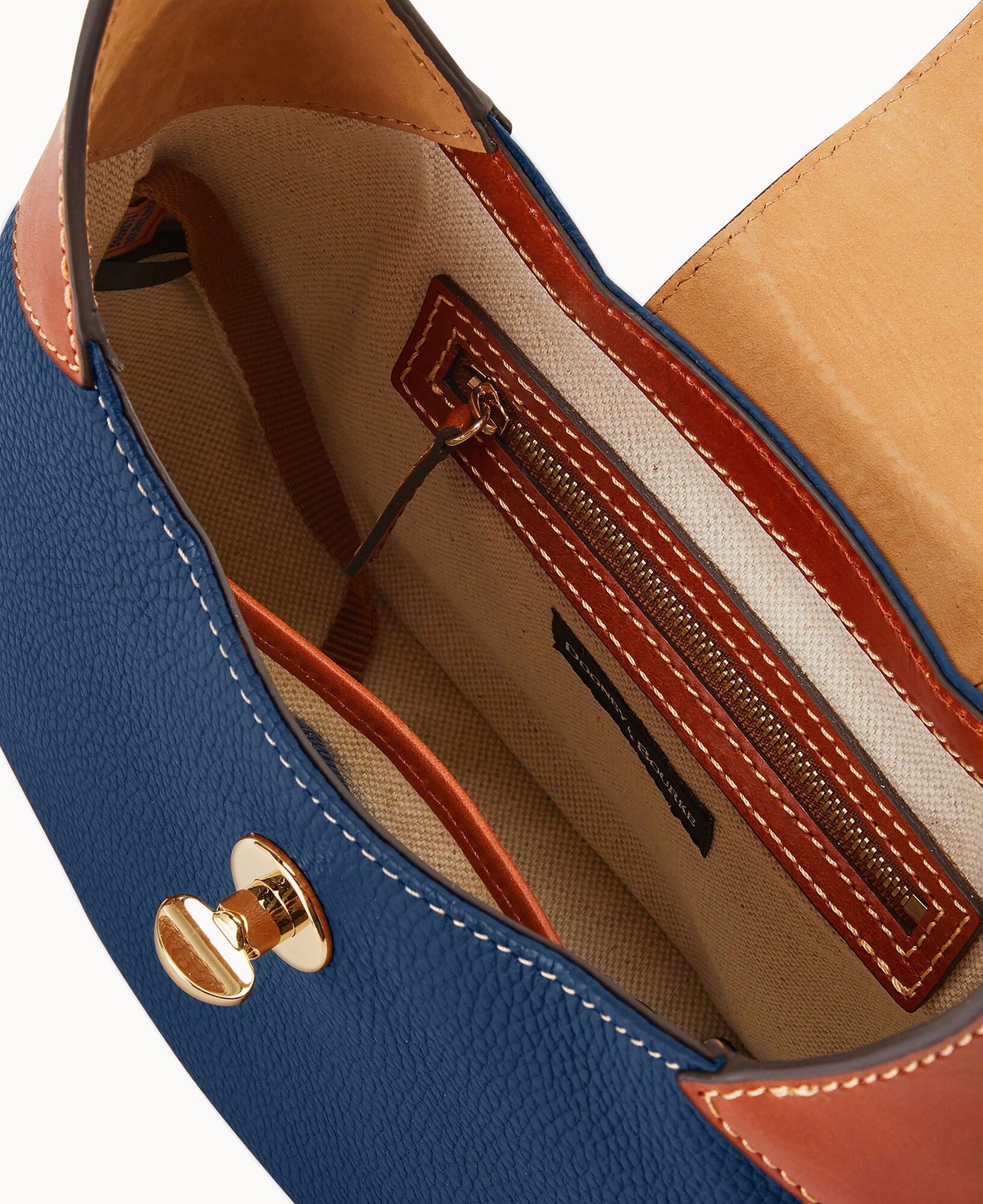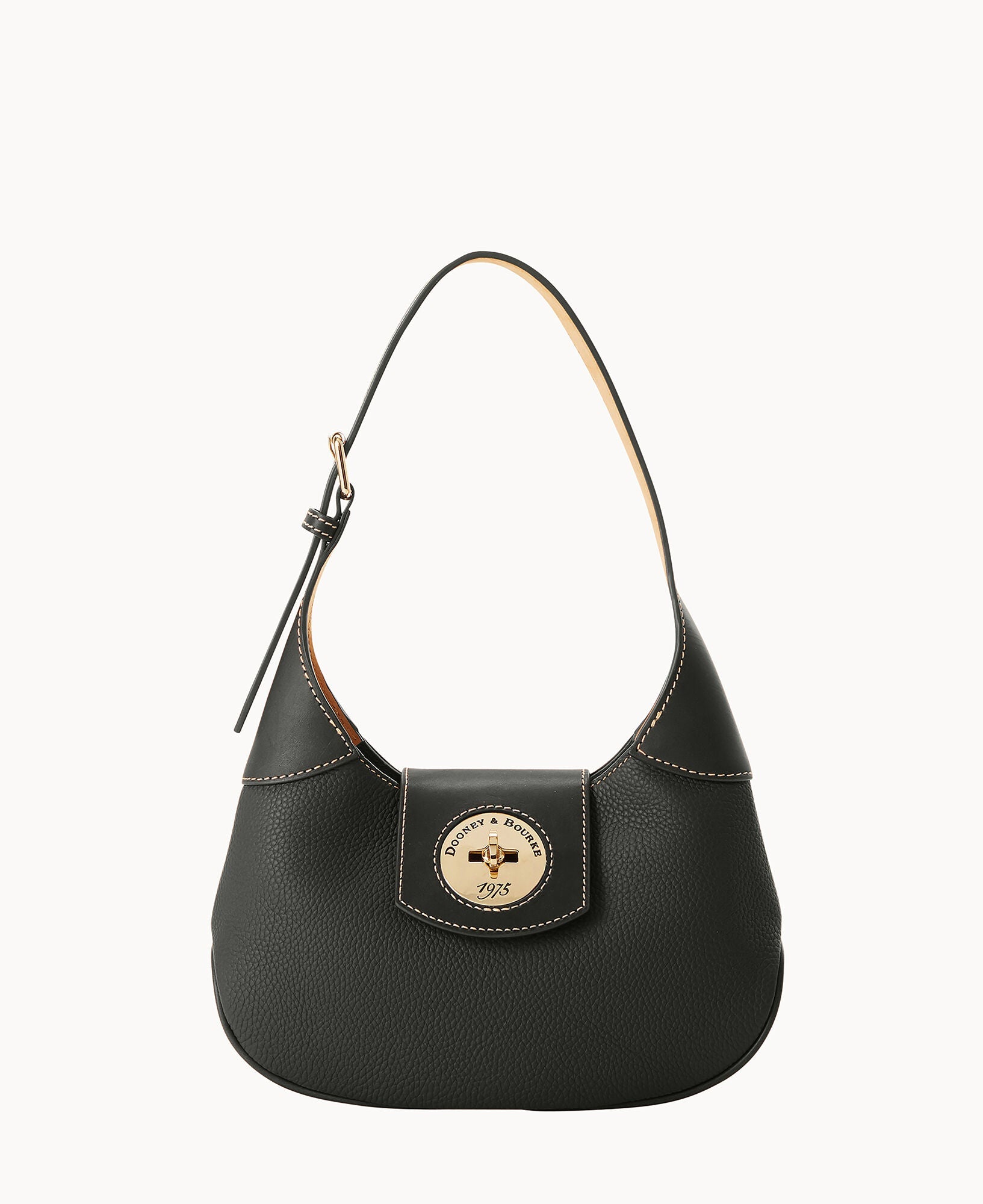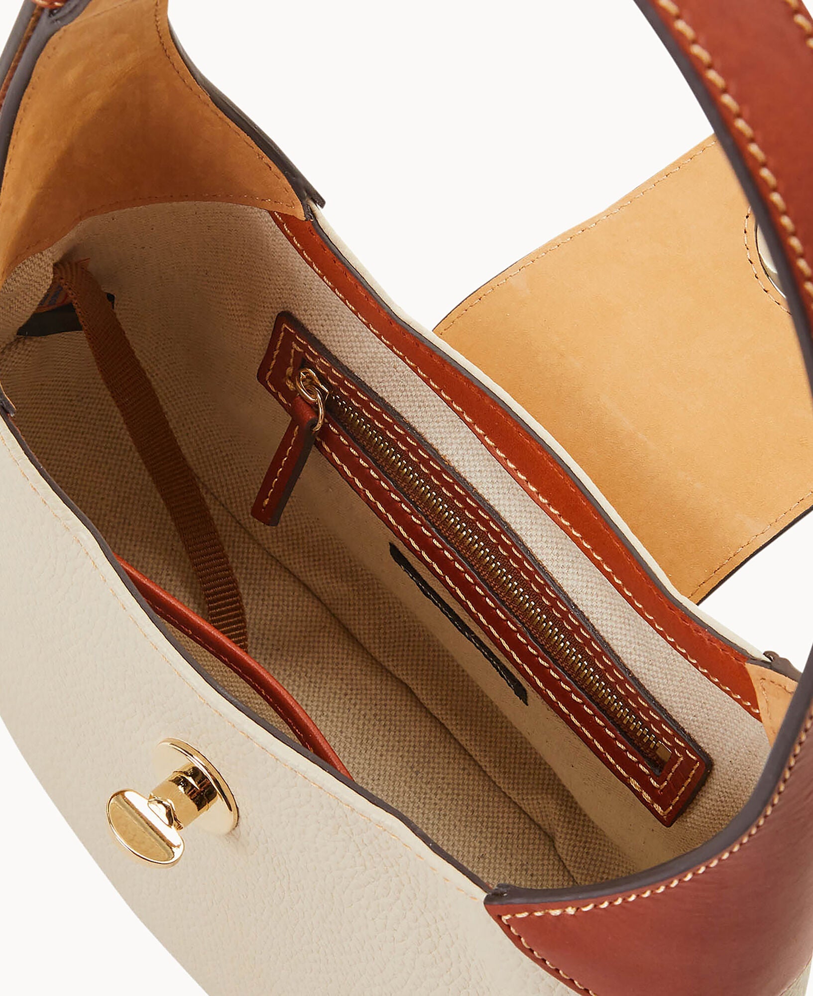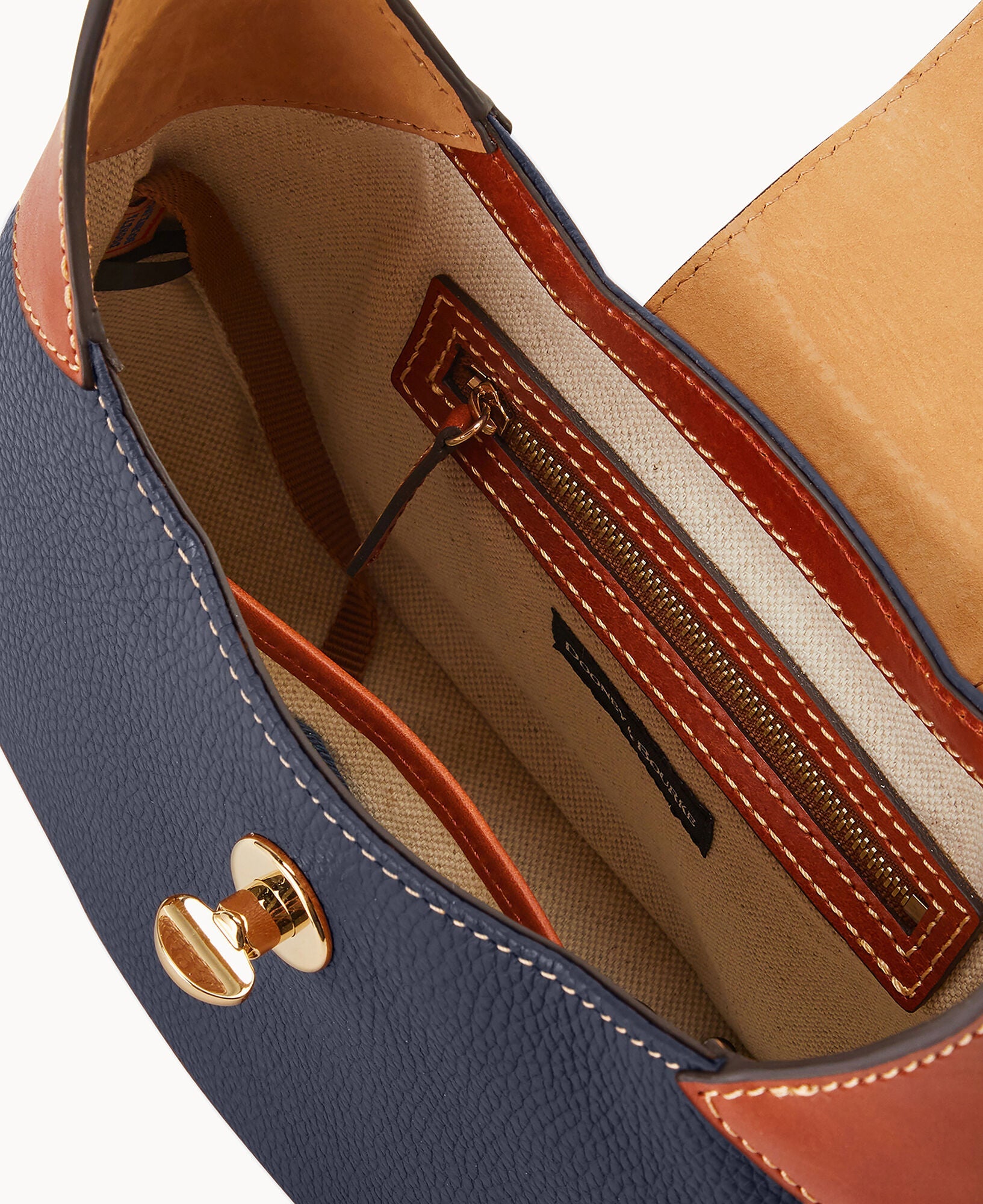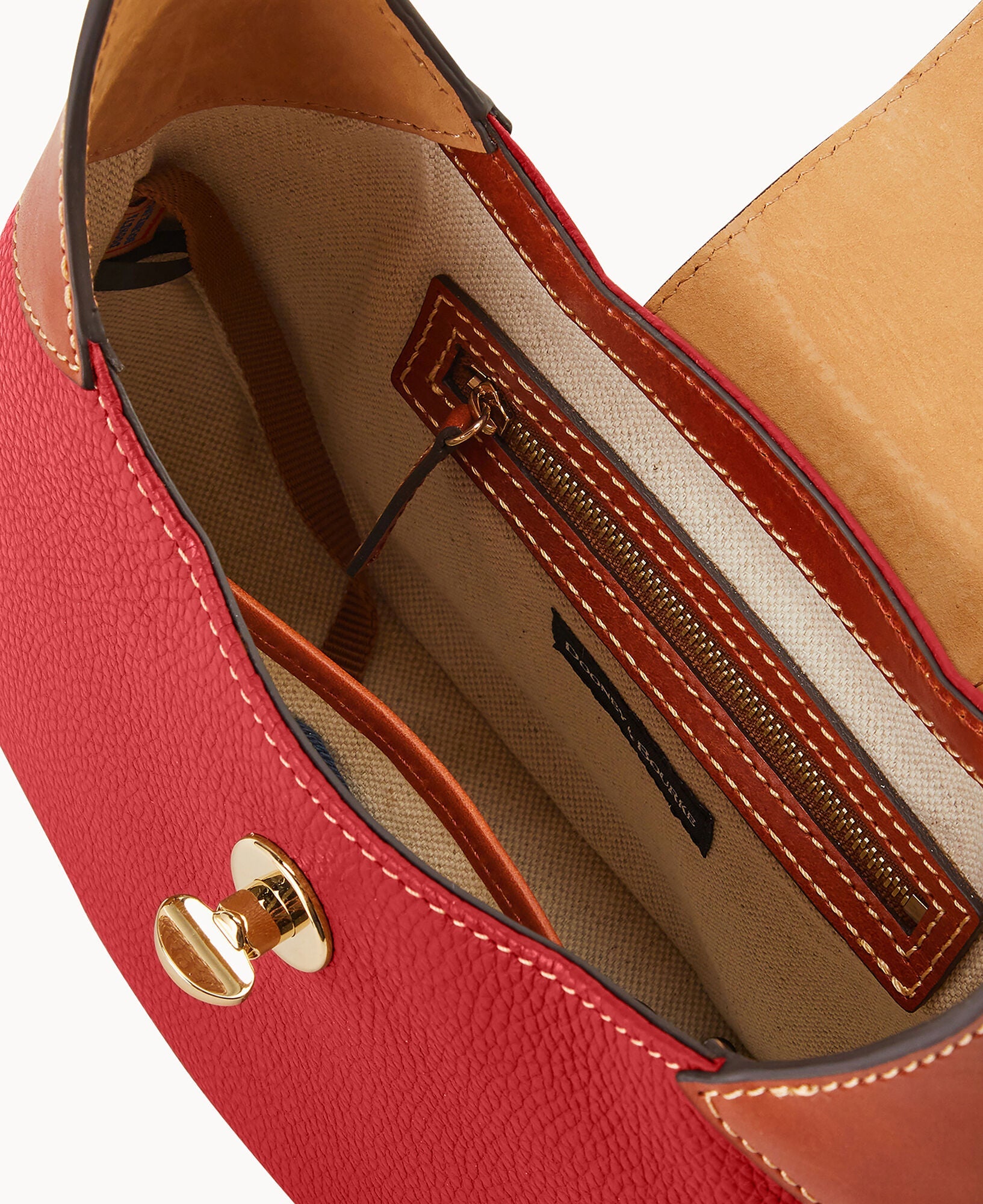 One inside zip pocket. One inside pocket. Inside key hook. Adjustable shoulder strap. Strap drop length 9". Lined. Turnlock closure.