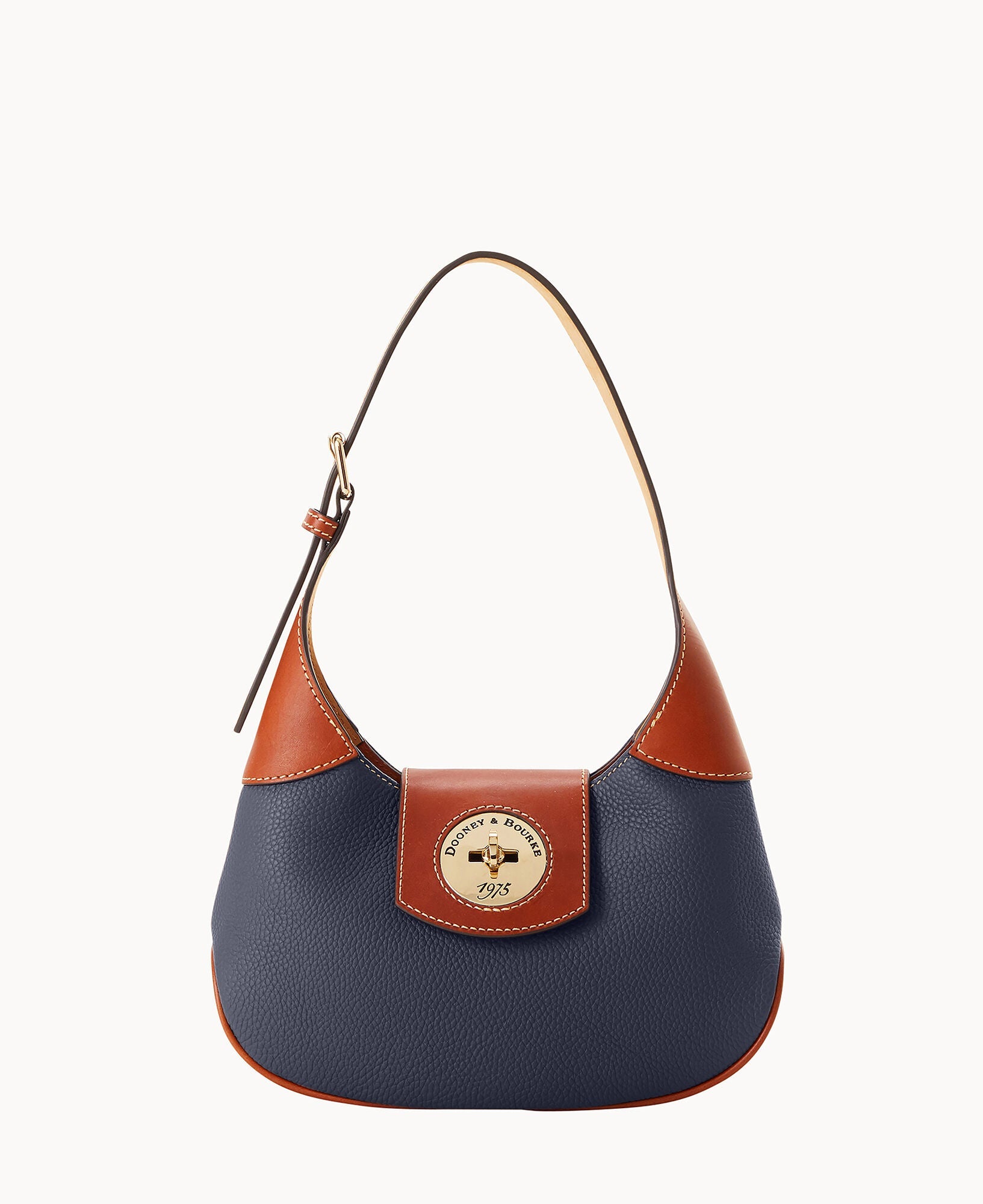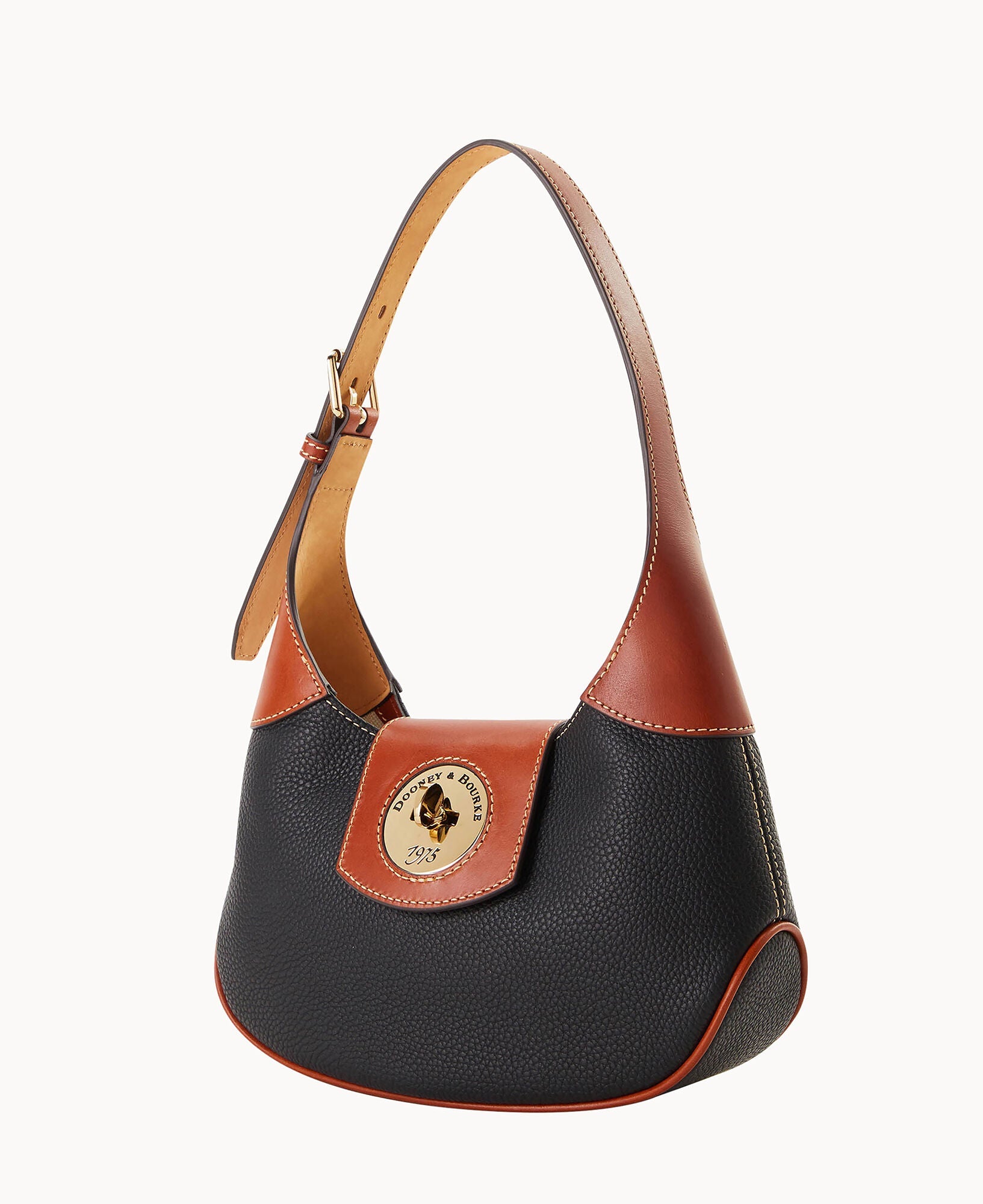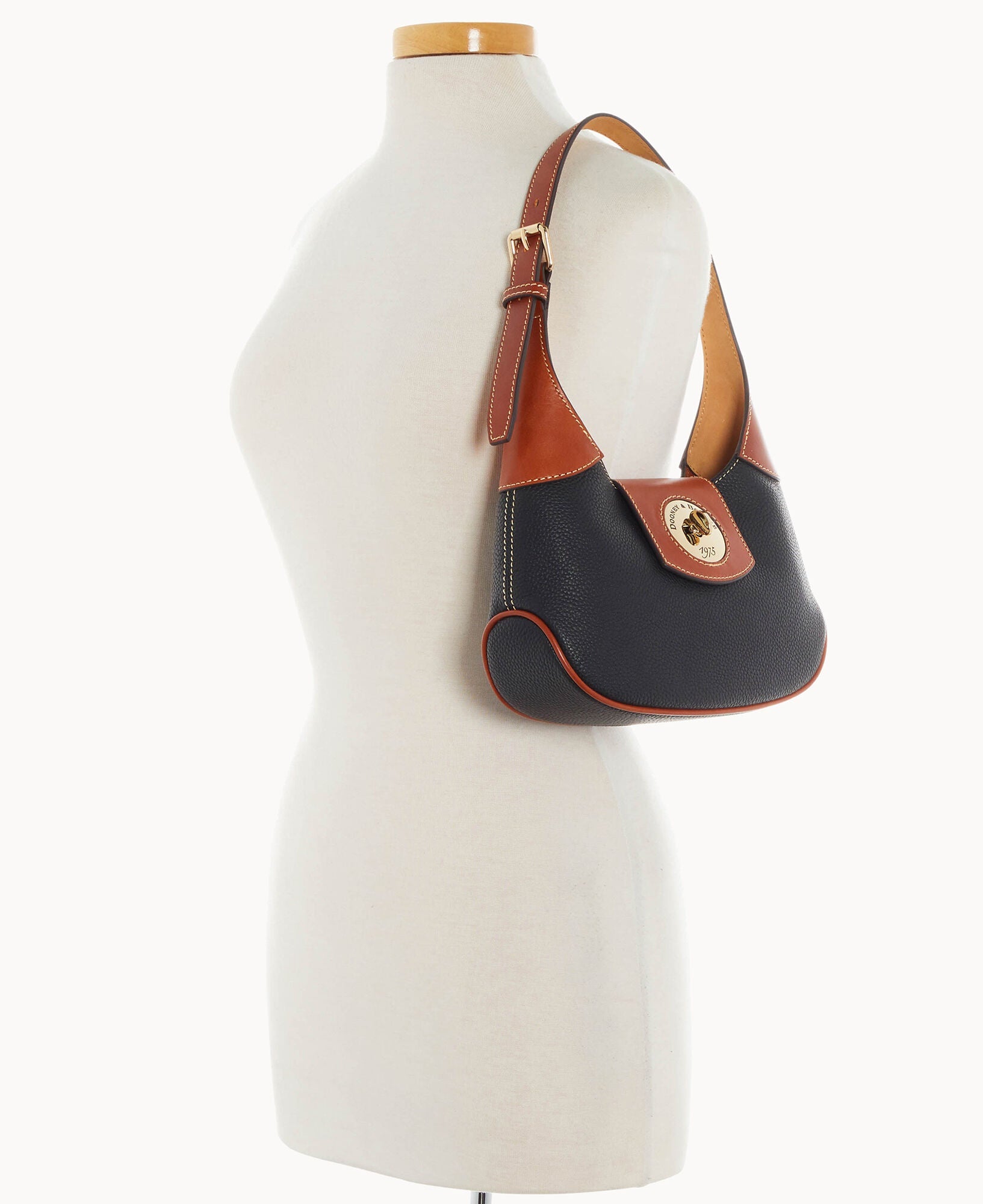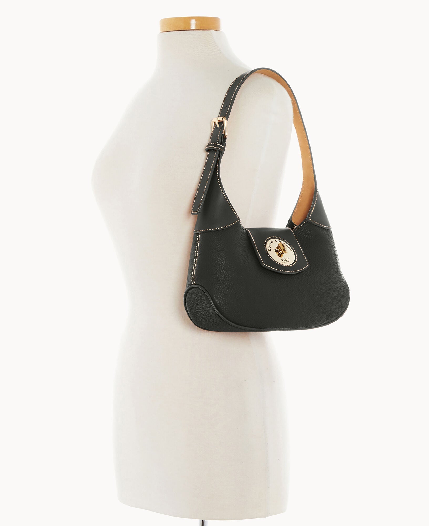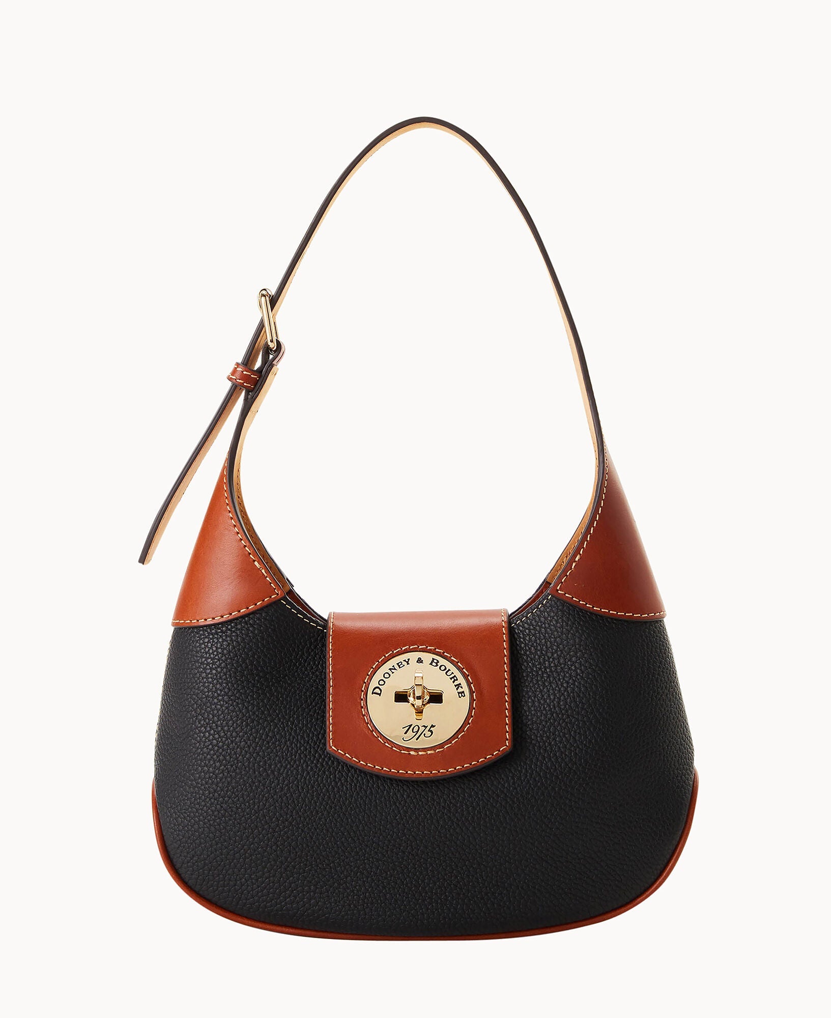 One inside zip pocket. One inside pocket. Inside key hook. Adjustable shoulder strap. Strap drop length 9". Lined. Turnlock closure.