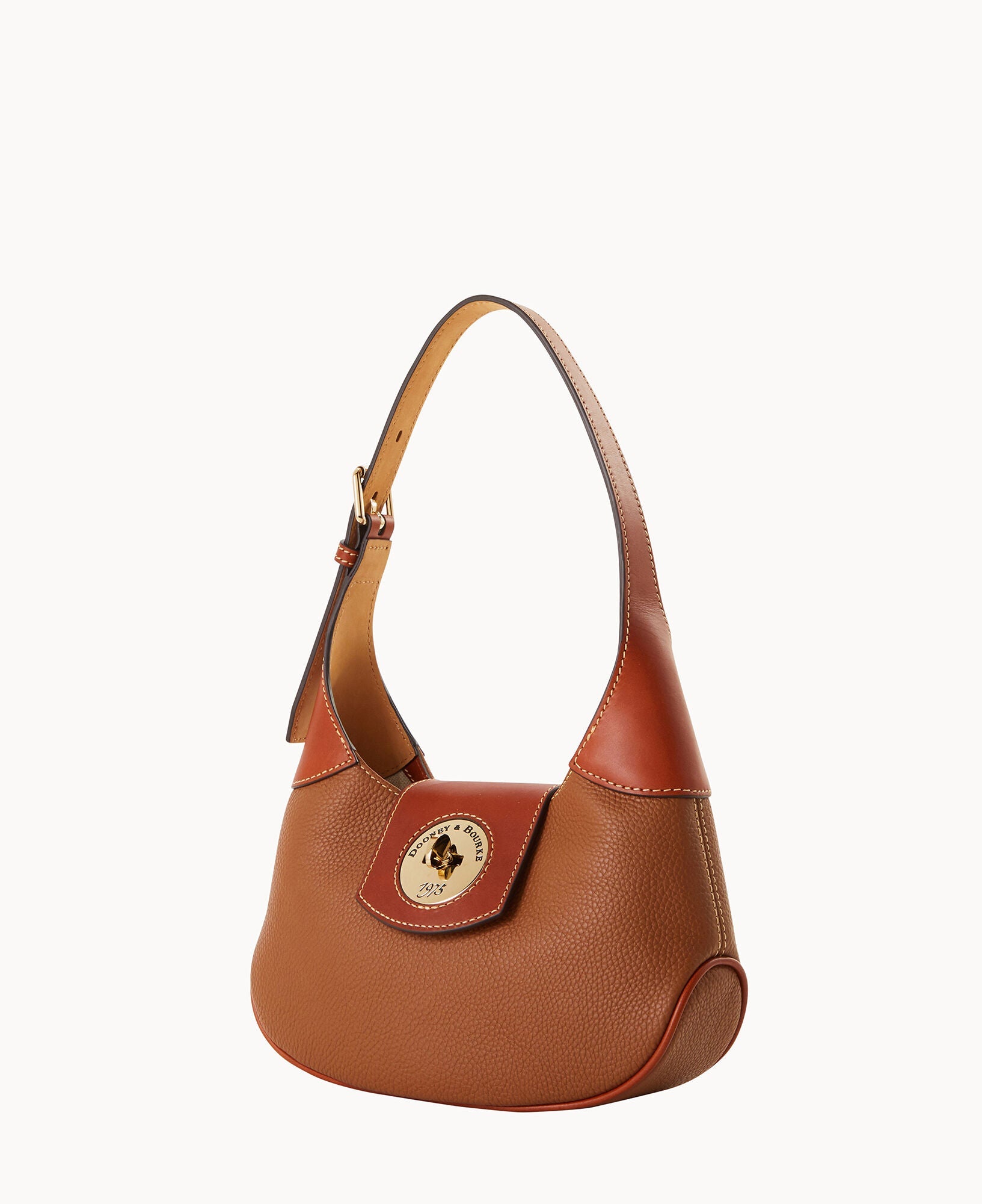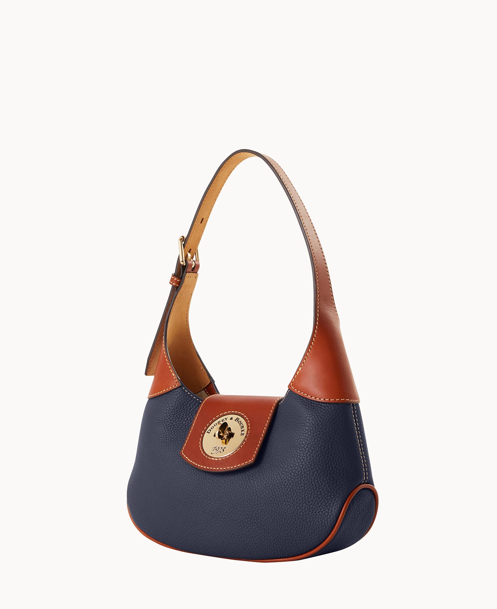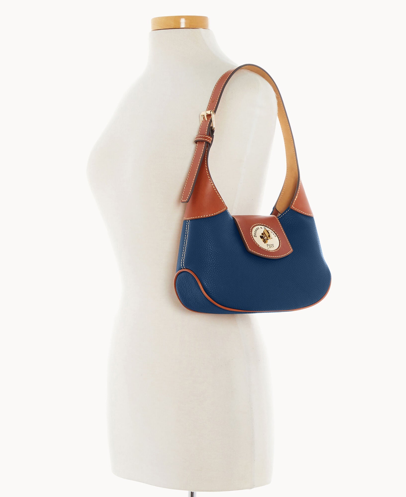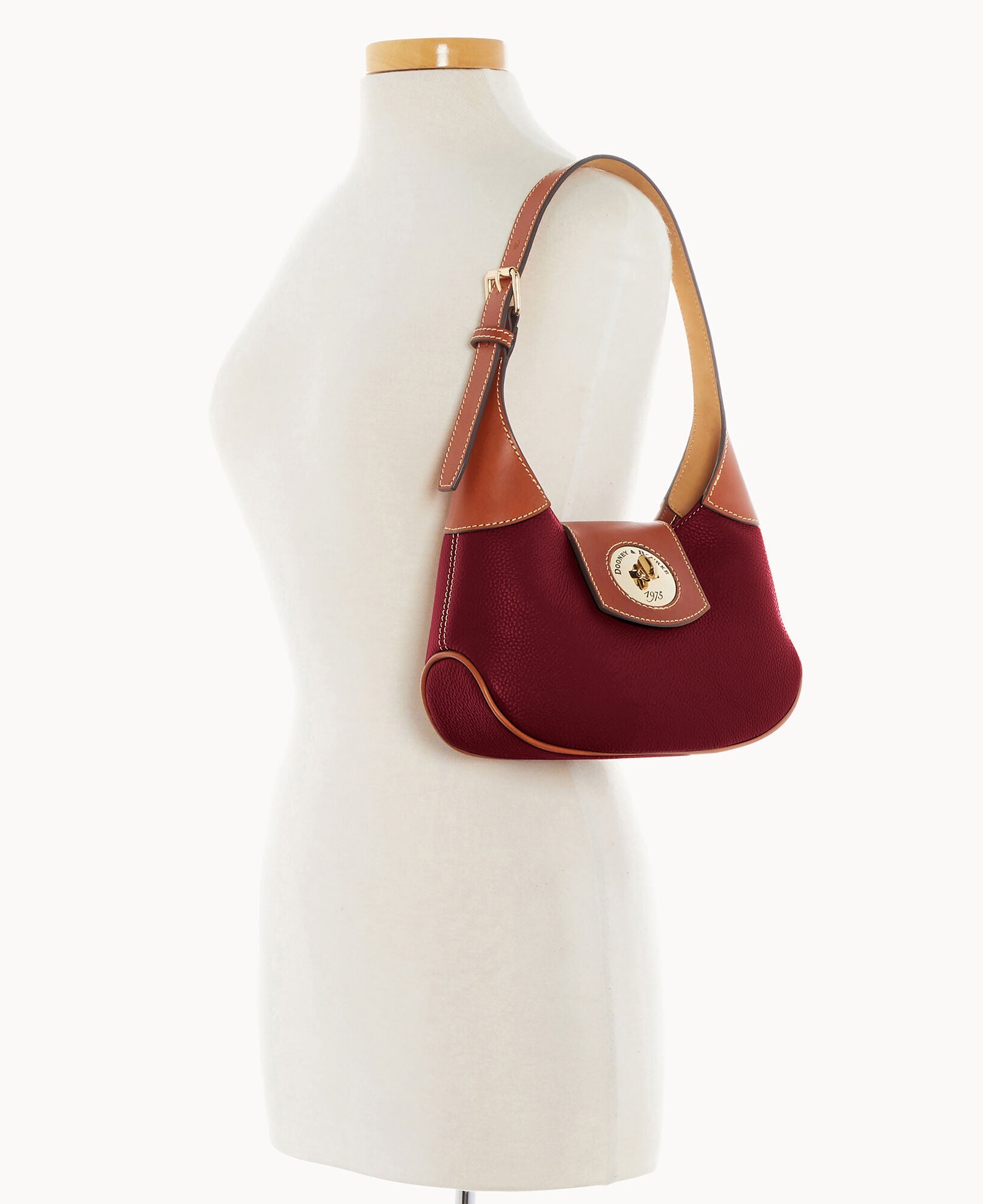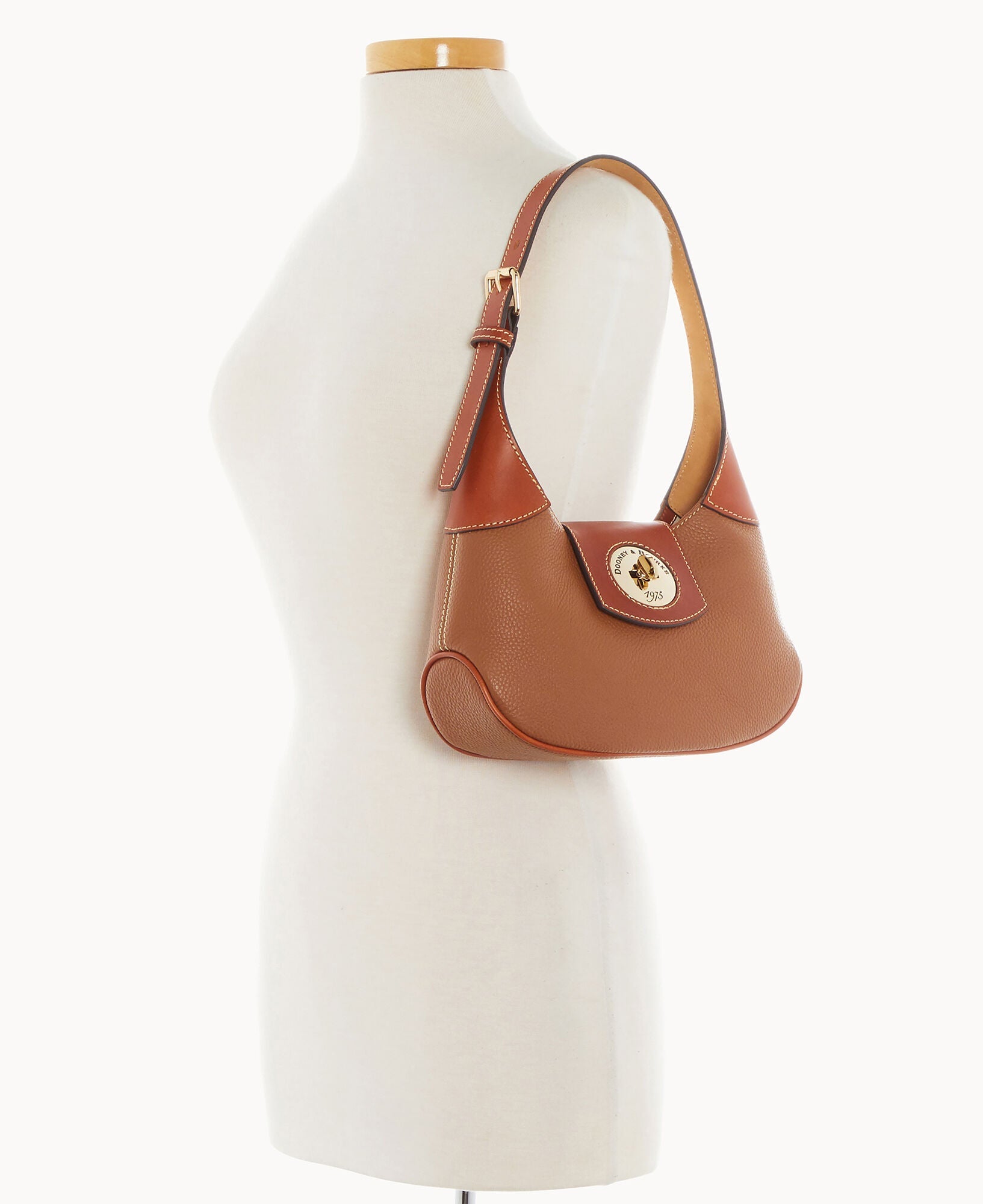 One inside zip pocket. One inside pocket. Inside key hook. Adjustable shoulder strap. Strap drop length 9". Lined. Turnlock closure.
