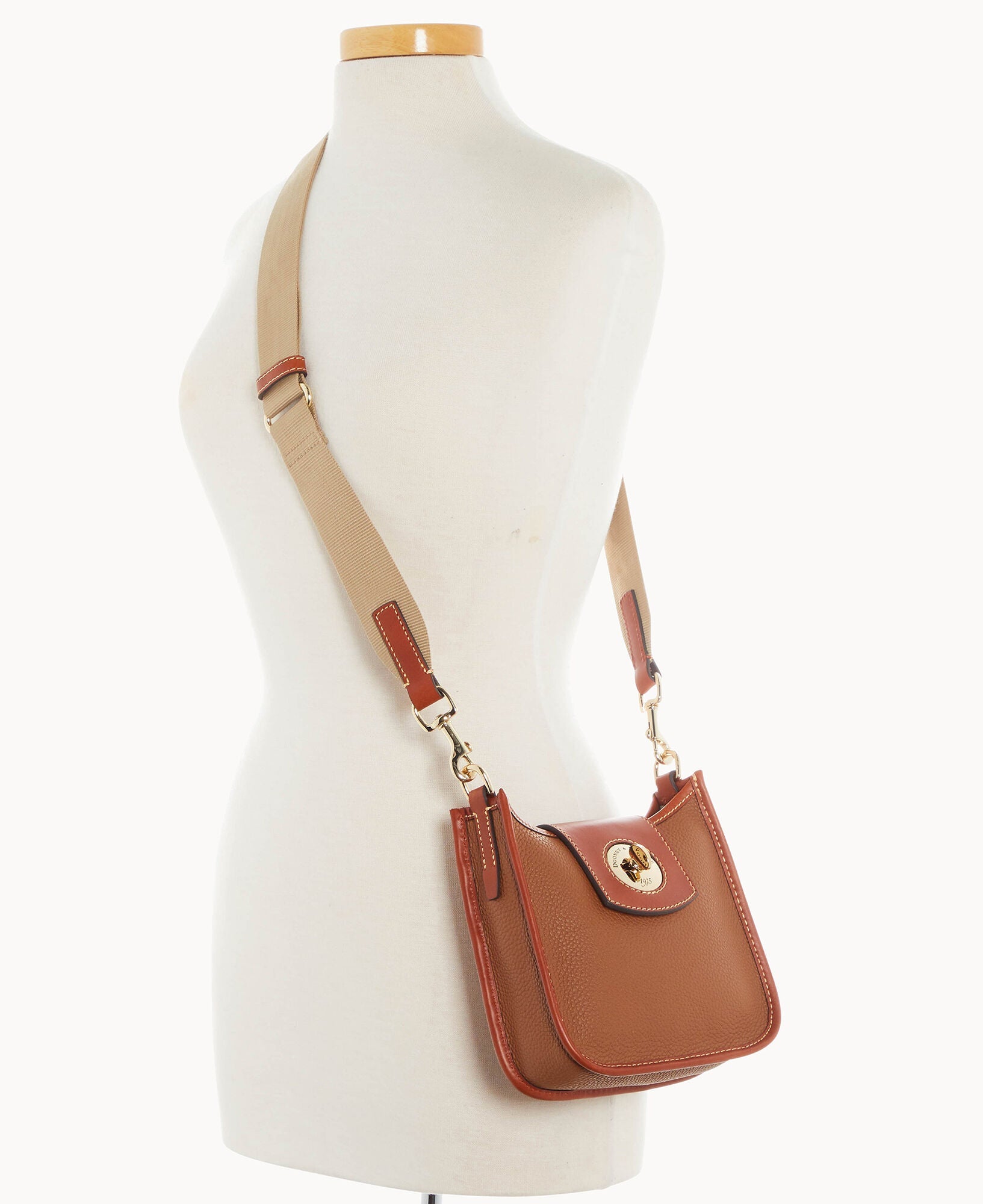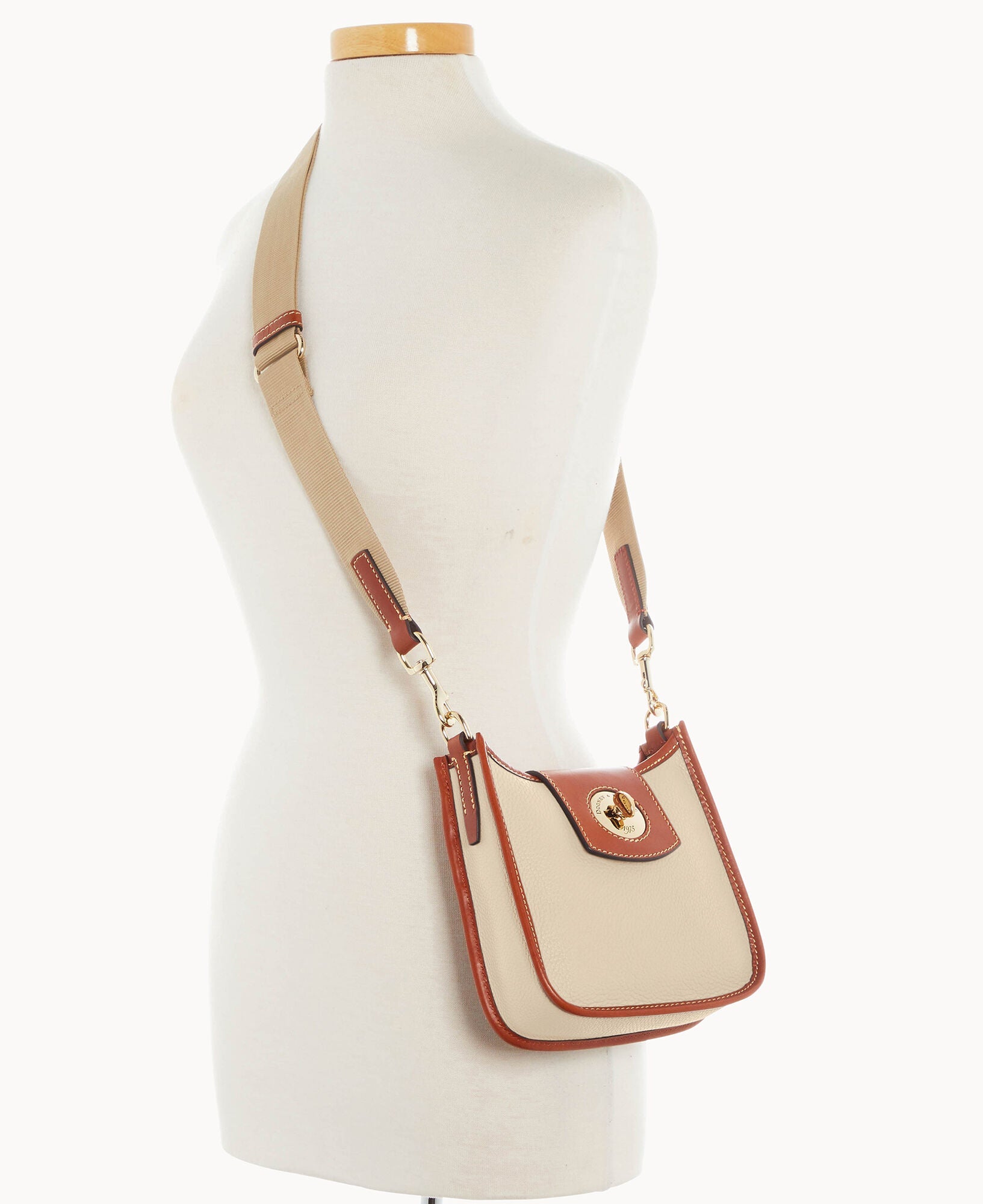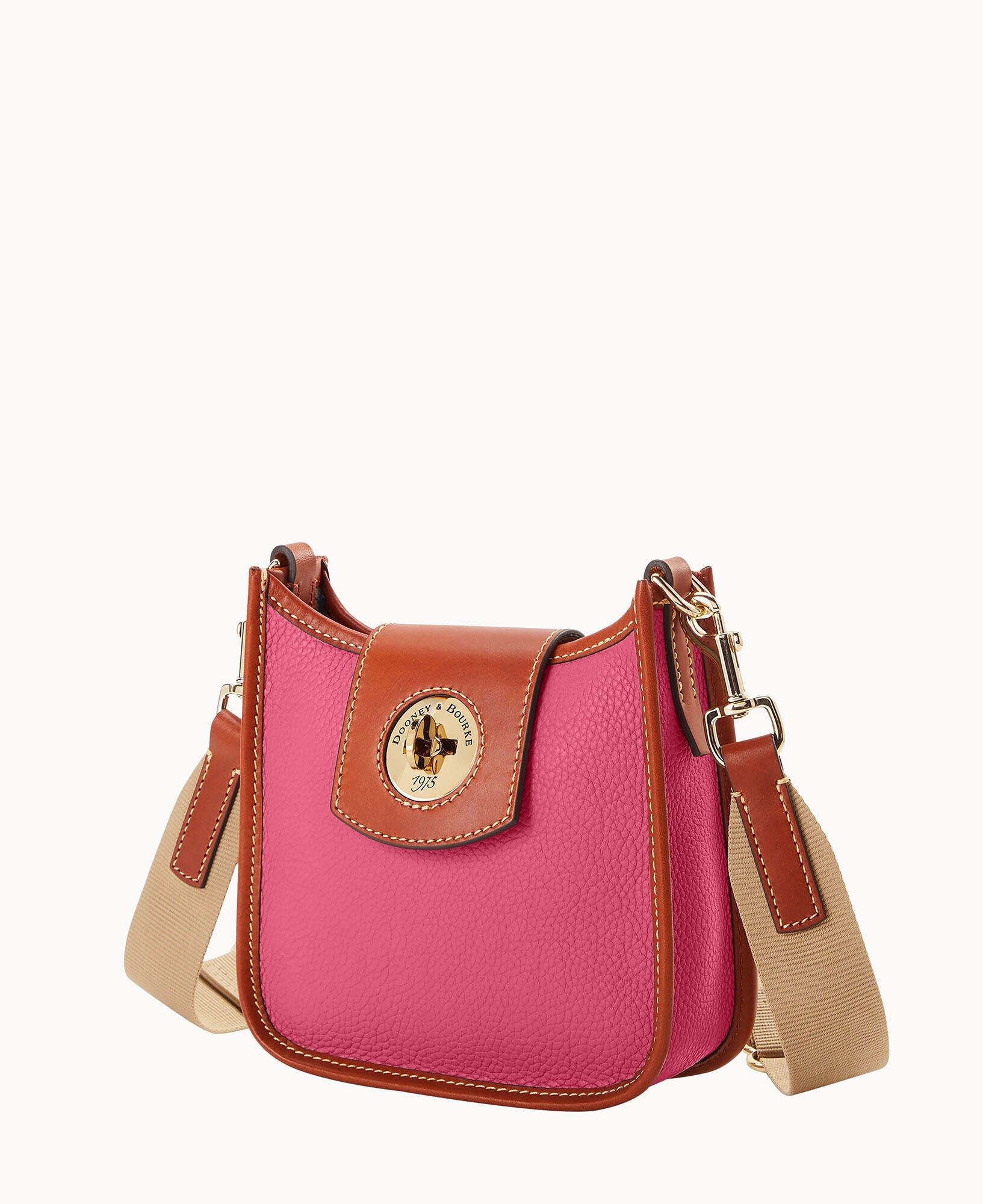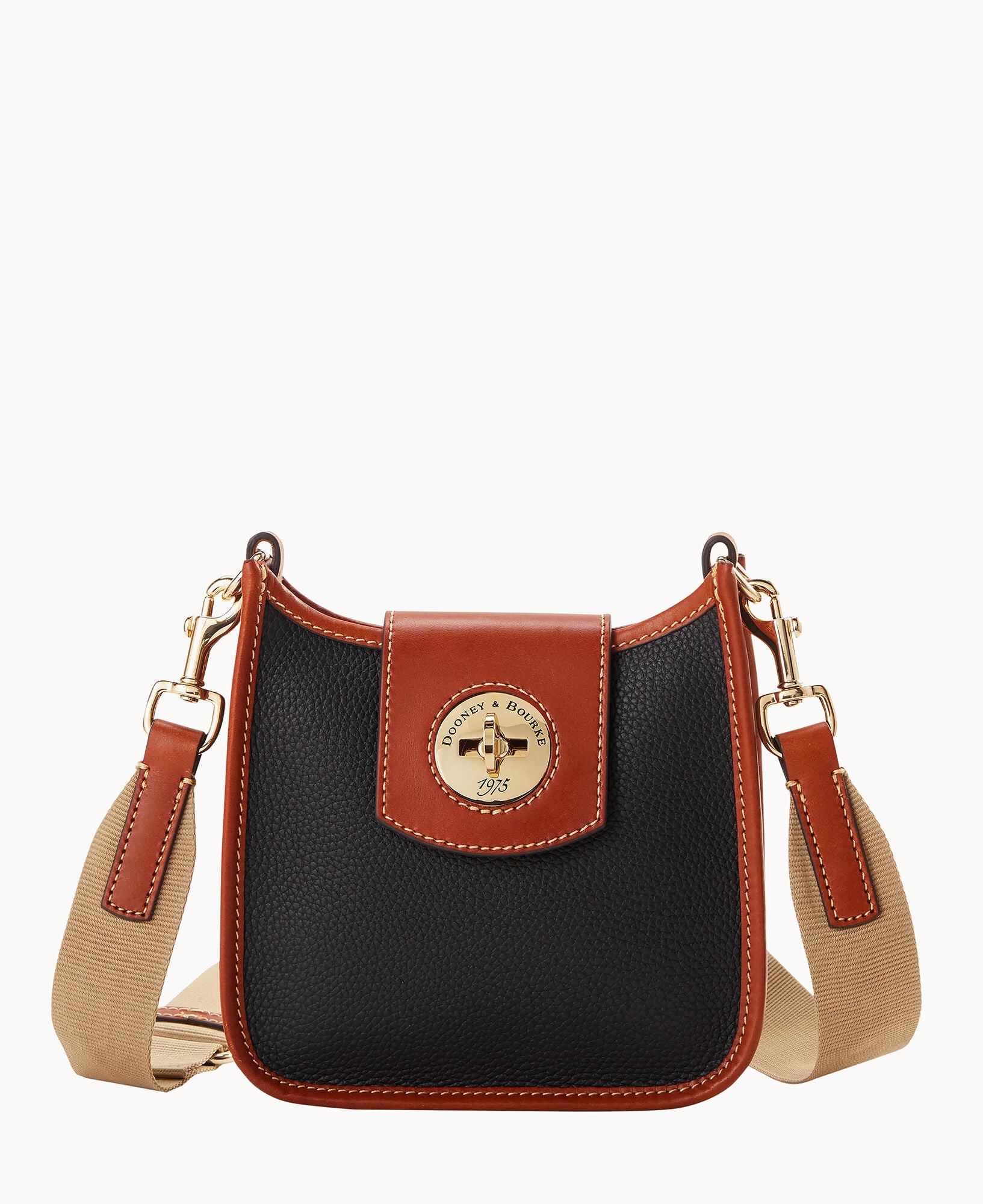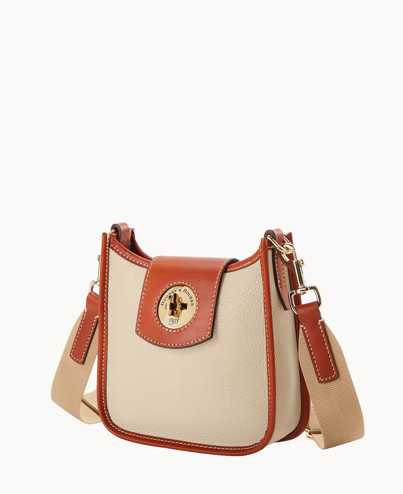 One outside slip pocket. One inside zip pocket. One inside slip pocket. Inside key hook. Adjustable strap. Removable strap. Lined. Turnlock closure.