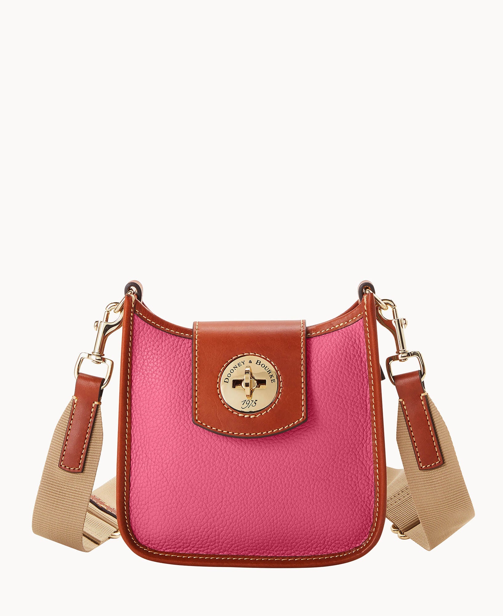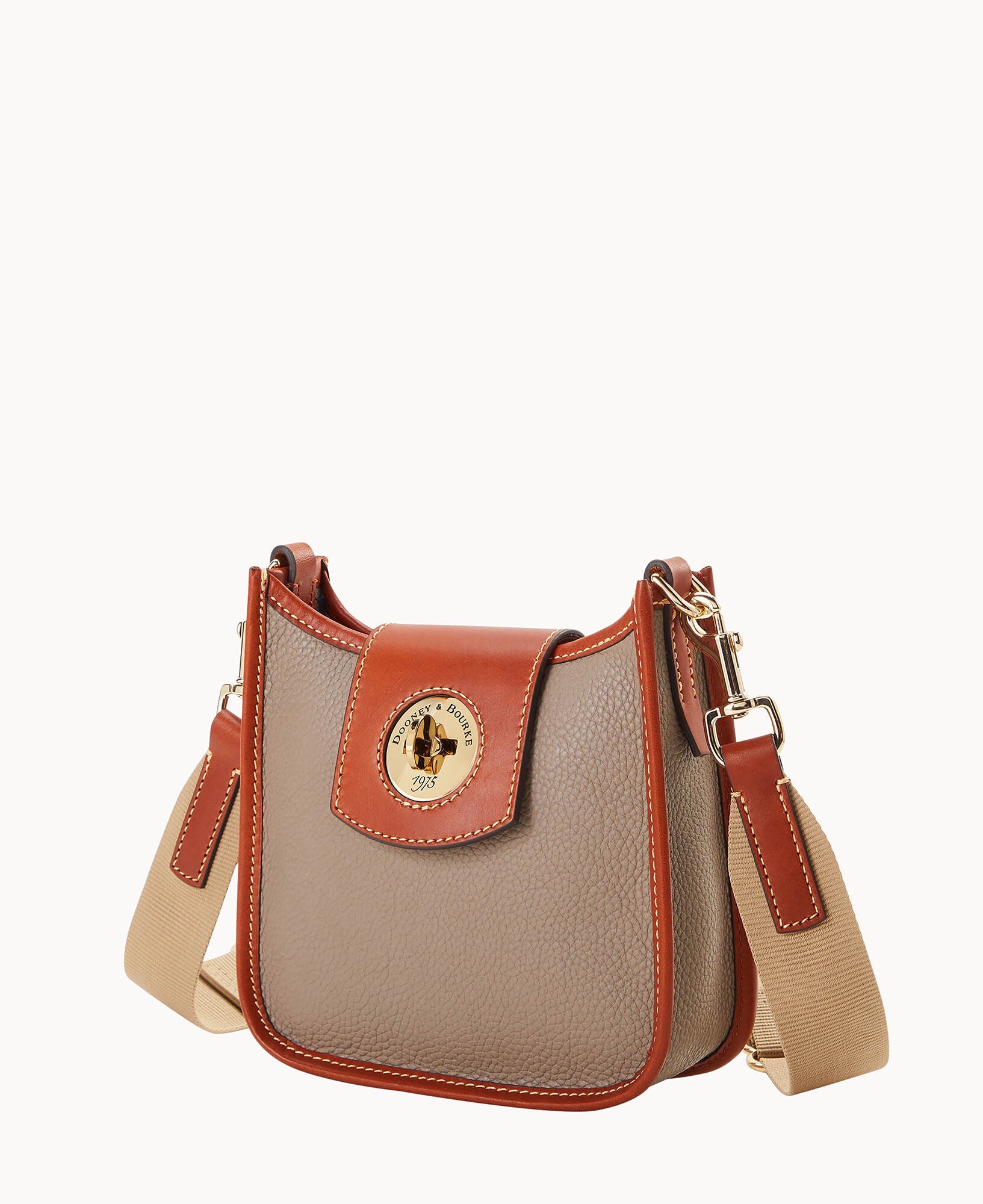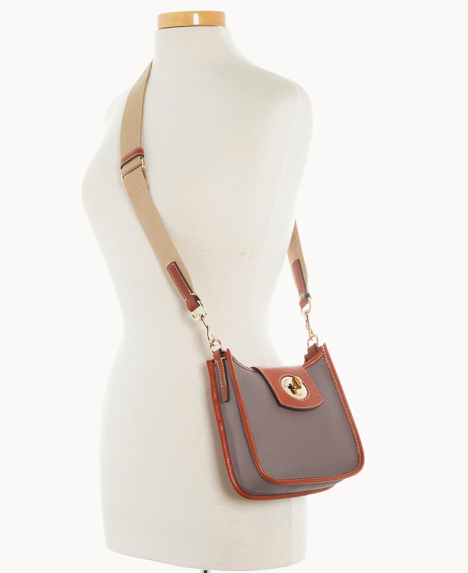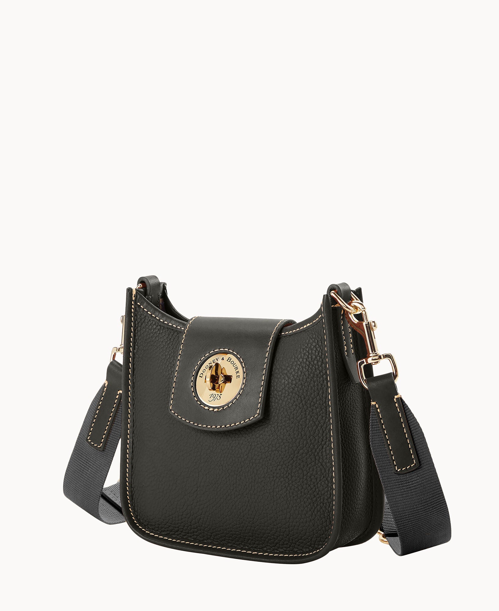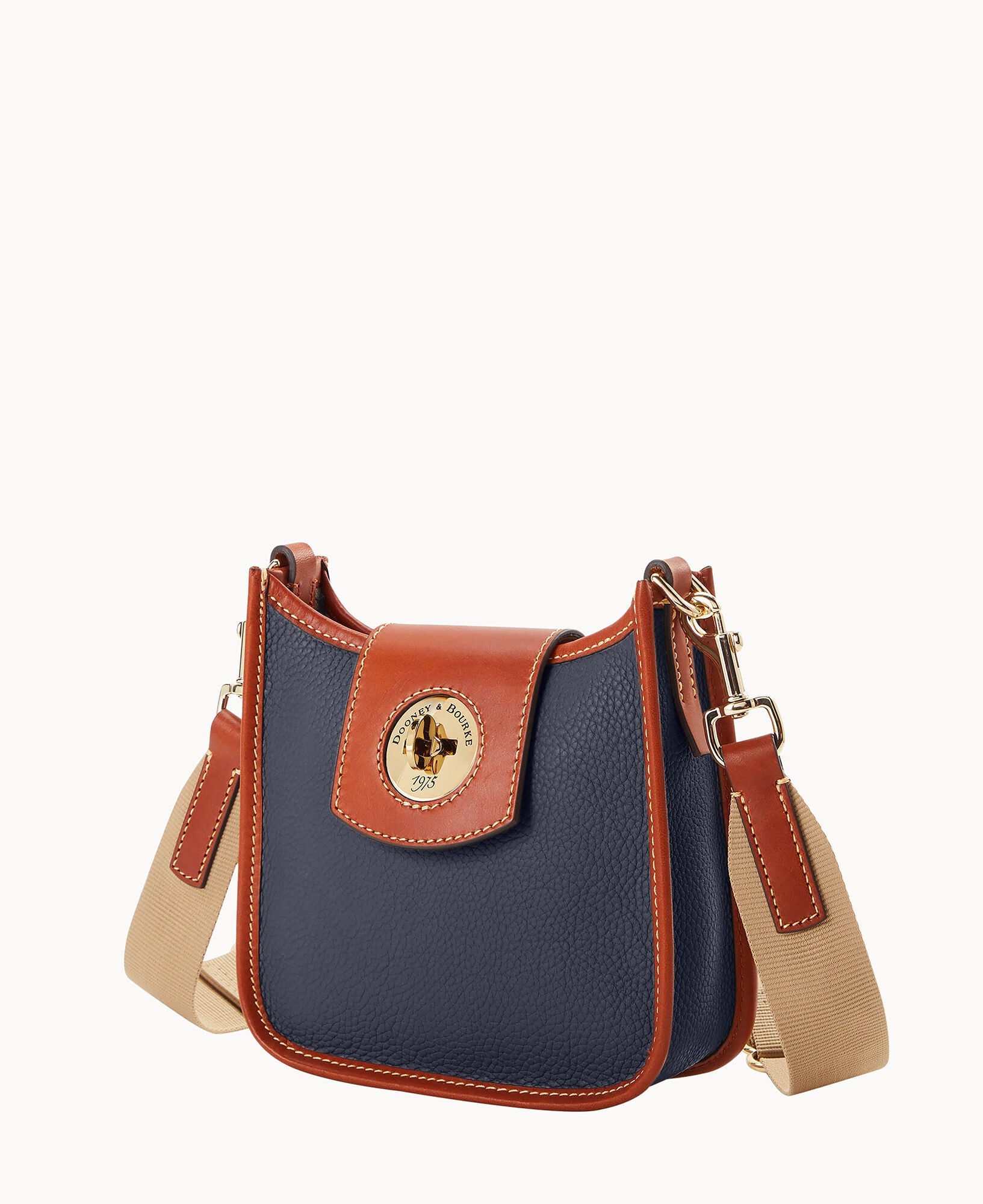One outside slip pocket. One inside zip pocket. One inside slip pocket. Inside key hook. Adjustable strap. Removable strap. Lined. Turnlock closure.