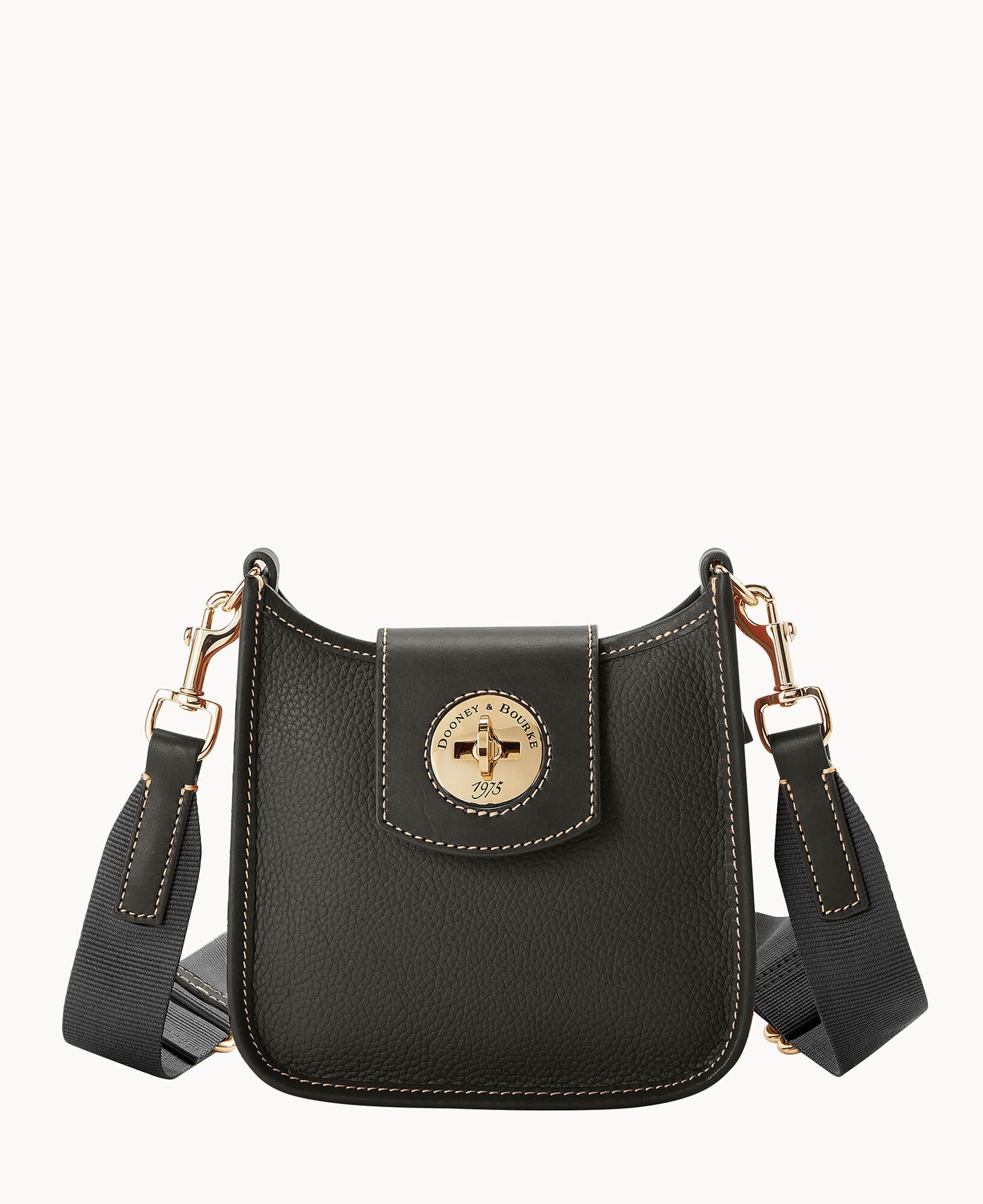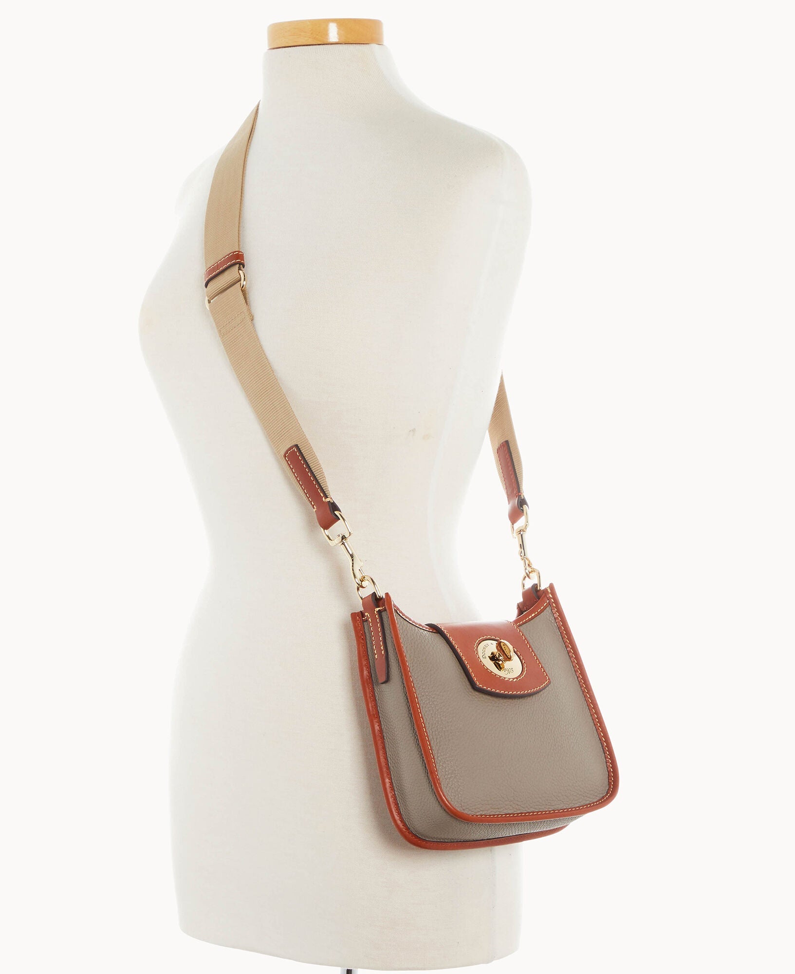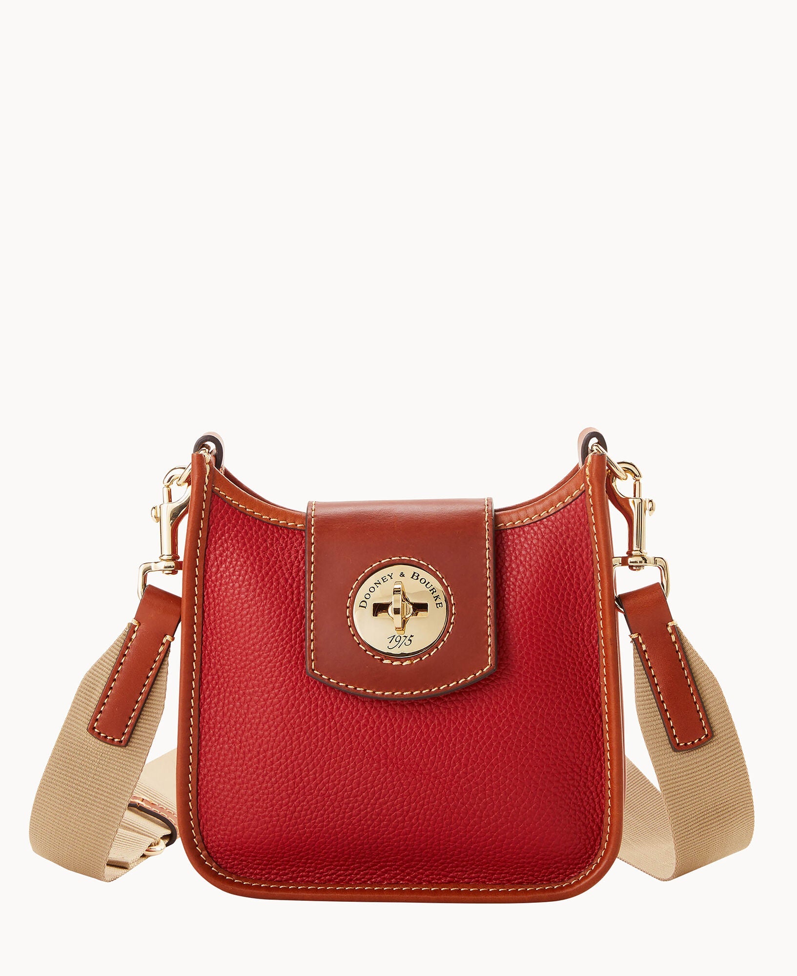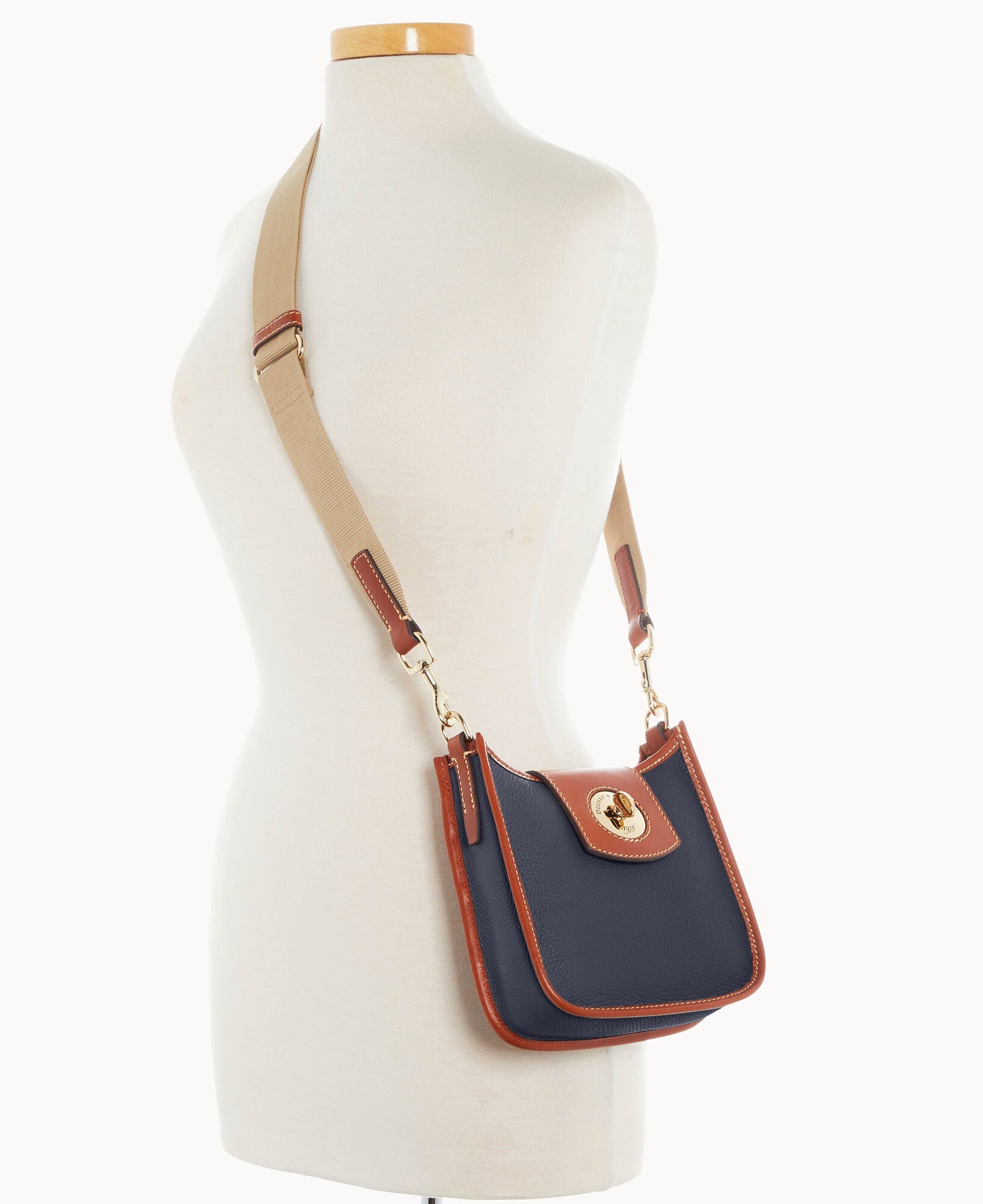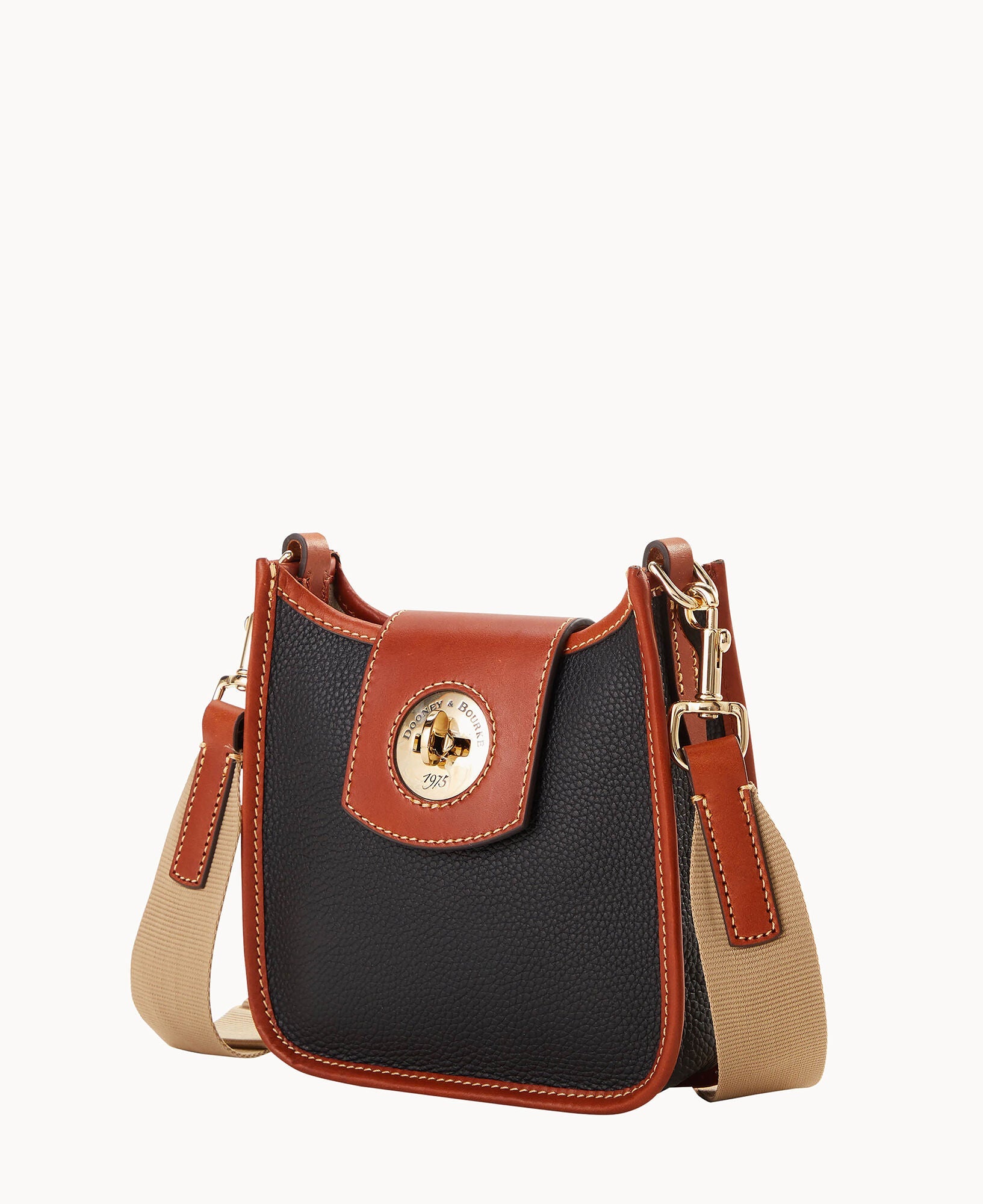 One outside slip pocket. One inside zip pocket. One inside slip pocket. Inside key hook. Adjustable strap. Removable strap. Lined. Turnlock closure.