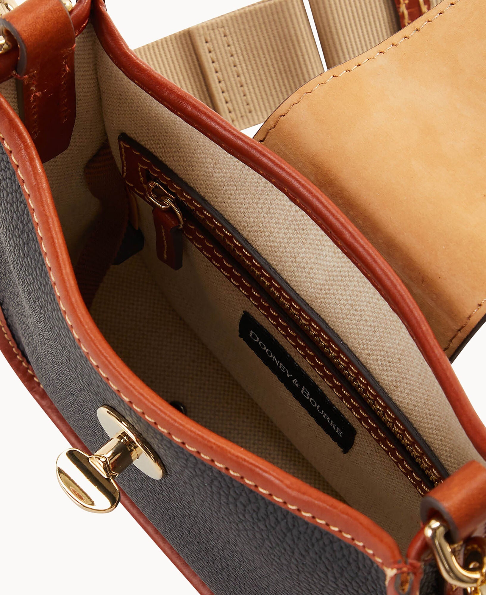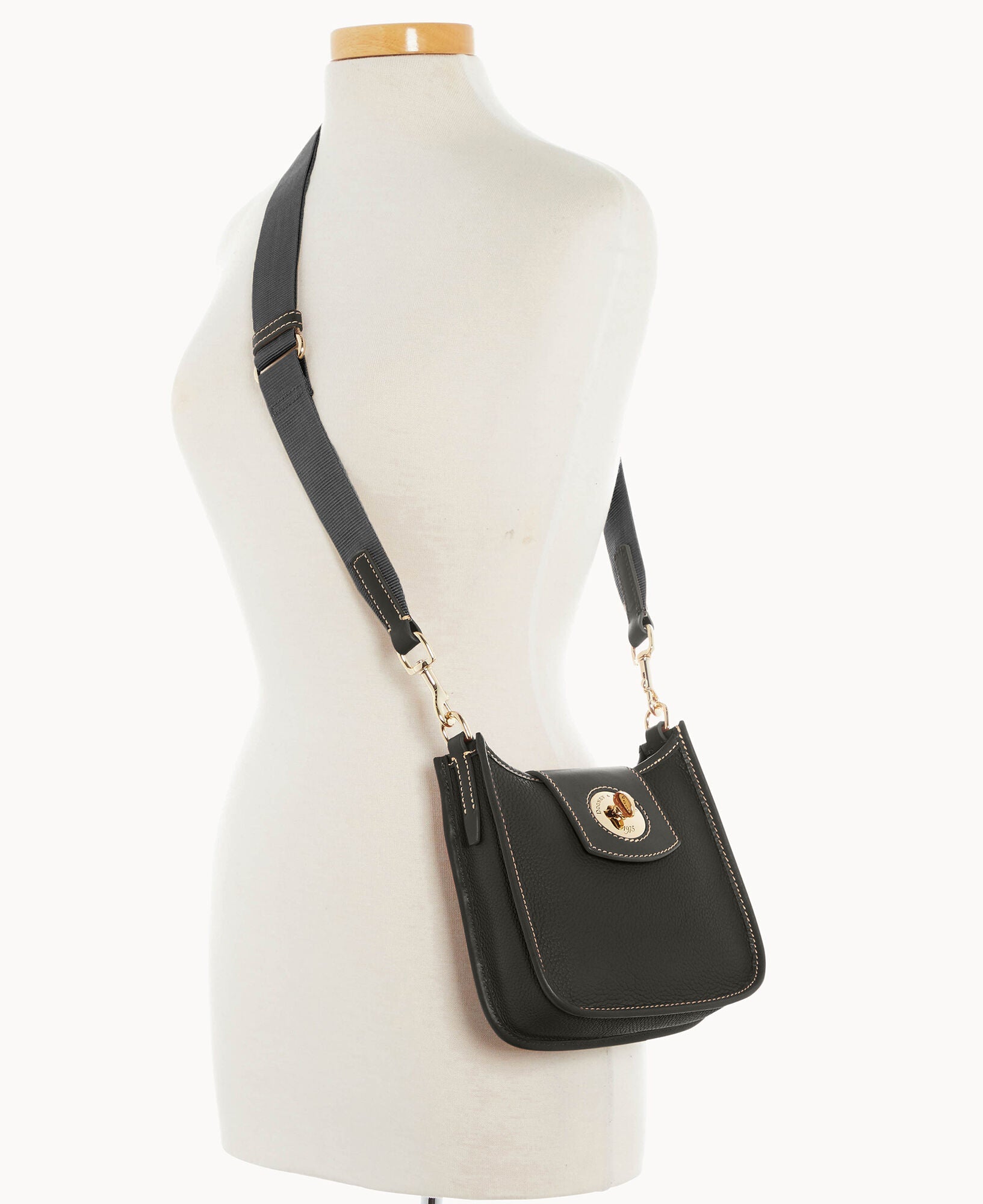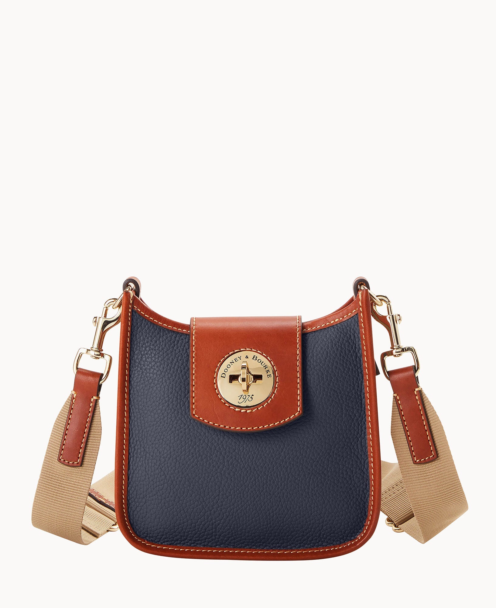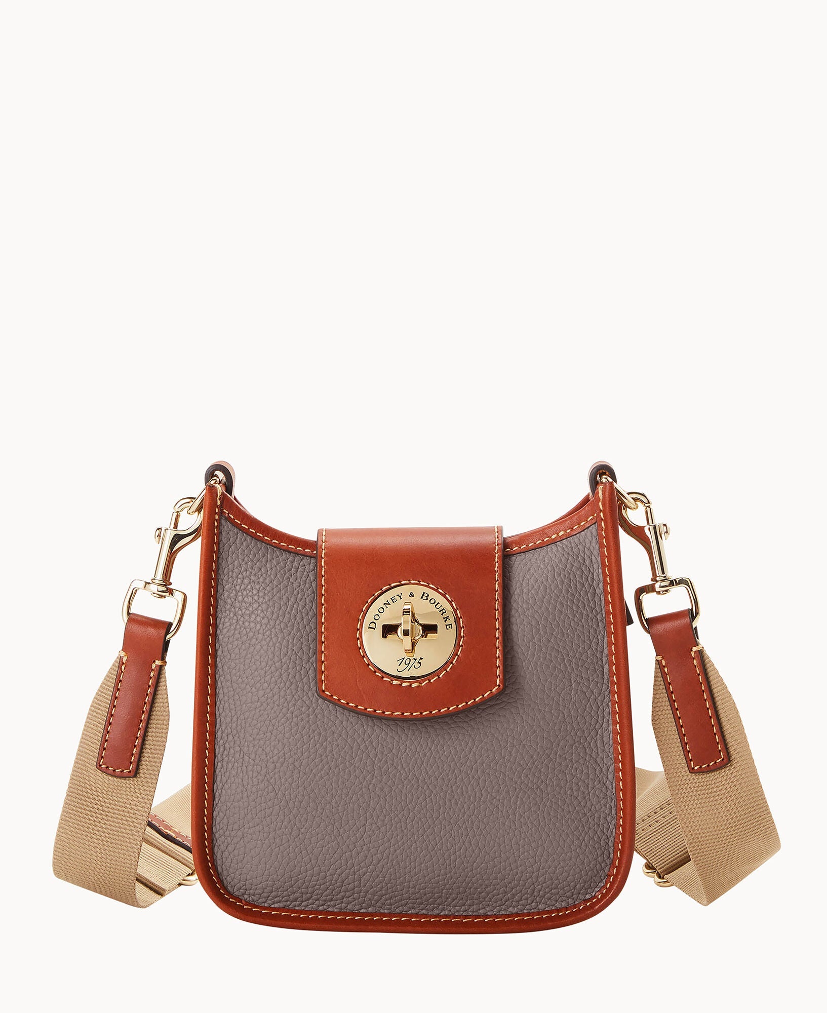 One outside slip pocket. One inside zip pocket. One inside slip pocket. Inside key hook. Adjustable strap. Removable strap. Lined. Turnlock closure.