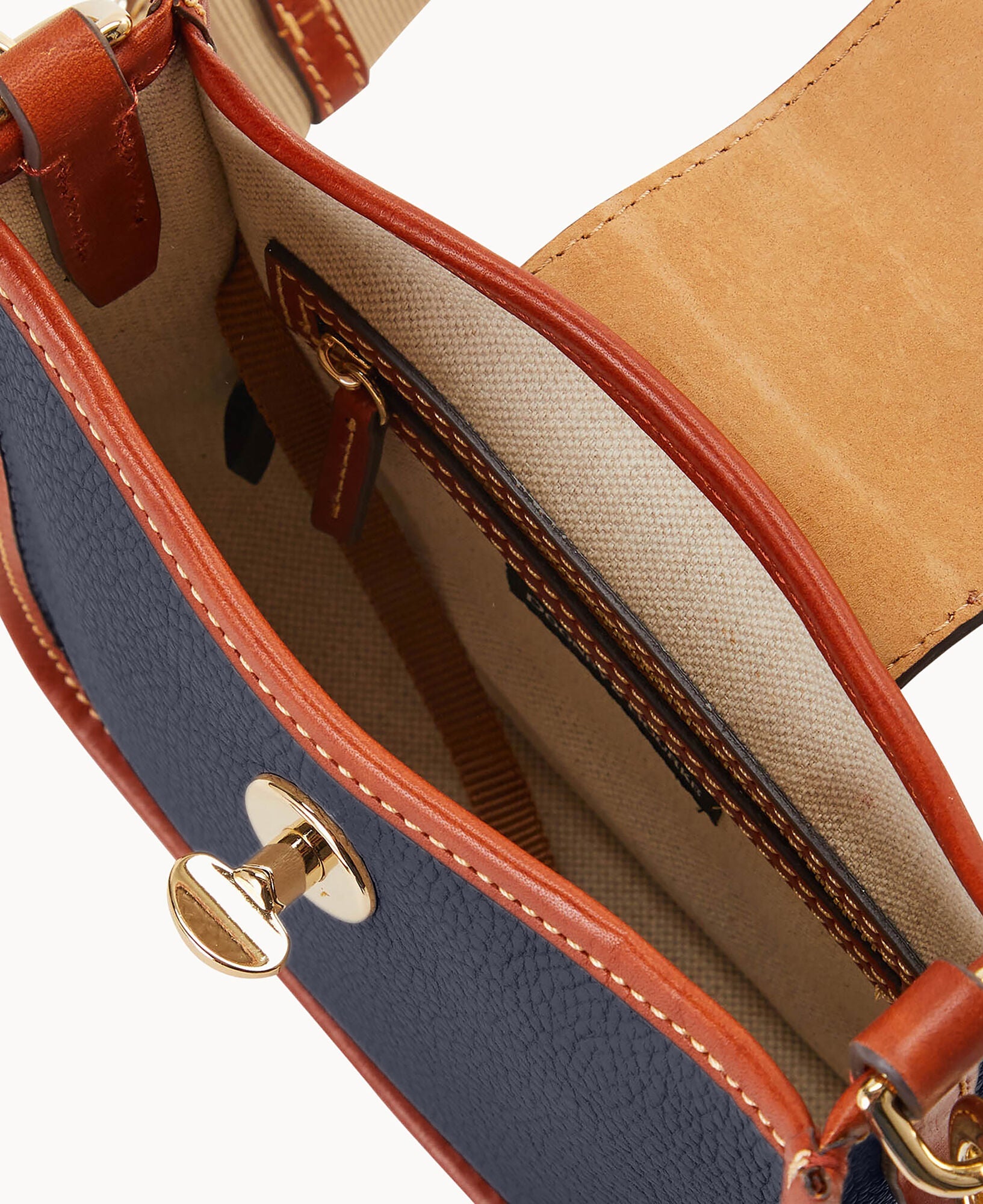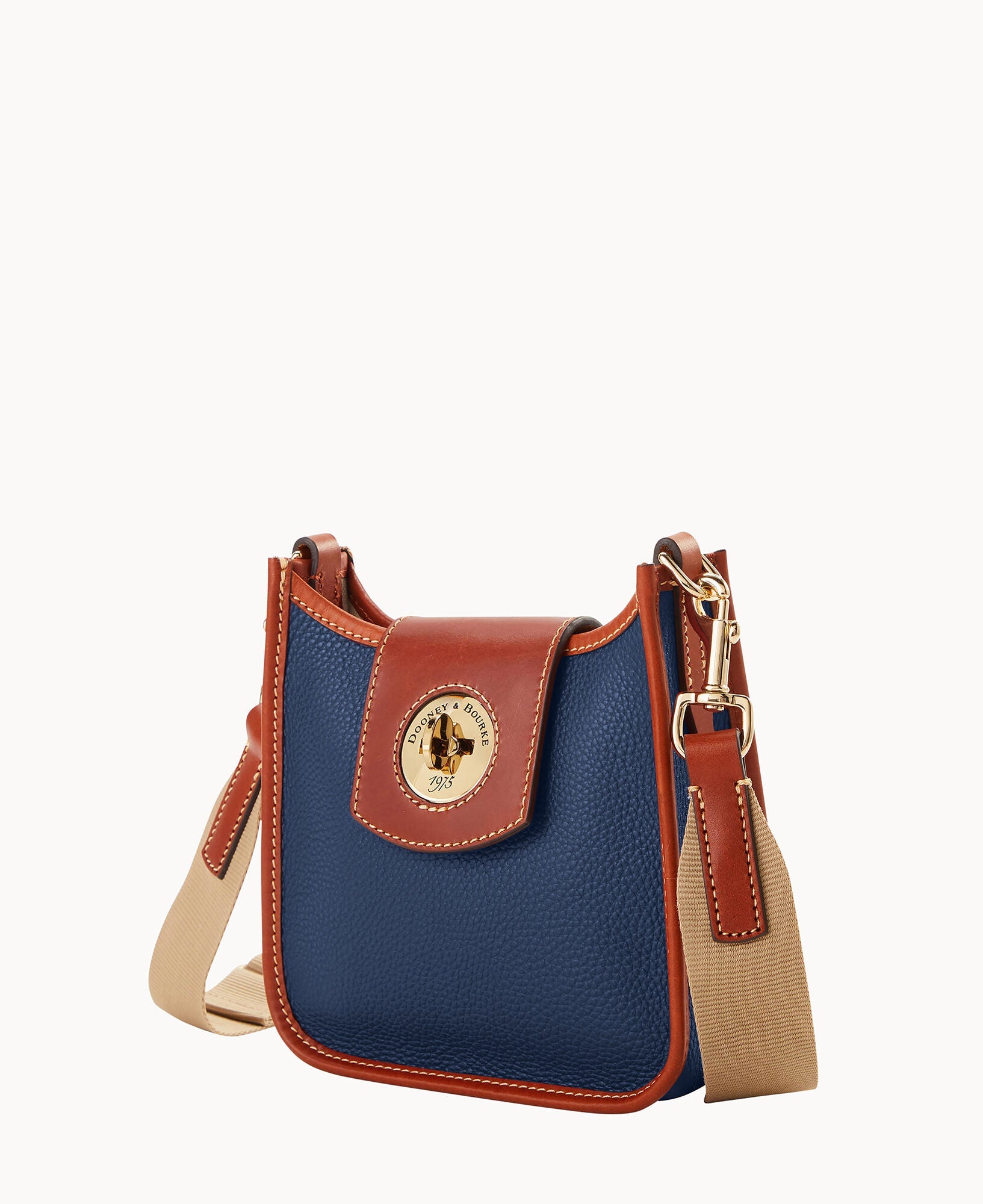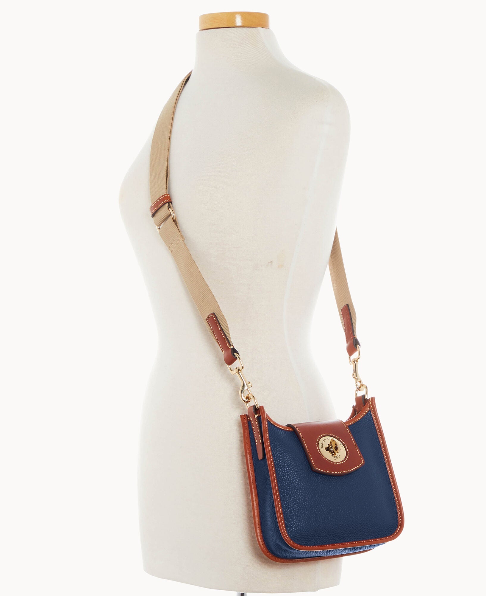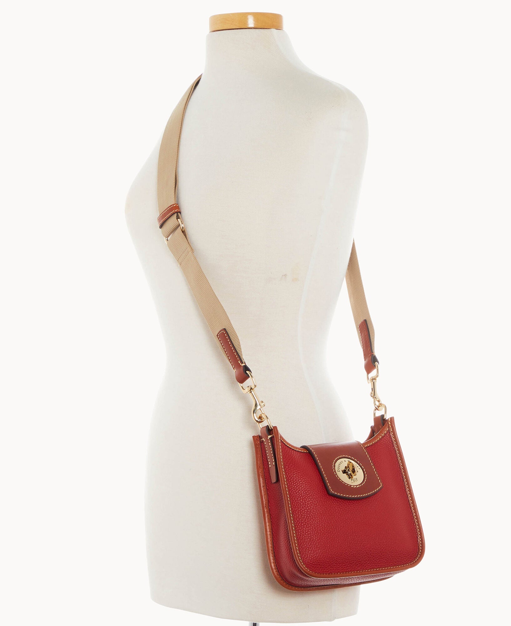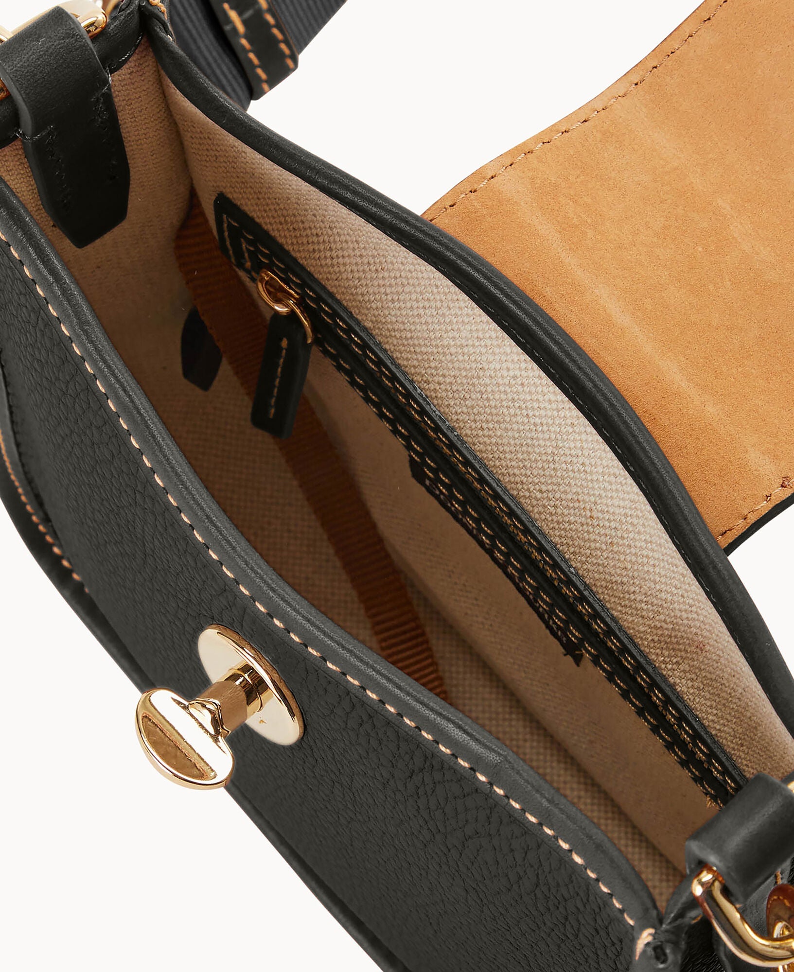 One outside slip pocket. One inside zip pocket. One inside slip pocket. Inside key hook. Adjustable strap. Removable strap. Lined. Turnlock closure.