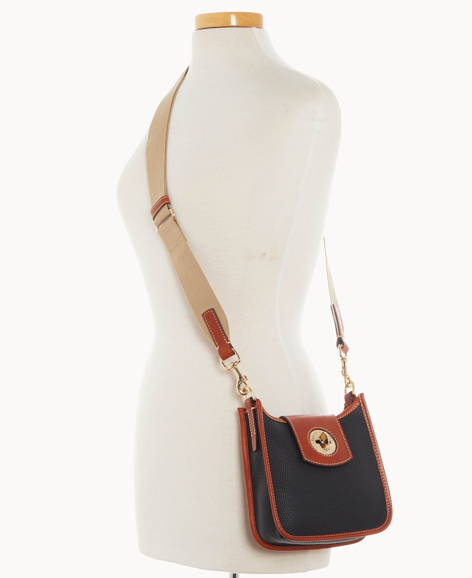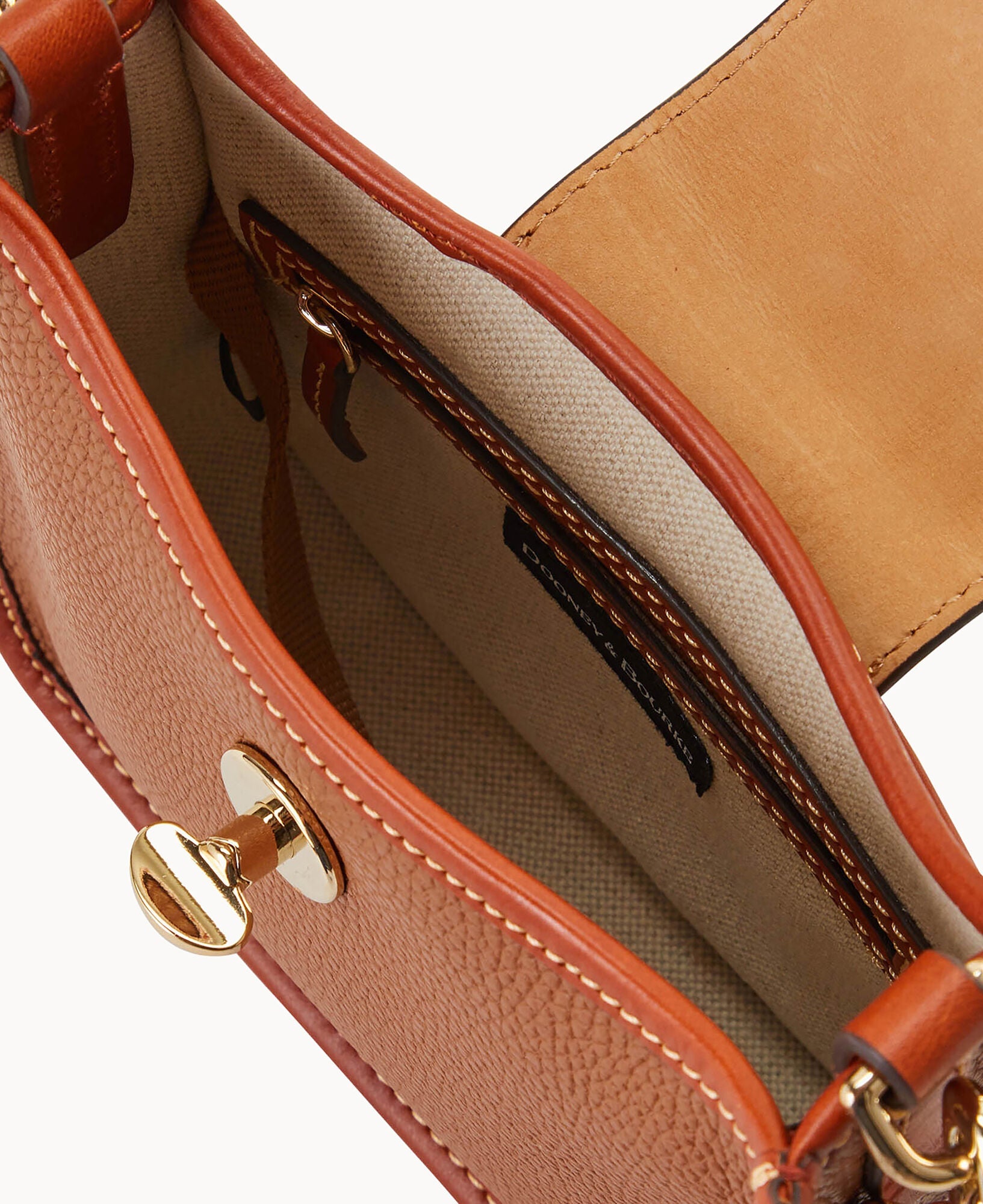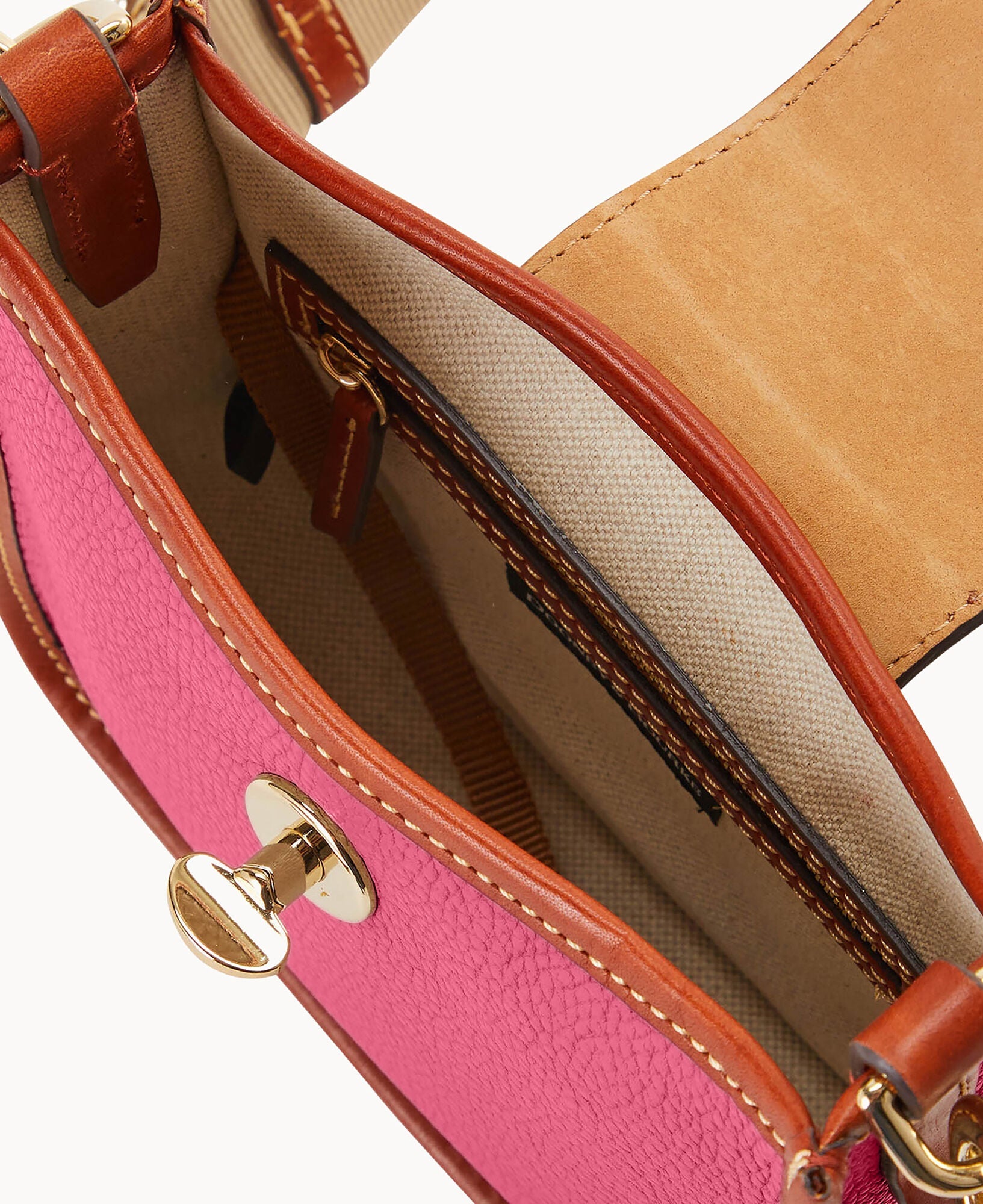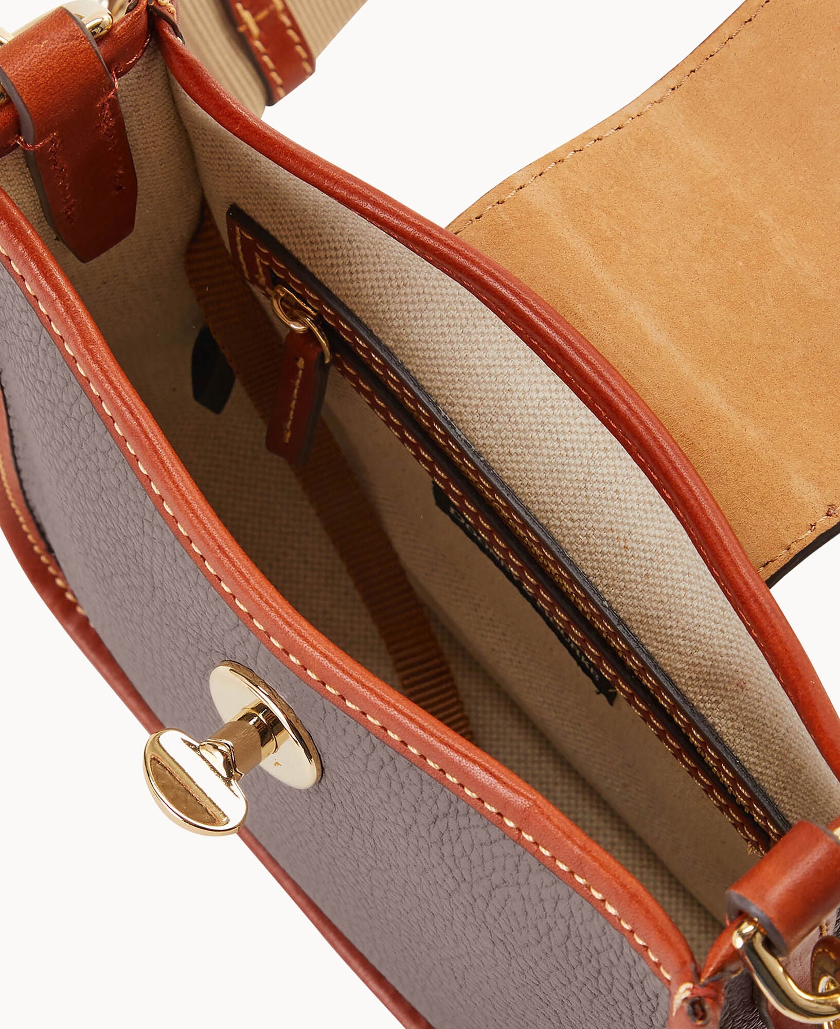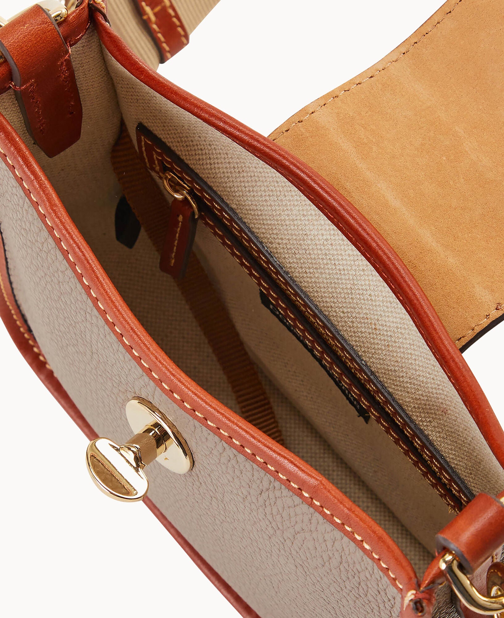 One outside slip pocket. One inside zip pocket. One inside slip pocket. Inside key hook. Adjustable strap. Removable strap. Lined. Turnlock closure.