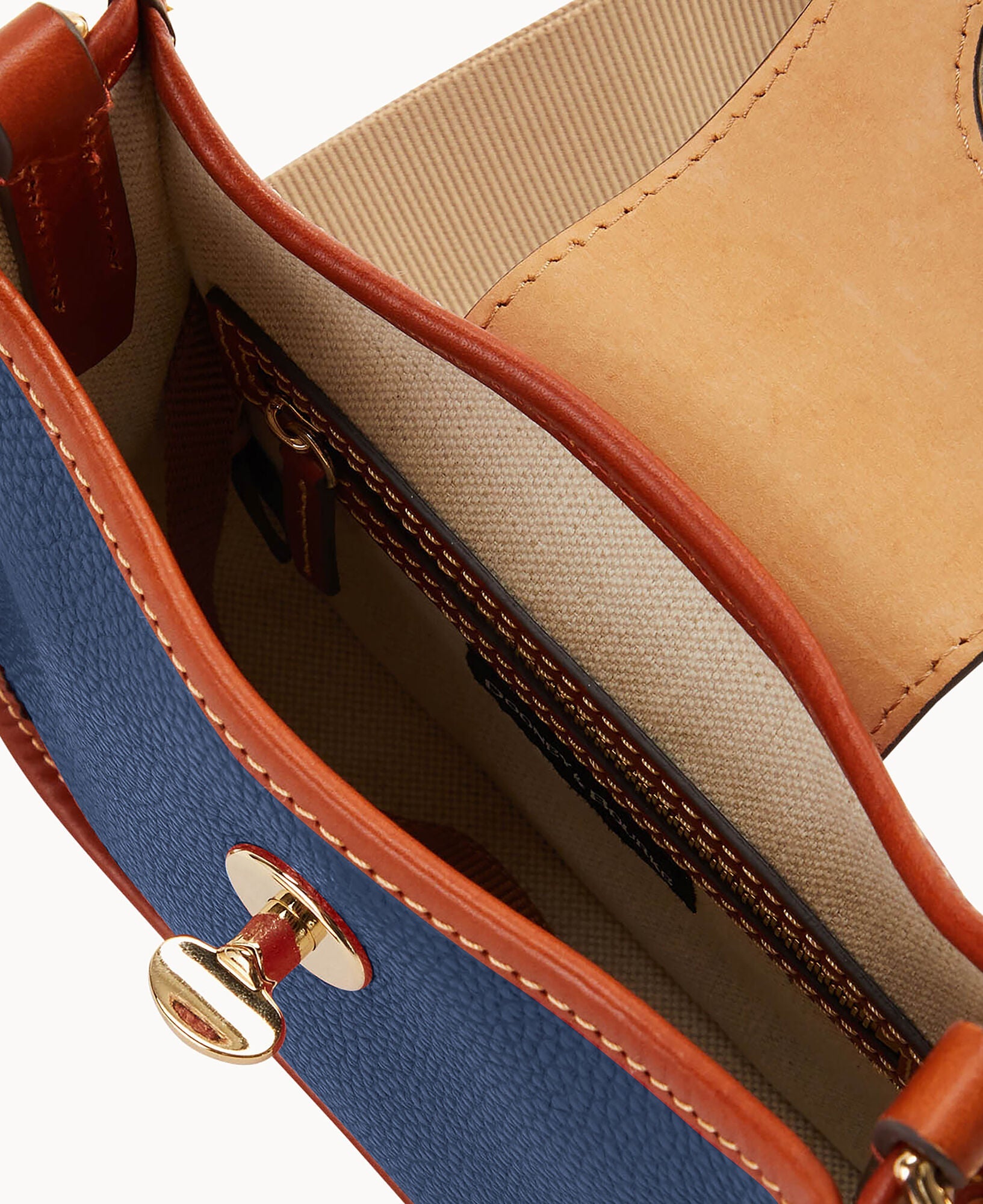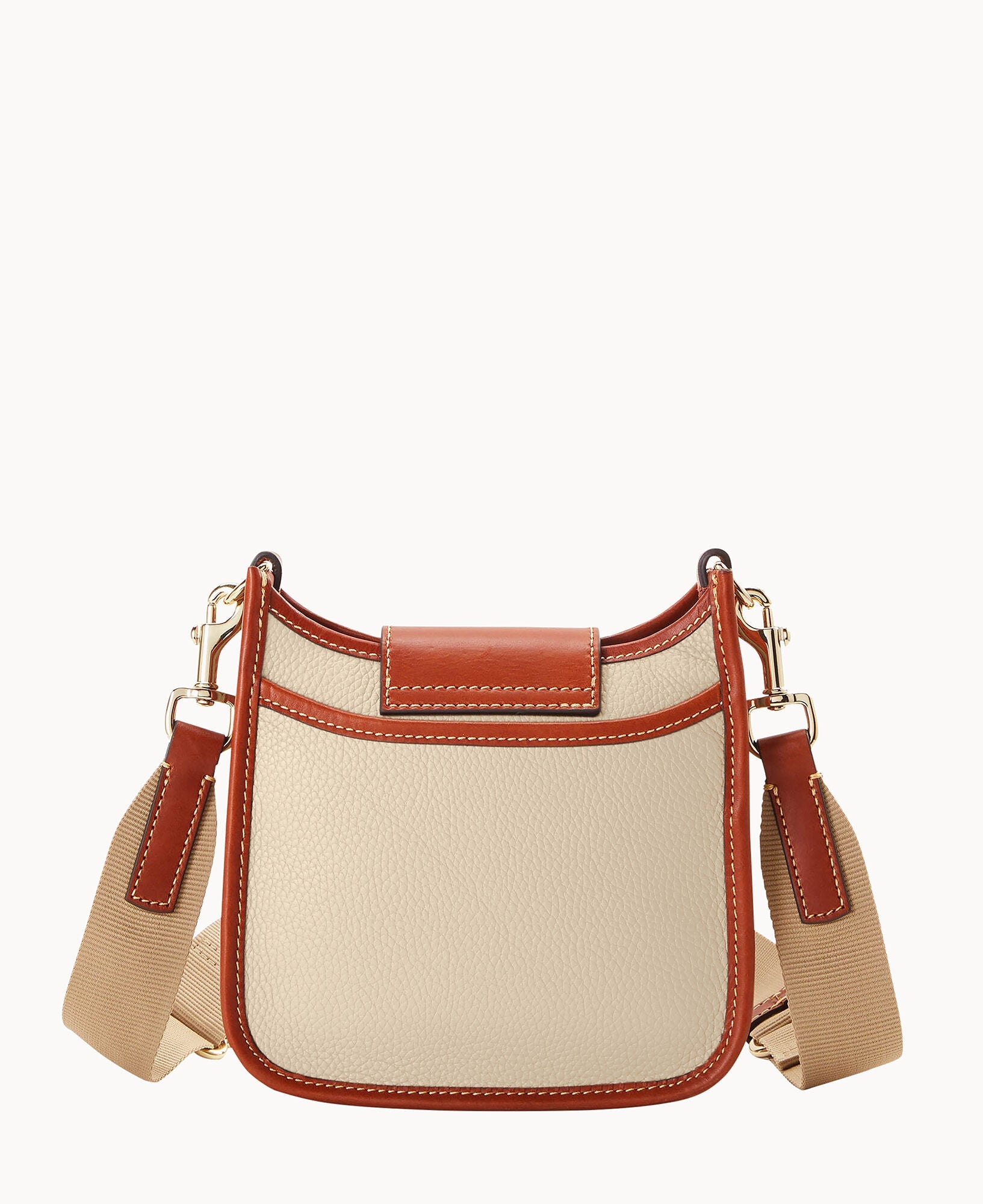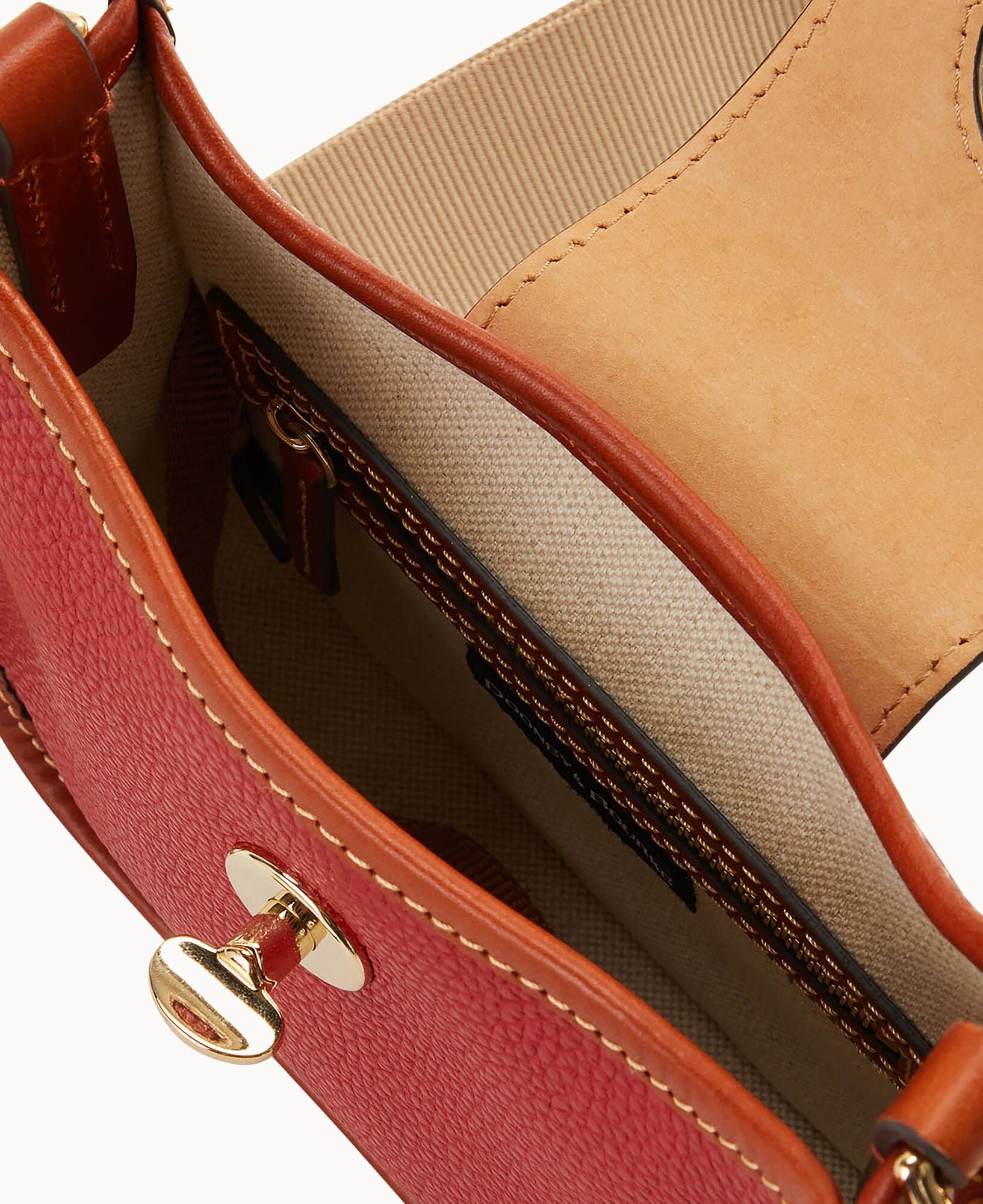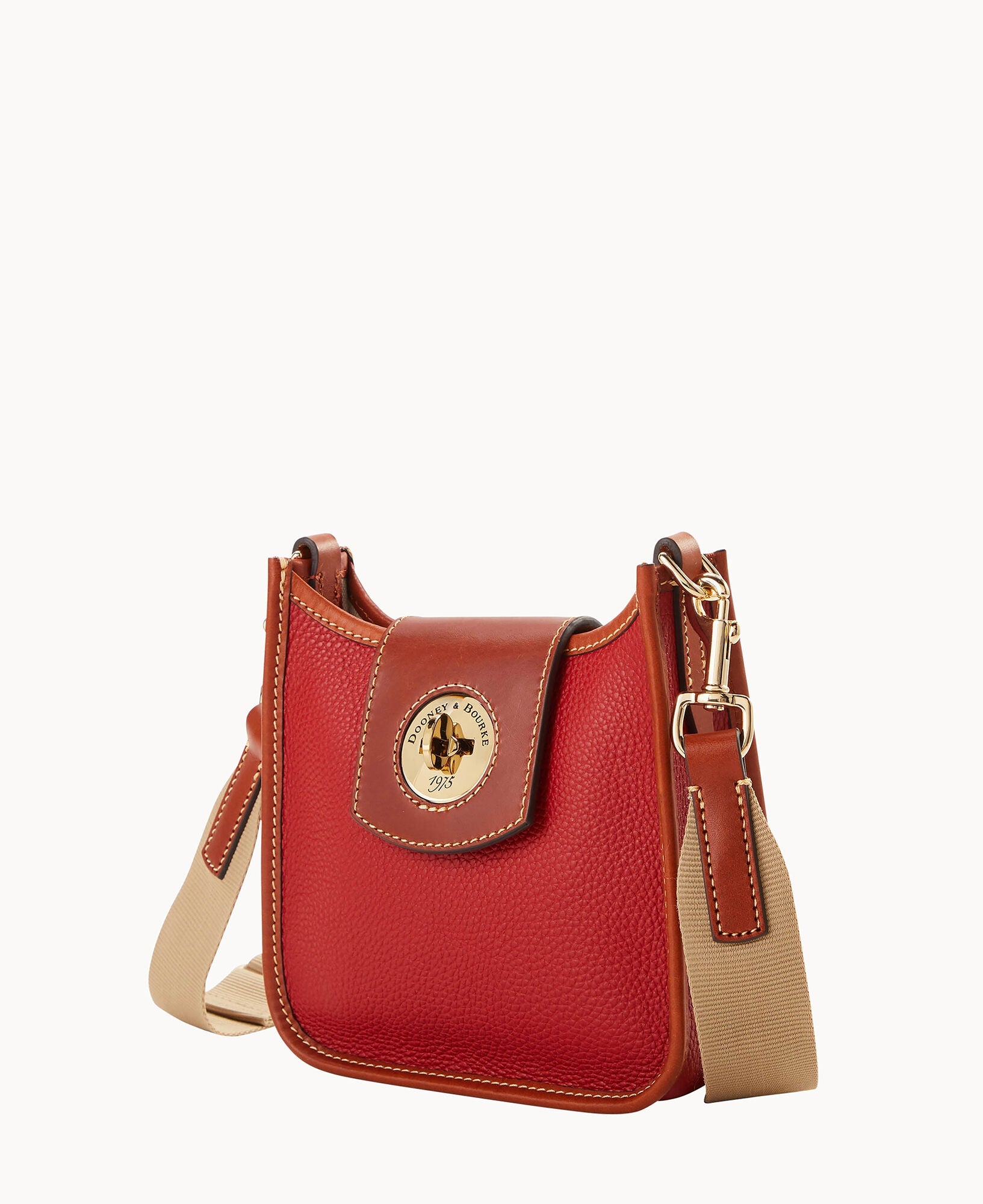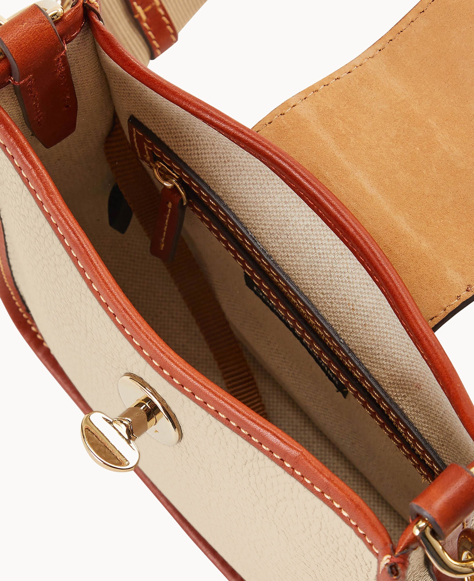 One outside slip pocket. One inside zip pocket. One inside slip pocket. Inside key hook. Adjustable strap. Removable strap. Lined. Turnlock closure.