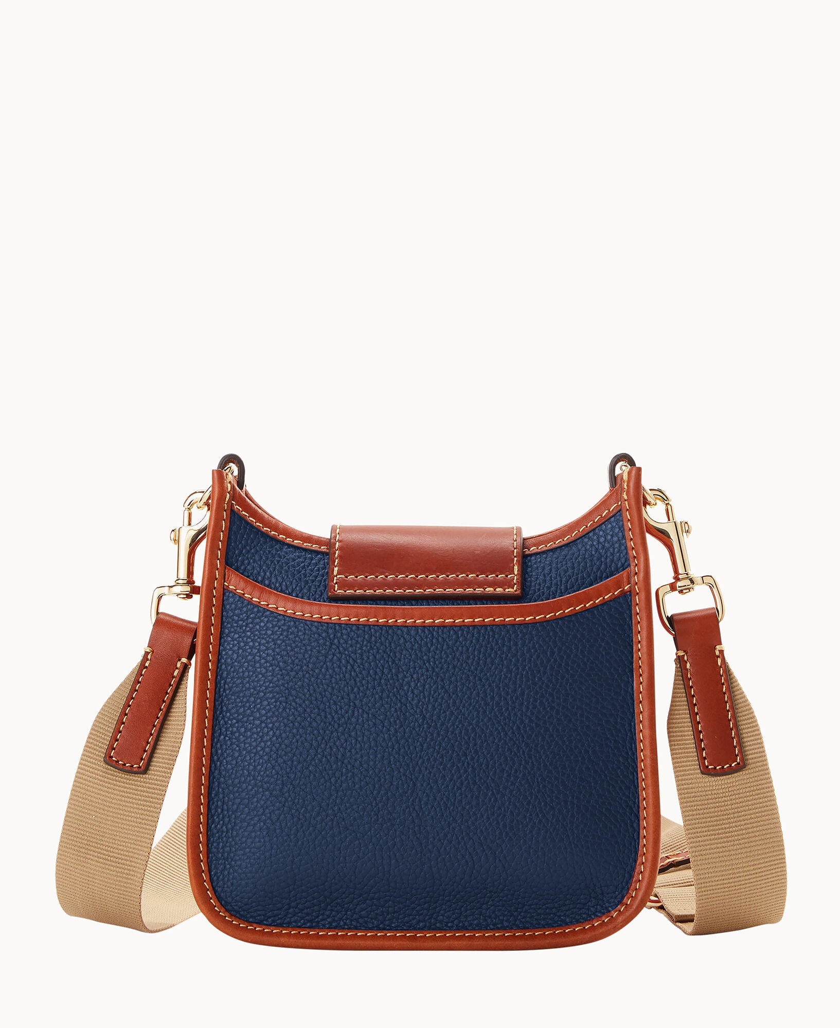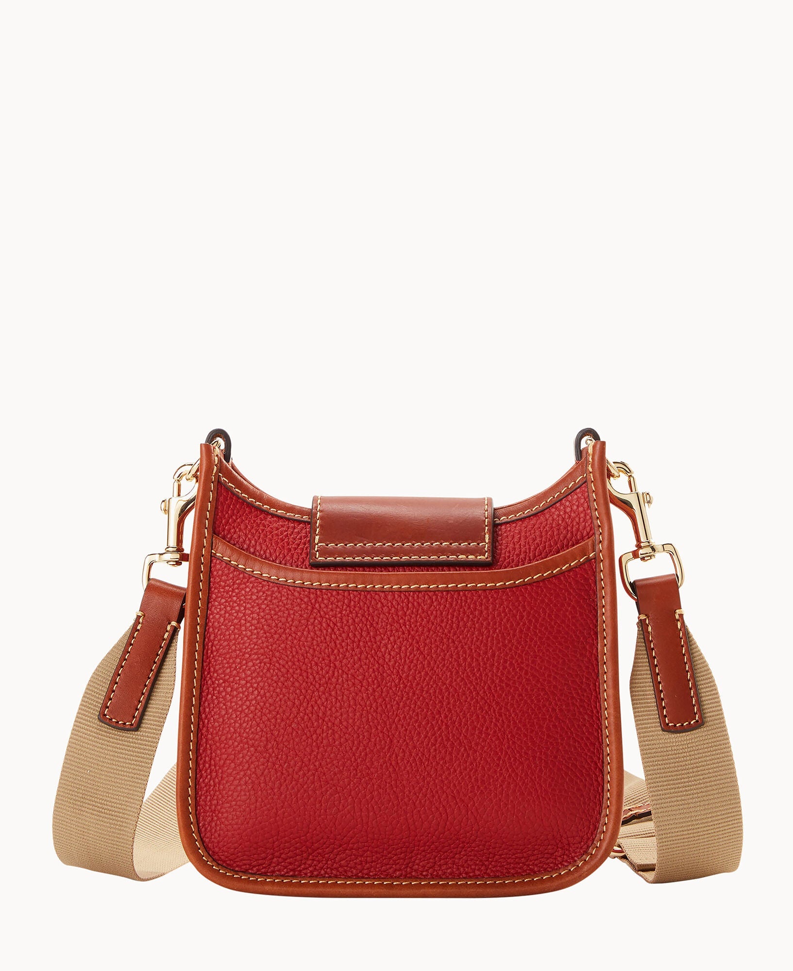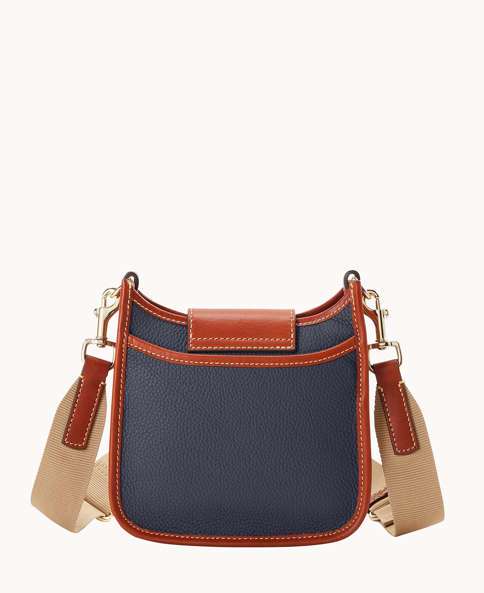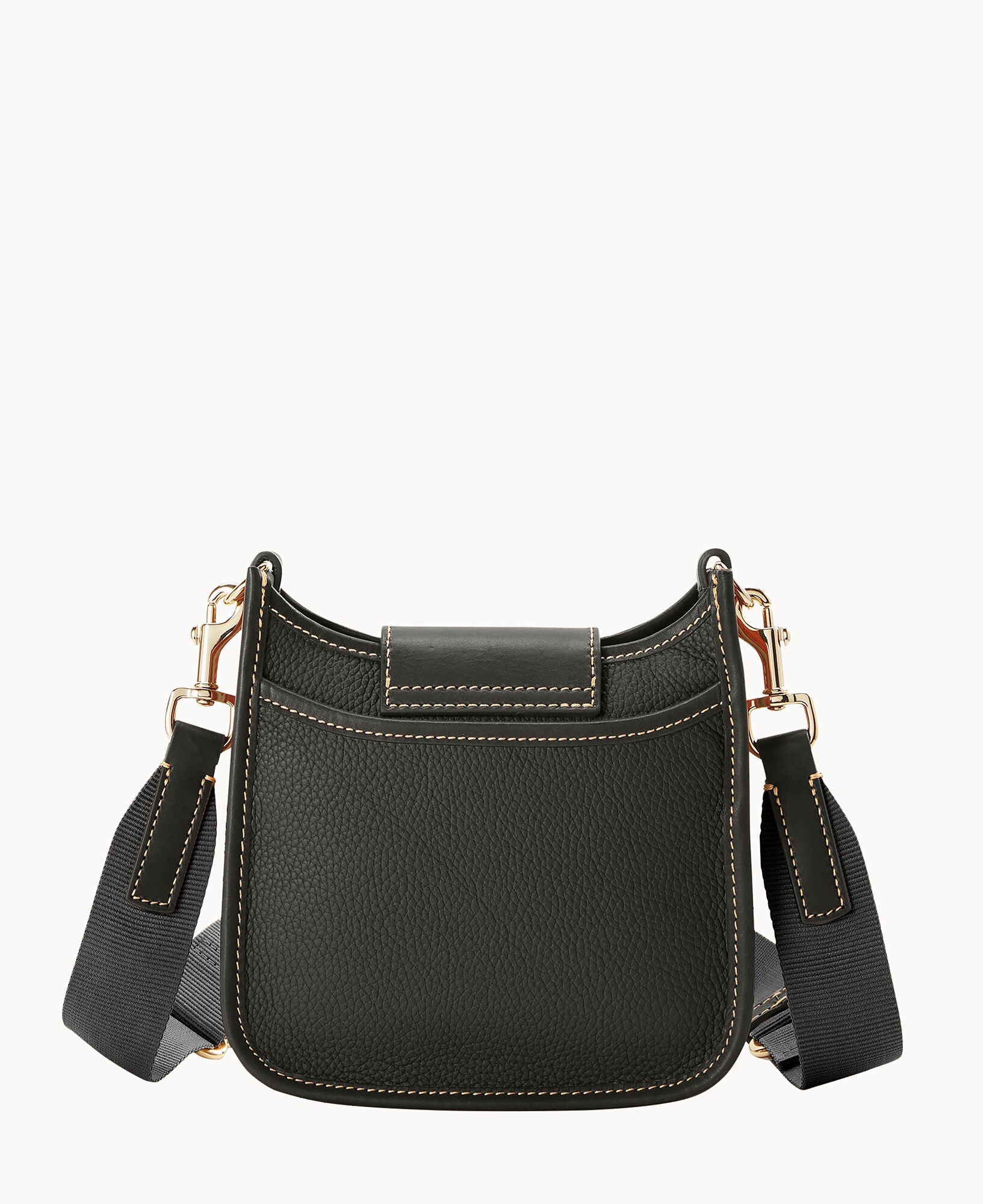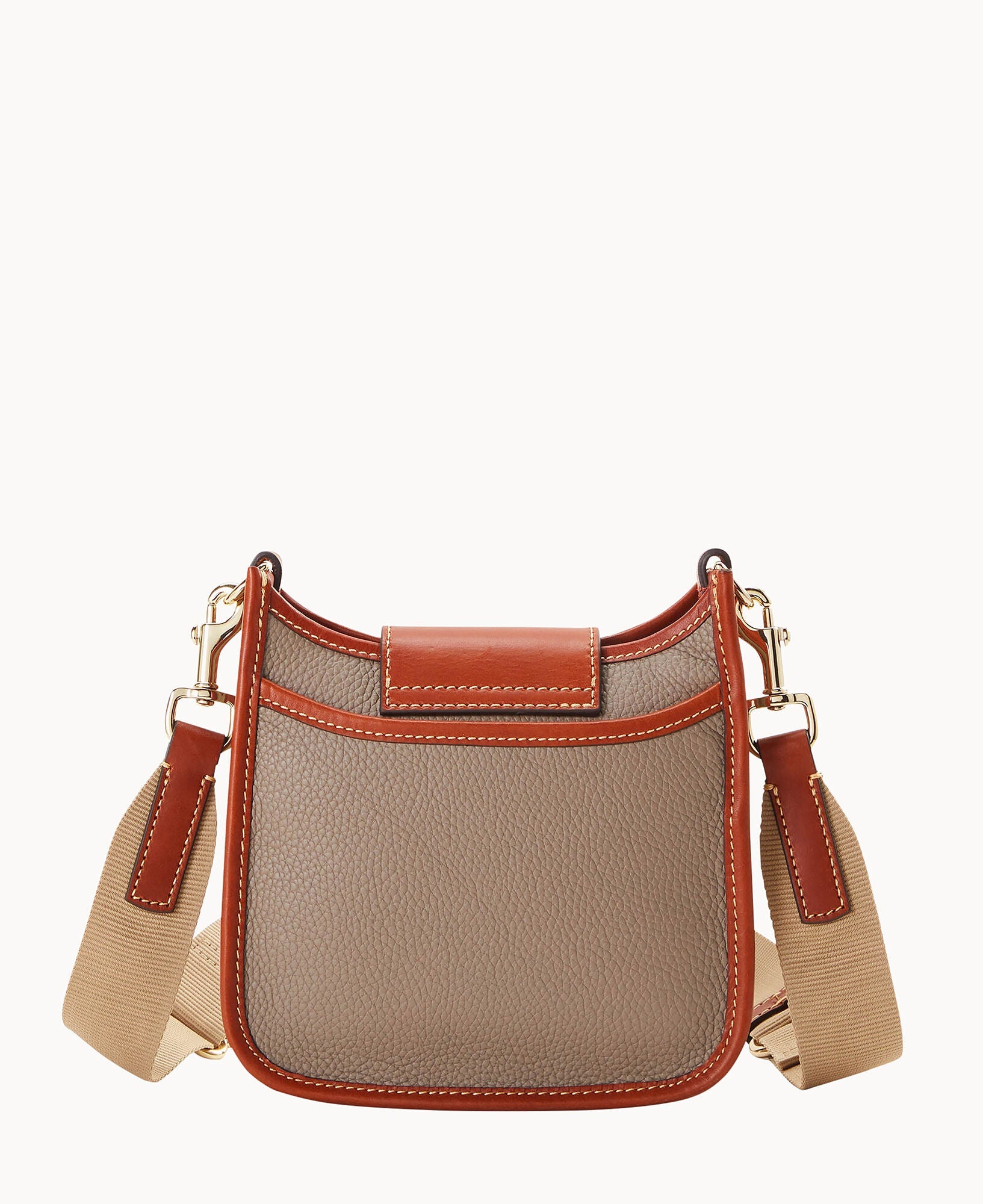 One outside slip pocket. One inside zip pocket. One inside slip pocket. Inside key hook. Adjustable strap. Removable strap. Lined. Turnlock closure.