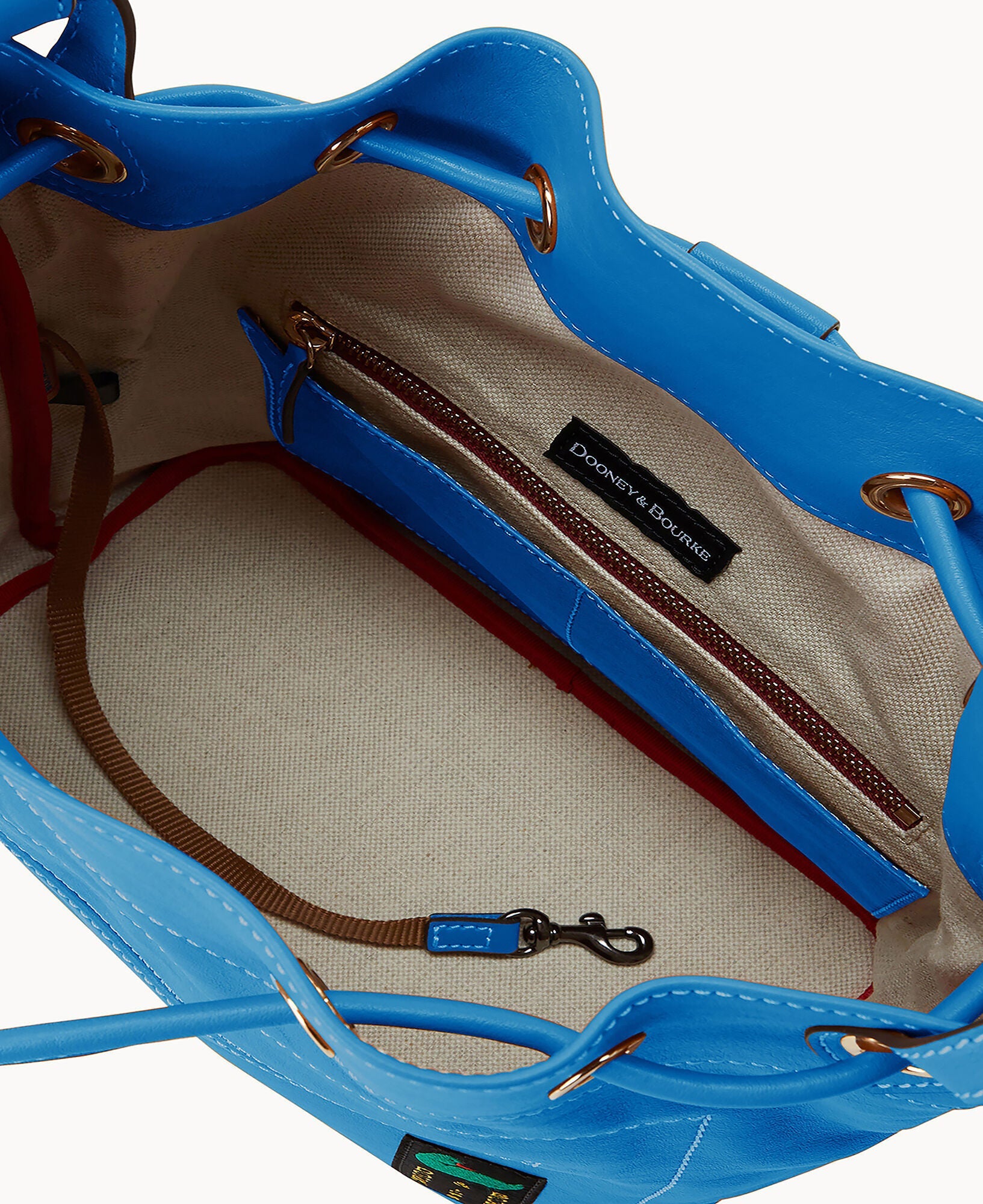 One outside zip pocket. One inside zip pocket. Four inside pockets. Inside key hook. Adjustable shoulder straps. Strap length 17". Lined. Drawstring closure.