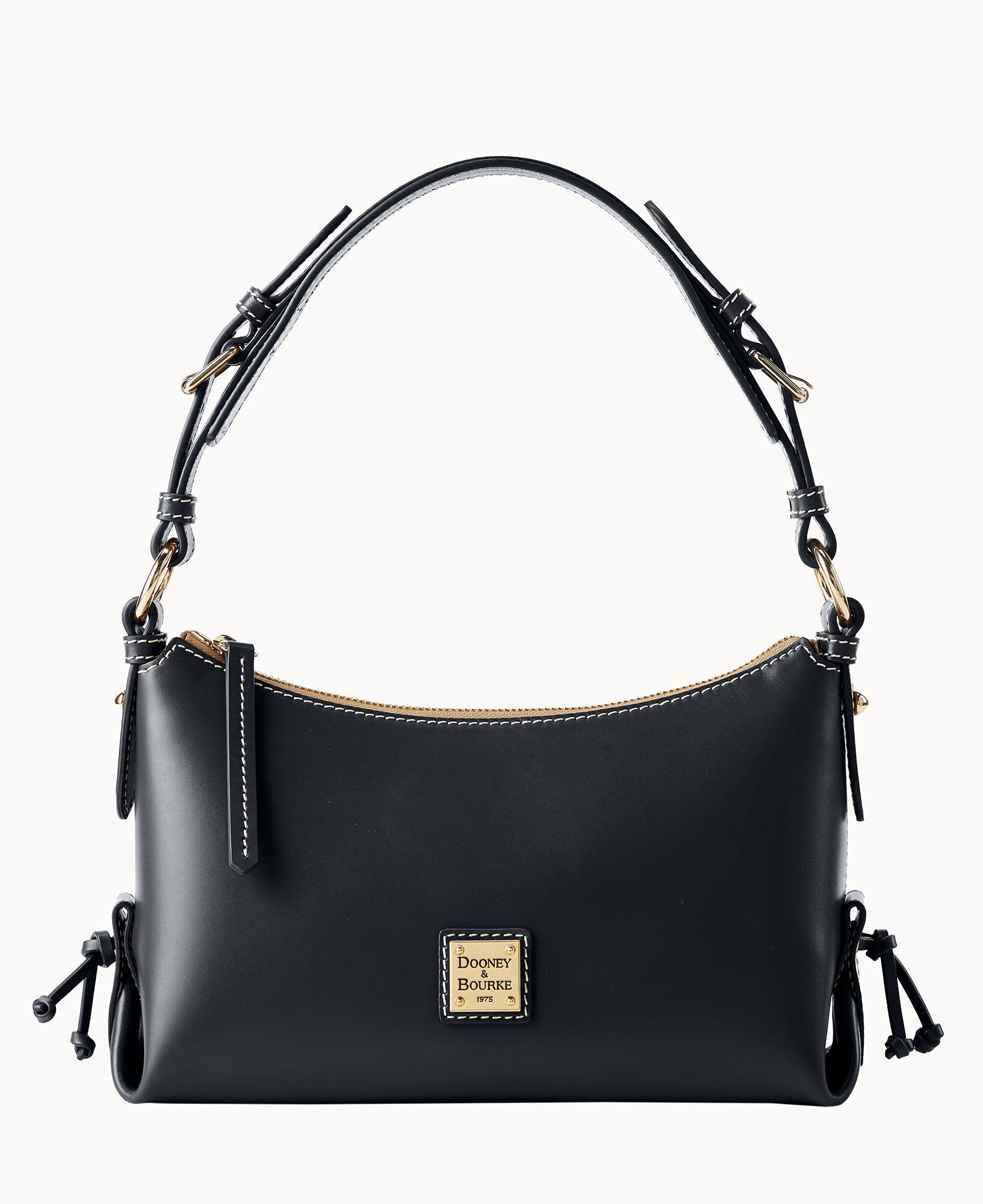 One inside zip pocket. One inside pocket. Inside key hook. Strap drop length 8". Lined. Zipper closure.