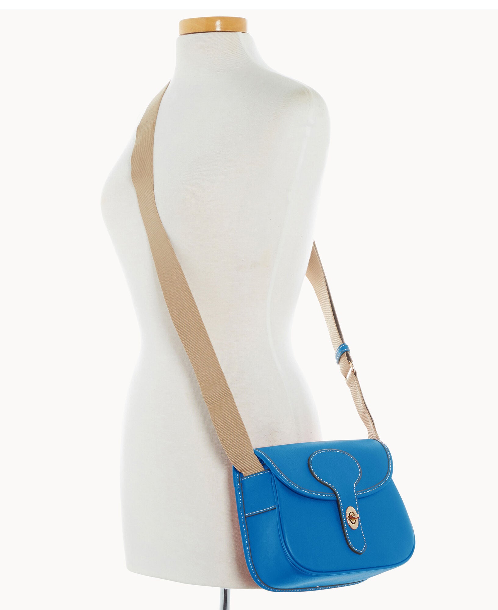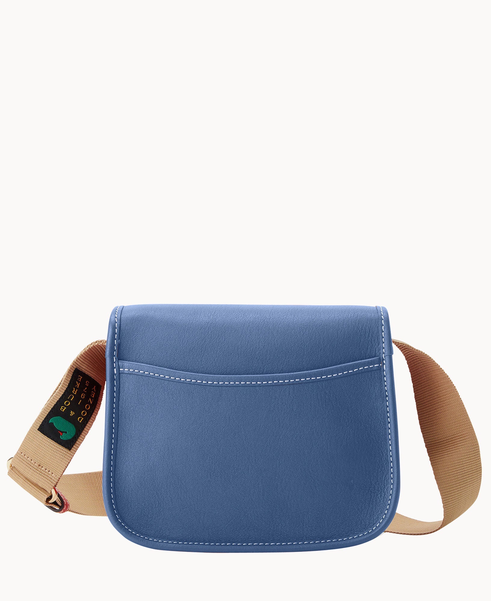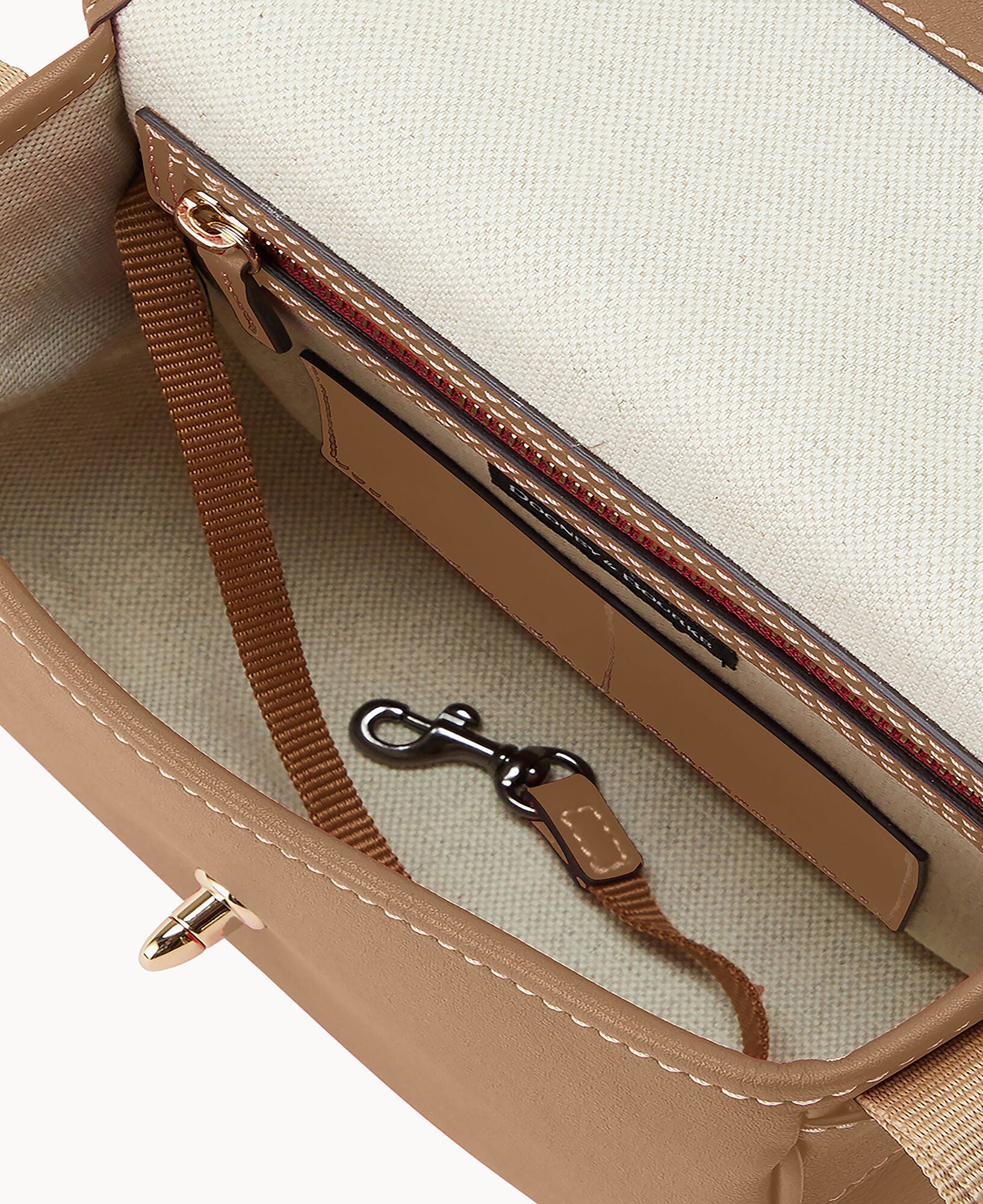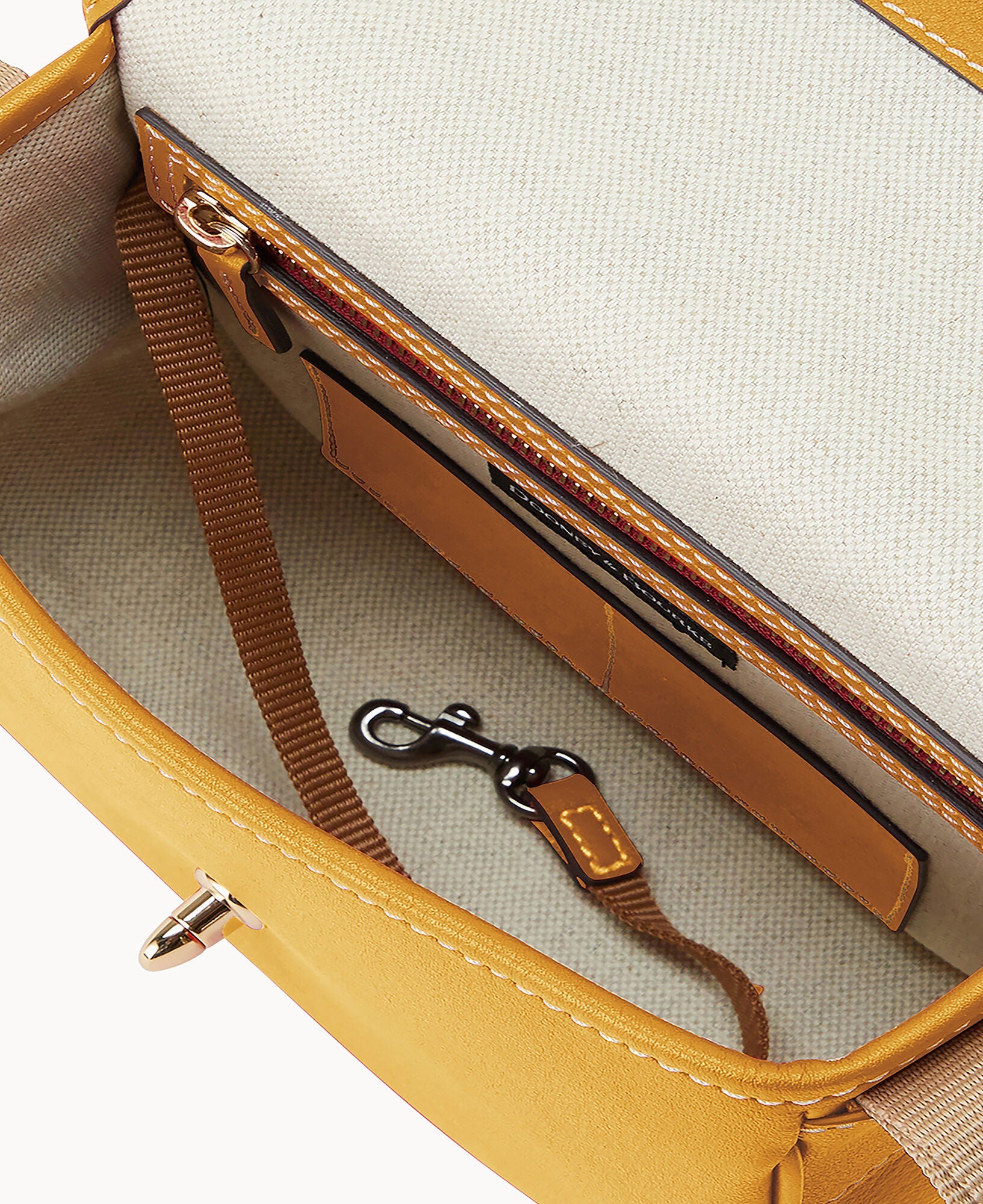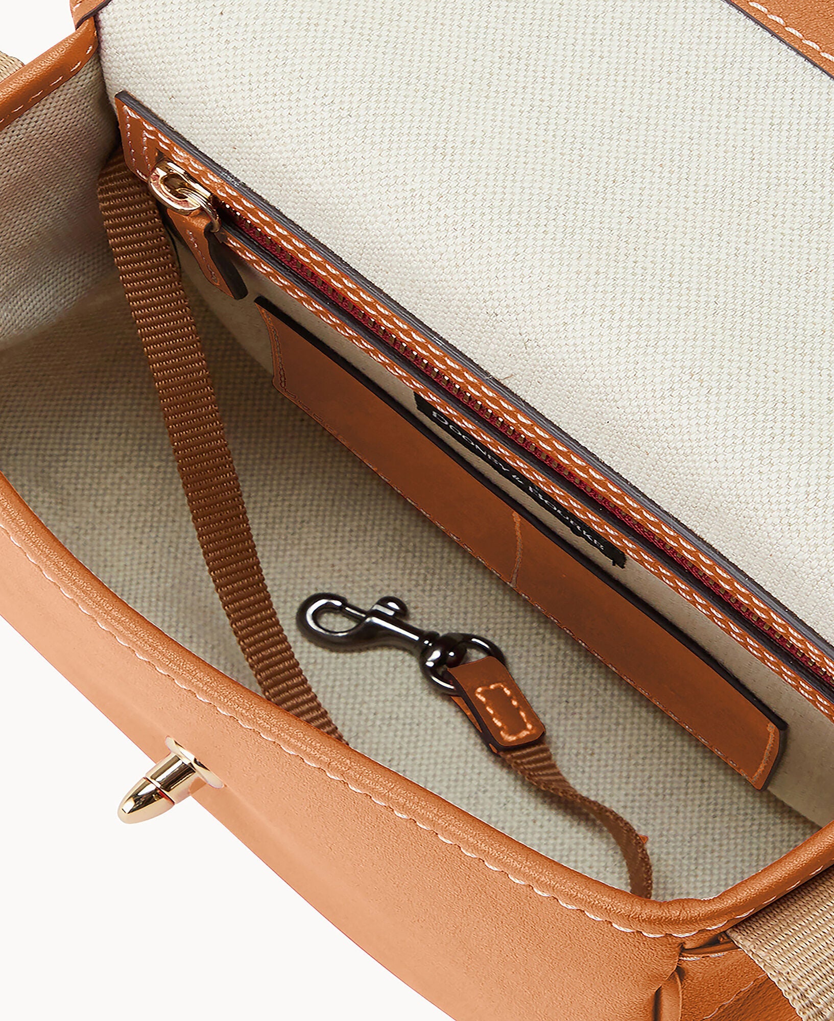 One outside pocket. One inside zip pocket. Two card slots. Inside key hook. Adjustable shoulder strap. Strap drop length 17.25". Lined. Flap turnlock closure.