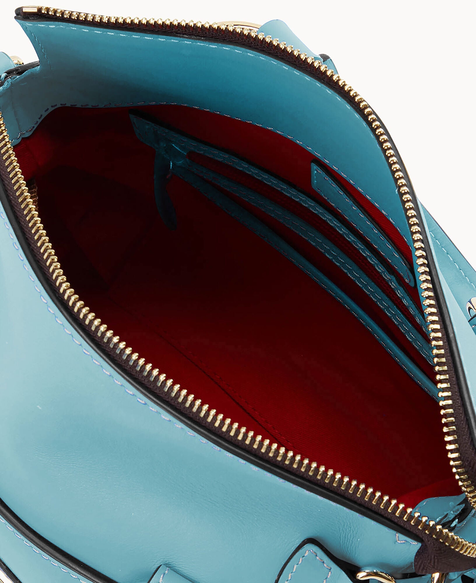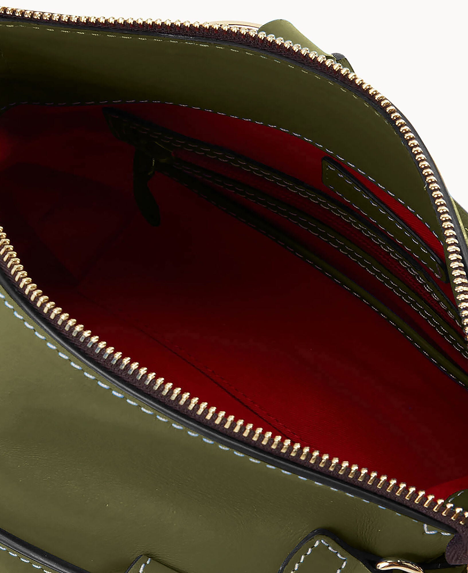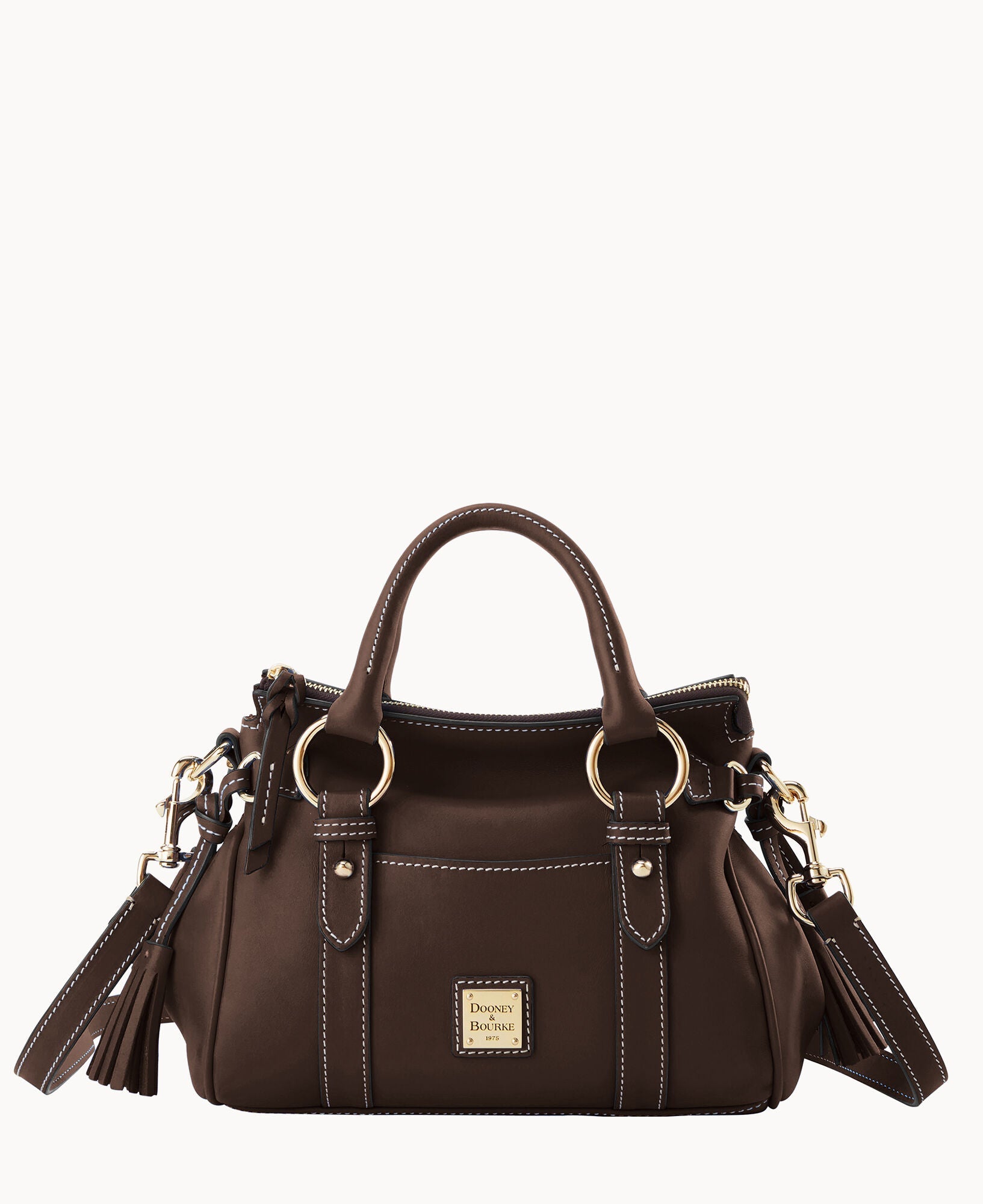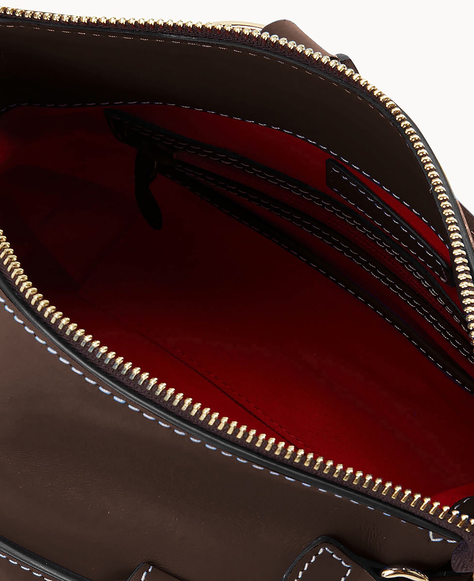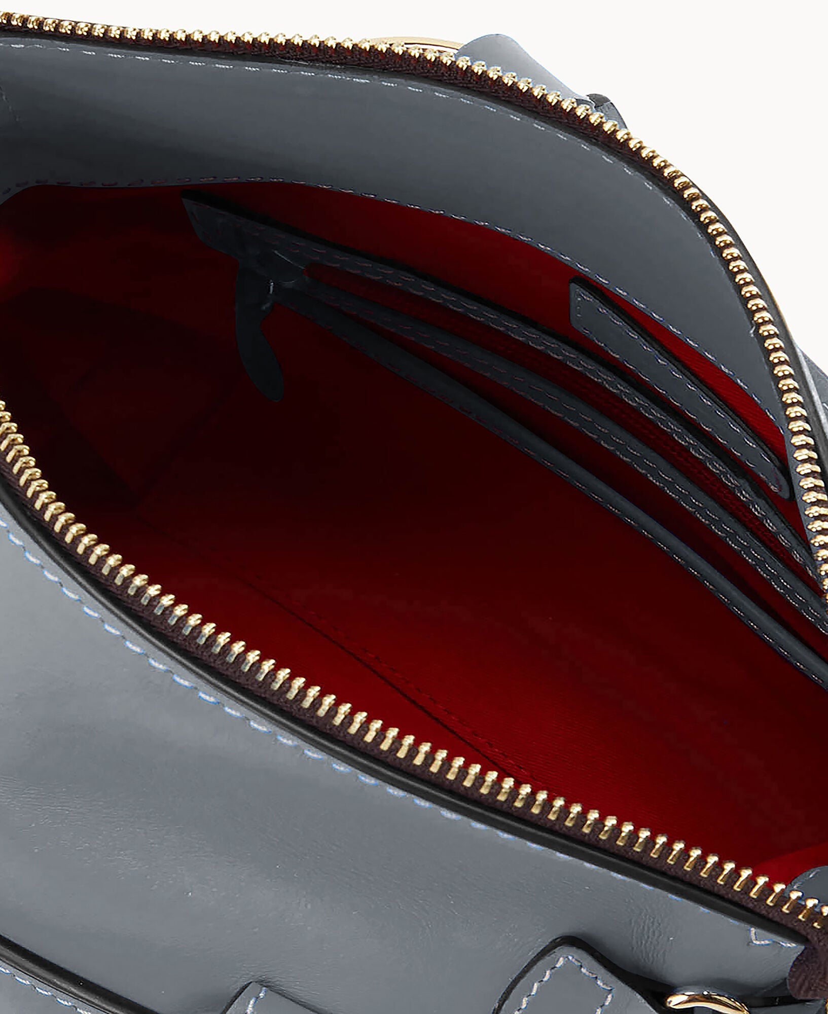 Two outside pockets. Two inside pockets. One inside zip pocket. Inside key hook. Handle drop length 11.25". Strap drop length 20". Feet. Zipper closure. Lined.