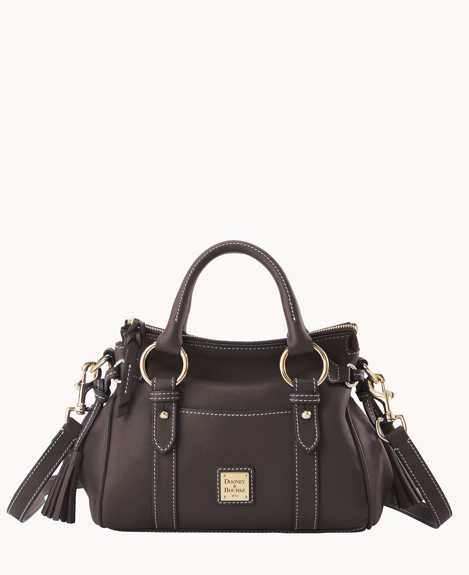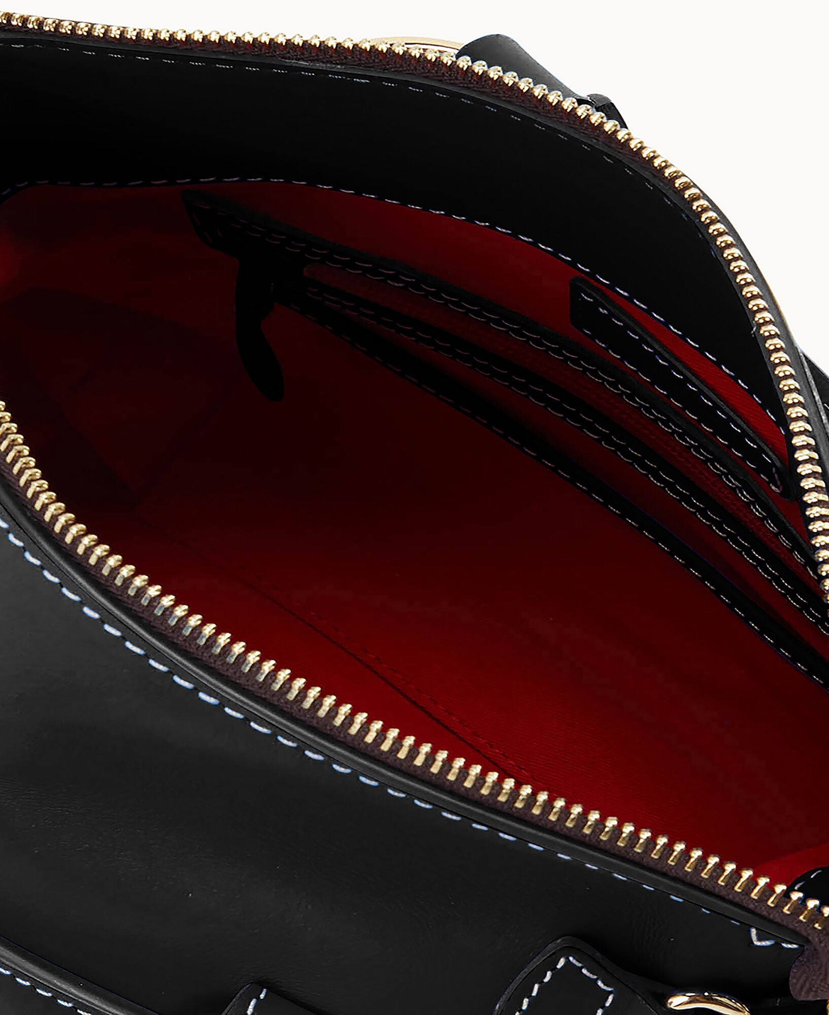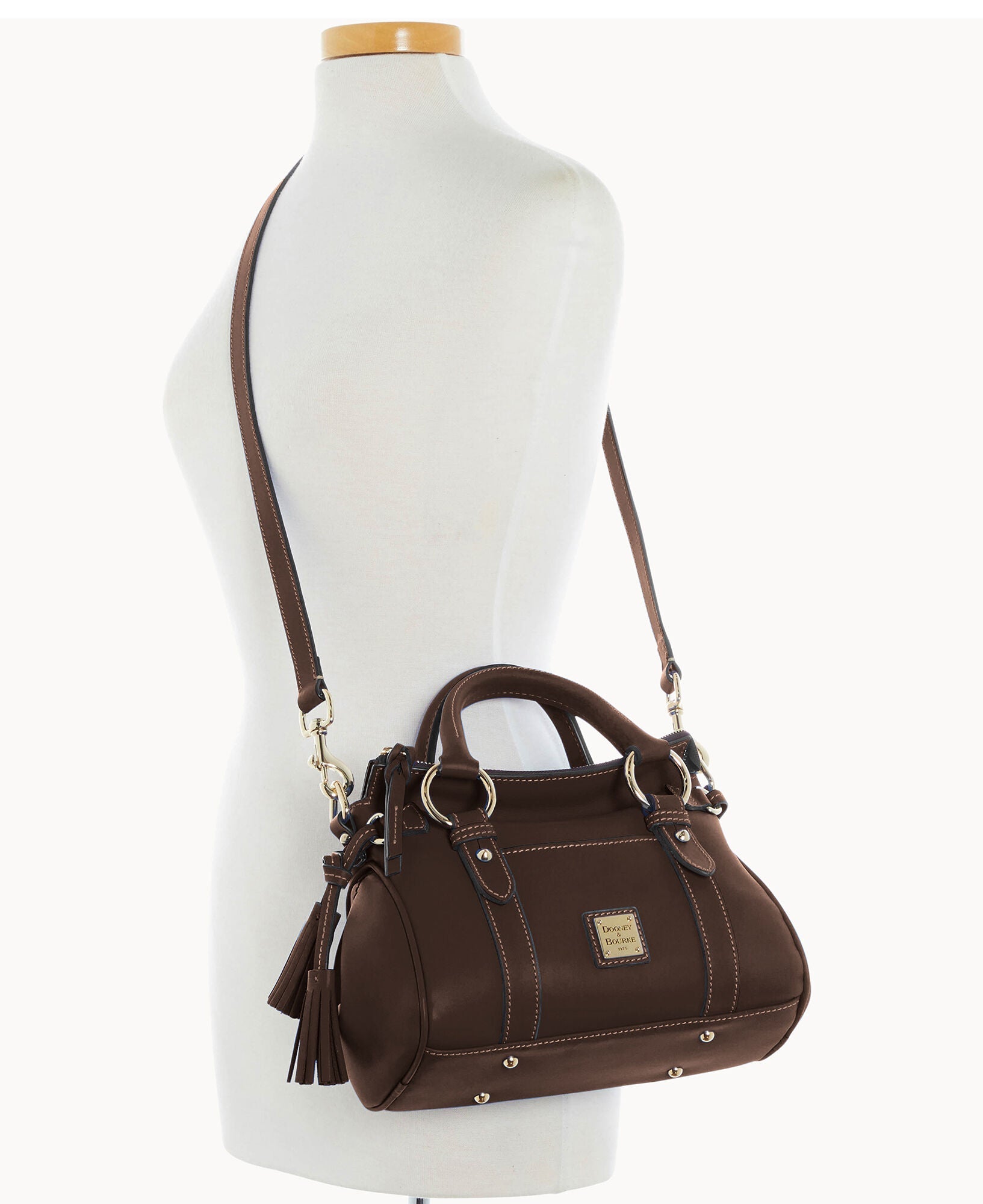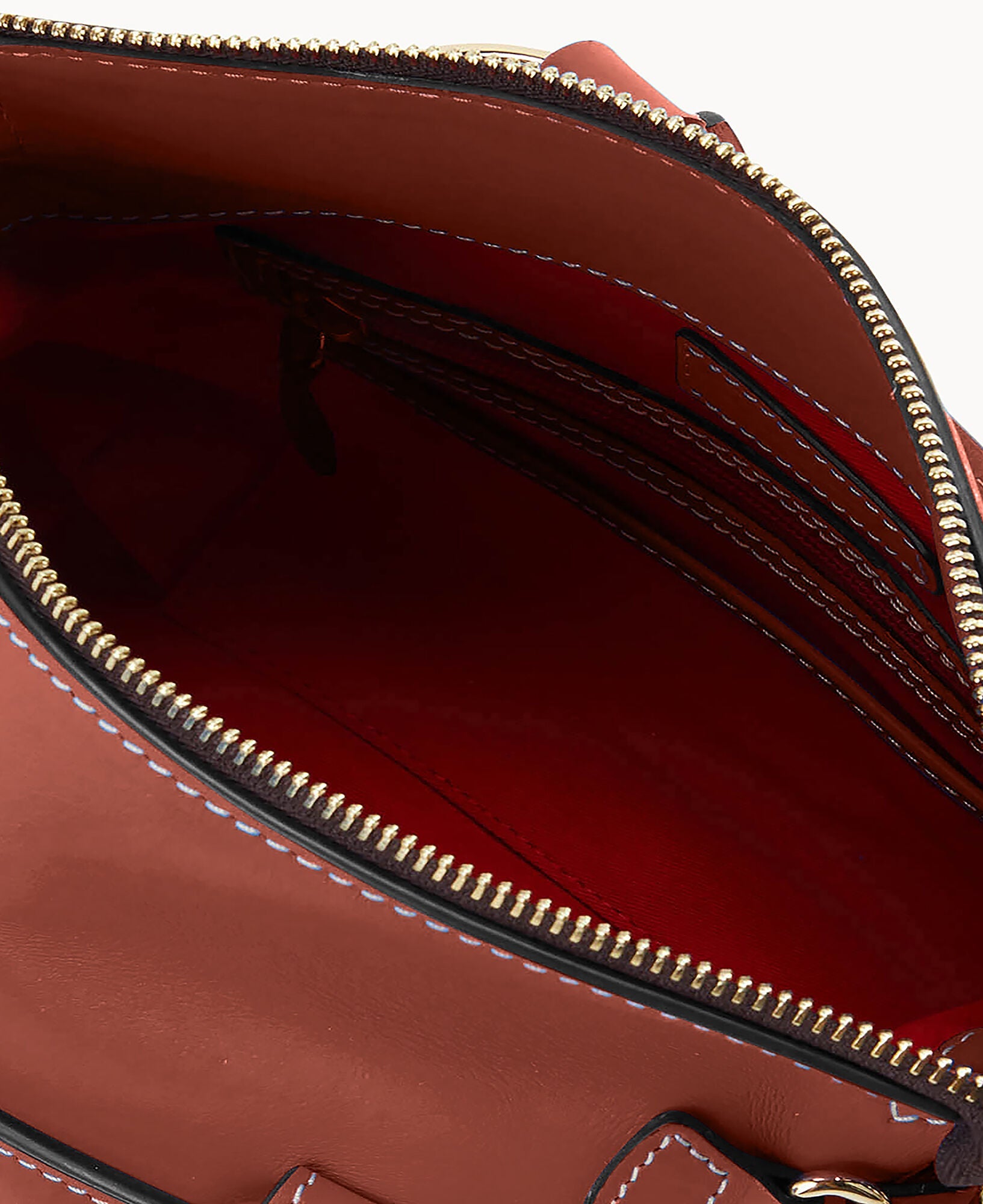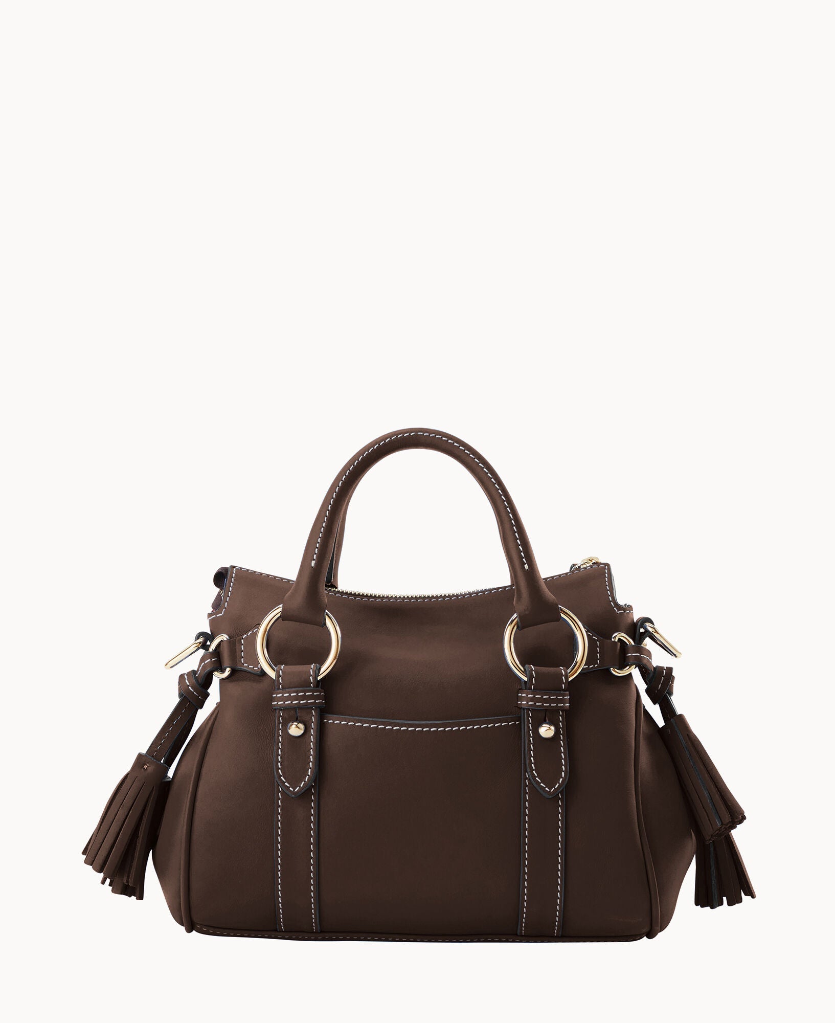 Two outside pockets. Two inside pockets. One inside zip pocket. Inside key hook. Handle drop length 11.25". Strap drop length 20". Feet. Zipper closure. Lined.