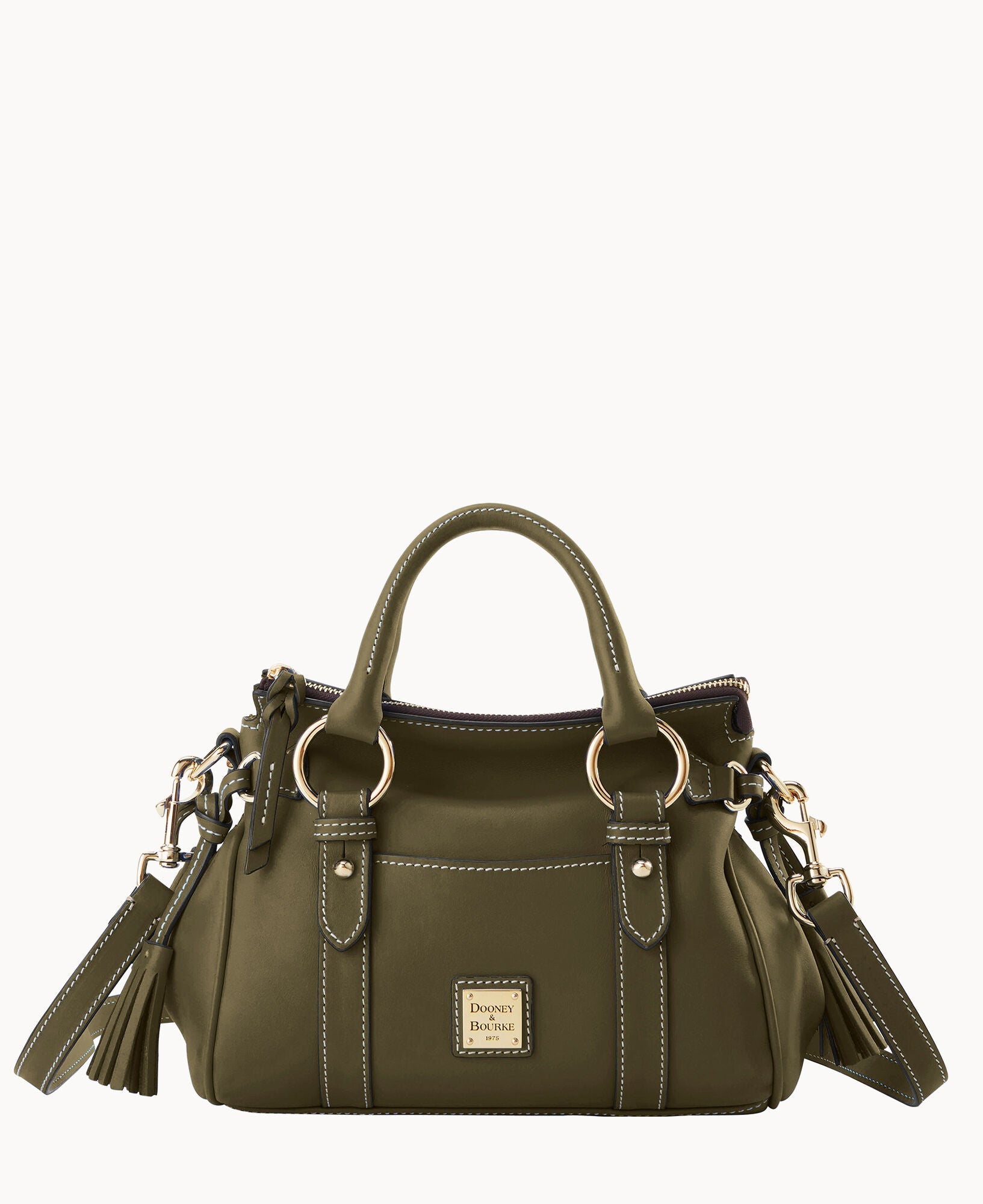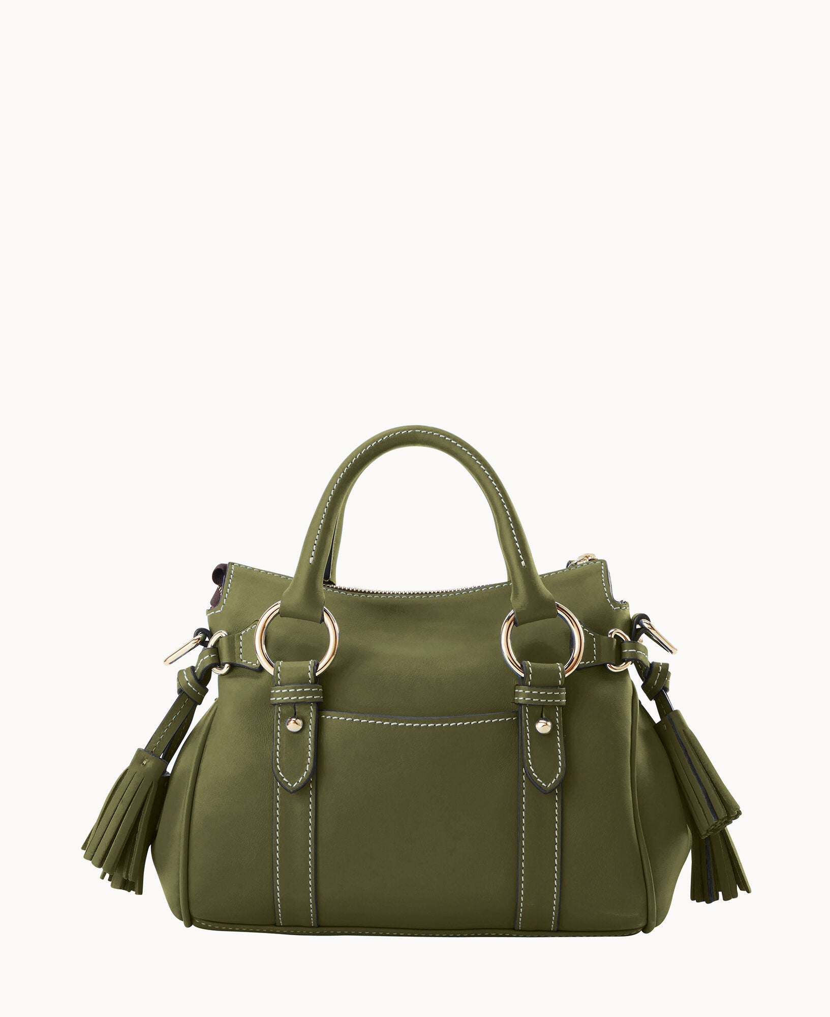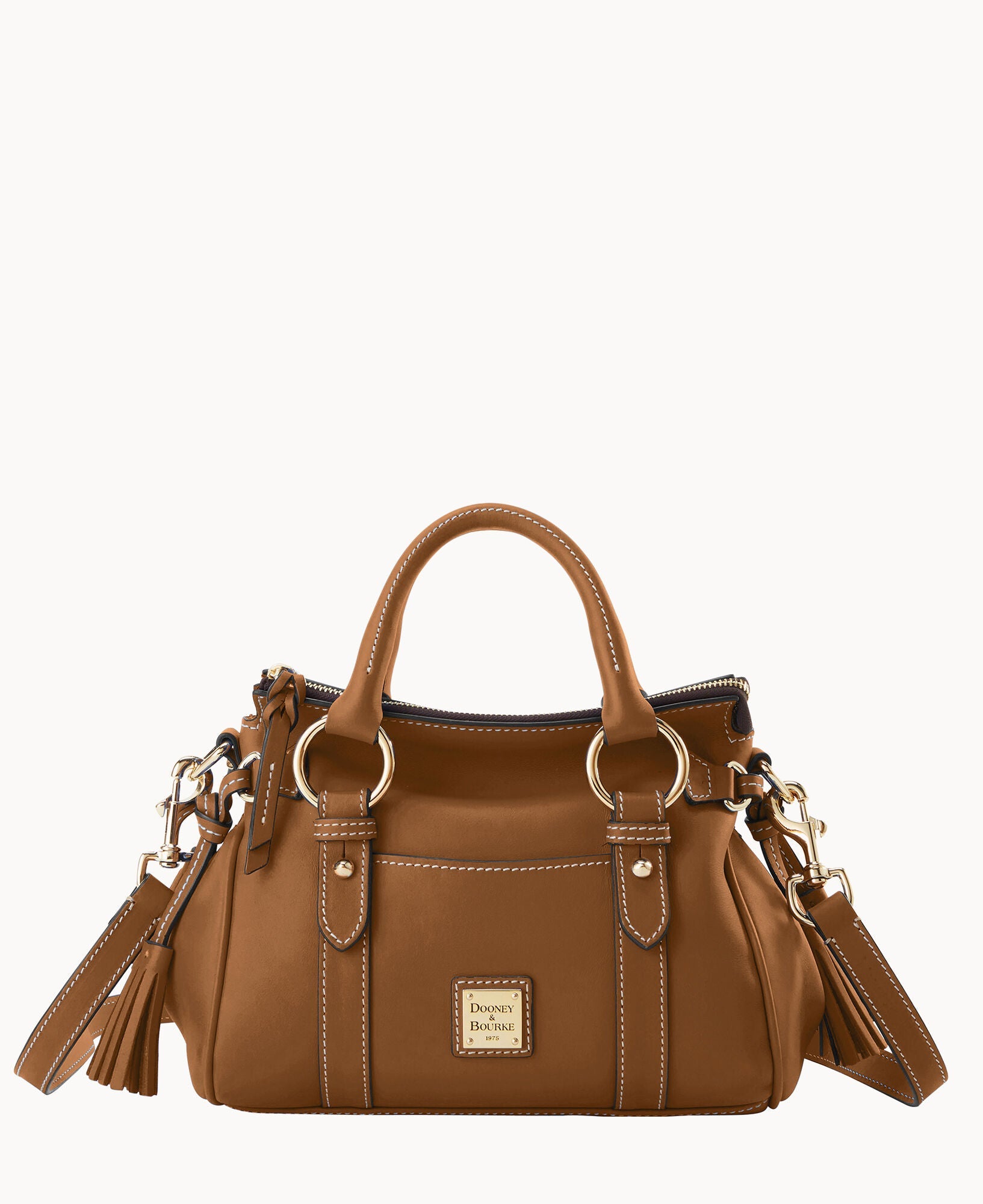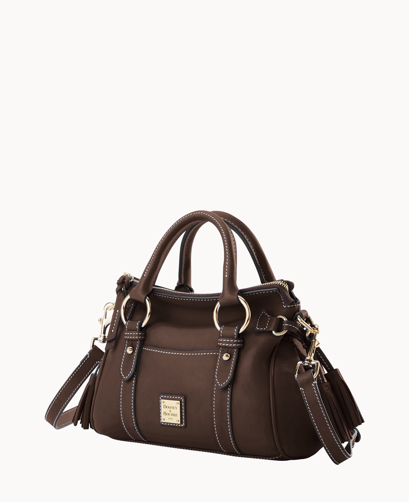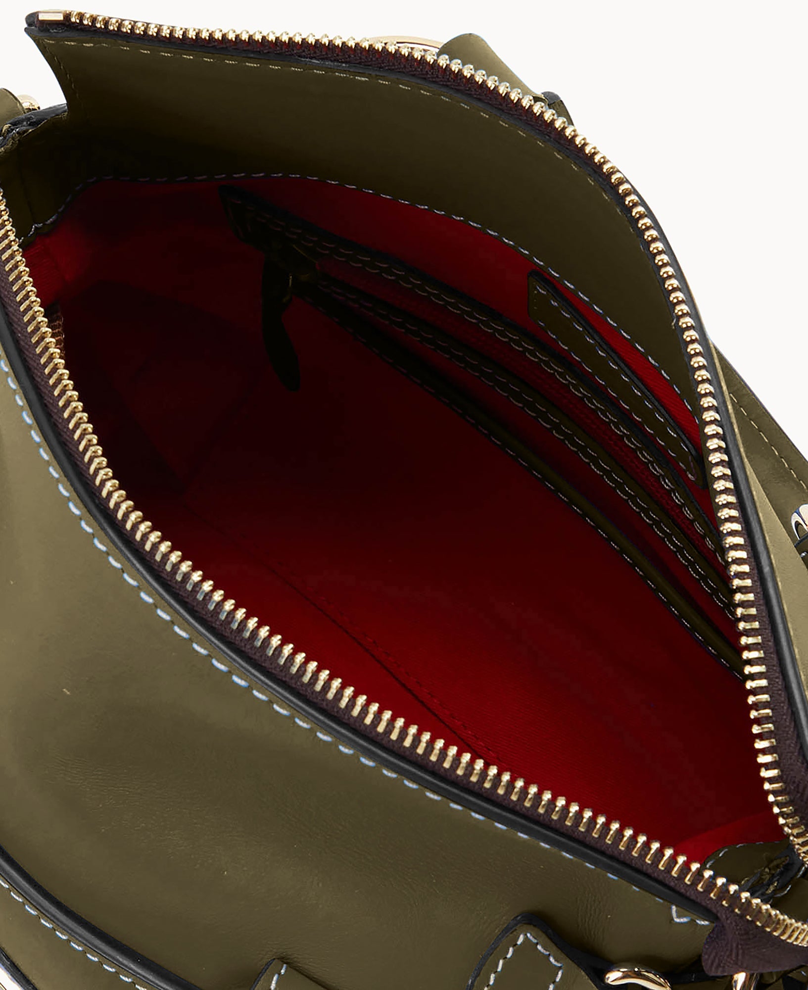 Two outside pockets. Two inside pockets. One inside zip pocket. Inside key hook. Handle drop length 11.25". Strap drop length 20". Feet. Zipper closure. Lined.