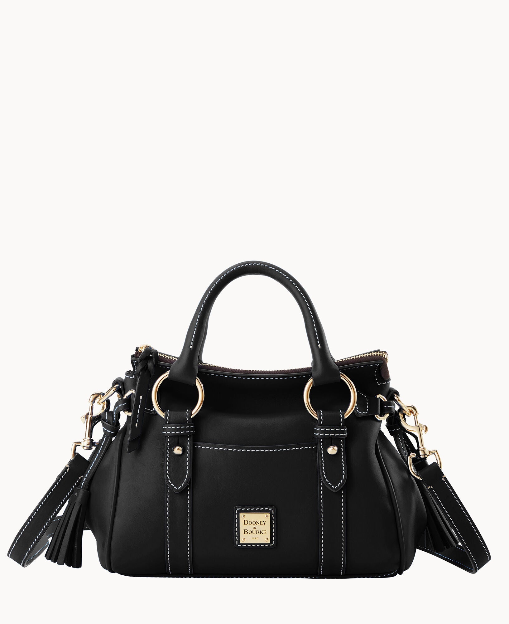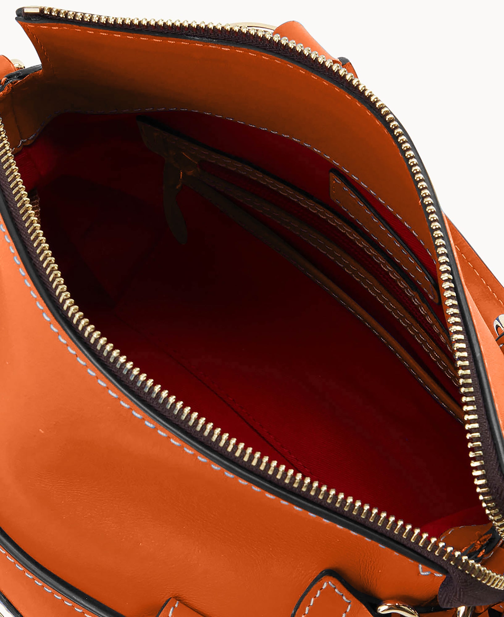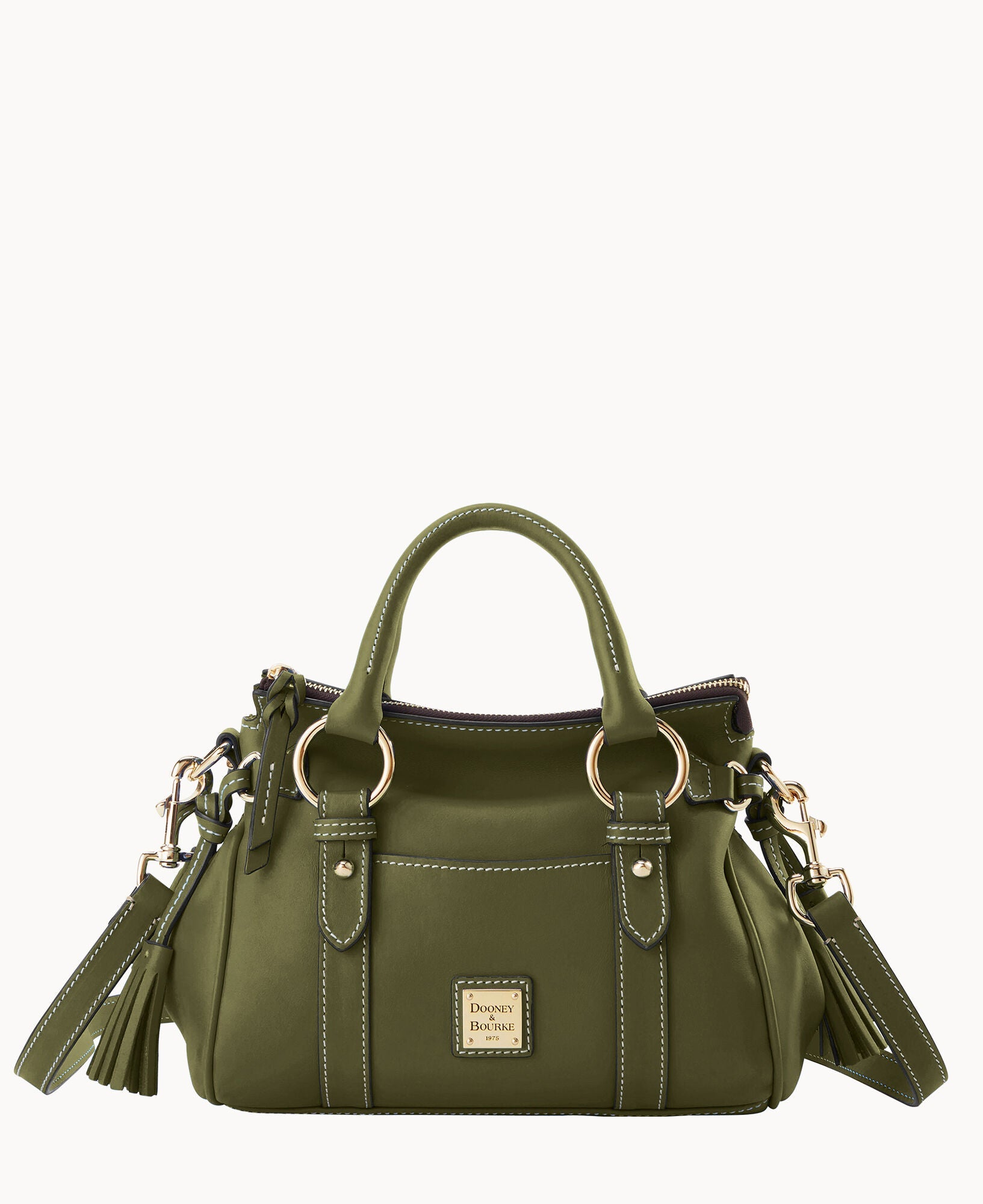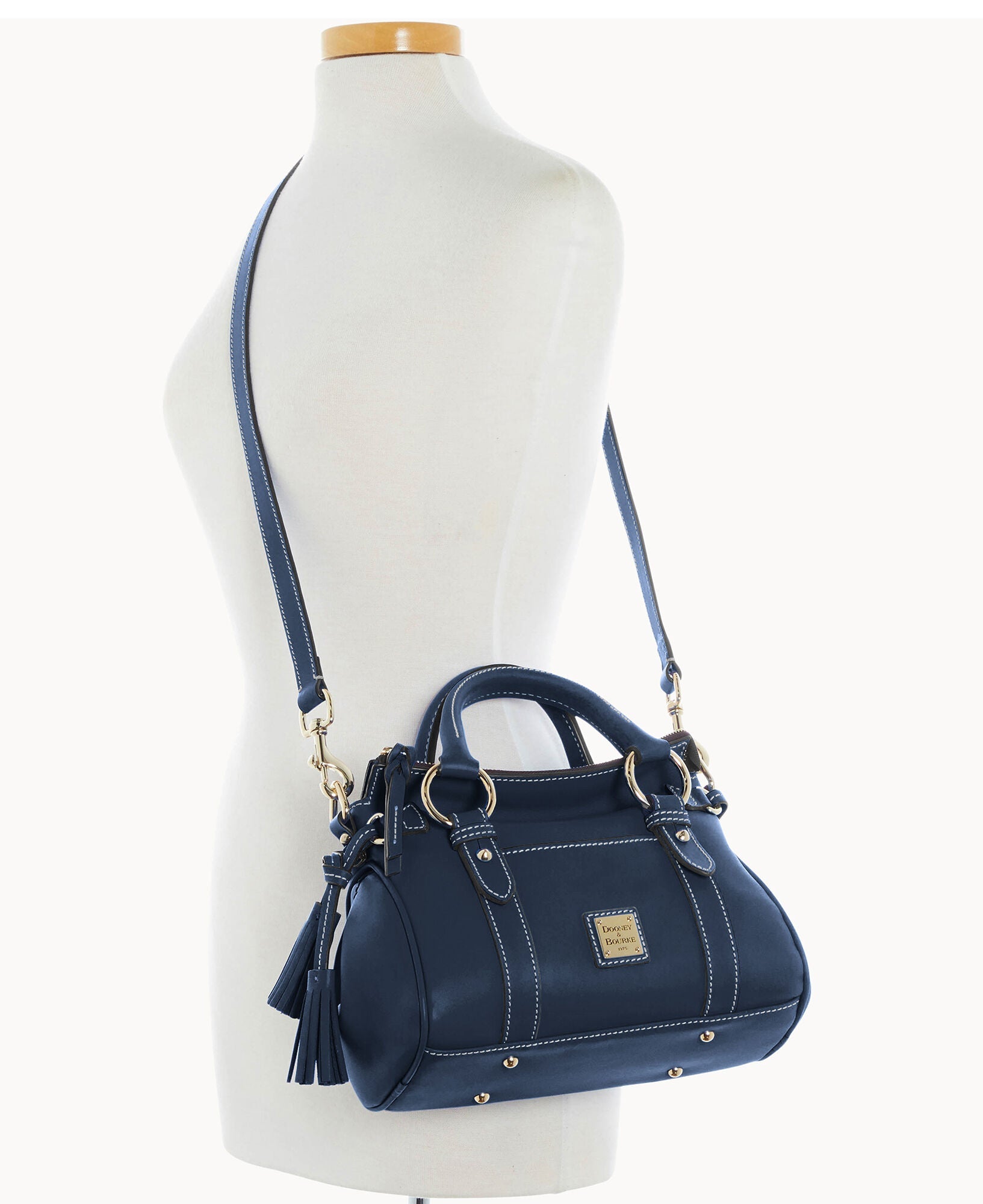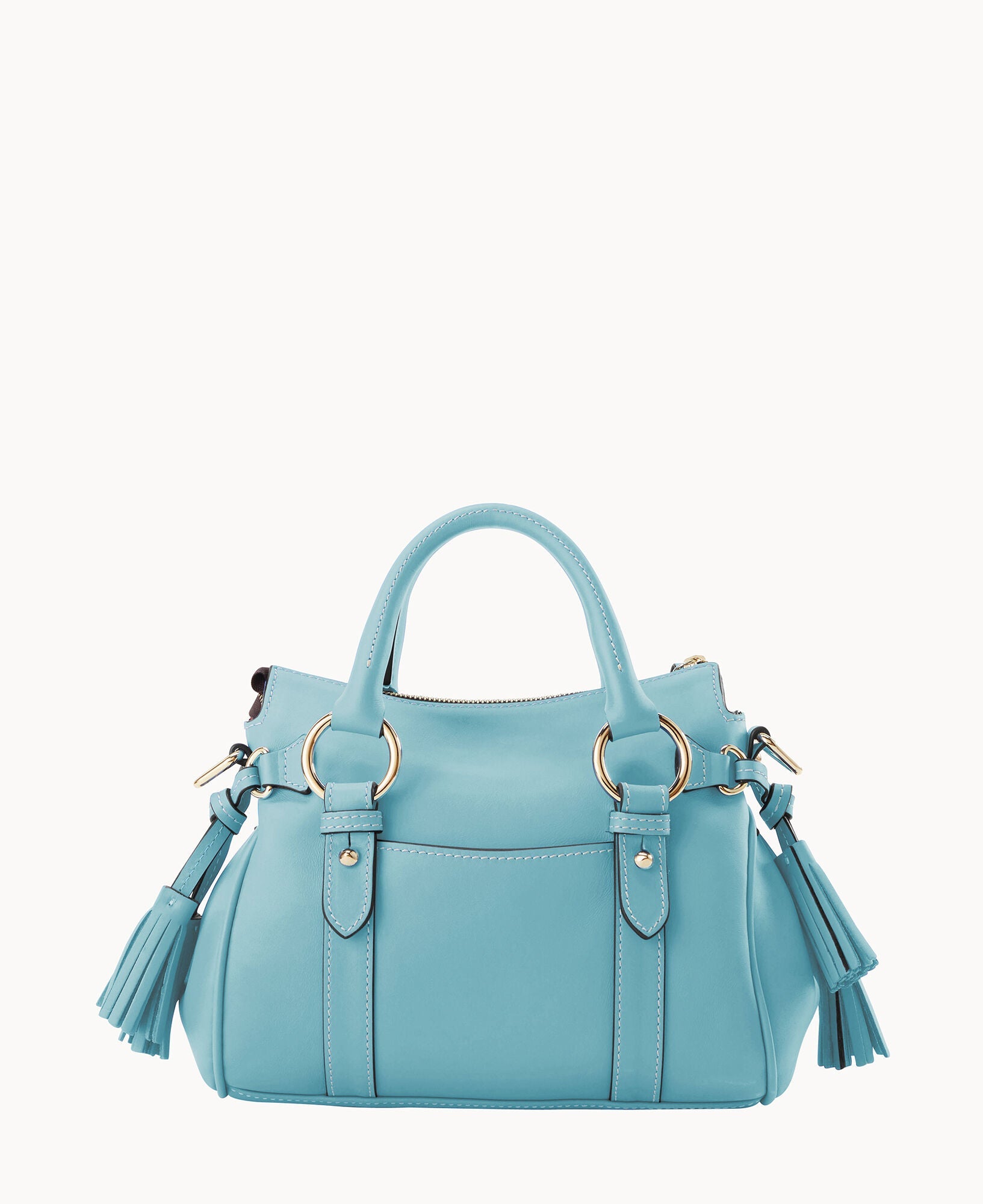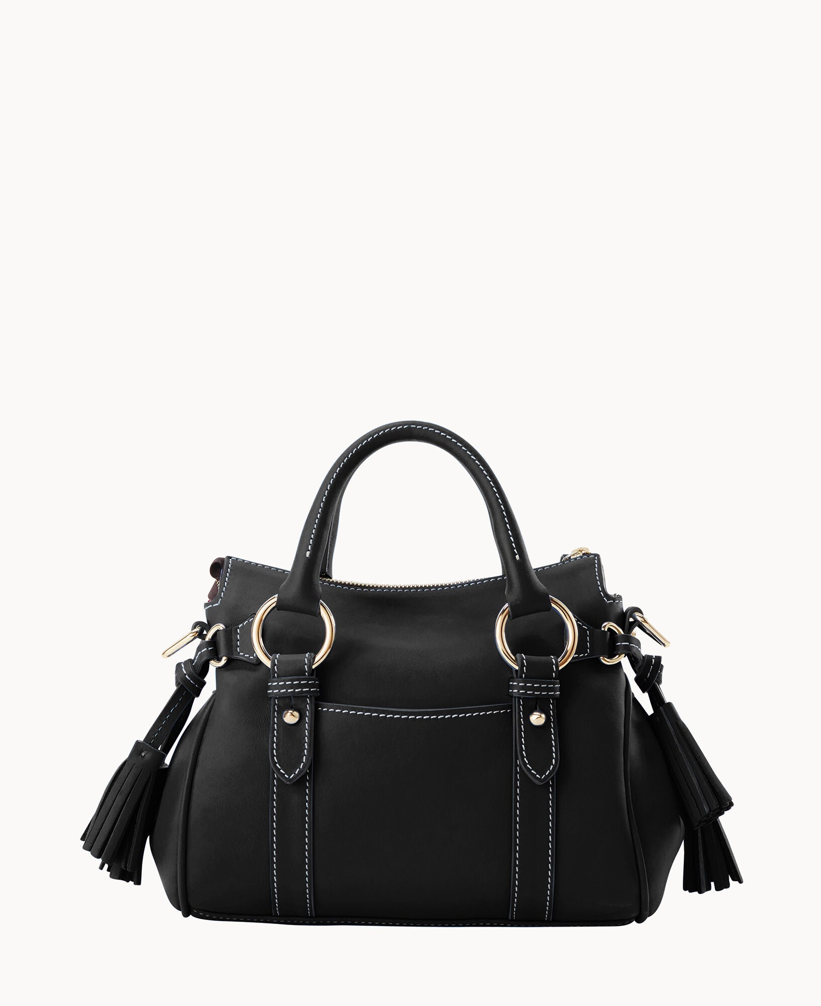 Two outside pockets. Two inside pockets. One inside zip pocket. Inside key hook. Handle drop length 11.25". Strap drop length 20". Feet. Zipper closure. Lined.