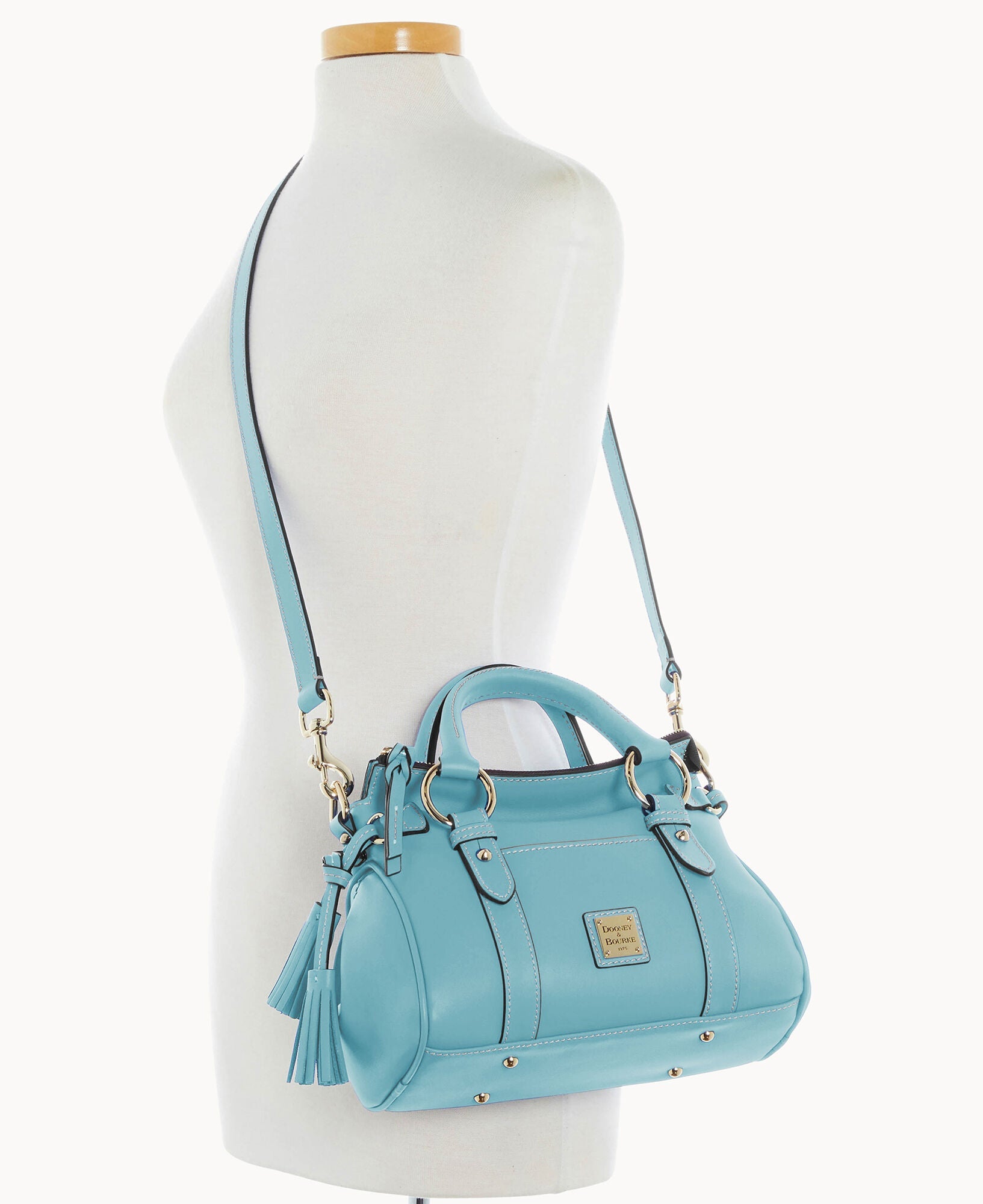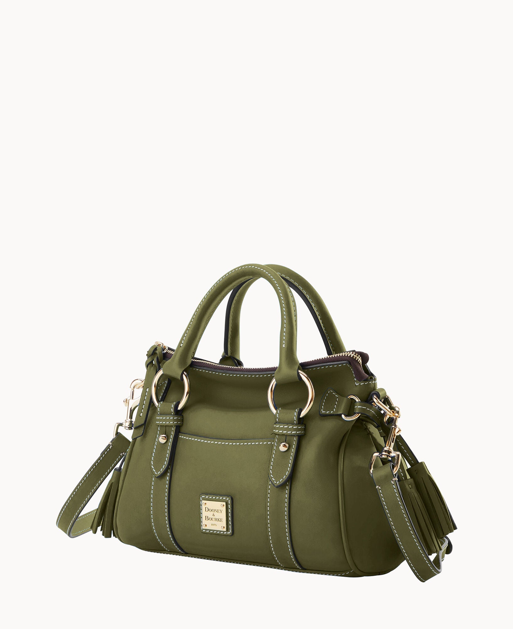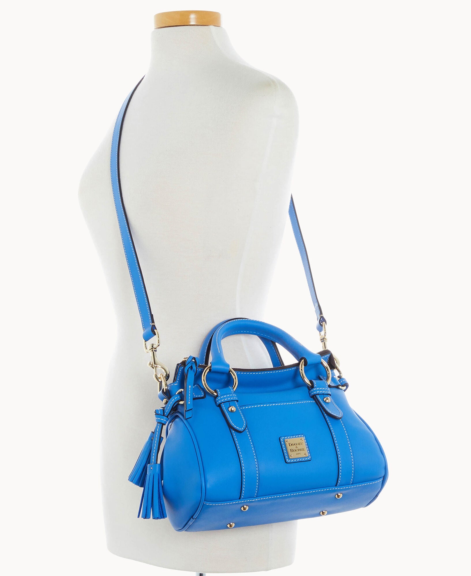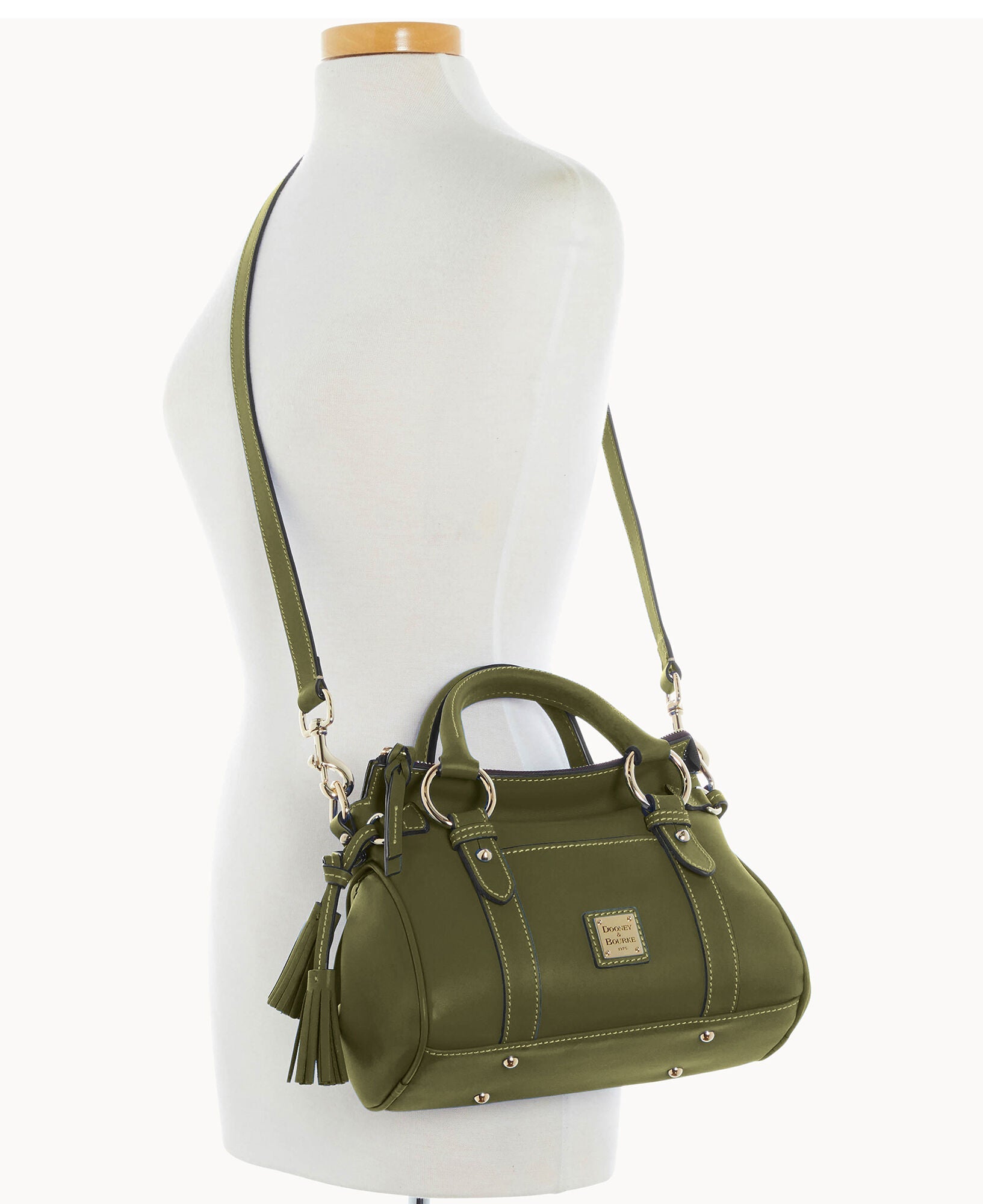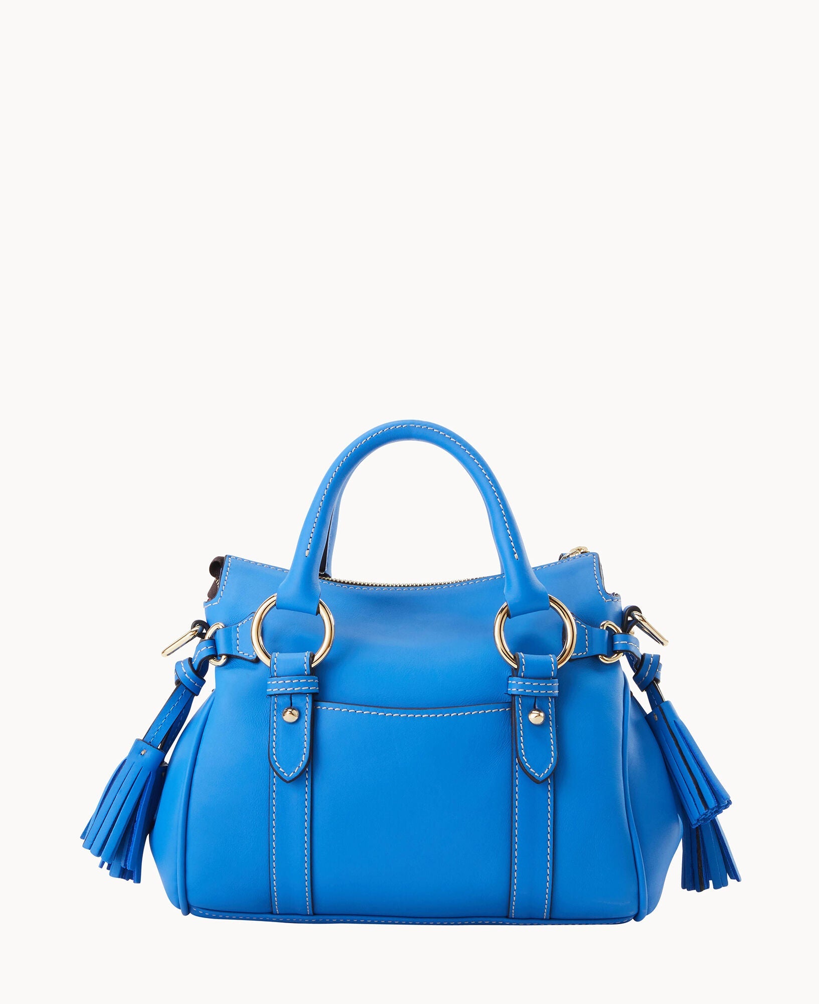Two outside pockets. Two inside pockets. One inside zip pocket. Inside key hook. Handle drop length 11.25". Strap drop length 20". Feet. Zipper closure. Lined.