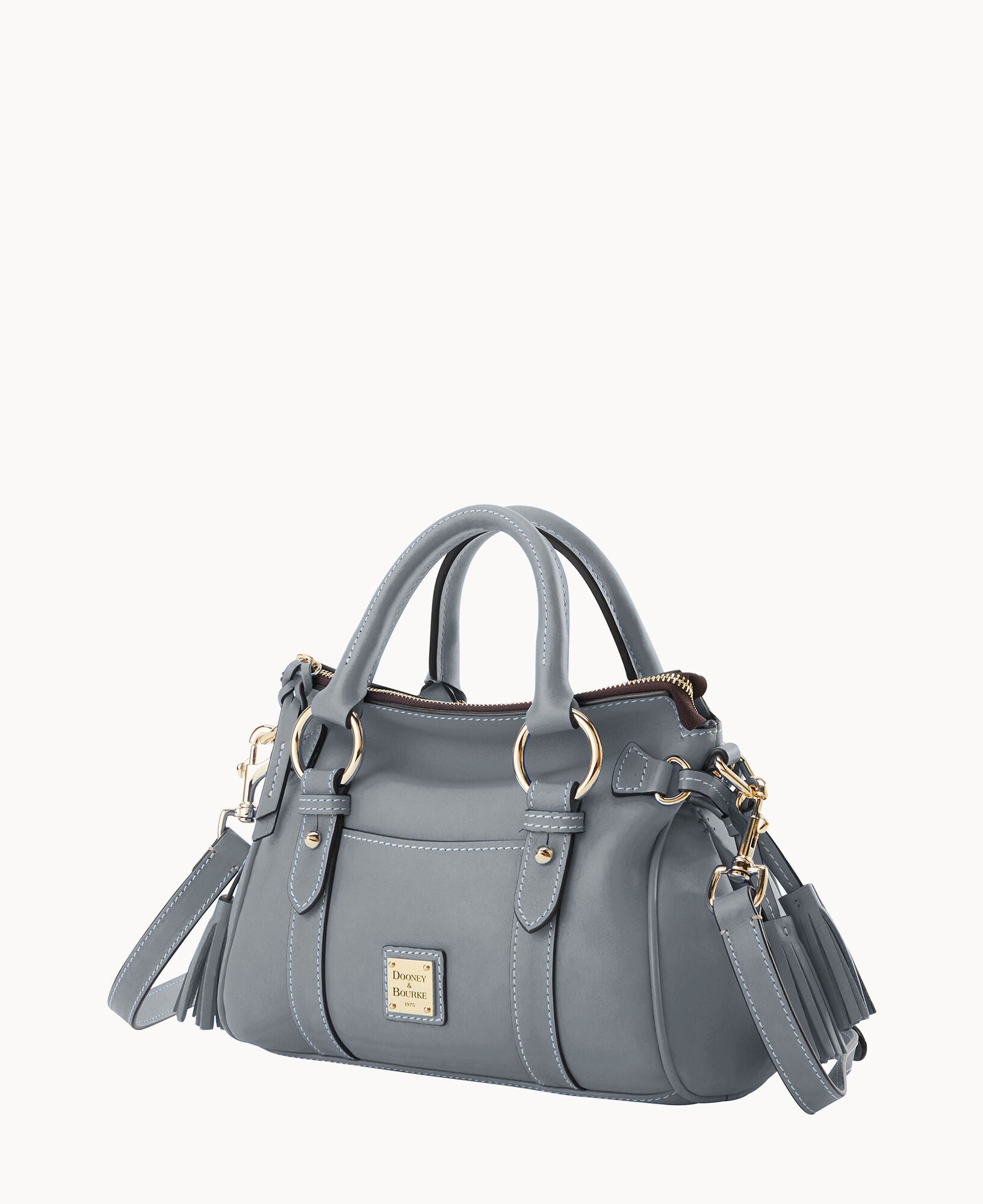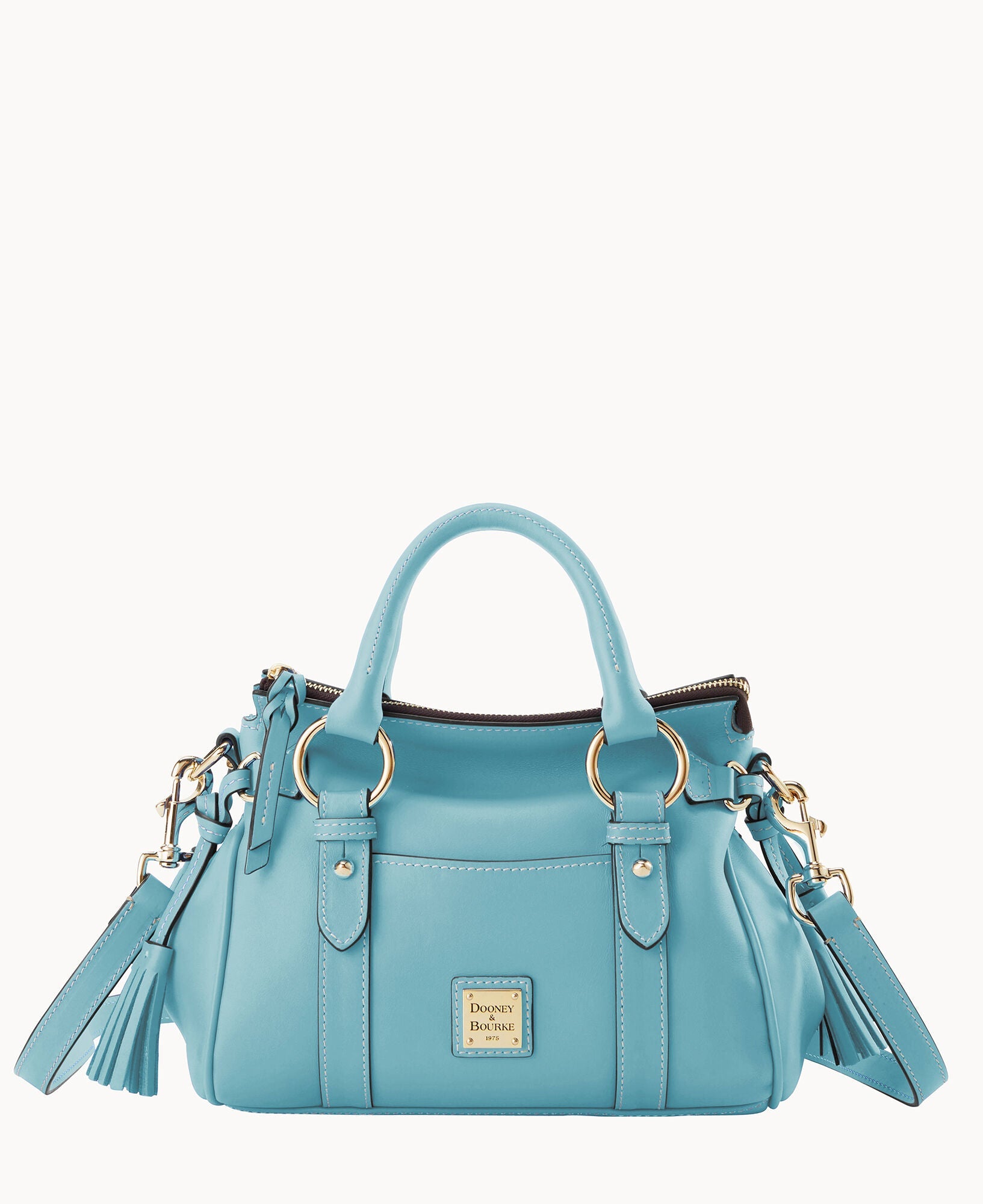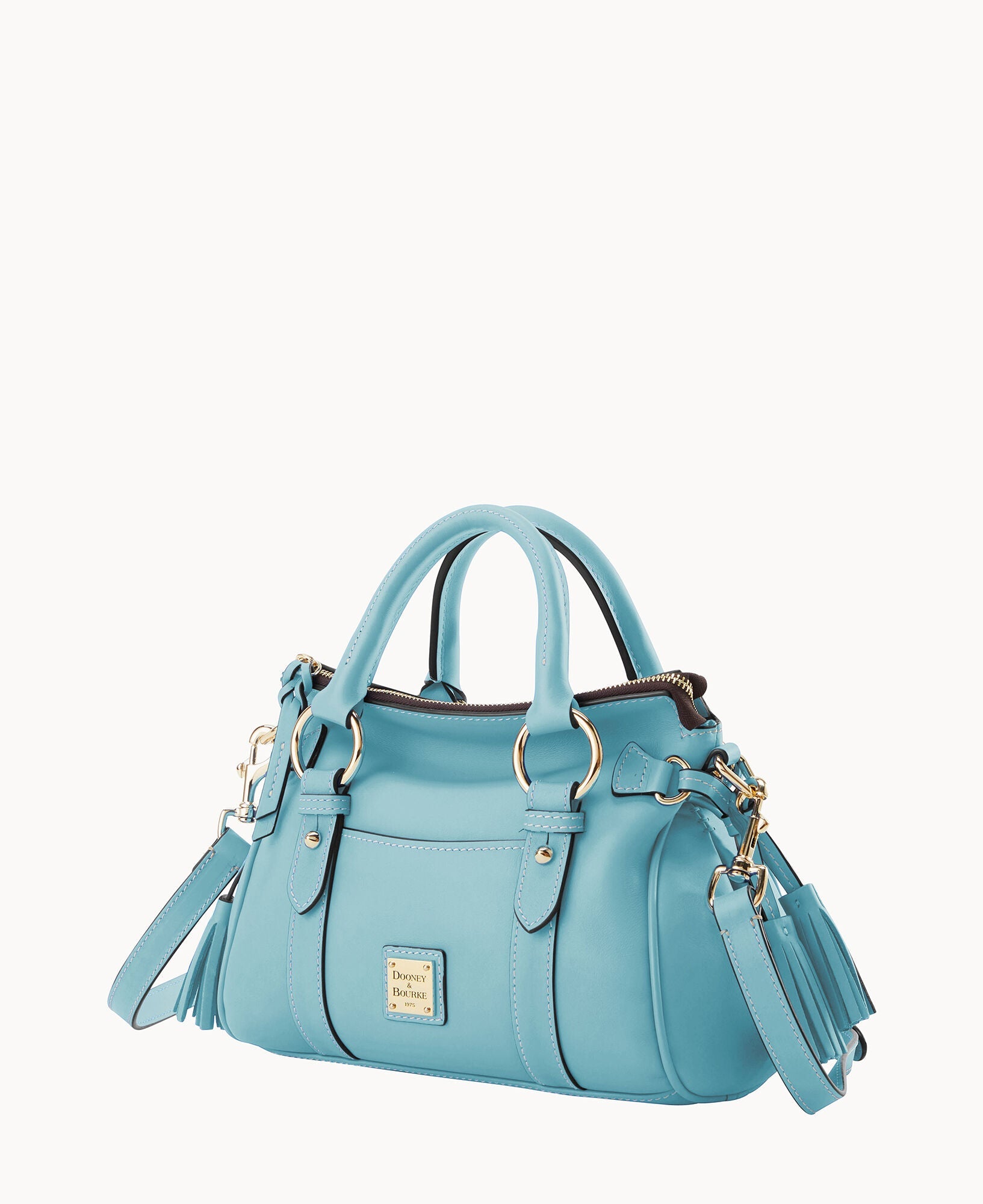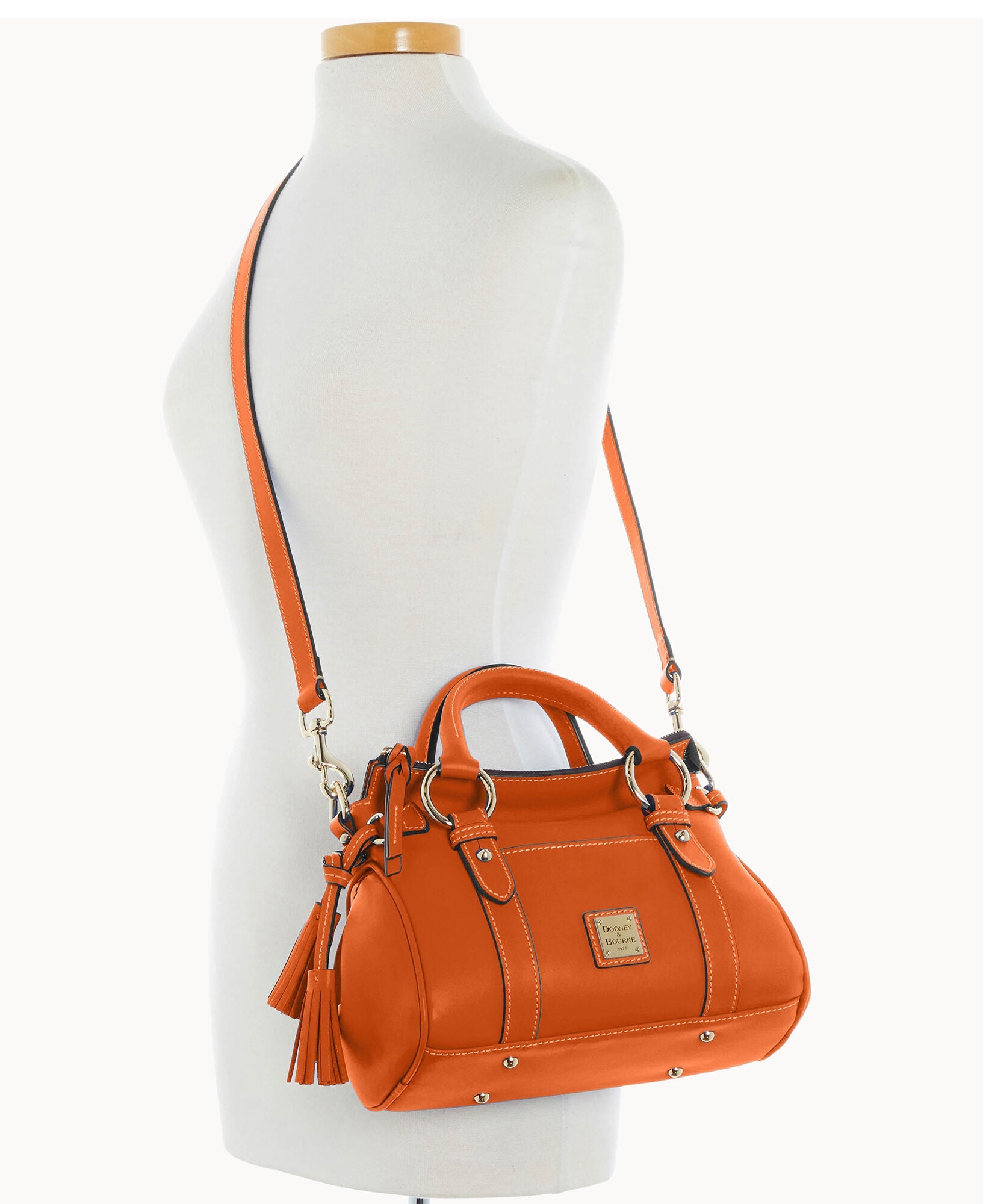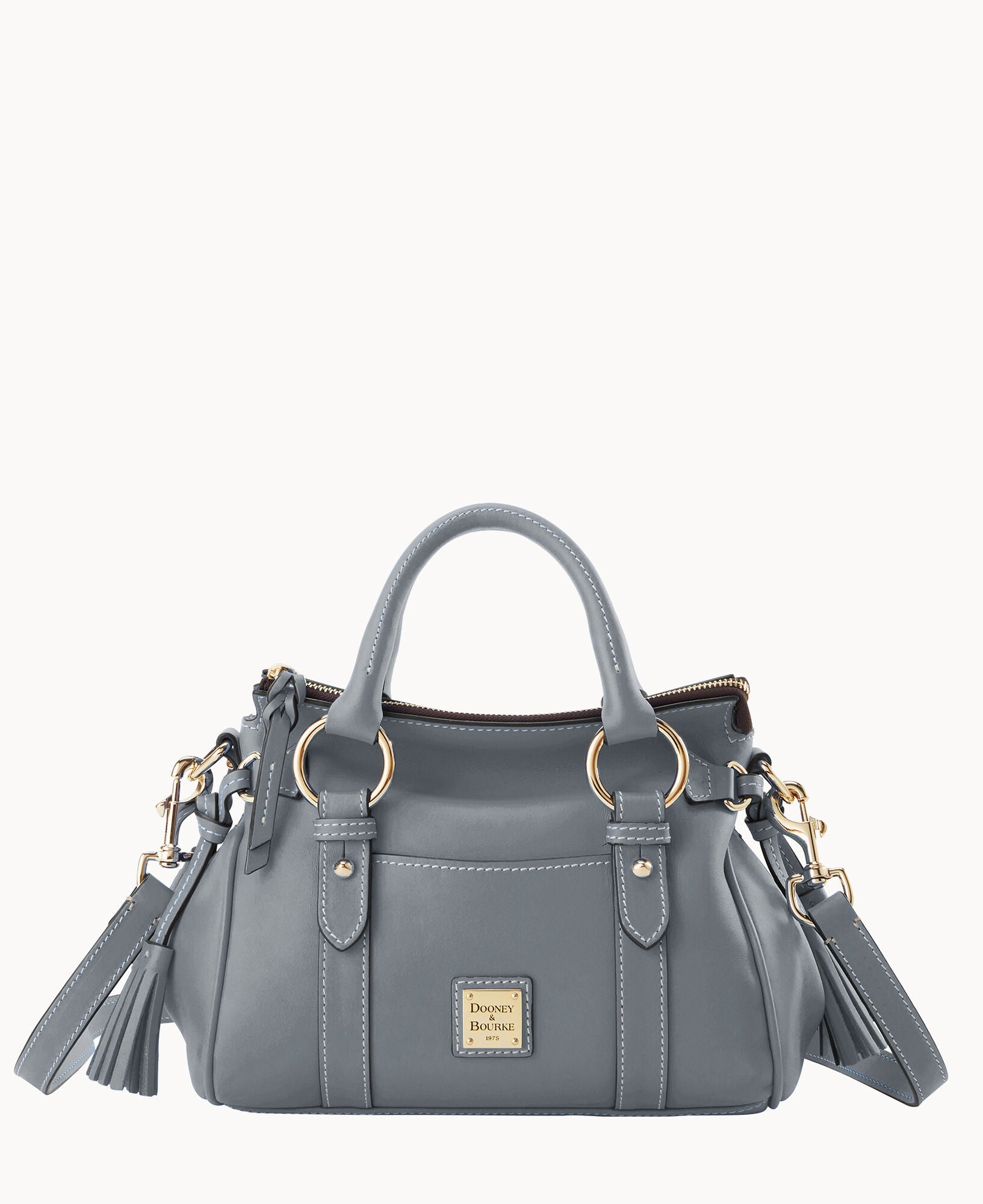Two outside pockets. Two inside pockets. One inside zip pocket. Inside key hook. Handle drop length 11.25". Strap drop length 20". Feet. Zipper closure. Lined.